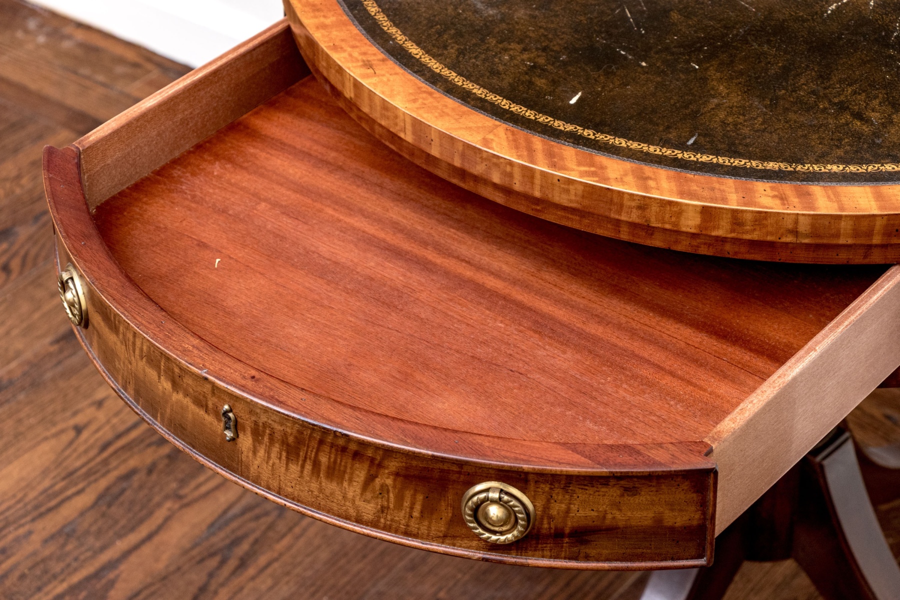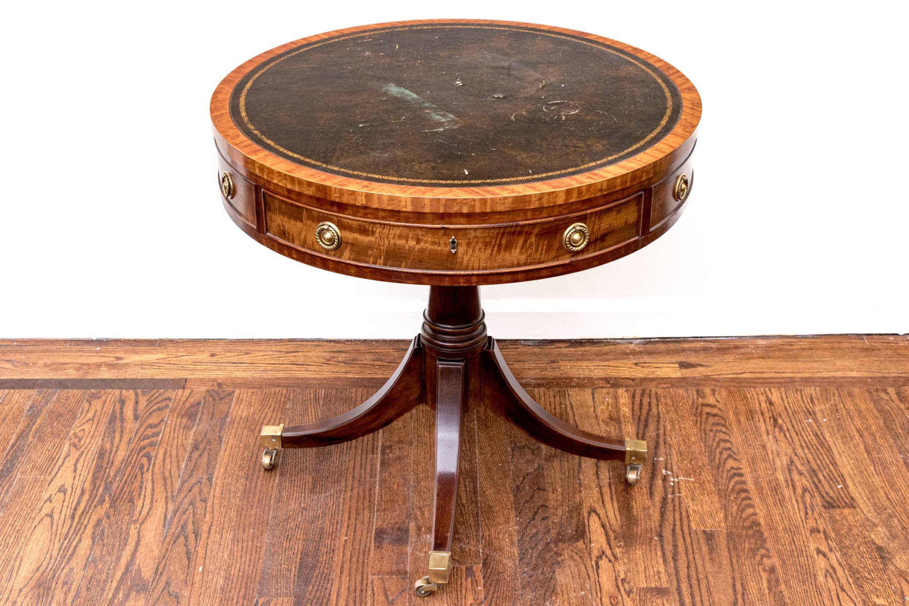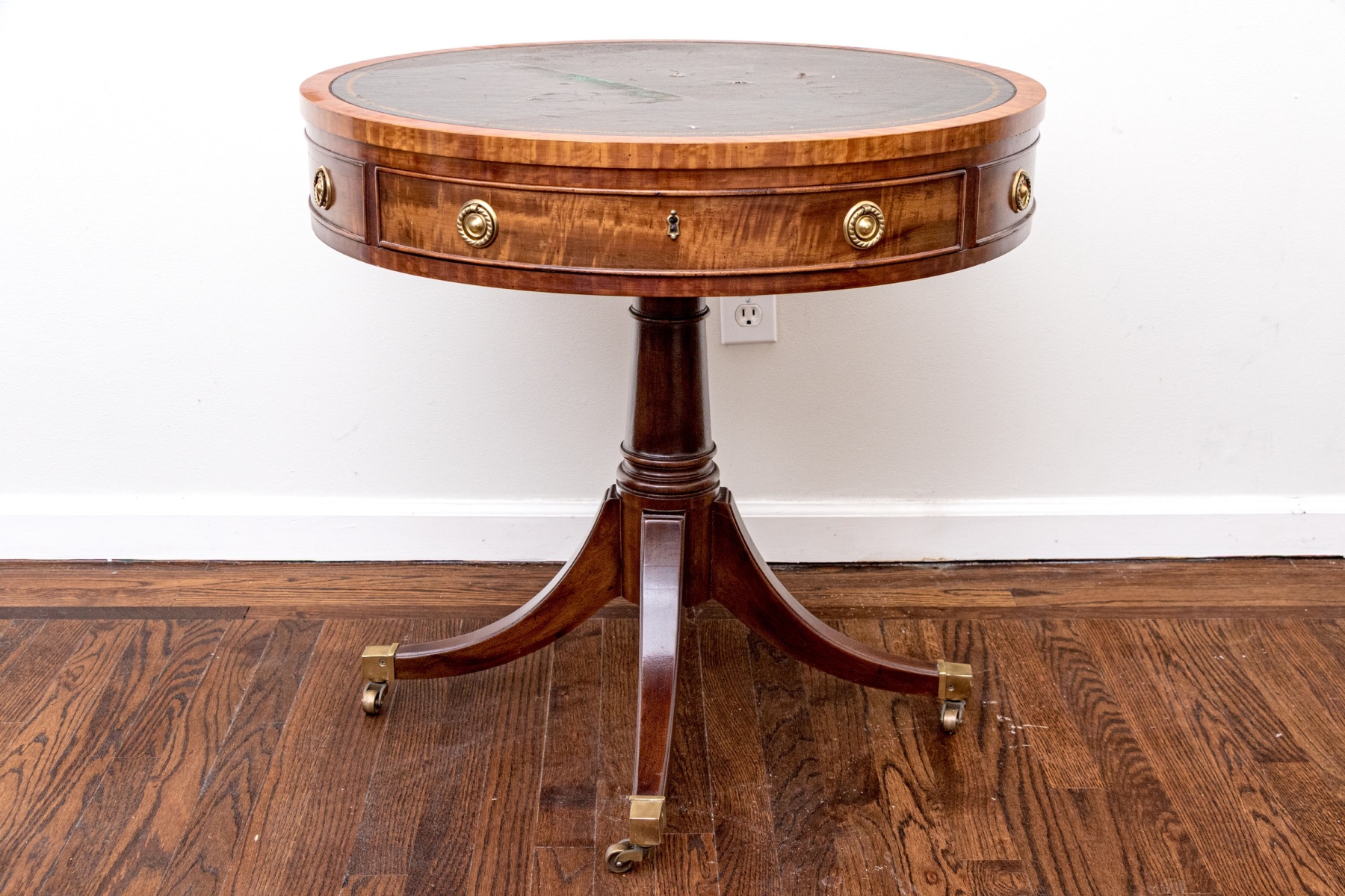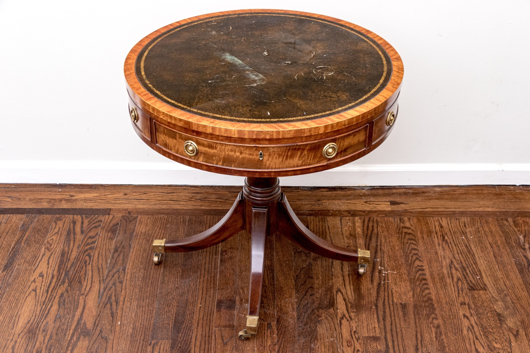 A wonderful Henredon drum table with classic Regency appeal, well crafted with striking honeyed brown wood veneers showcasing eye-catching wood grain. Th etbale sports a circular dark brown leather top with a gilt tooled trim, leading to a case with a single drawer and three faux drawer facades each with oval brass pulls. Raised on a sleek, tapered pedestal with four curved legs terminating with brass caps and casters.