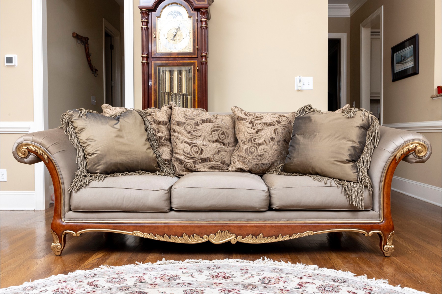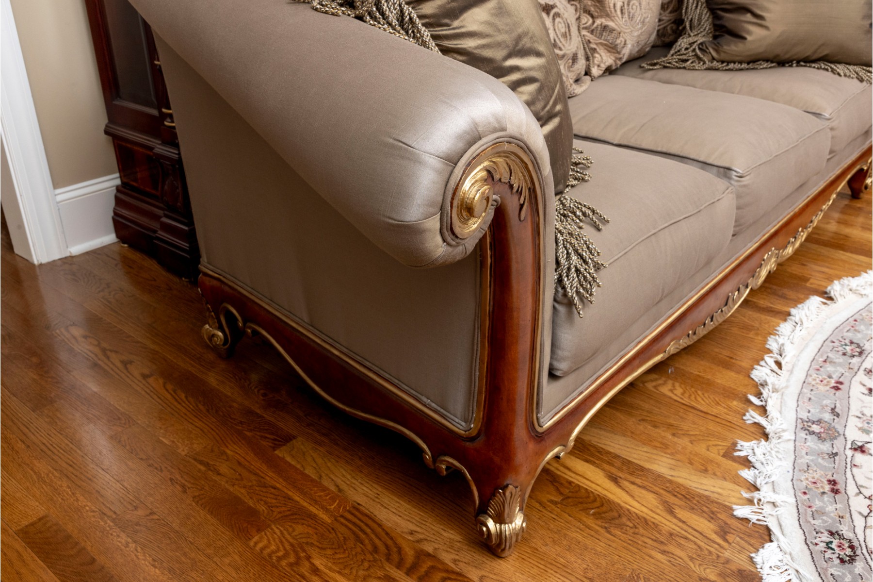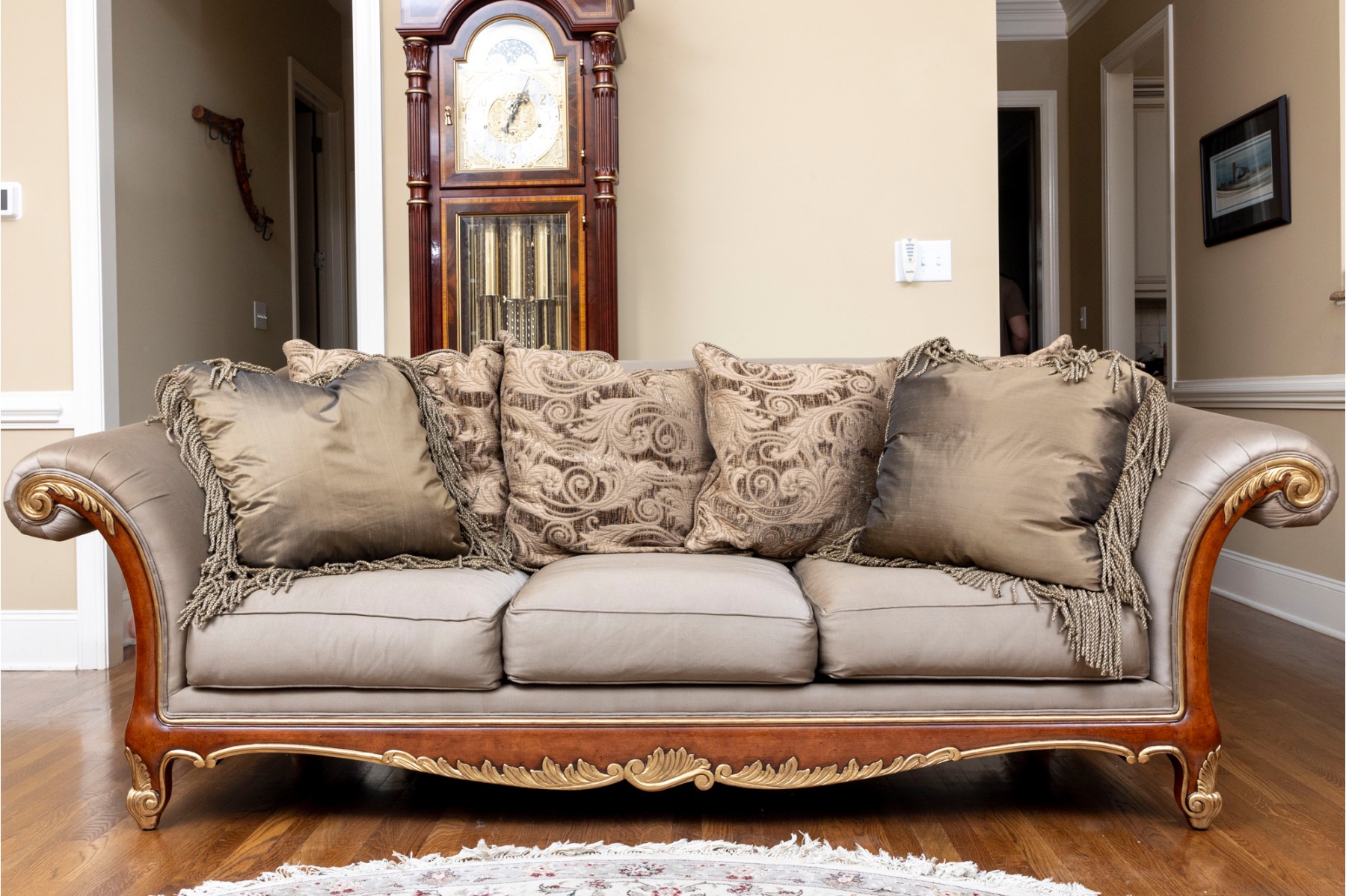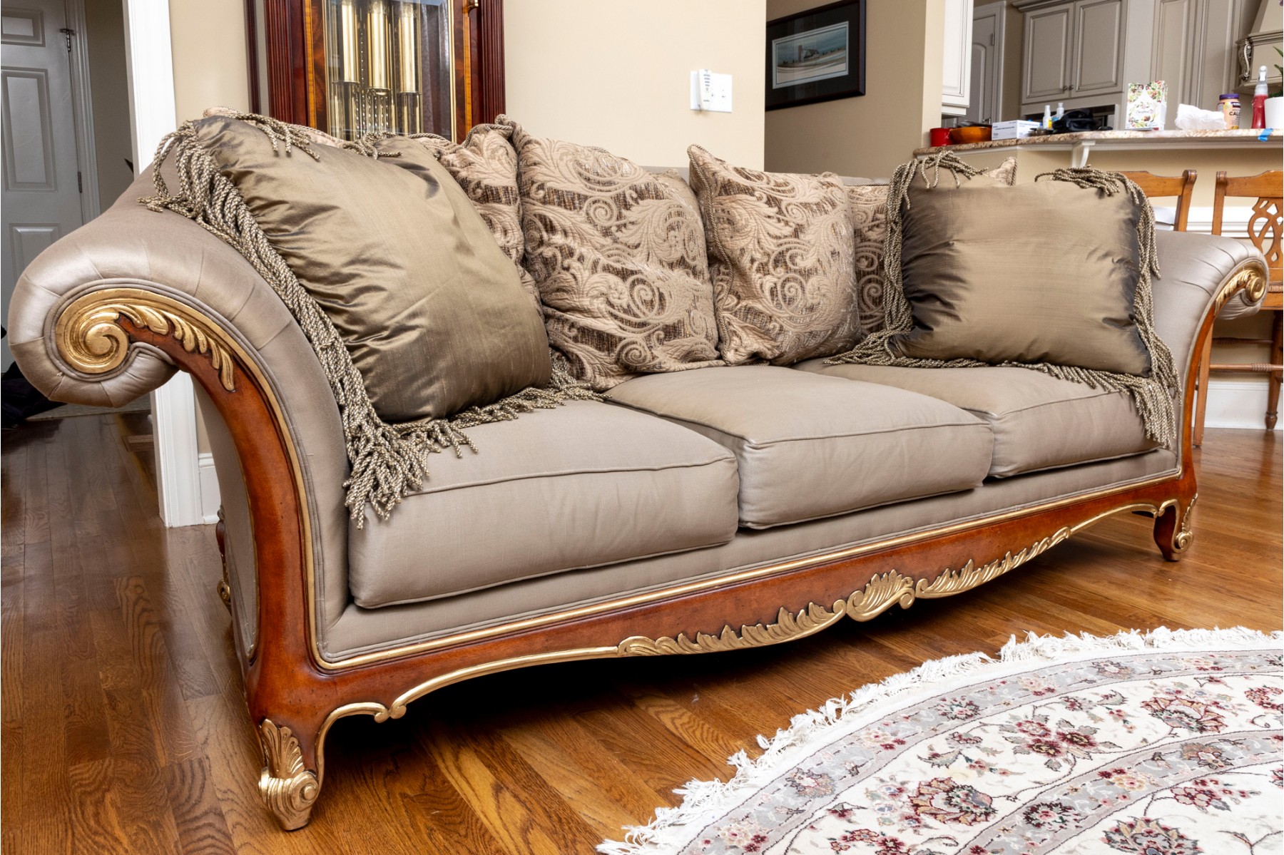 A stately Henredon three-seat sofa displaying dramatic and elegant rolled arms, taupe-gray silk upholstery filled with duck down, and gilt foliate relief flourished along the edges and serpentine apron. The back is accented with four large, comfortable cushions in beige-brown with foliate motifs, and two throw pillows with tassel trims.