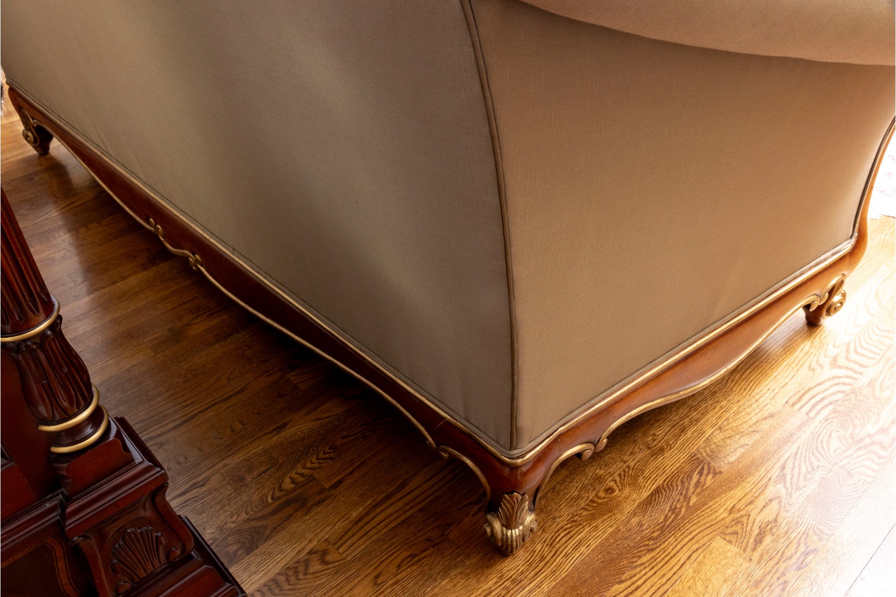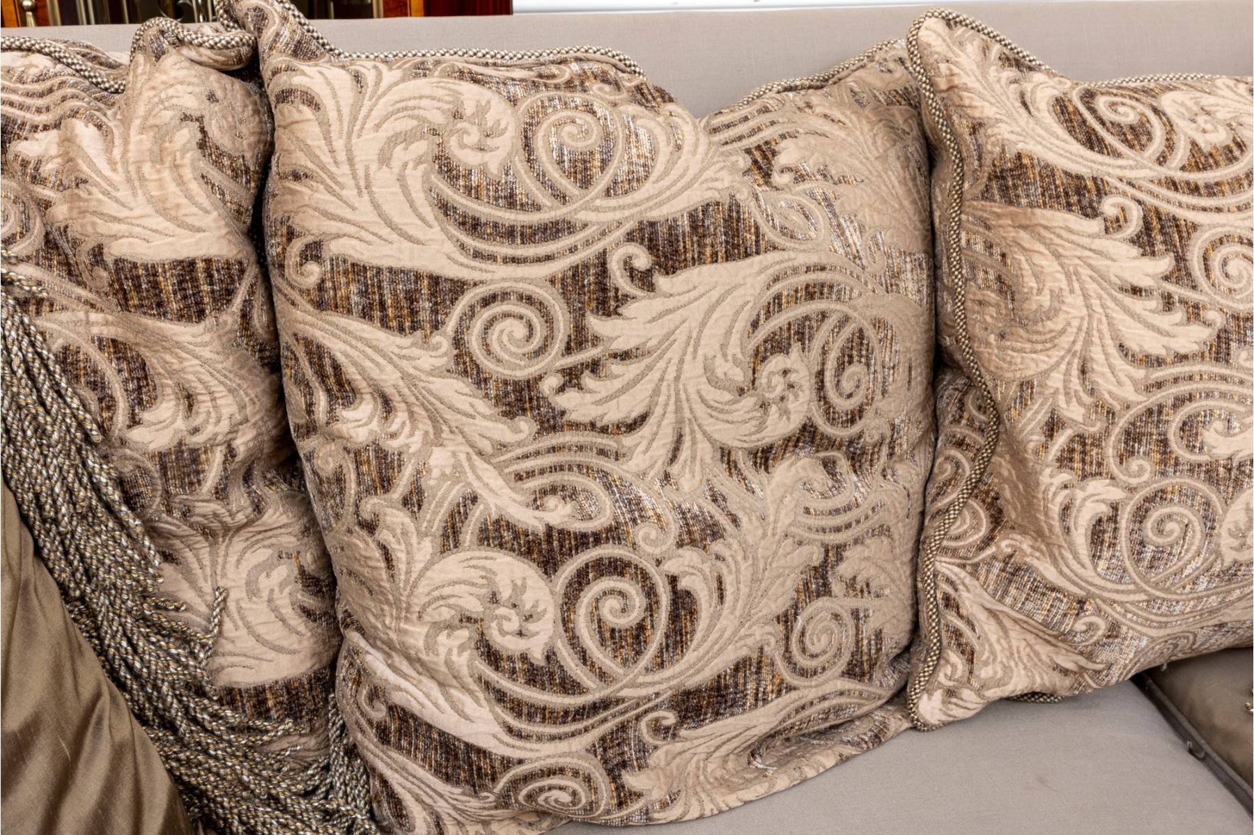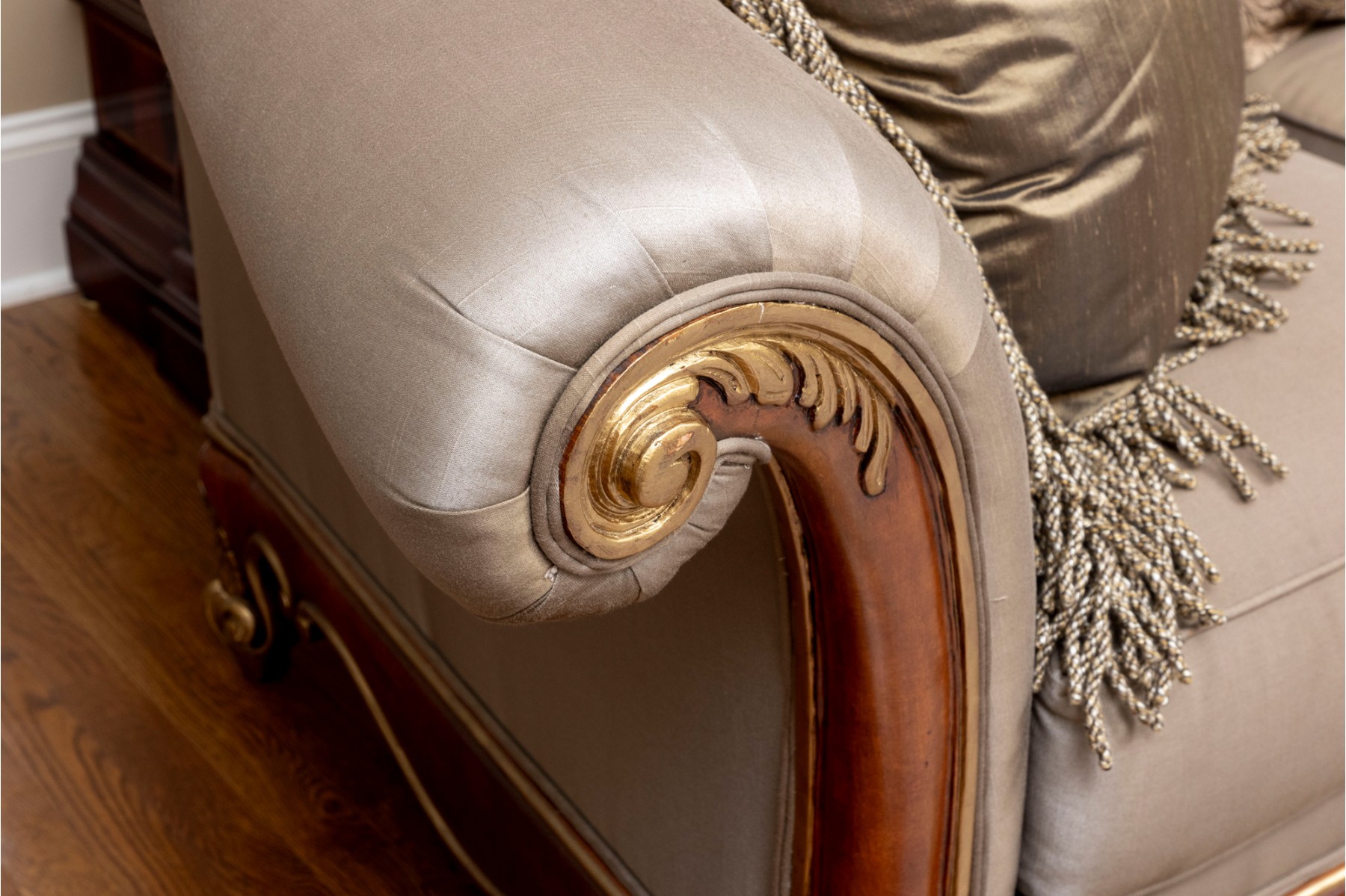 A stately Henredon three-seat sofa displaying dramatic and elegant rolled arms, taupe-gray silk upholstery filled with duck down, and gilt foliate relief flourished along the edges and serpentine apron. The back is accented with four large, comfortable cushions in beige-brown with foliate motifs, and two throw pillows with tassel trims.