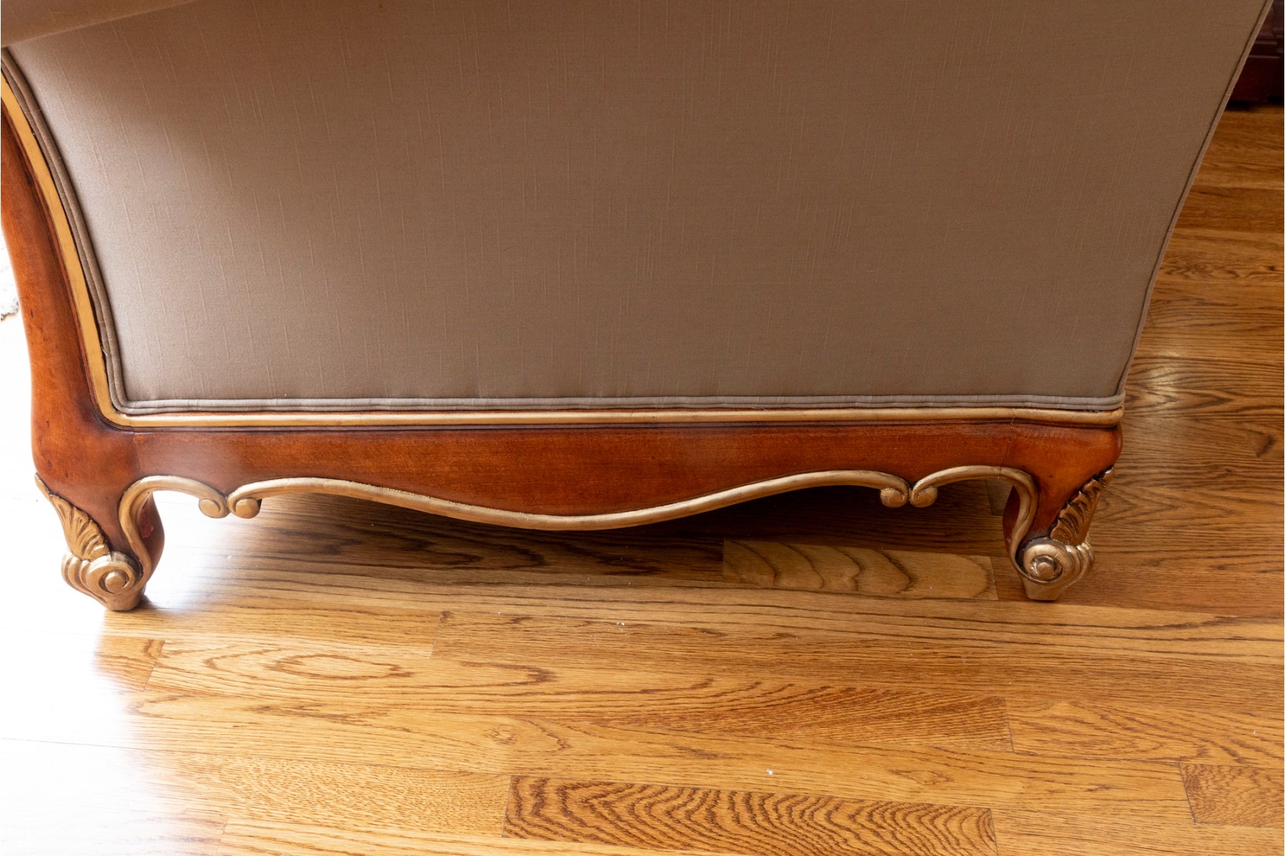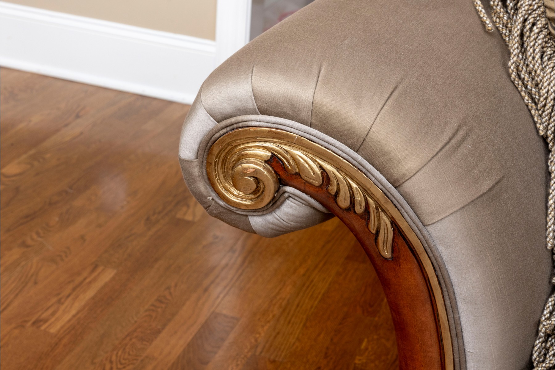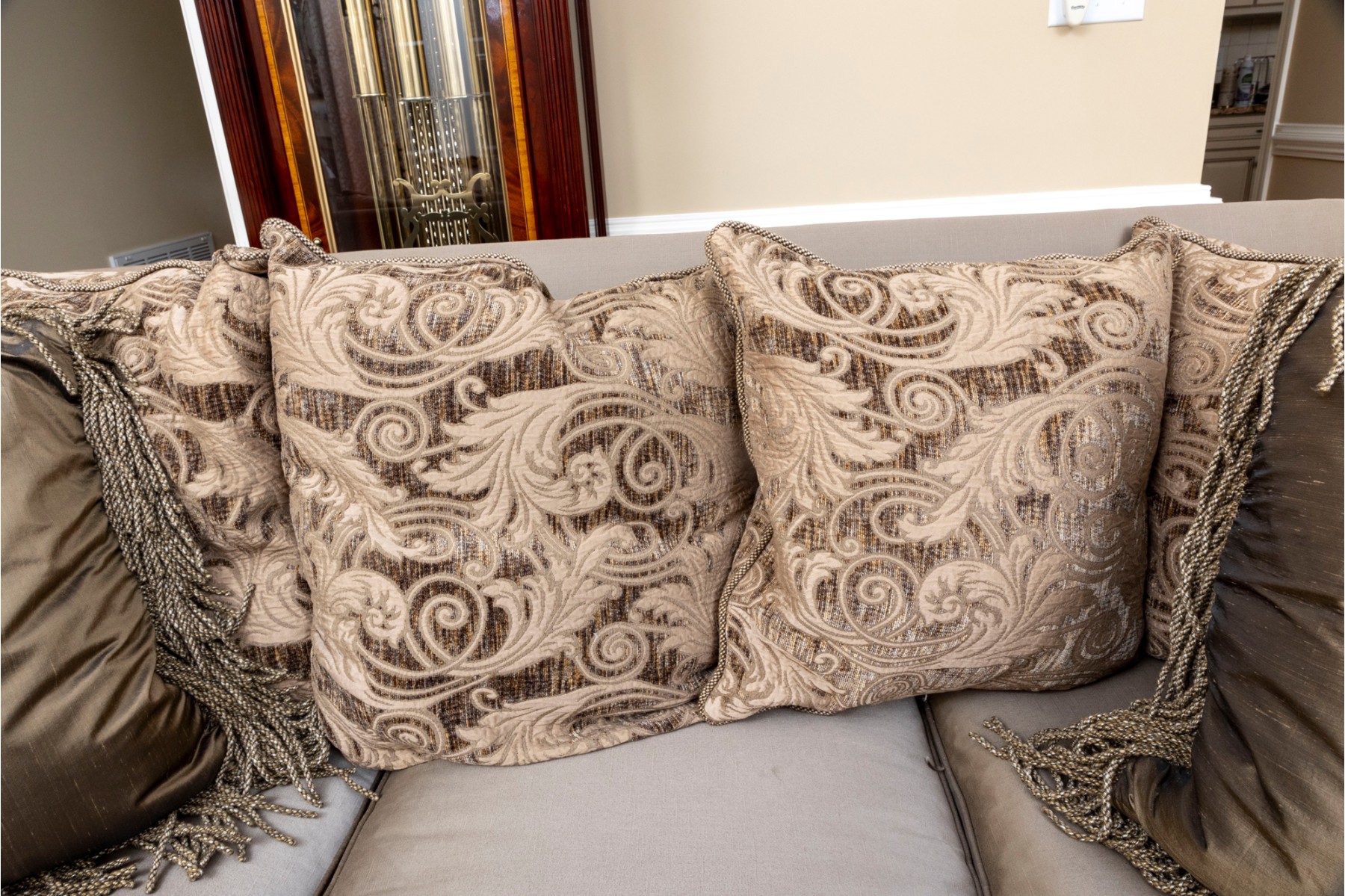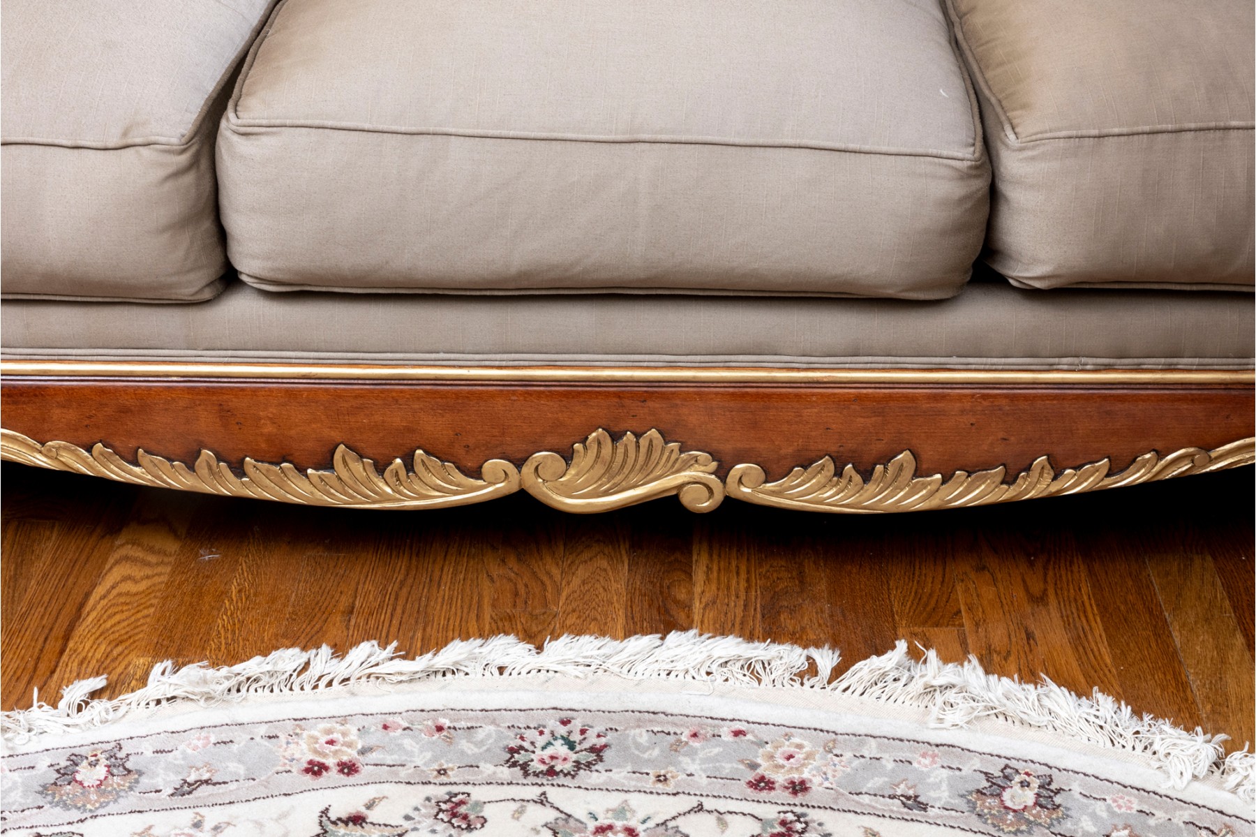 A stately Henredon three-seat sofa displaying dramatic and elegant rolled arms, taupe-gray silk upholstery filled with duck down, and gilt foliate relief flourished along the edges and serpentine apron. The back is accented with four large, comfortable cushions in beige-brown with foliate motifs, and two throw pillows with tassel trims.