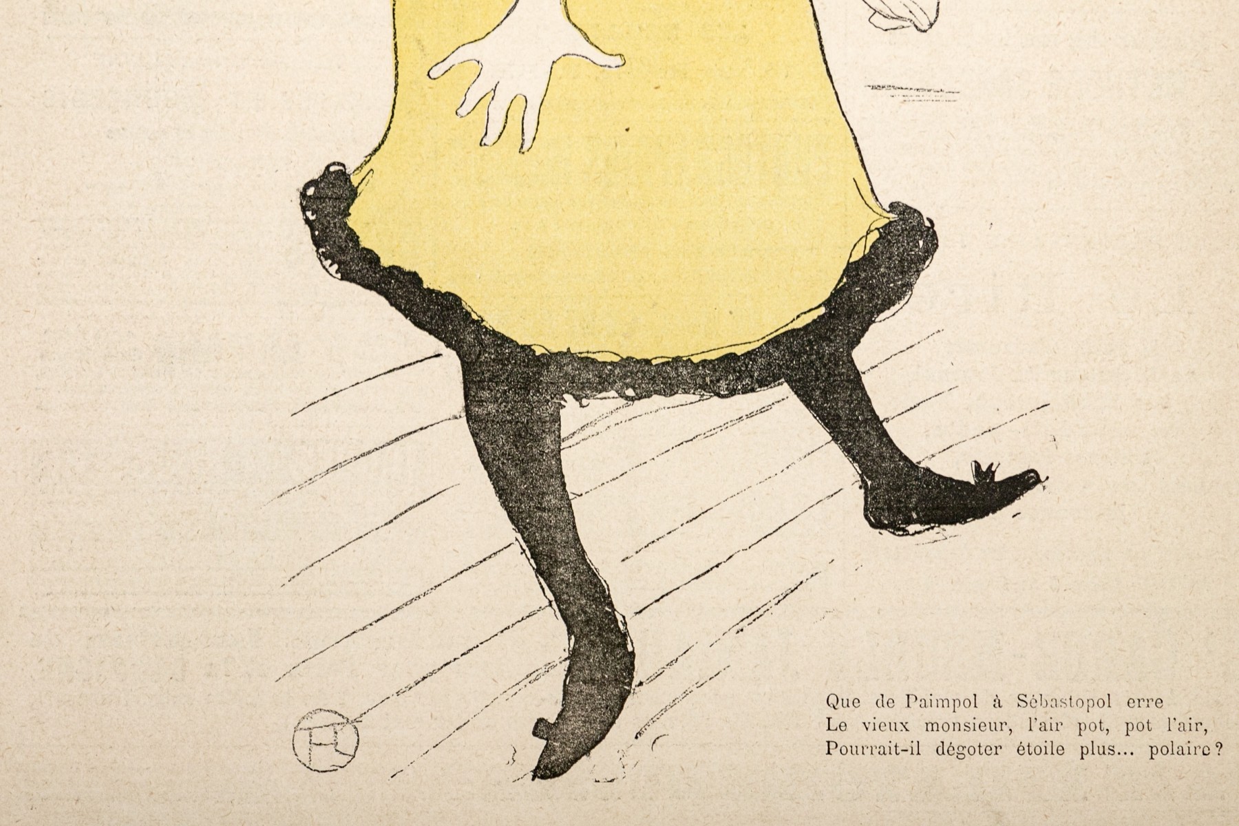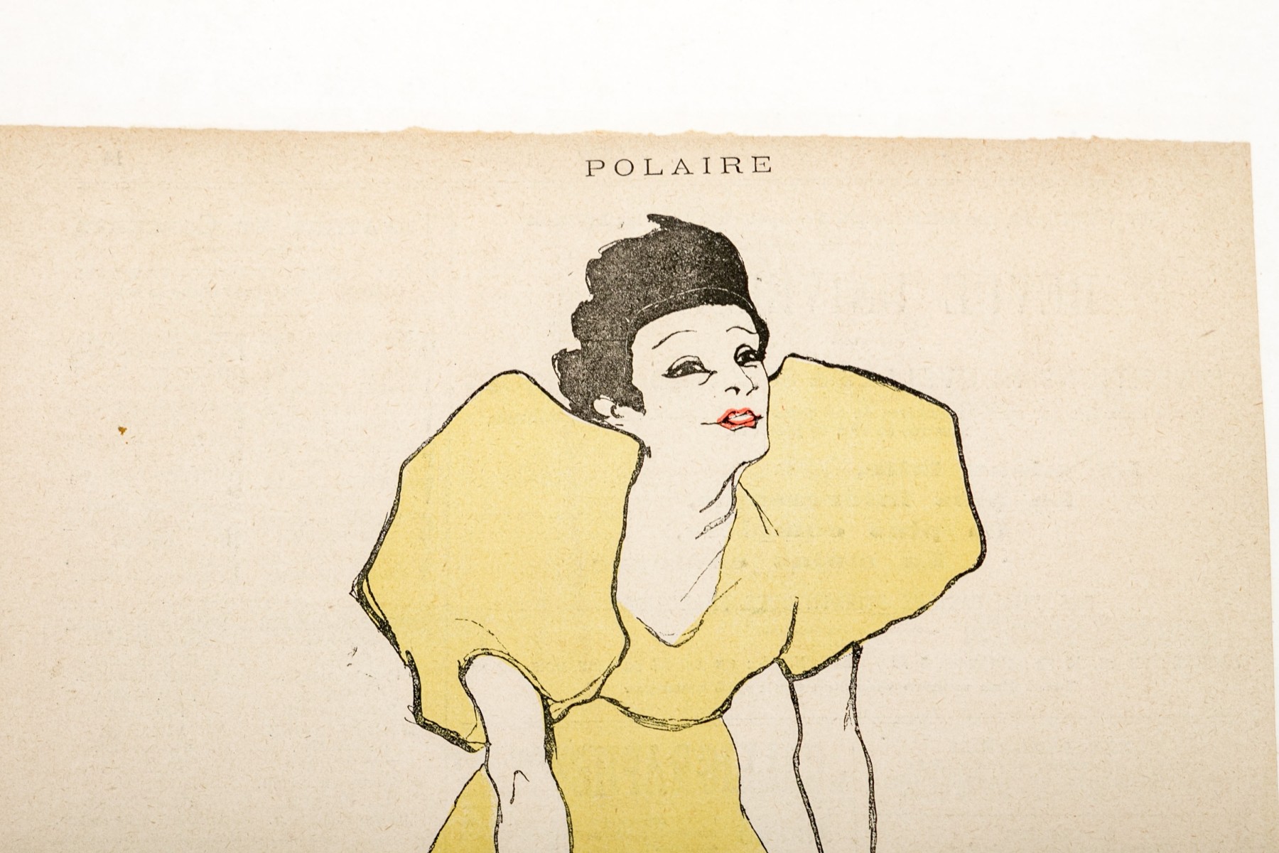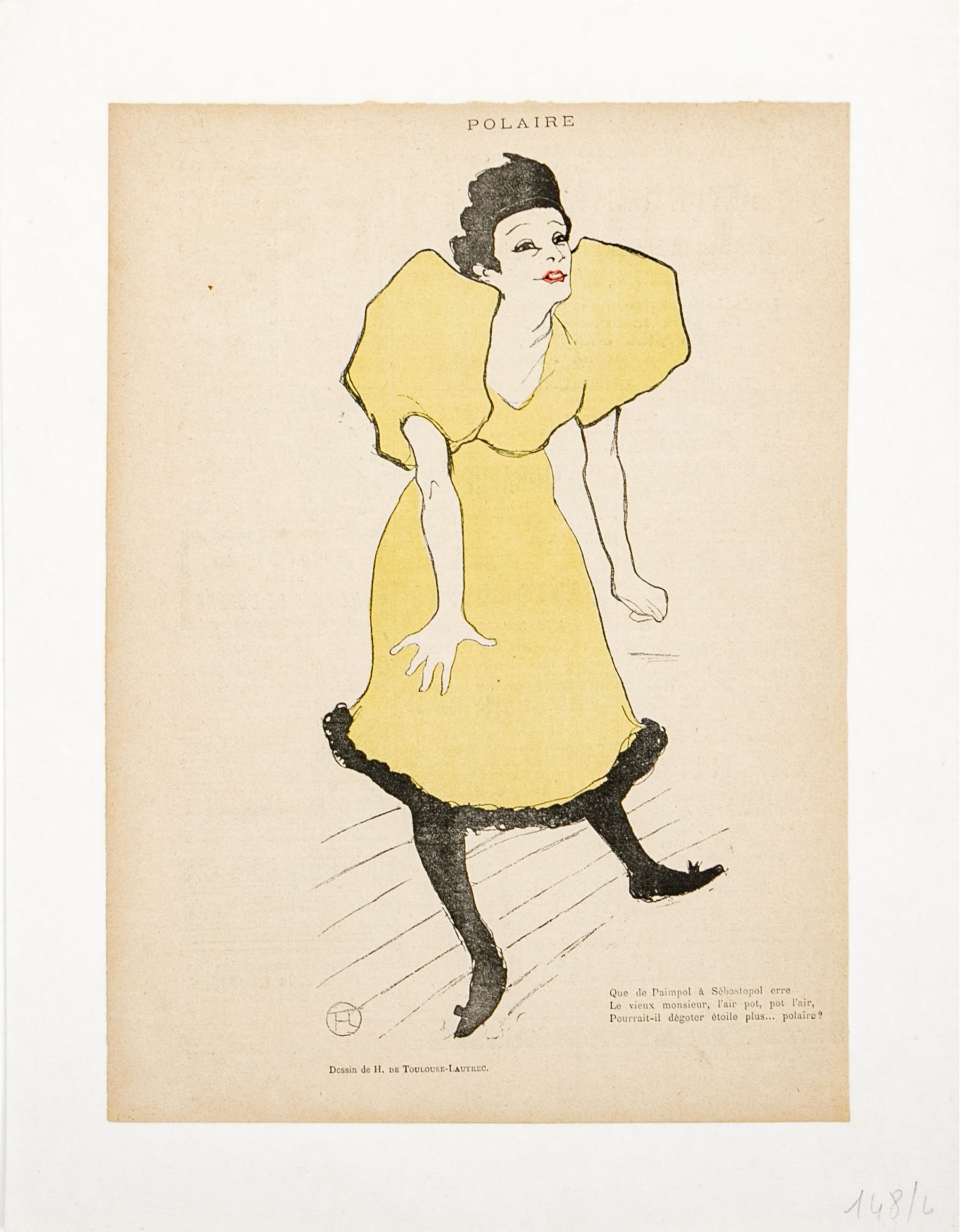 Published lithograph in "Le Rire" satirical and humorous magazine 1895. Polaire was a music-hall singer and dancer who rose to prominence in Paris when Toulouse Lautrec drew her for the magazine cover. Here she is shown wearing a yellow dress and black stockings as she performs. Unframed mounted on a linen backing.