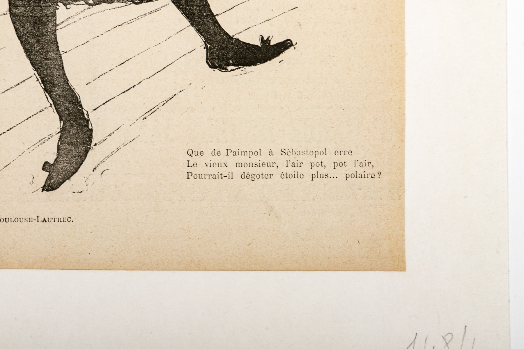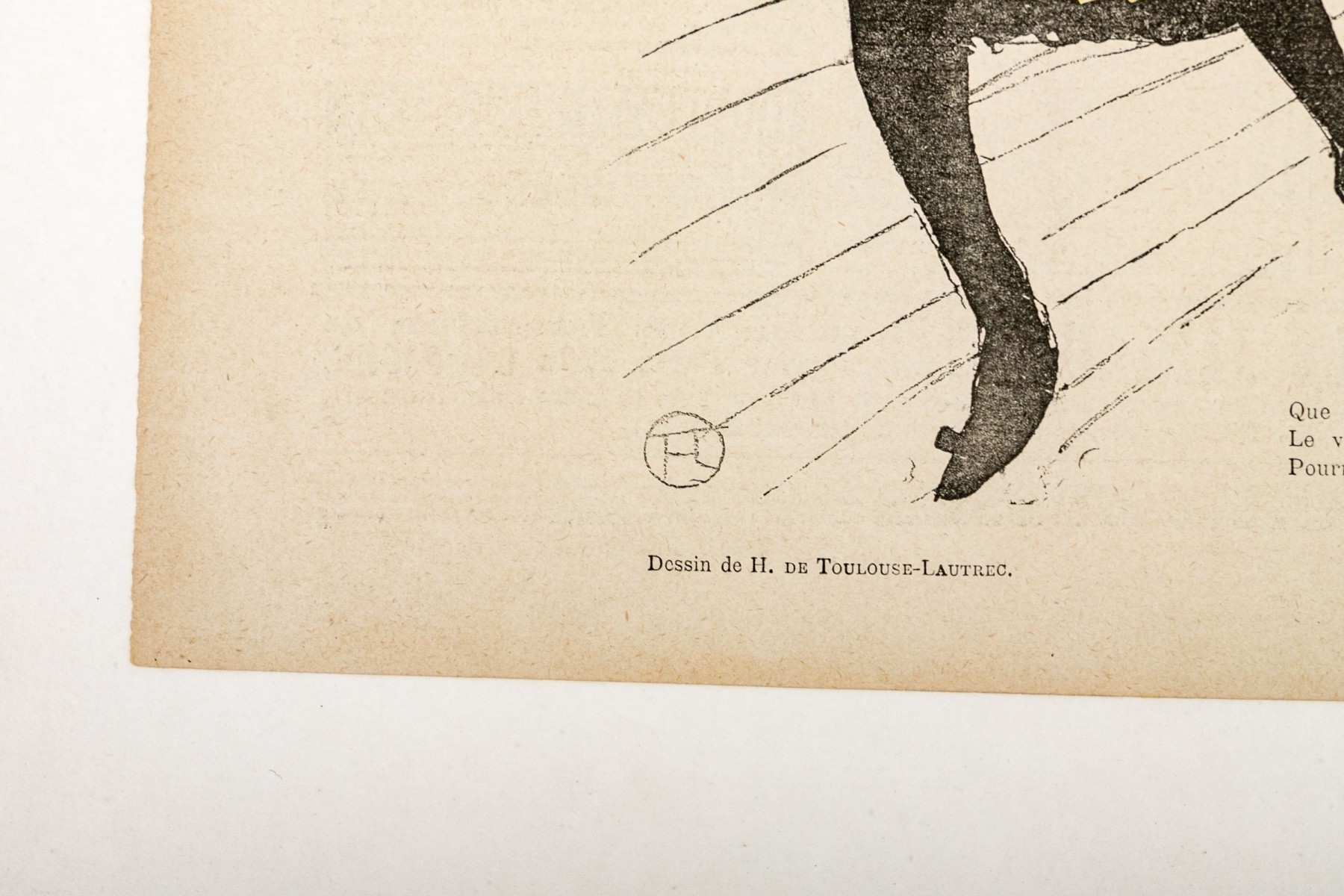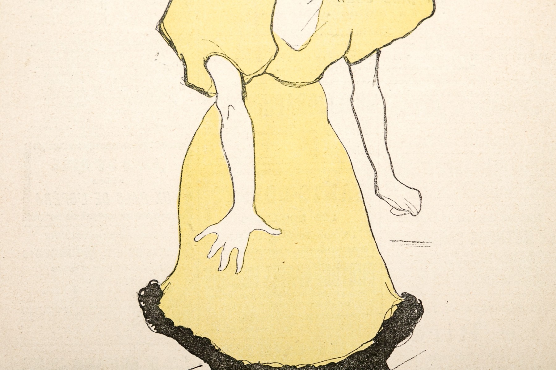 Published lithograph in "Le Rire" satirical and humorous magazine 1895. Polaire was a music-hall singer and dancer who rose to prominence in Paris when Toulouse Lautrec drew her for the magazine cover. Here she is shown wearing a yellow dress and black stockings as she performs. Unframed mounted on a linen backing.
