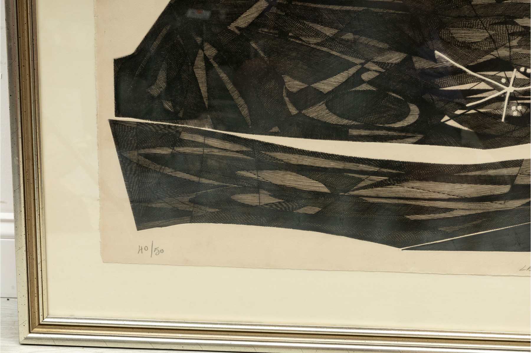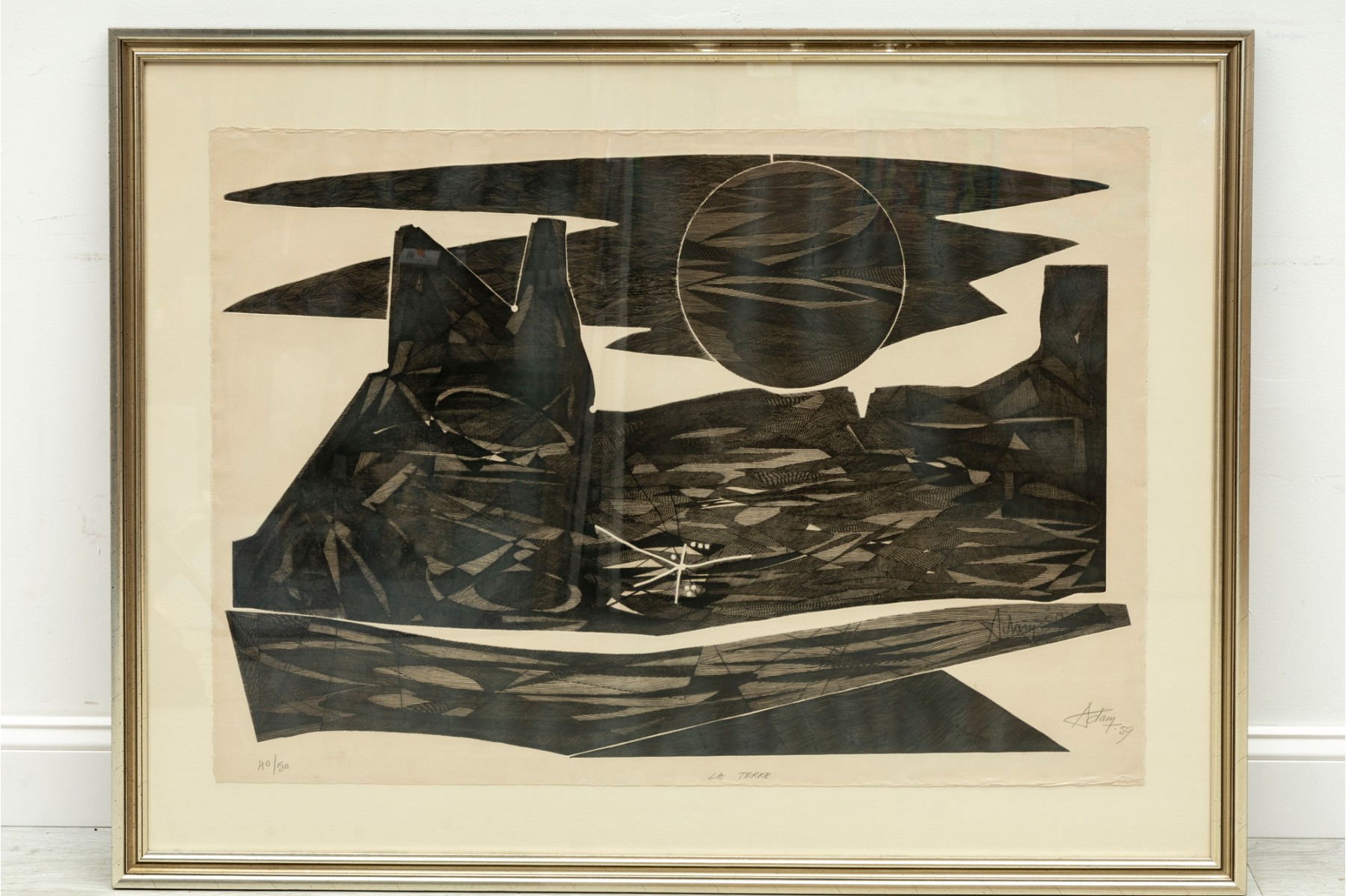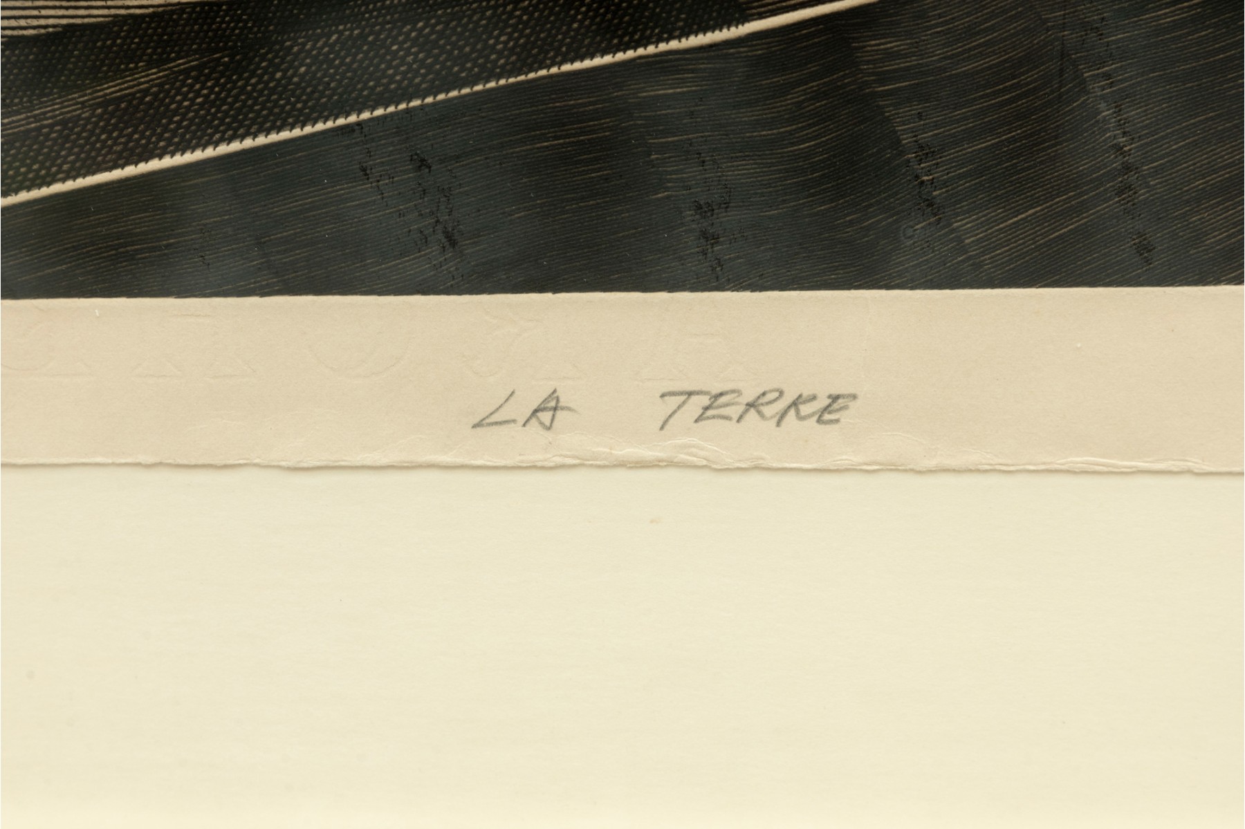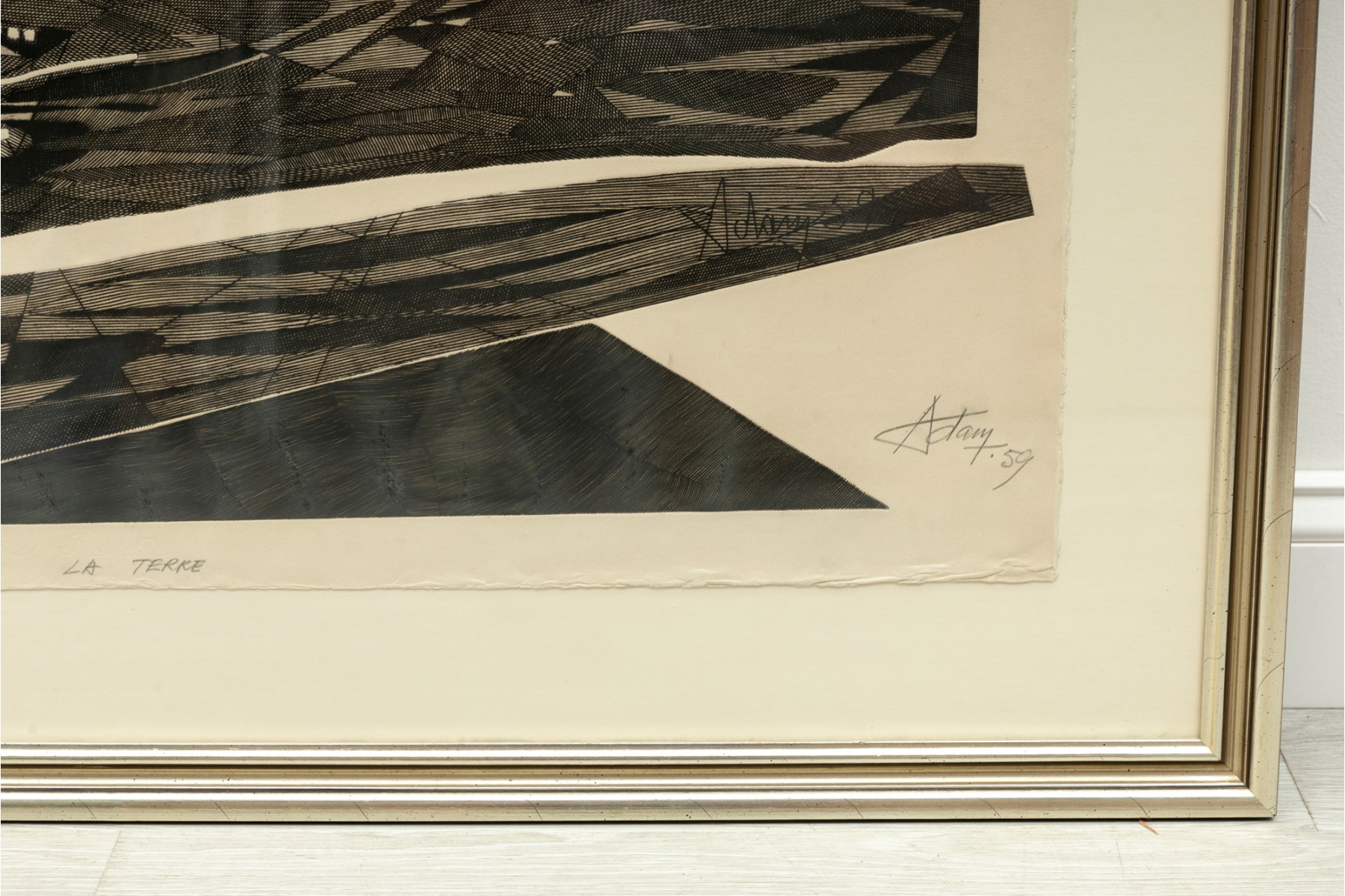Henri Georges Adam's (French, 1904–1967) "La Terre" in monochrome. Dated 1959, signed and numbered 40/50. The artwork is presented in a silvered wood frame faced with glass.