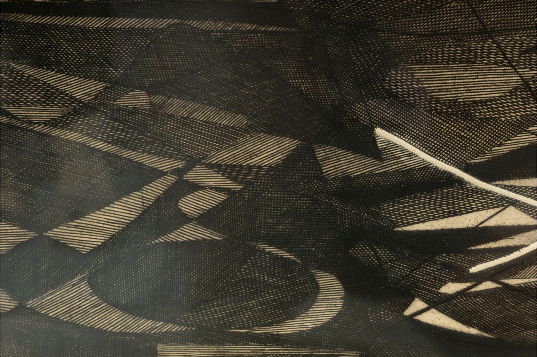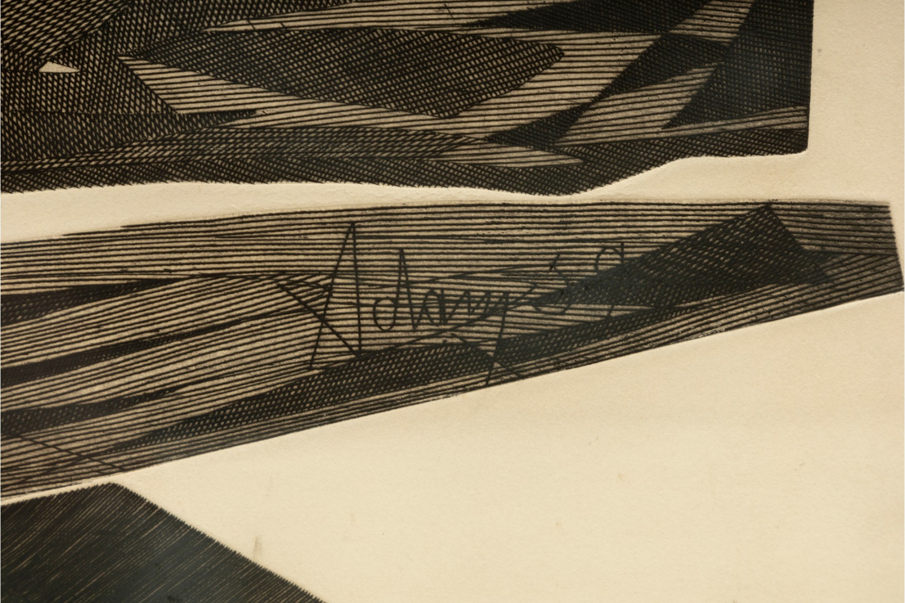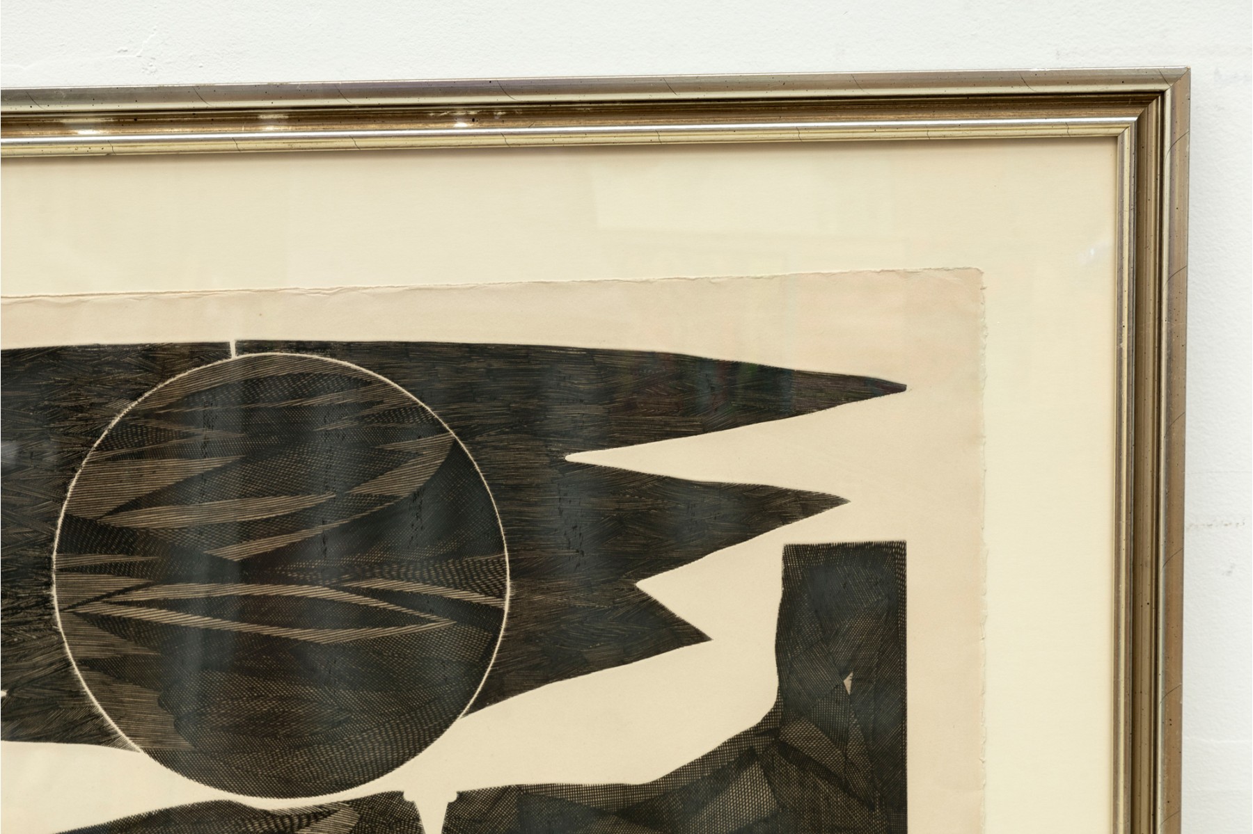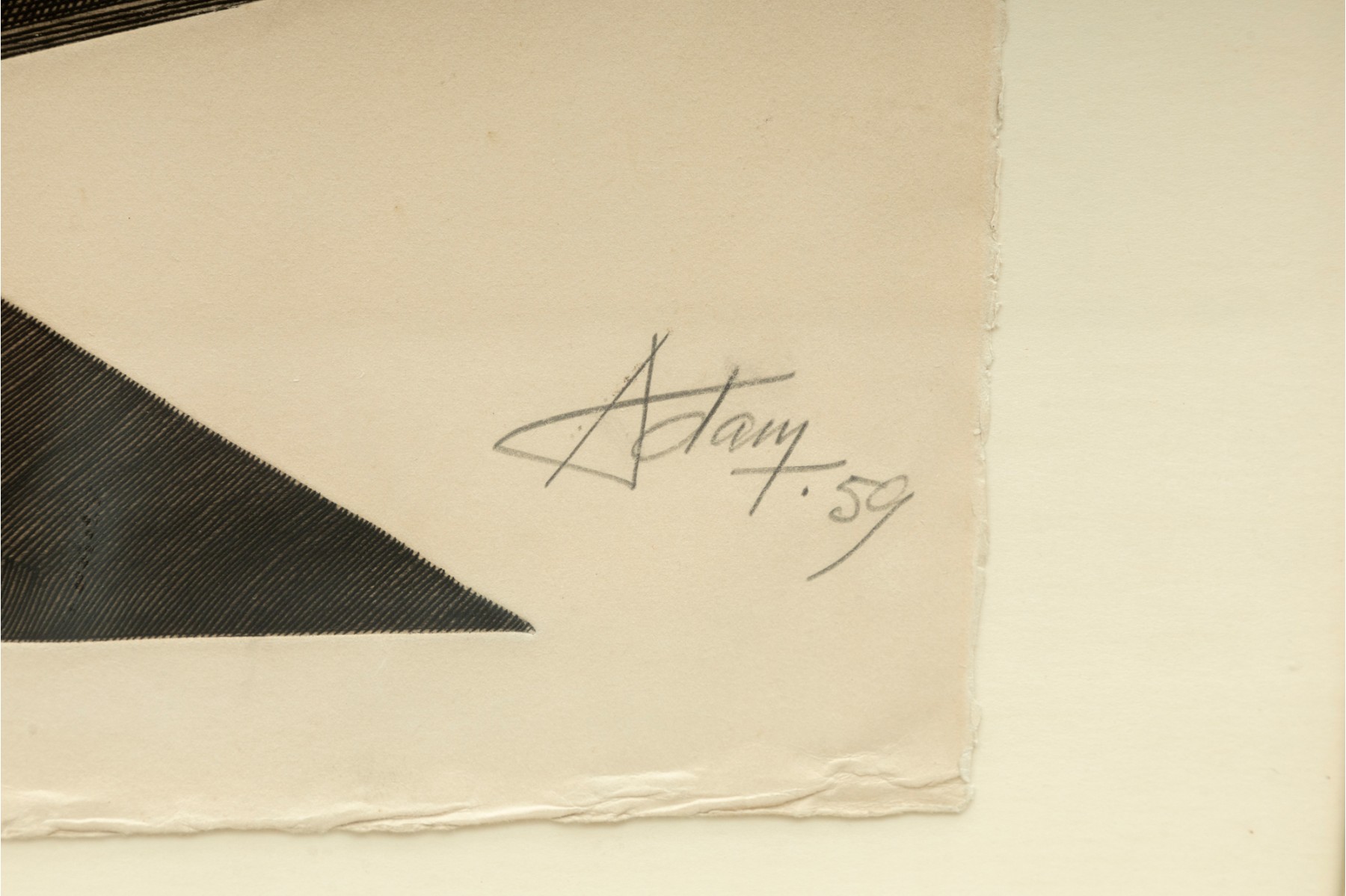 Henri Georges Adam's (French, 1904–1967) "La Terre" in monochrome. Dated 1959, signed and numbered 40/50. The artwork is presented in a silvered wood frame faced with glass.