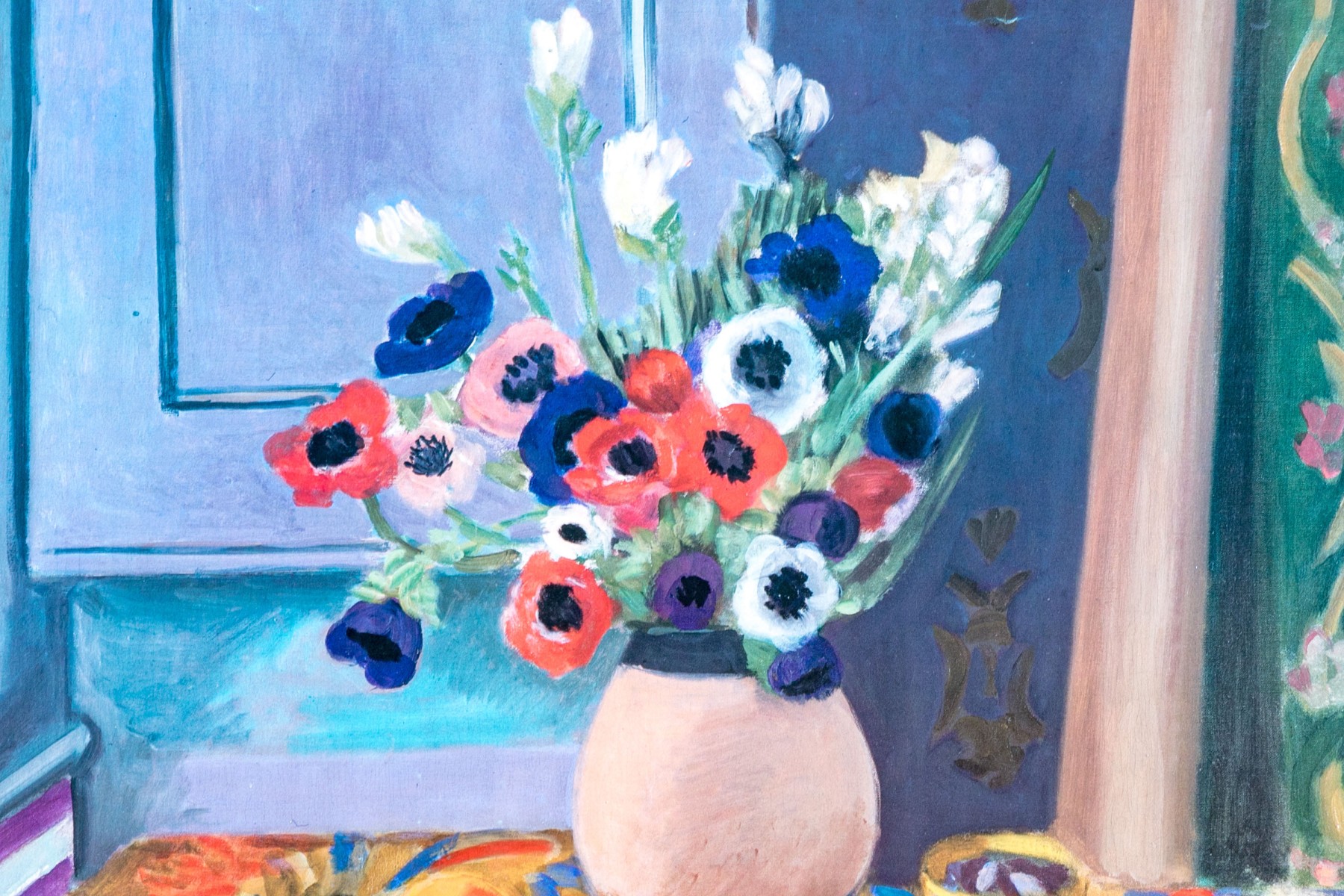 A retrospective. Featuring "Anemones in an Earthenware Vase" 1924 painting, Presented in a metal frame with glass.