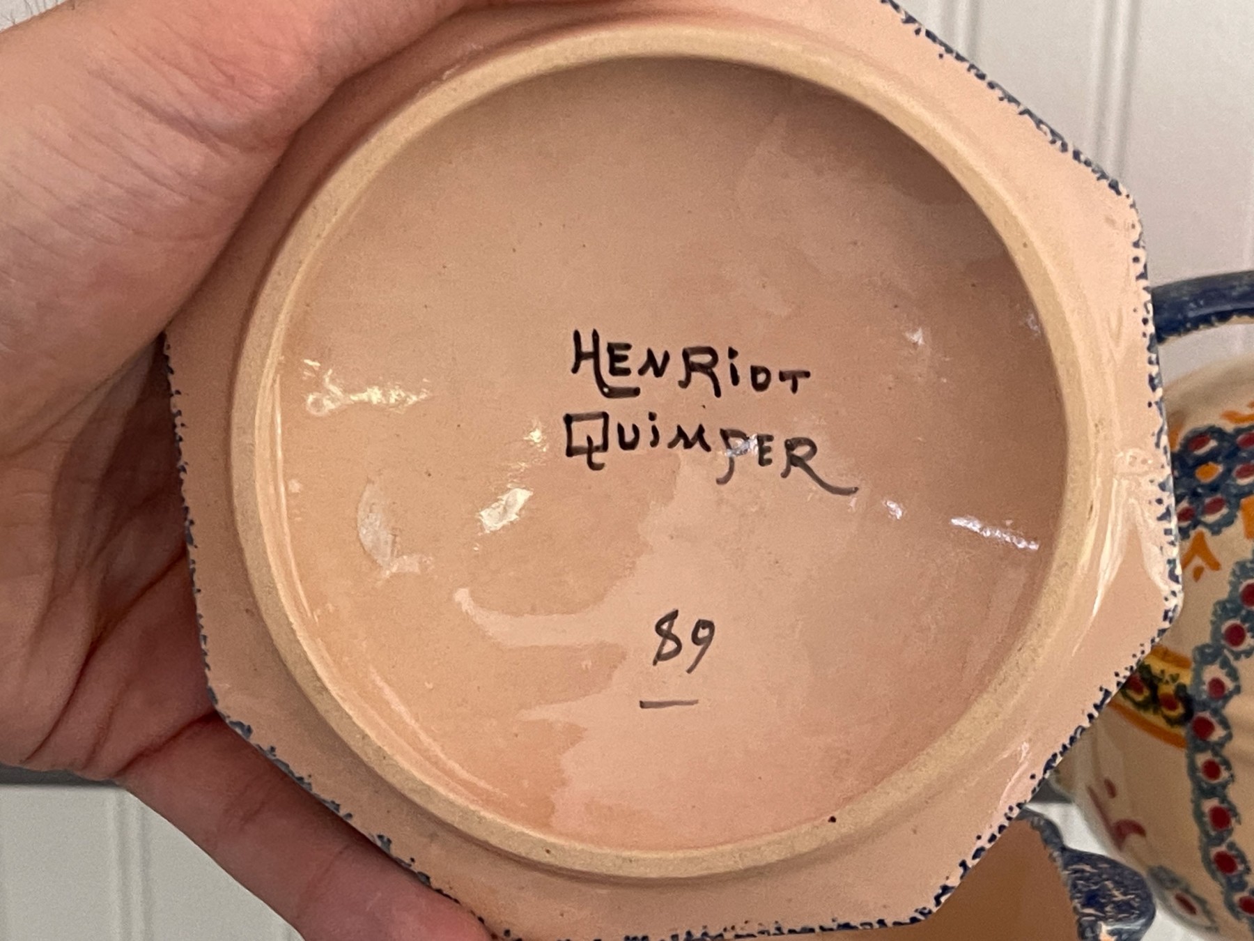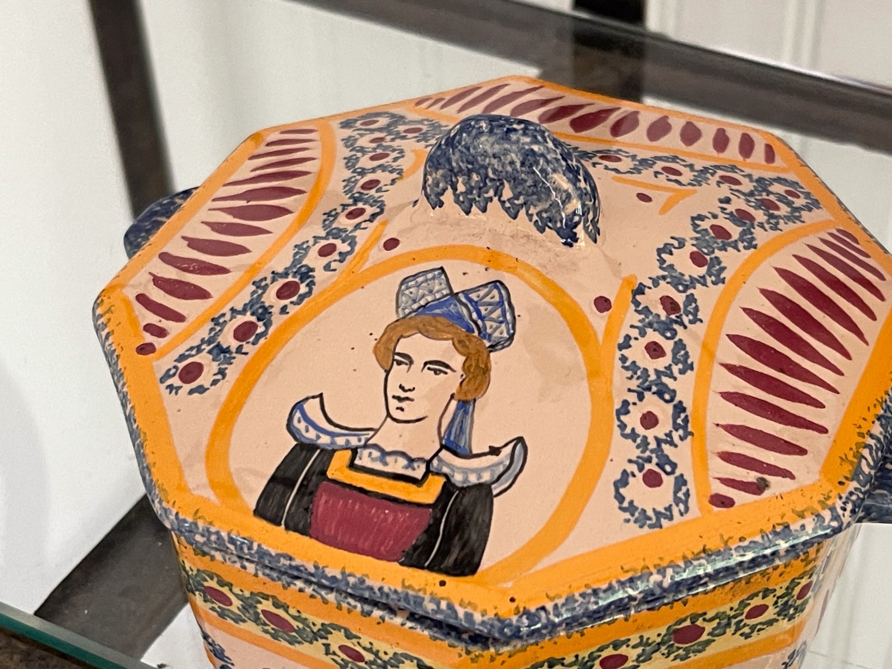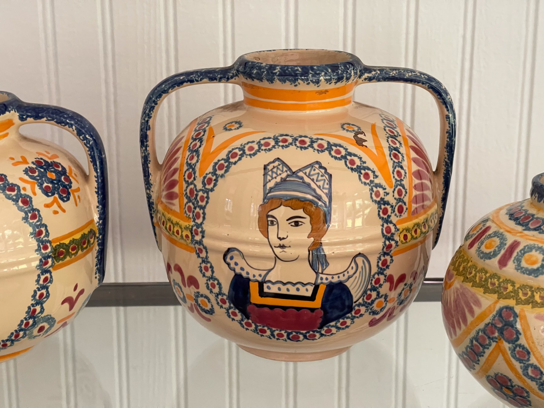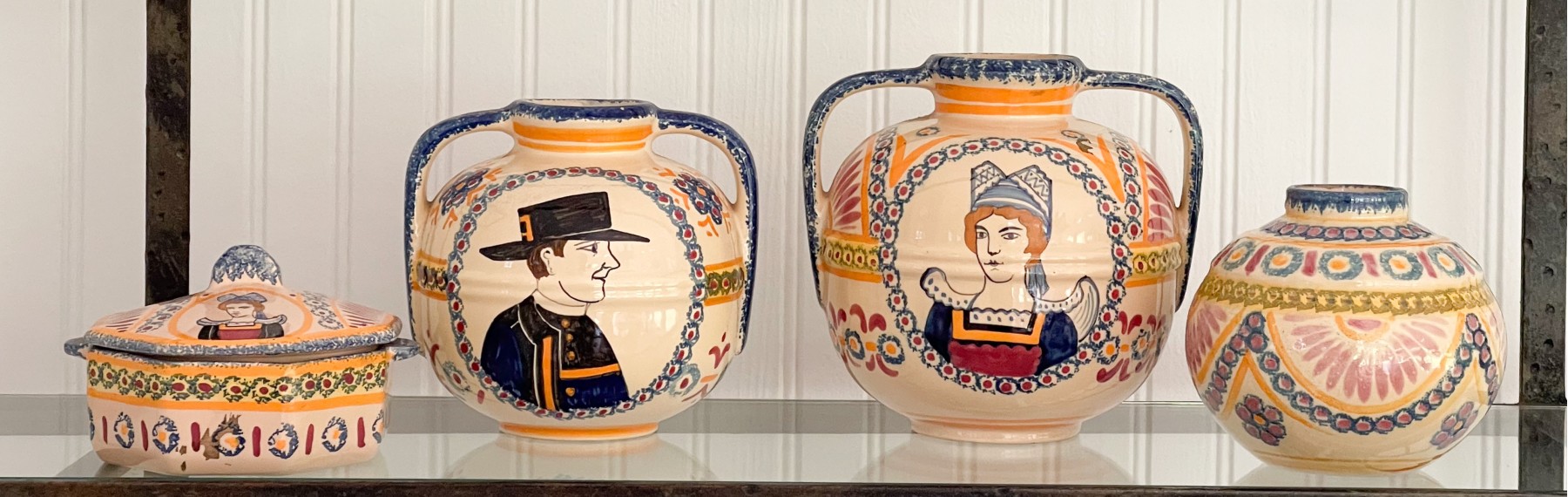 Dated 81, 89 & 99, collection of four handcrafted French Quimper pieces including two handled jugs (5 1/2 and 6 3/4"H), an octagonal lidden box (4 1/2" diameter), and a small bud vase (4 1/2"H). All signed.