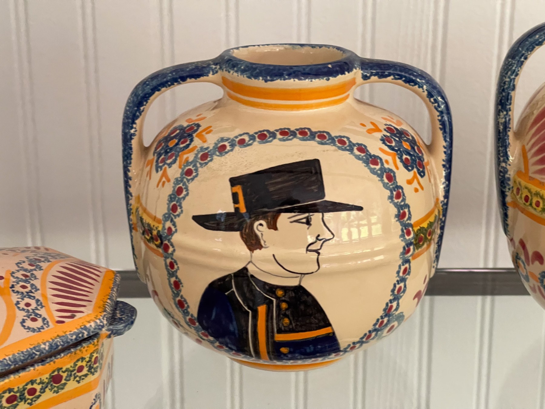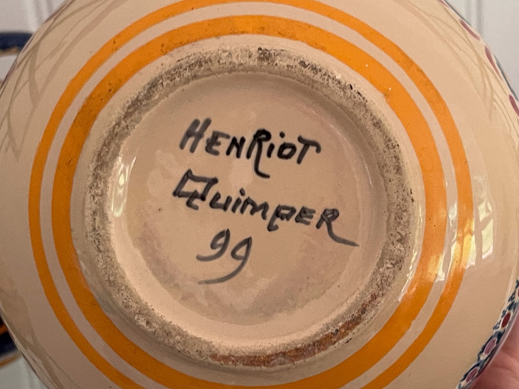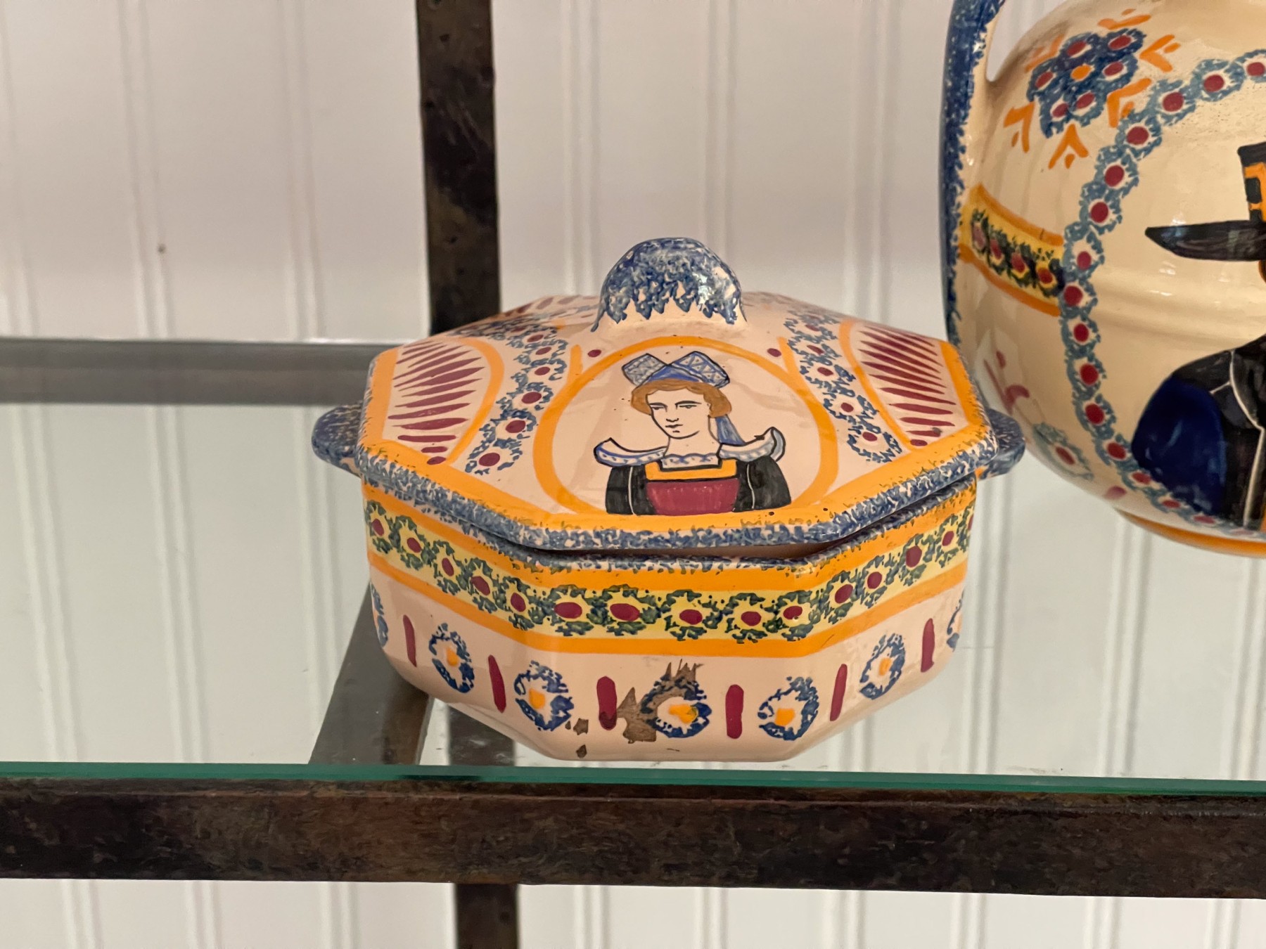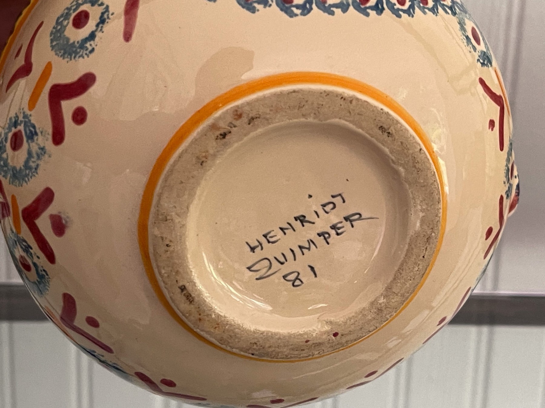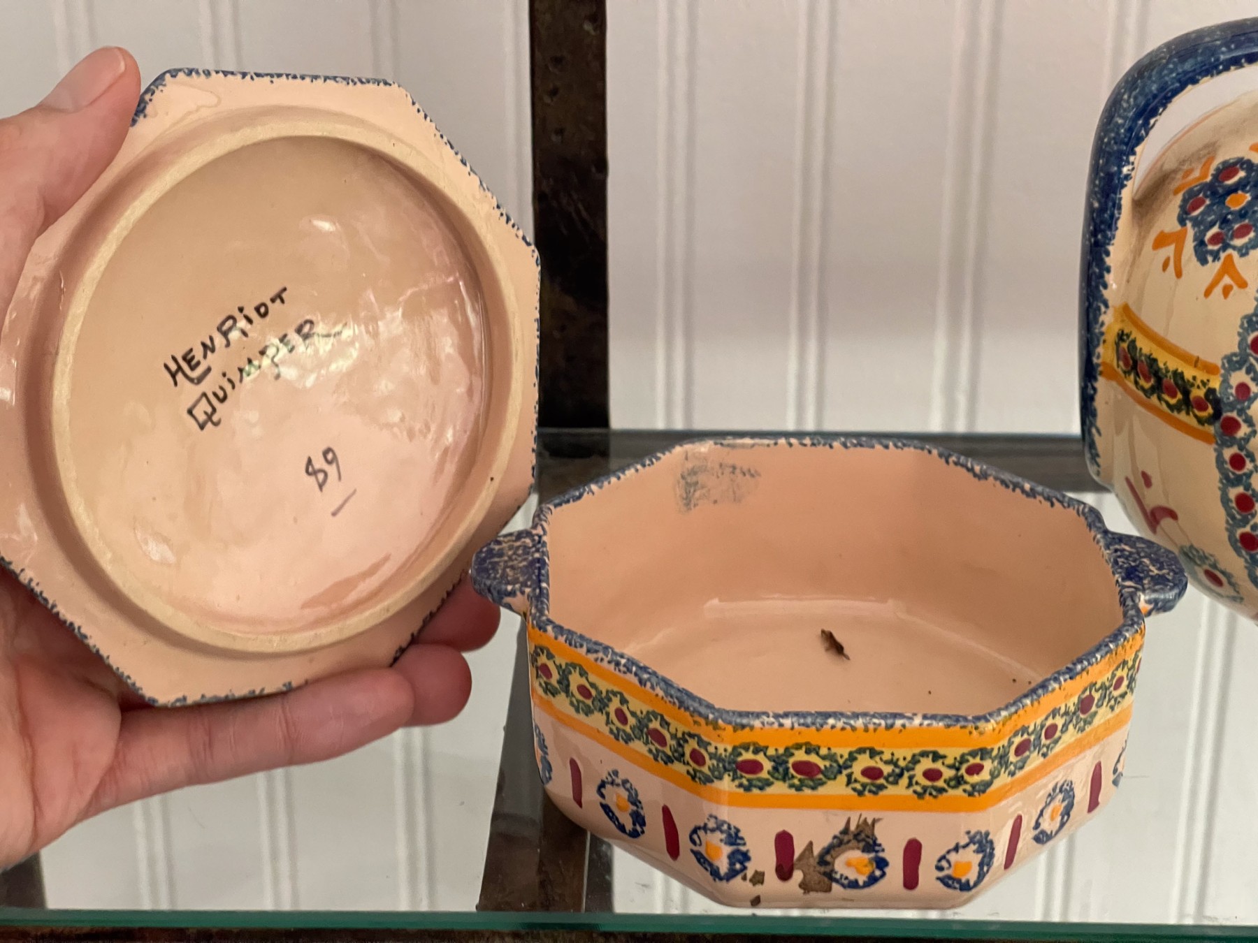 Dated 81, 89 & 99, collection of four handcrafted French Quimper pieces including two handled jugs (5 1/2 and 6 3/4"H), an octagonal lidden box (4 1/2" diameter), and a small bud vase (4 1/2"H). All signed.