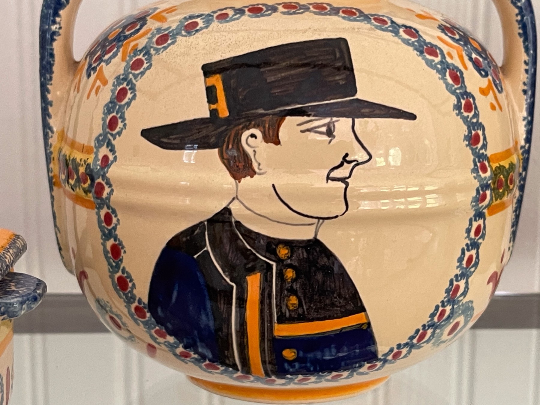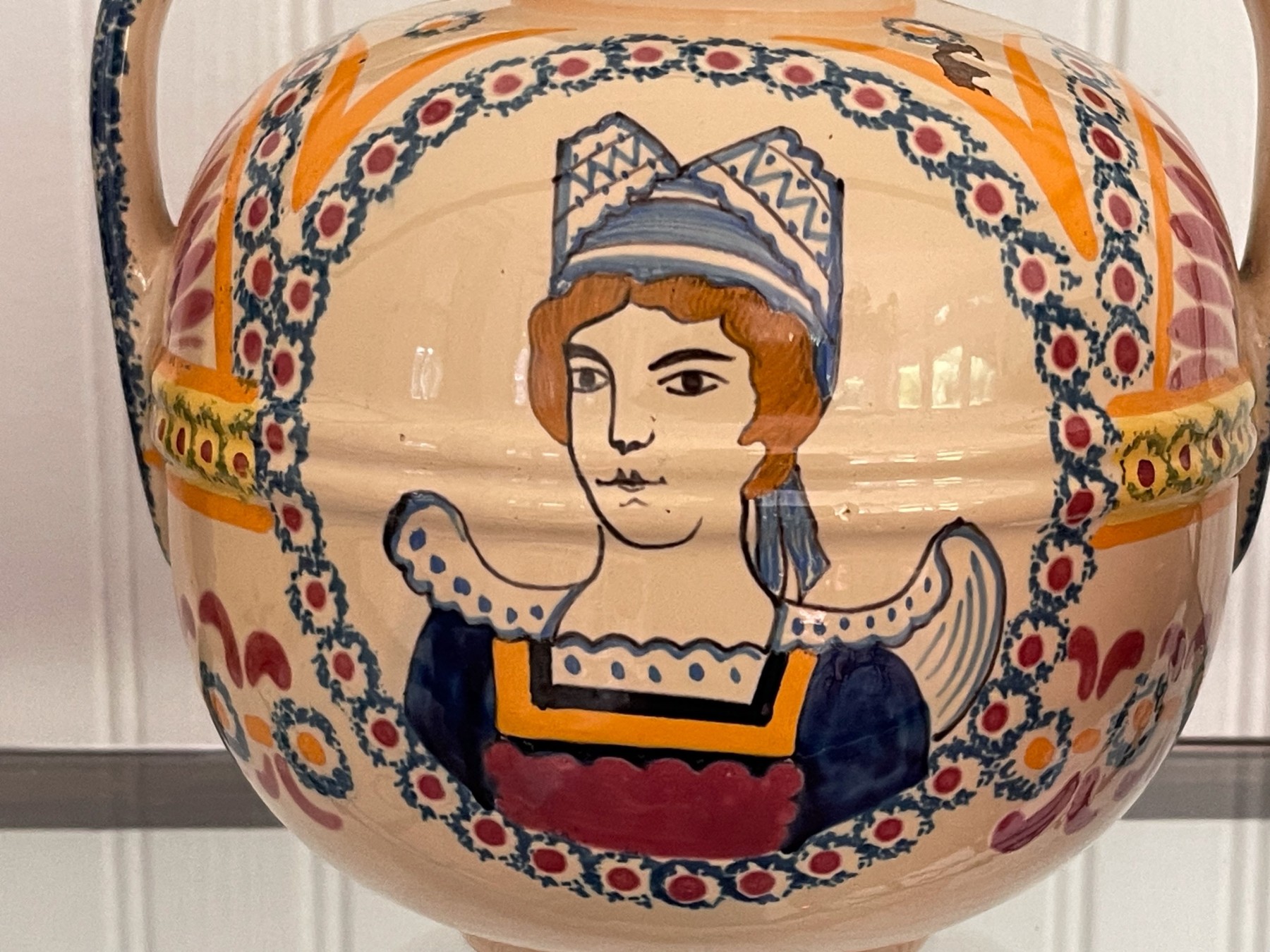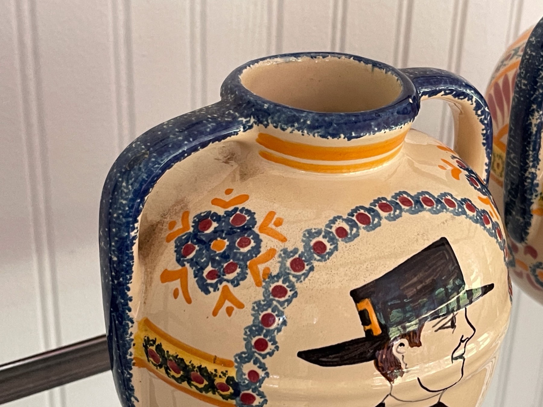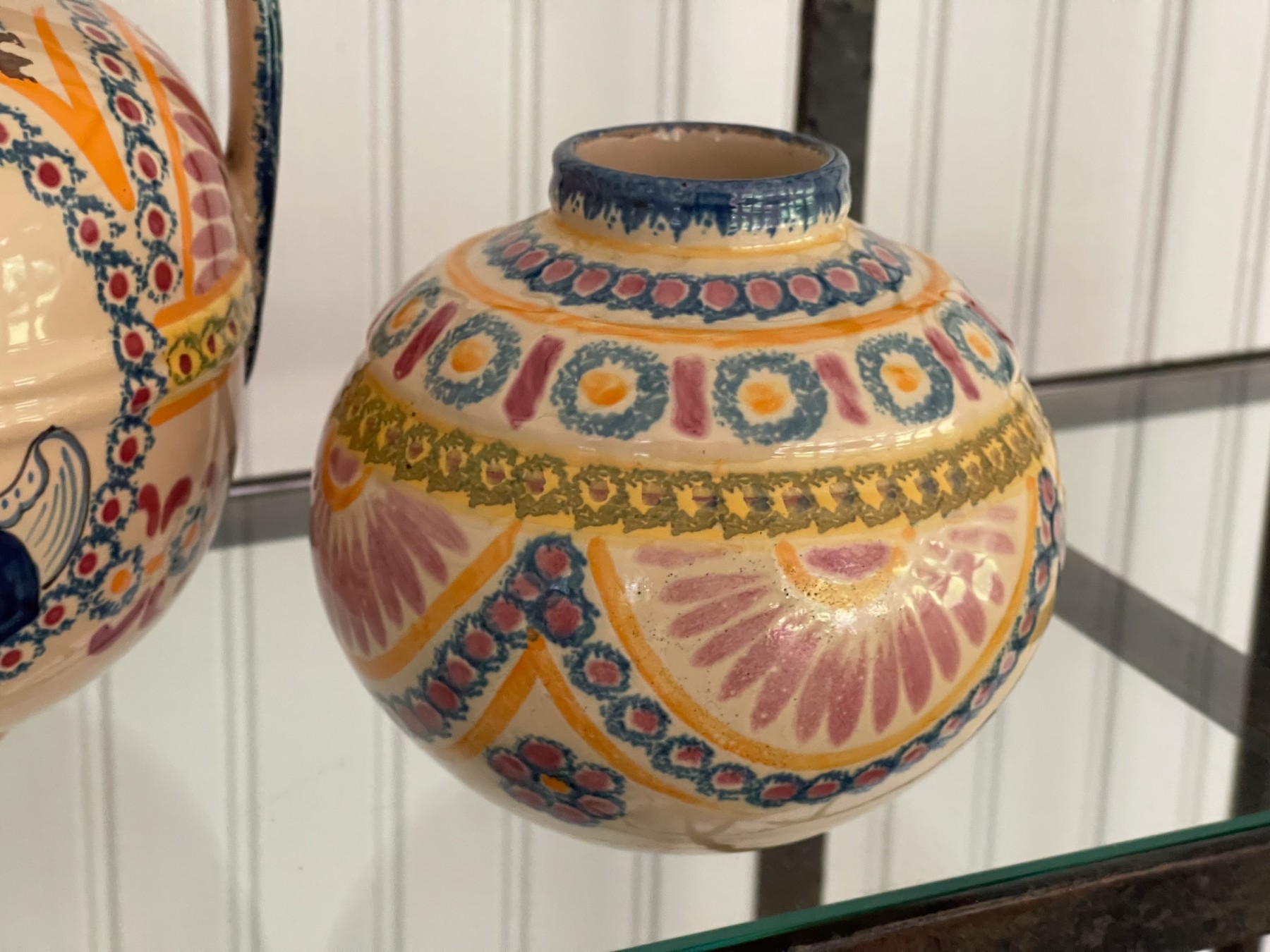 Dated 81, 89 & 99, collection of four handcrafted French Quimper pieces including two handled jugs (5 1/2 and 6 3/4"H), an octagonal lidden box (4 1/2" diameter), and a small bud vase (4 1/2"H). All signed.