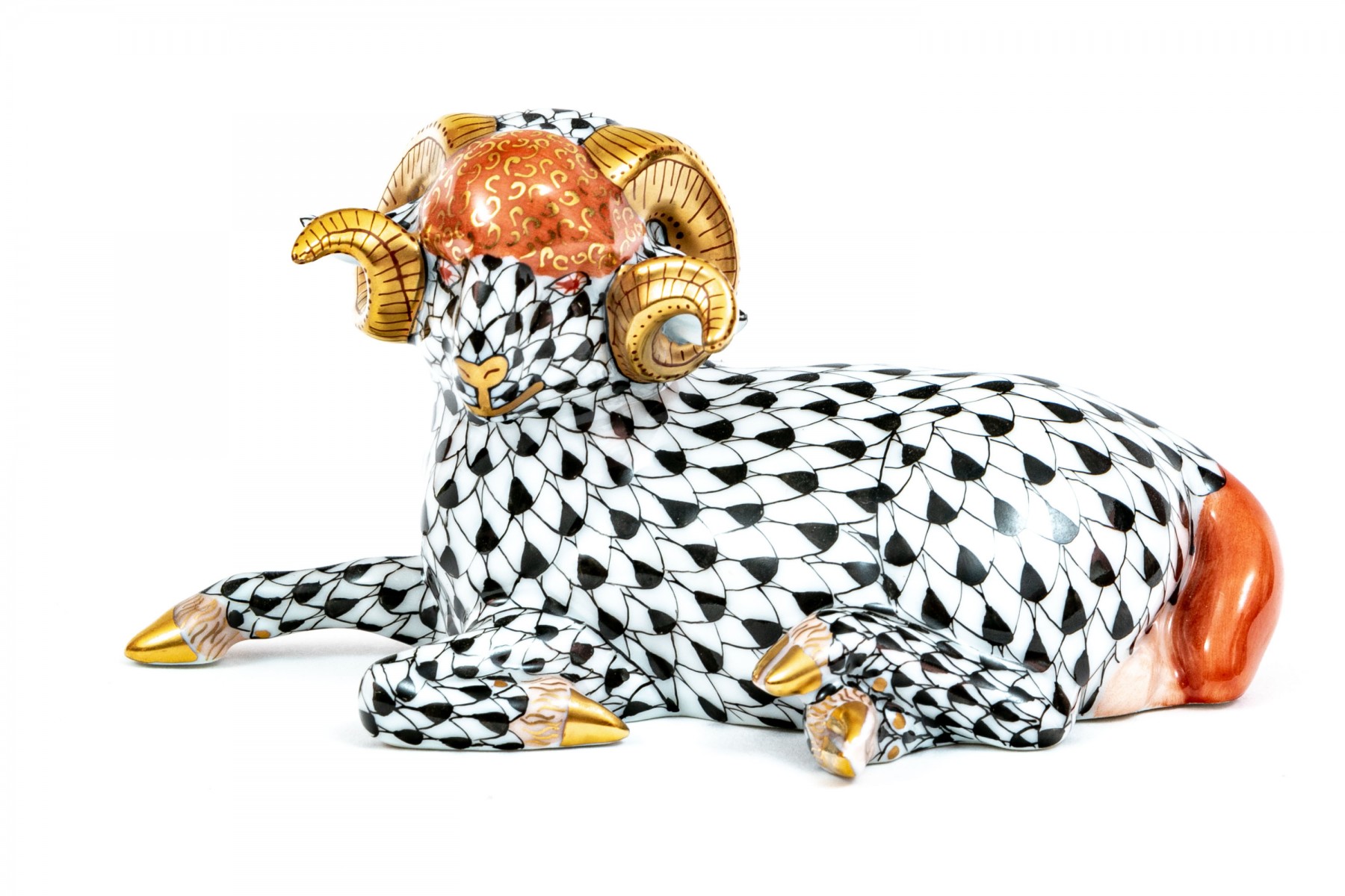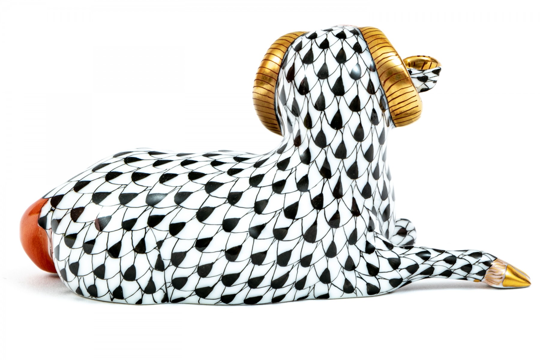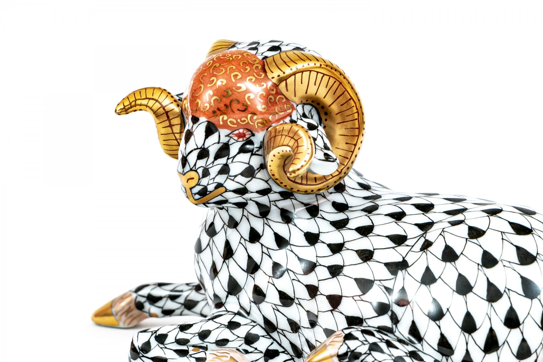 Herend black fishnet ram with rust accents, gold embellishments, 15379