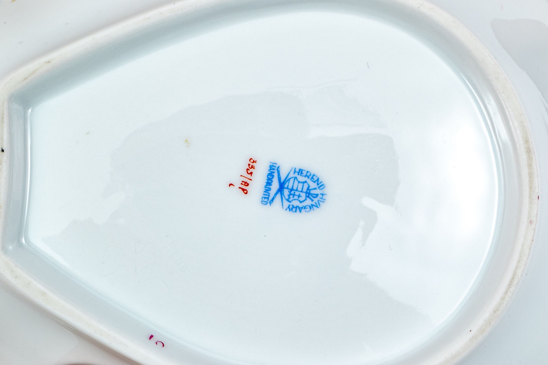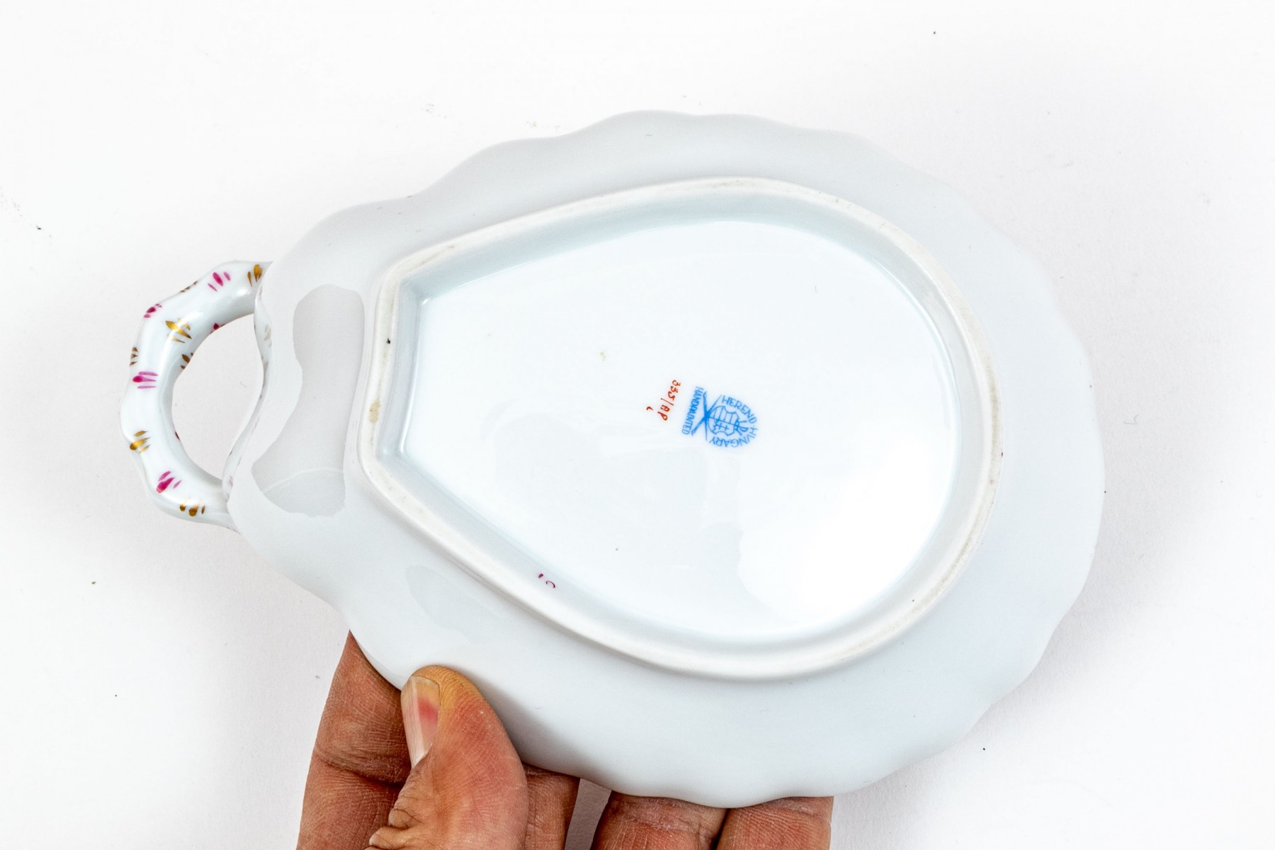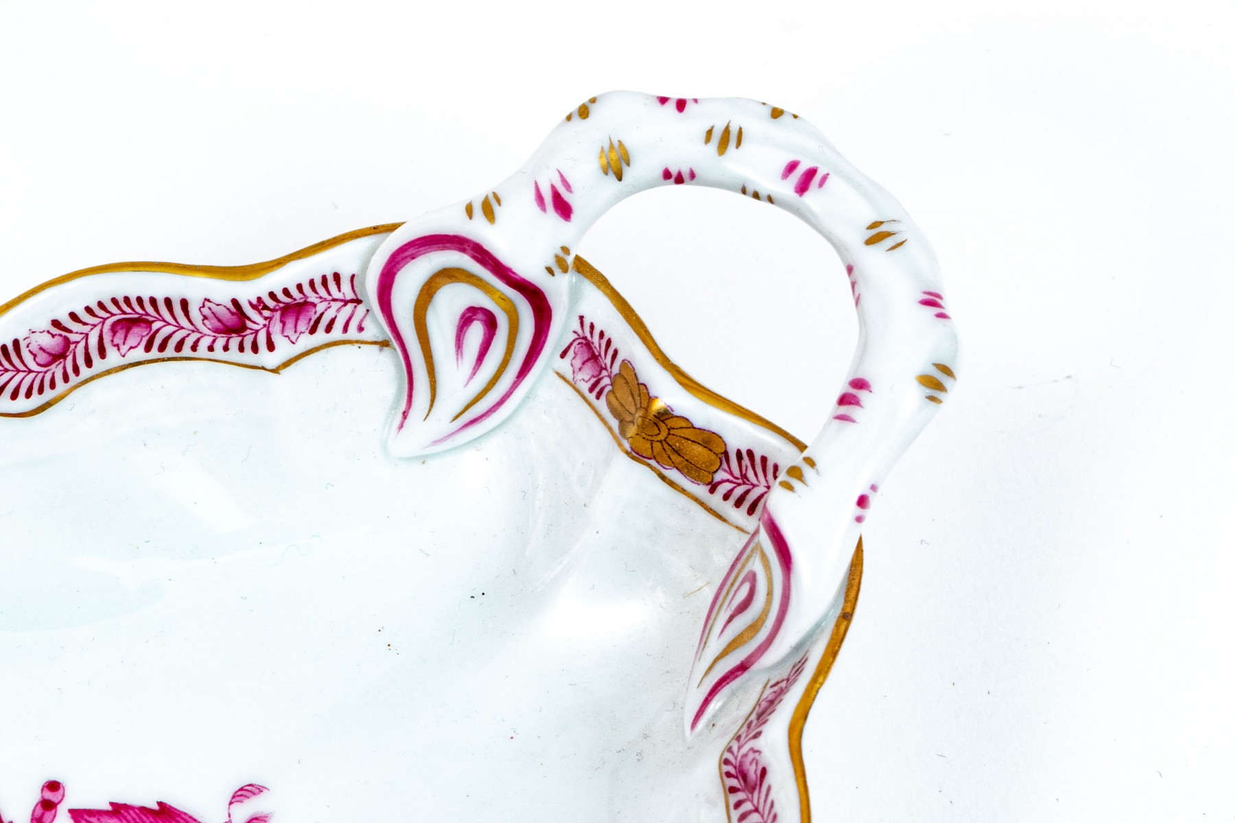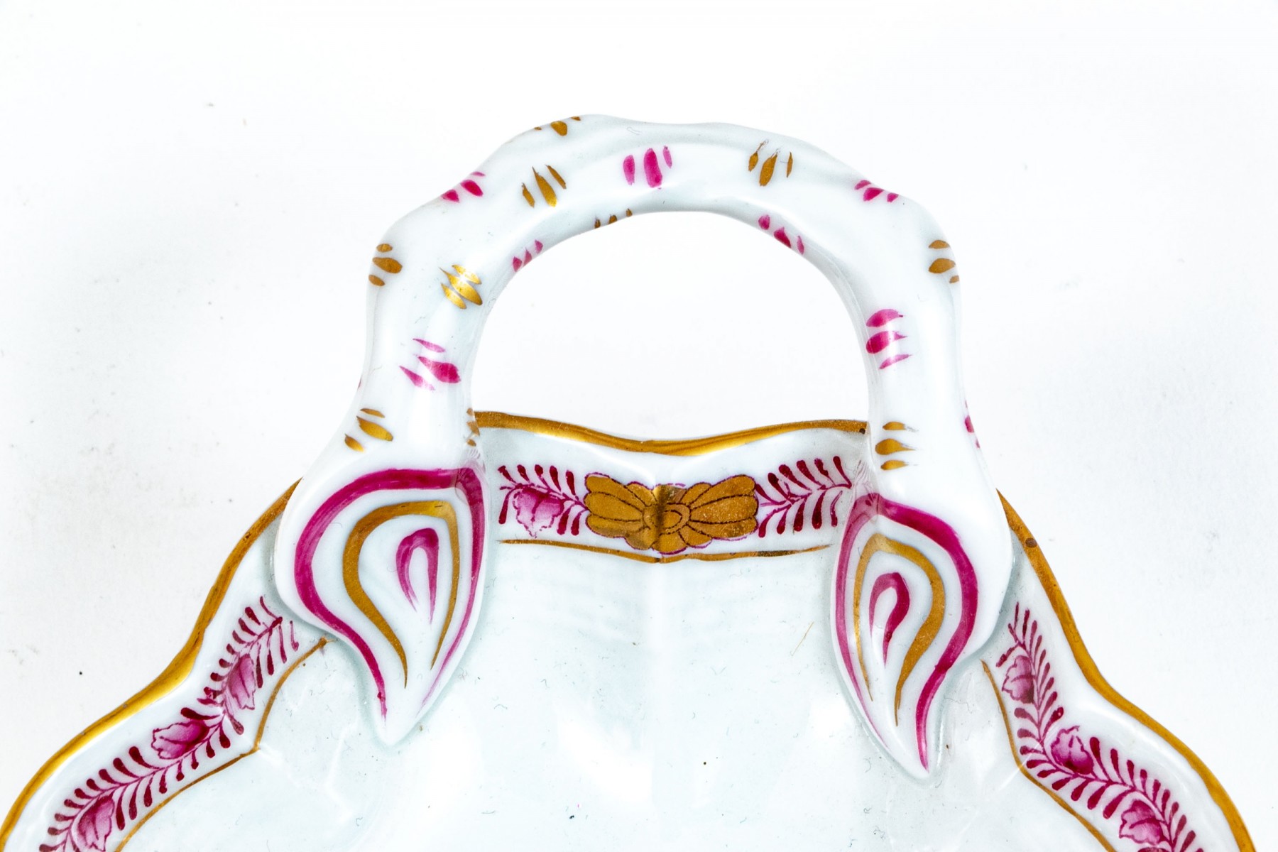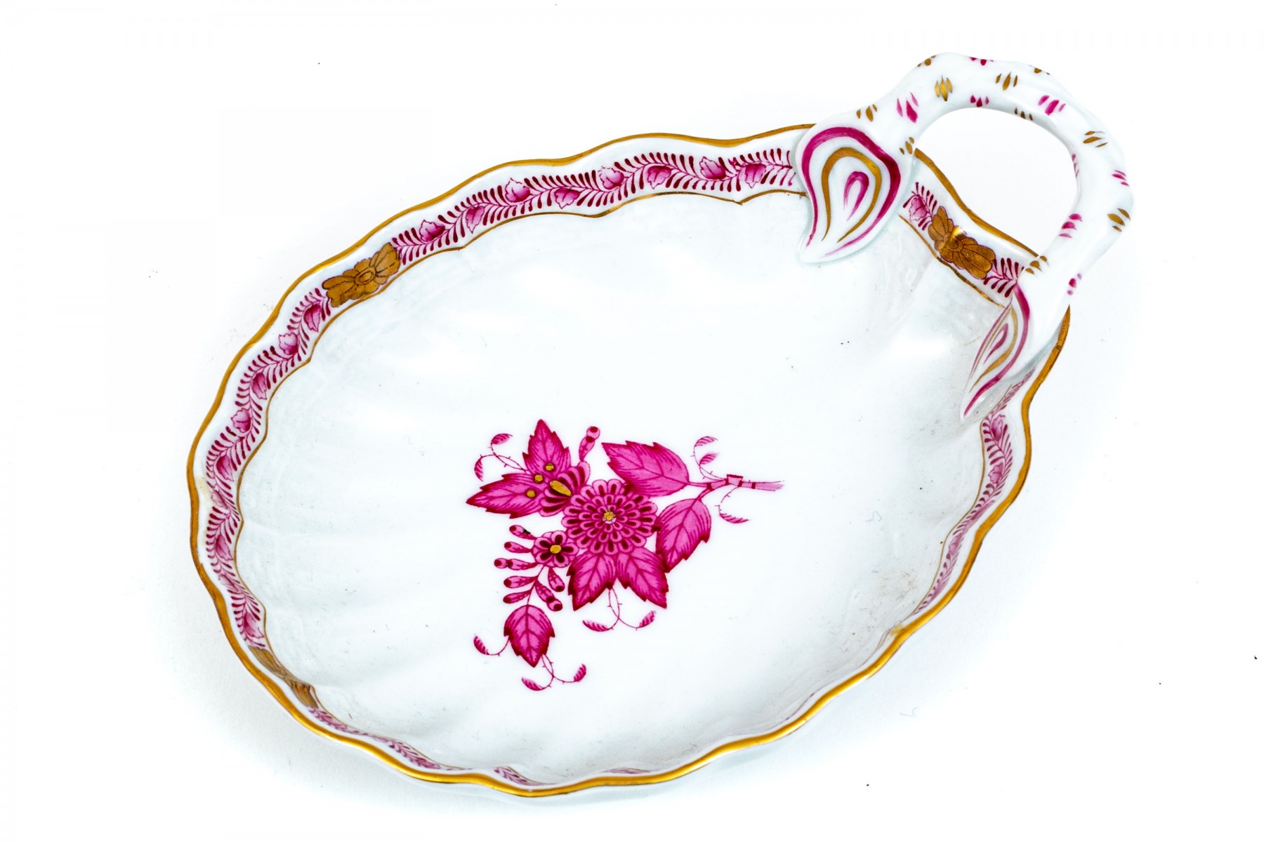 Herend Chinese bouquet shell shaped bon bon with single handles, gold trim and embellishments.