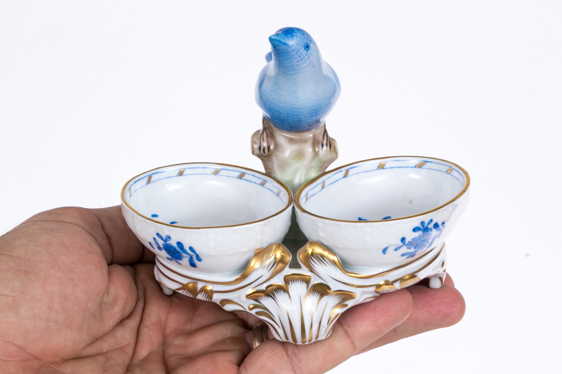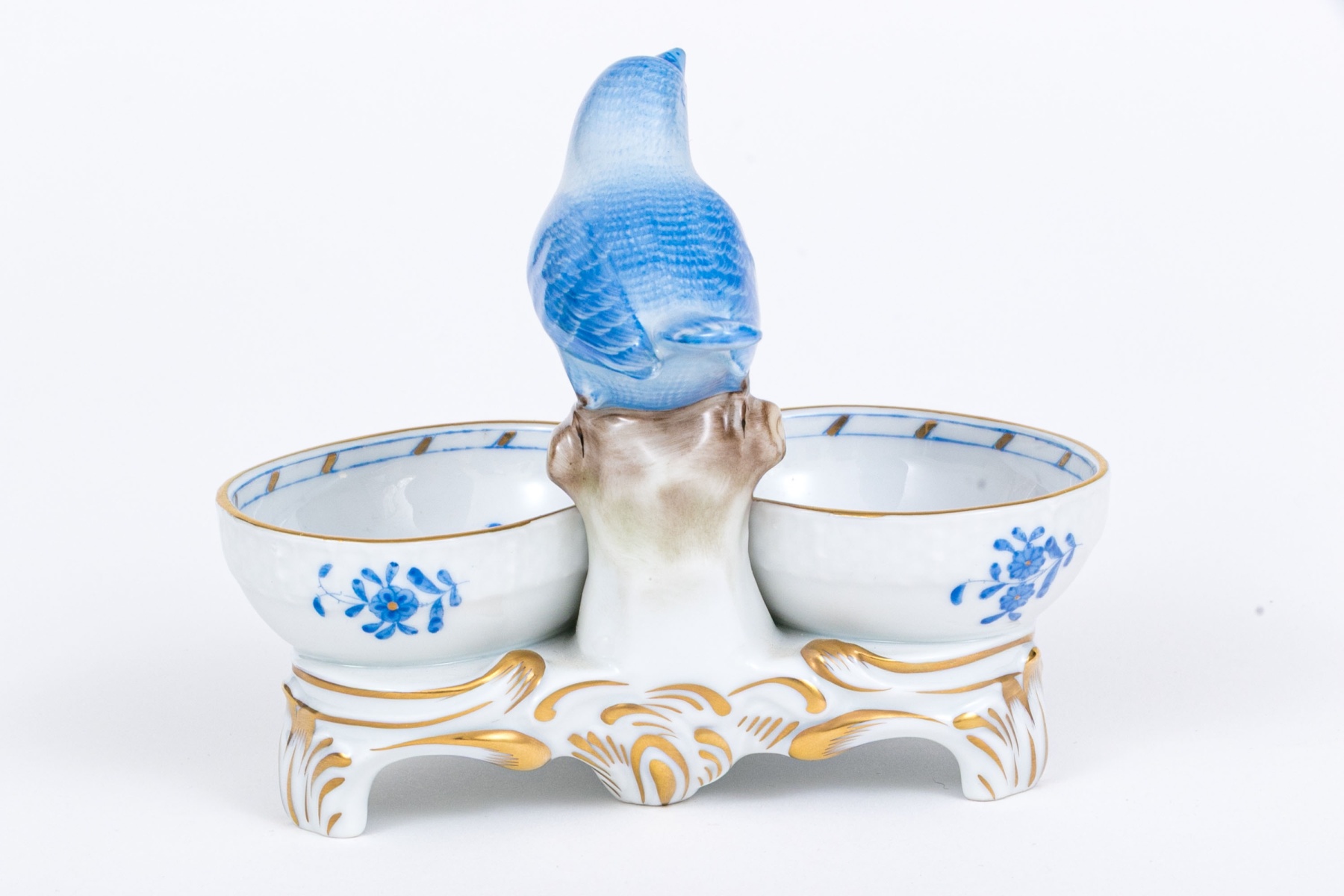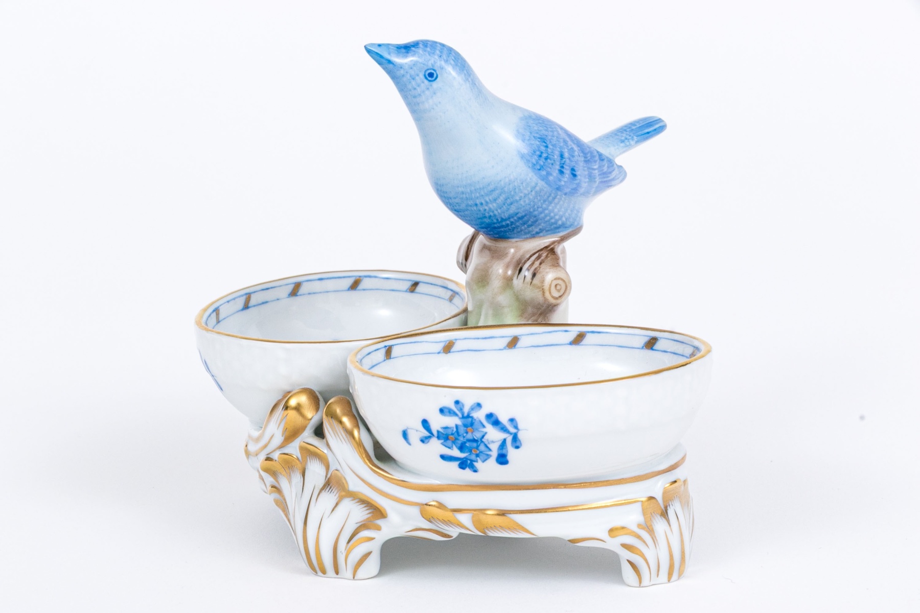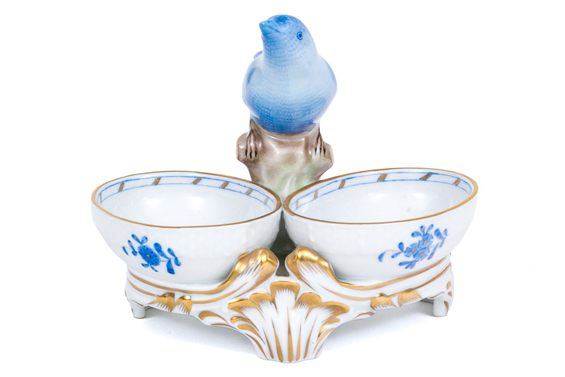A fine Hungarian, Herend hand-painted "Chinese Bouquet" pattern porcelain double form salt cellar with perched bird finial. Marked underneath. Lavishly decorated with two oval bowls on a footed stand with lavish gilt trimmed feathered scrolls. The two oval bowls with blue floral bouquet sprays with gilt trims and interior decorative bands. A central hand-painted perched bird form handle or finial.