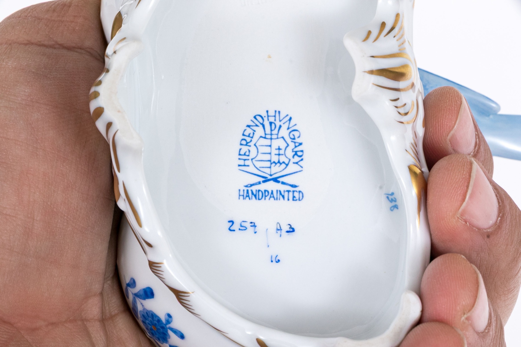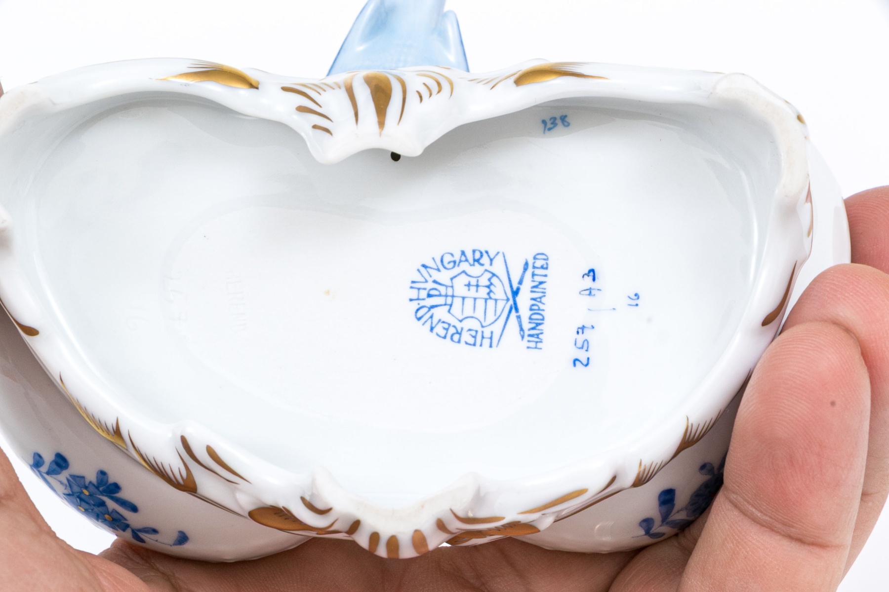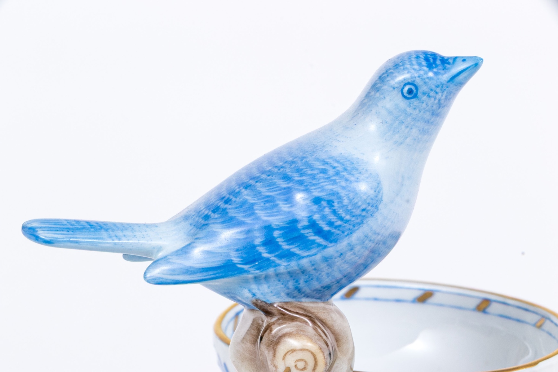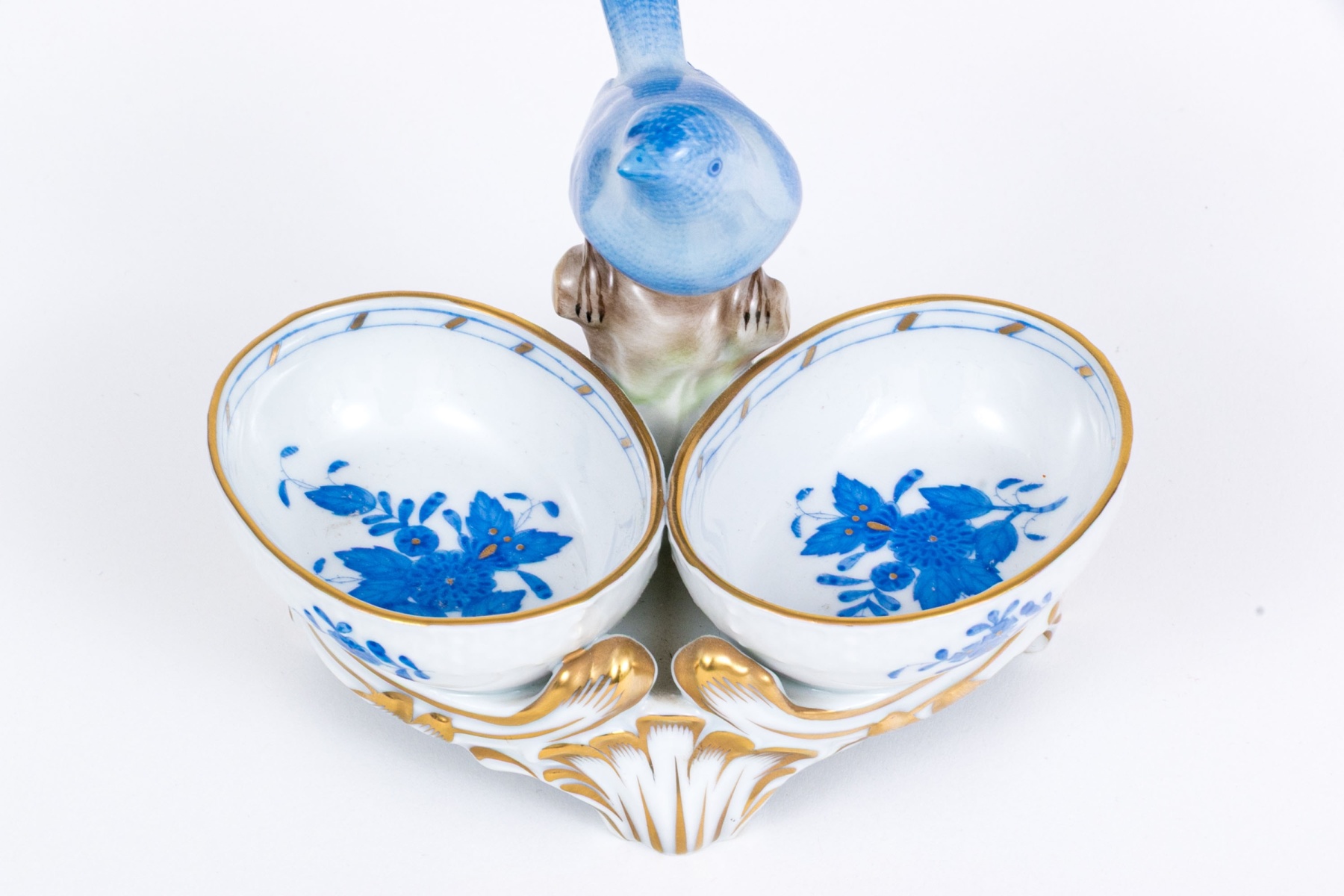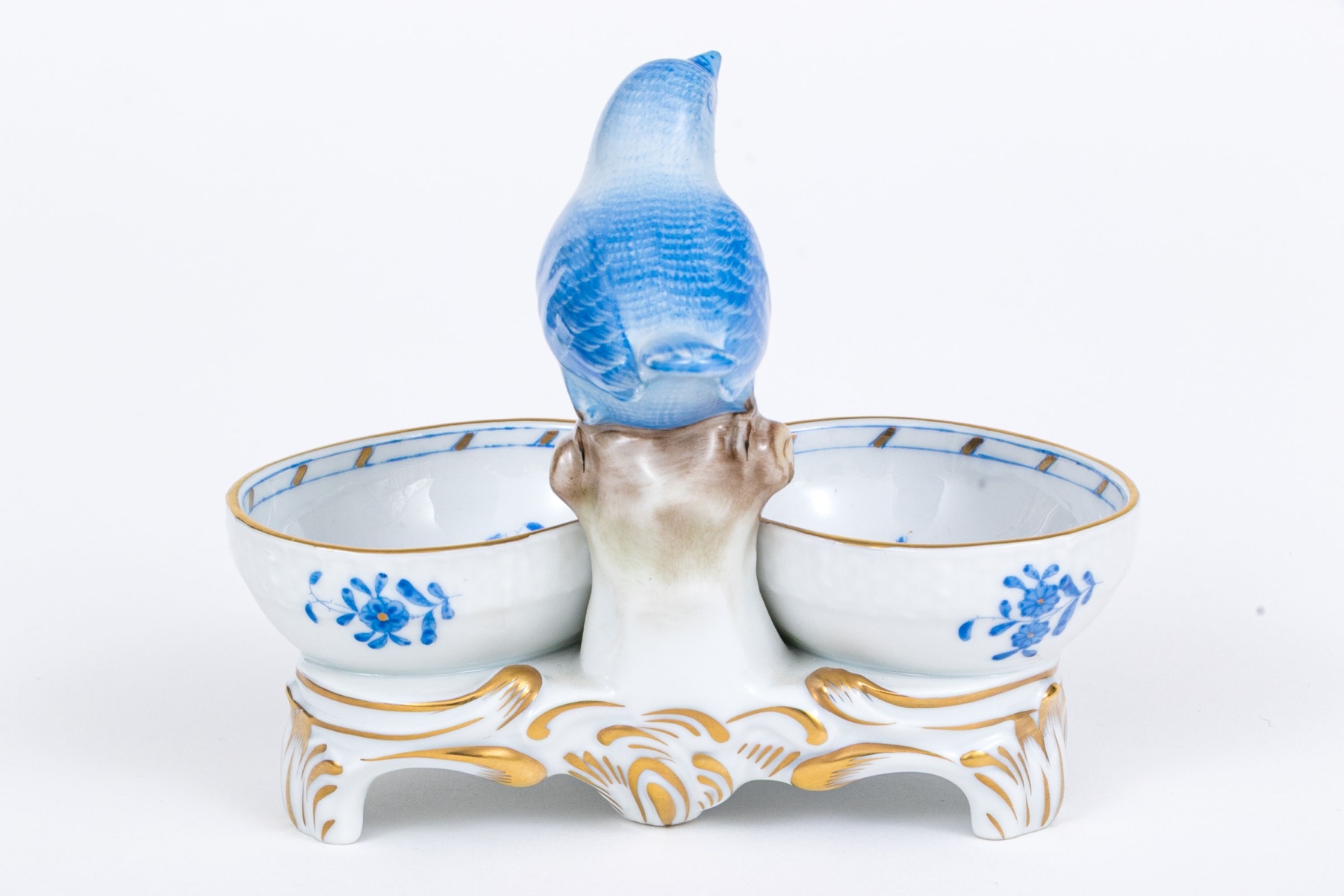 A fine Hungarian, Herend hand-painted "Chinese Bouquet" pattern porcelain double form salt cellar with perched bird finial. Marked underneath. Lavishly decorated with two oval bowls on a footed stand with lavish gilt trimmed feathered scrolls. The two oval bowls with blue floral bouquet sprays with gilt trims and interior decorative bands. A central hand-painted perched bird form handle or finial.