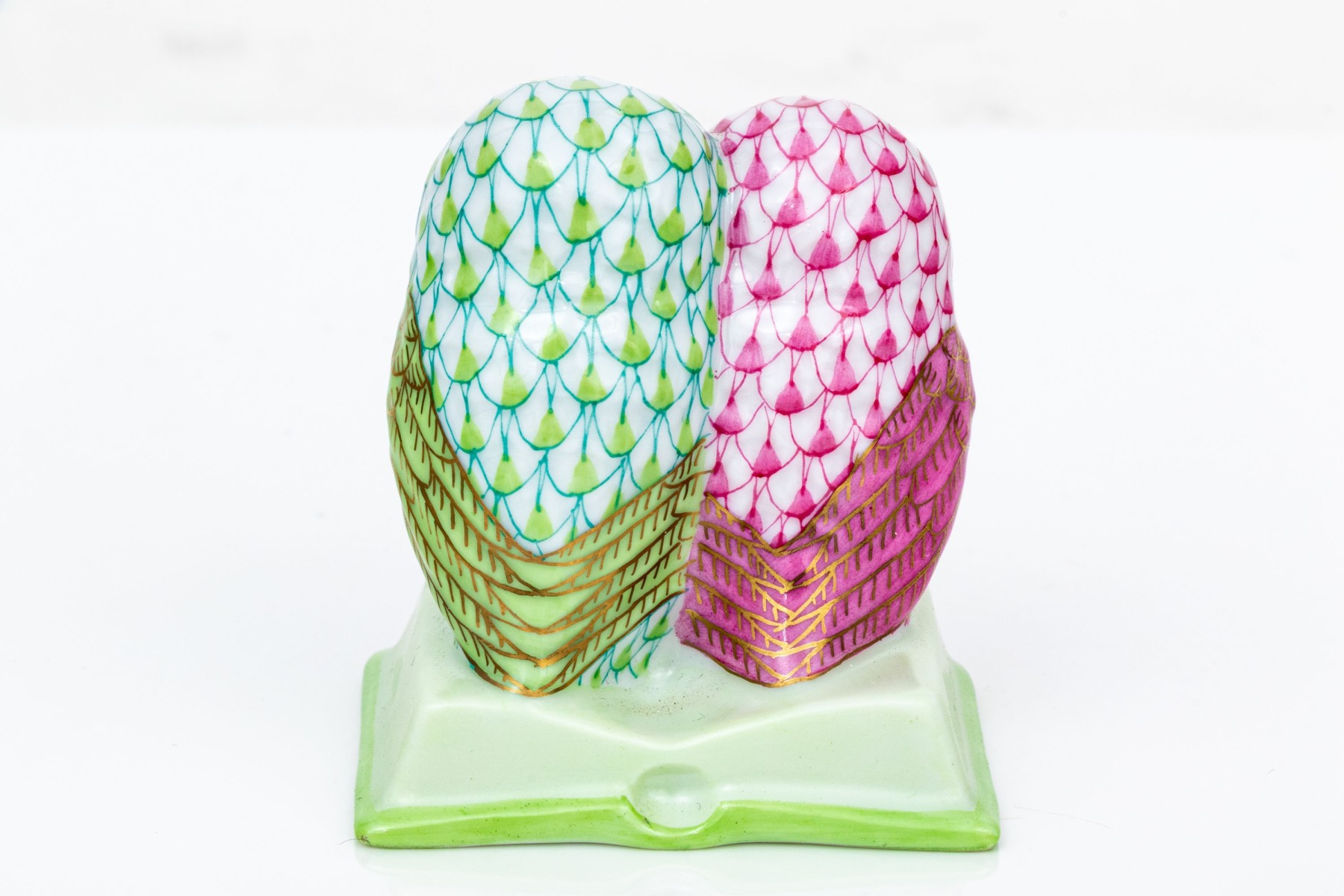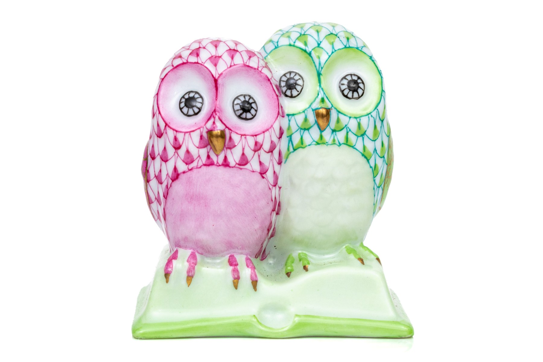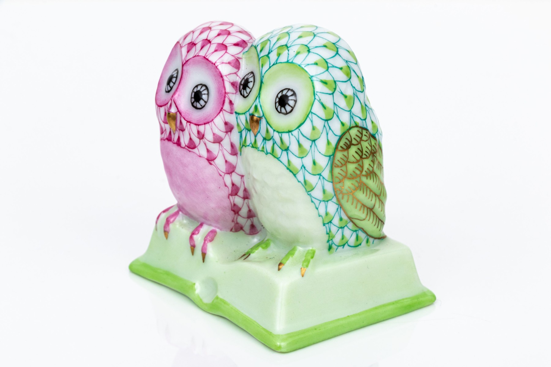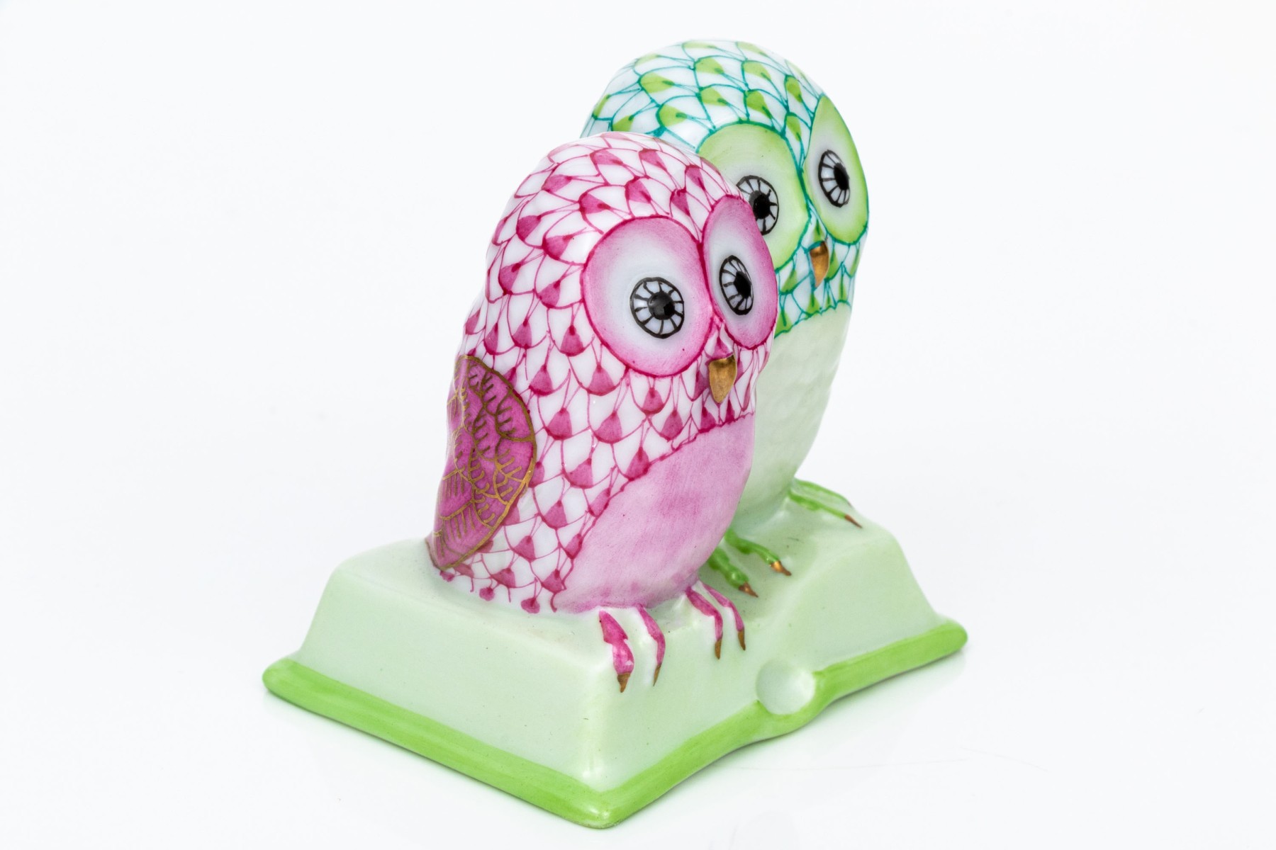 Two baby owls in a pink or green fishnet pattern are perched on a green and white base. The wings are solid pink or green with gilt details.