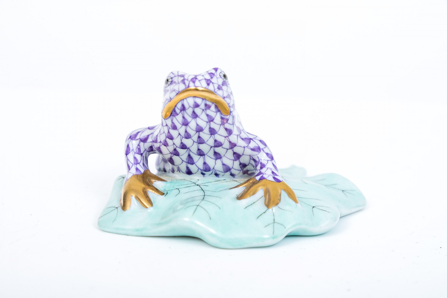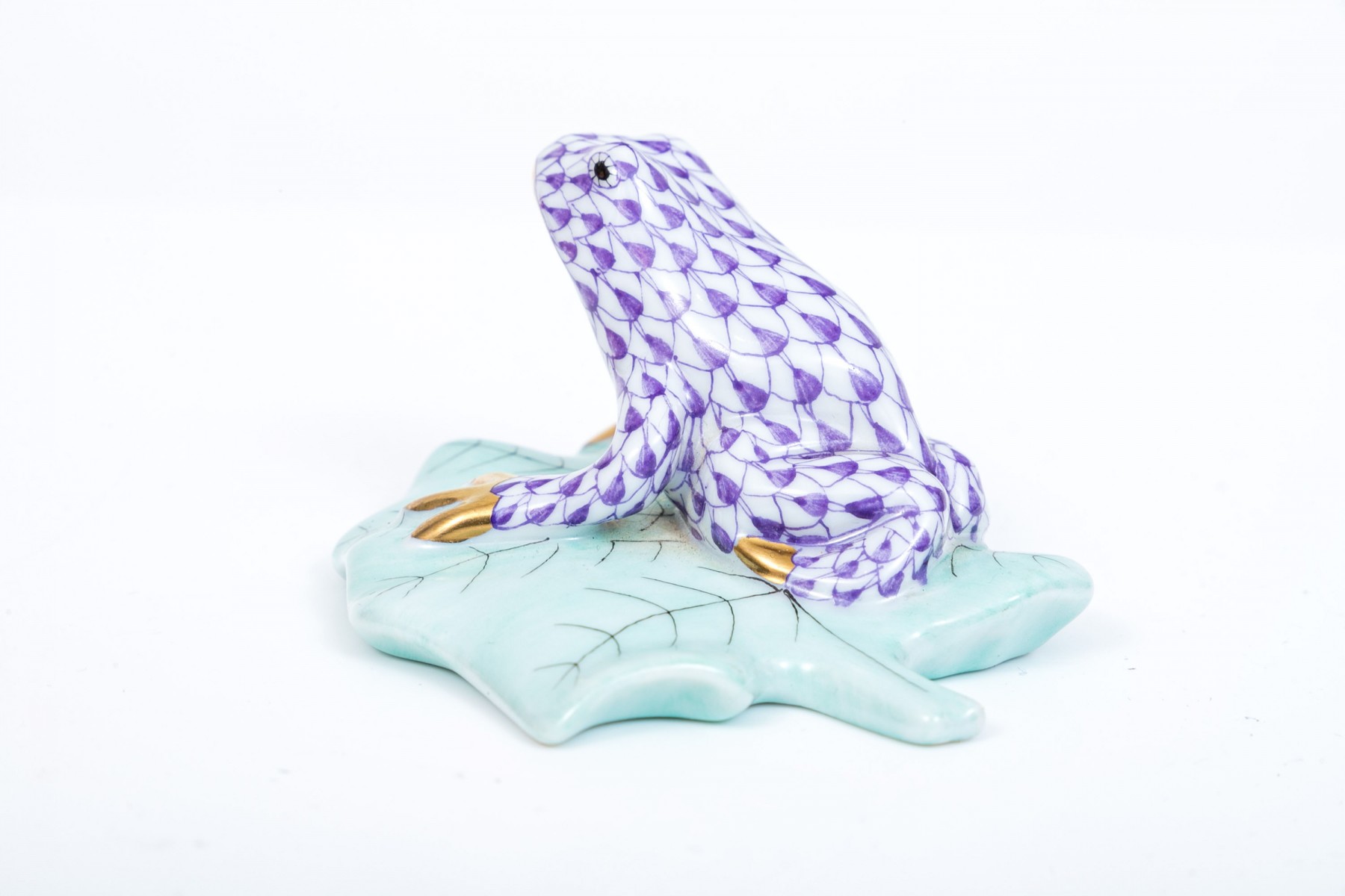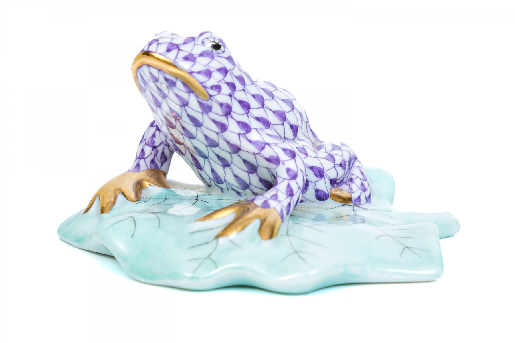 The frog in a purple fishnet pattern with gilt feet resting on a green/blue leaf.