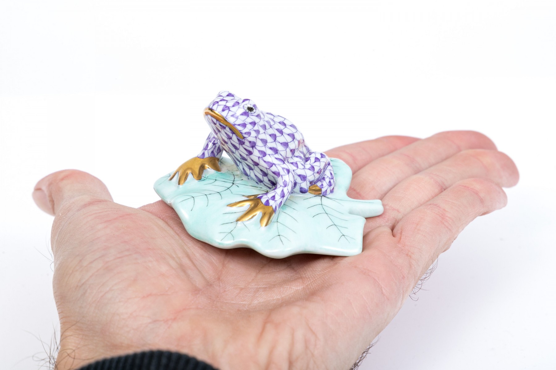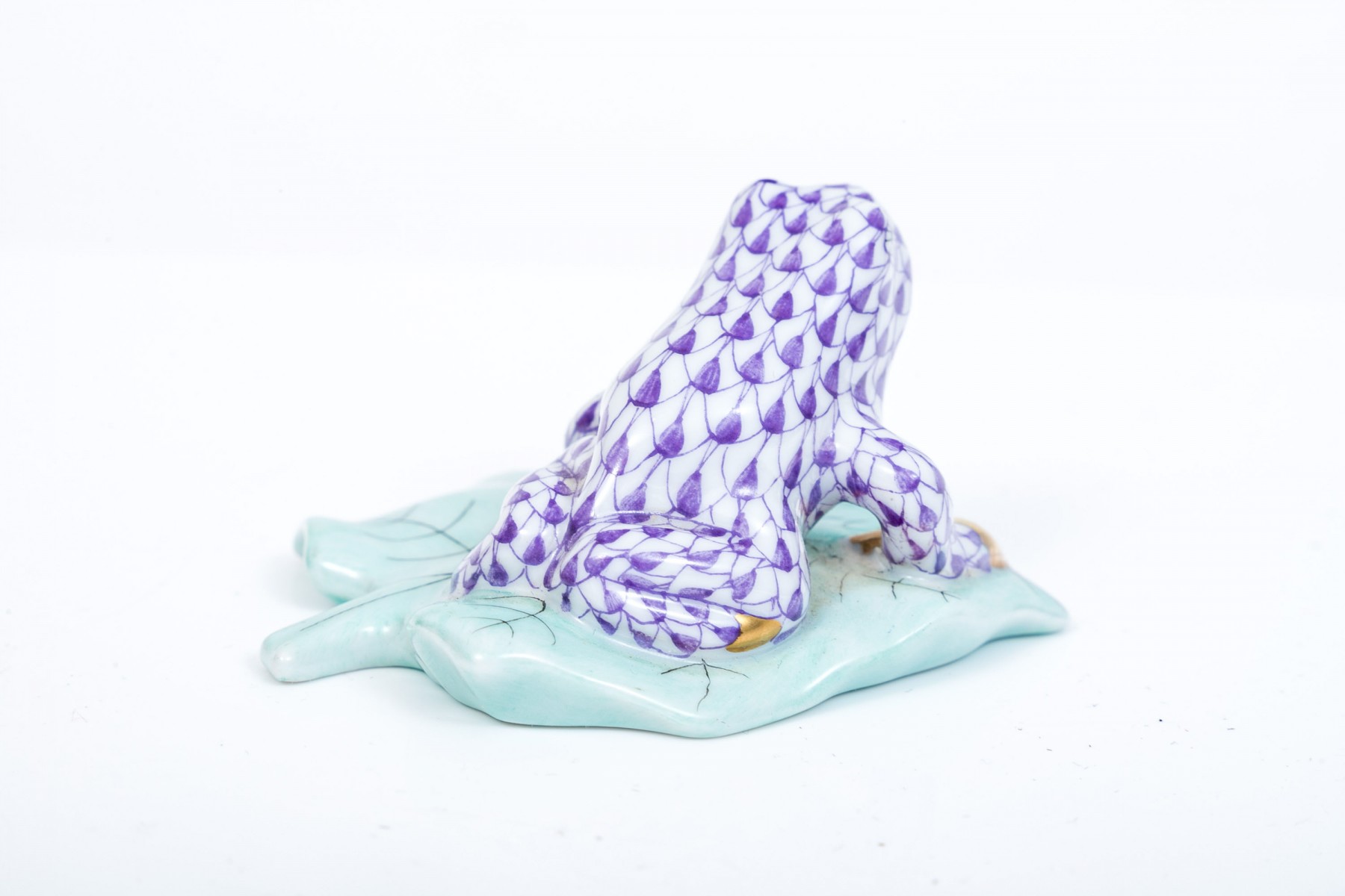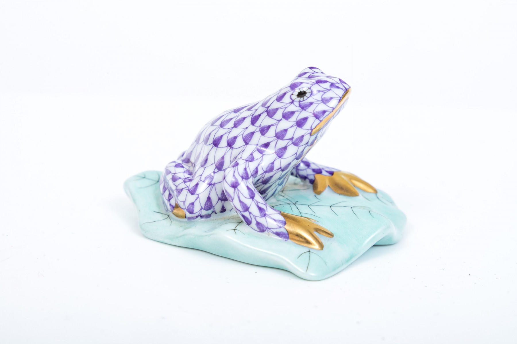 The frog in a purple fishnet pattern with gilt feet resting on a green/blue leaf.