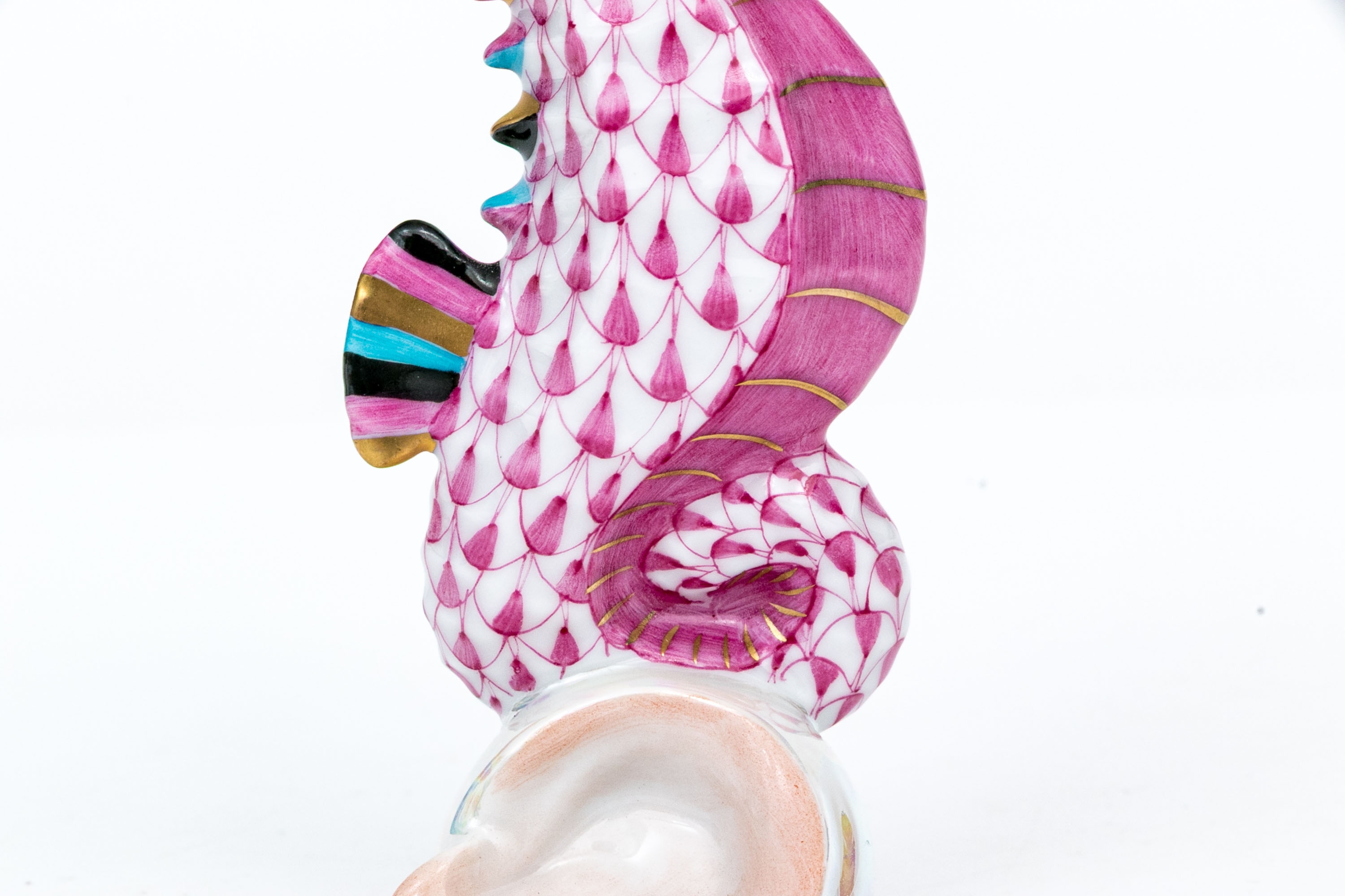 A sweet seahorse with polychrome spiky mane and fin. The curled tail stands on an iridescent seashell.