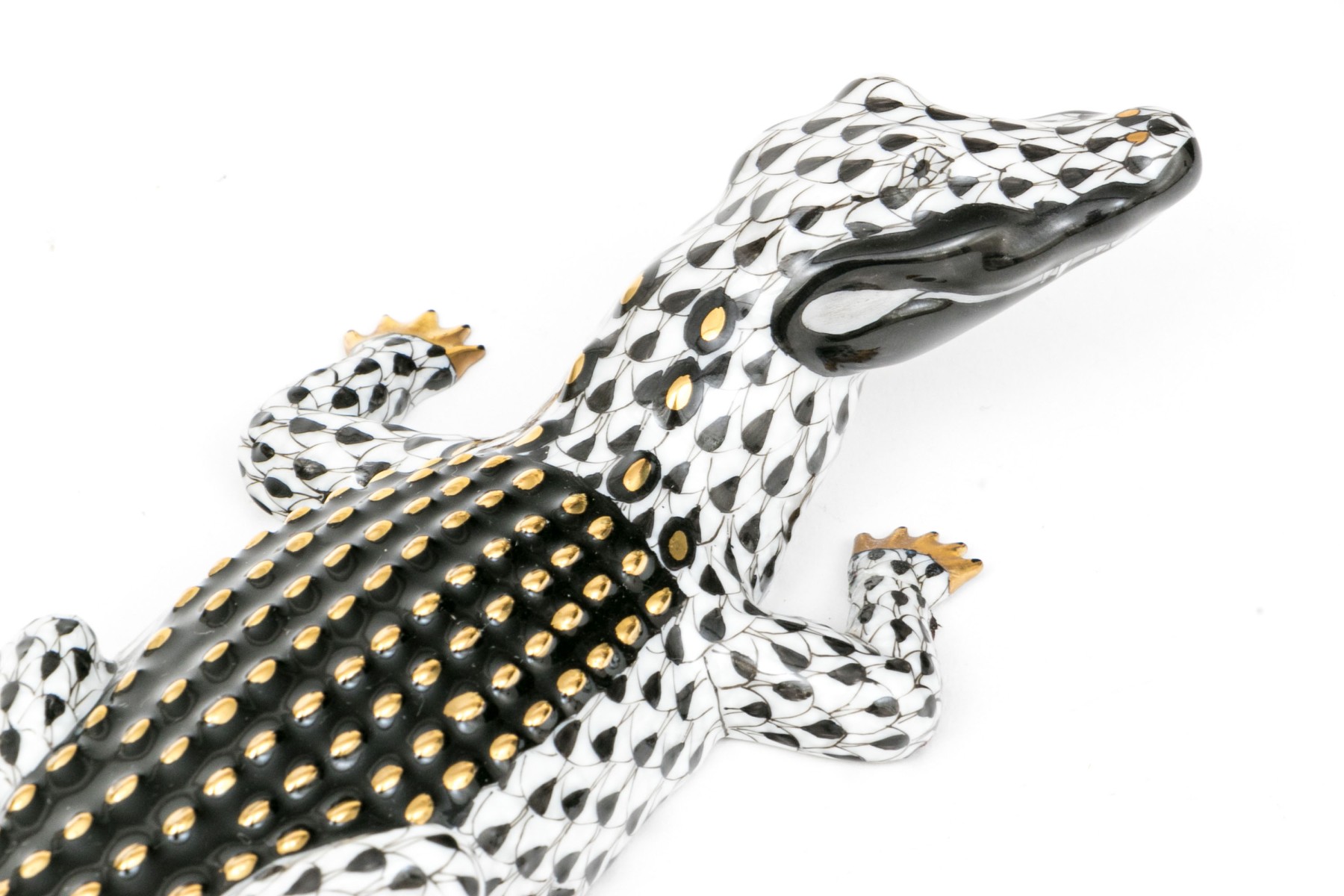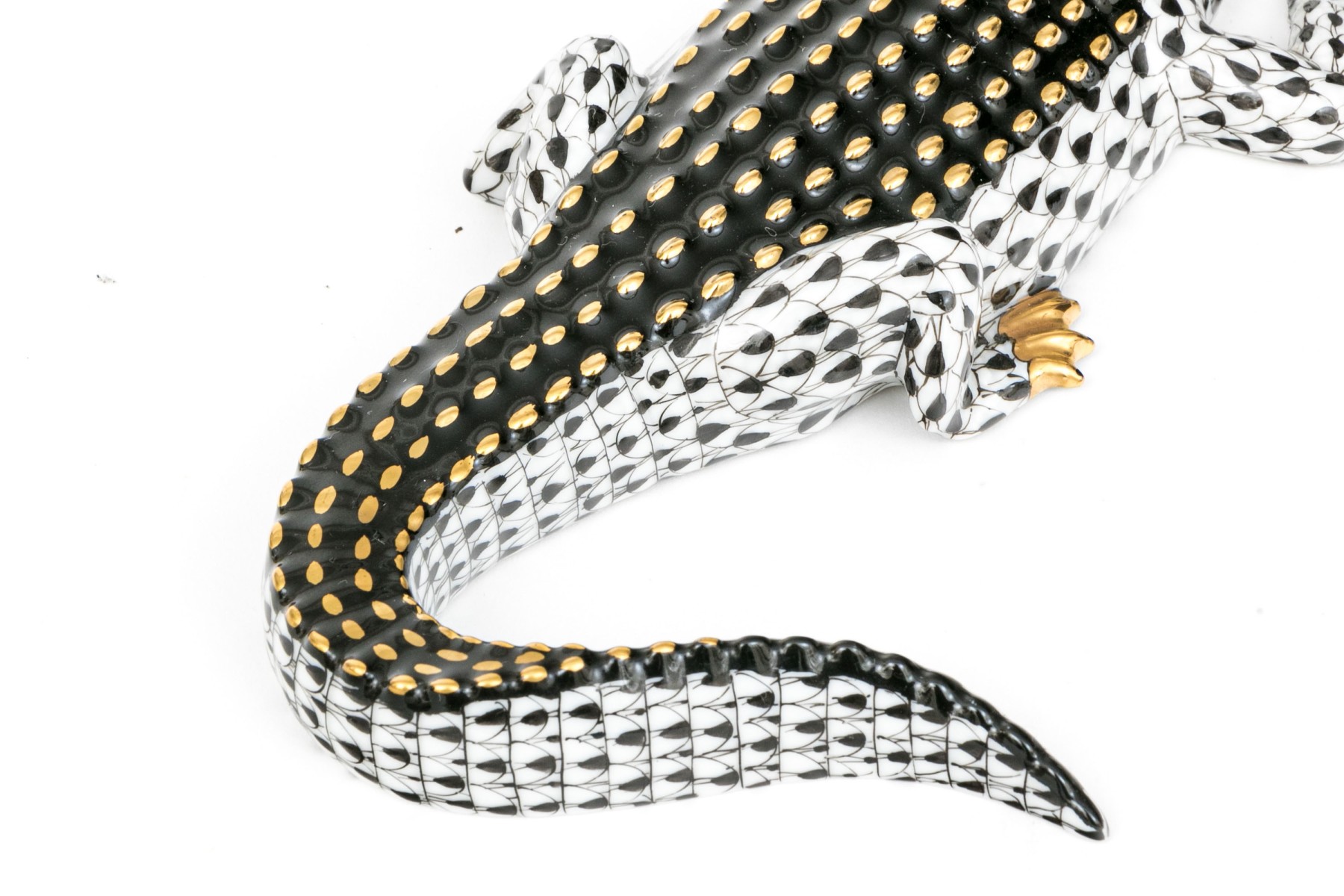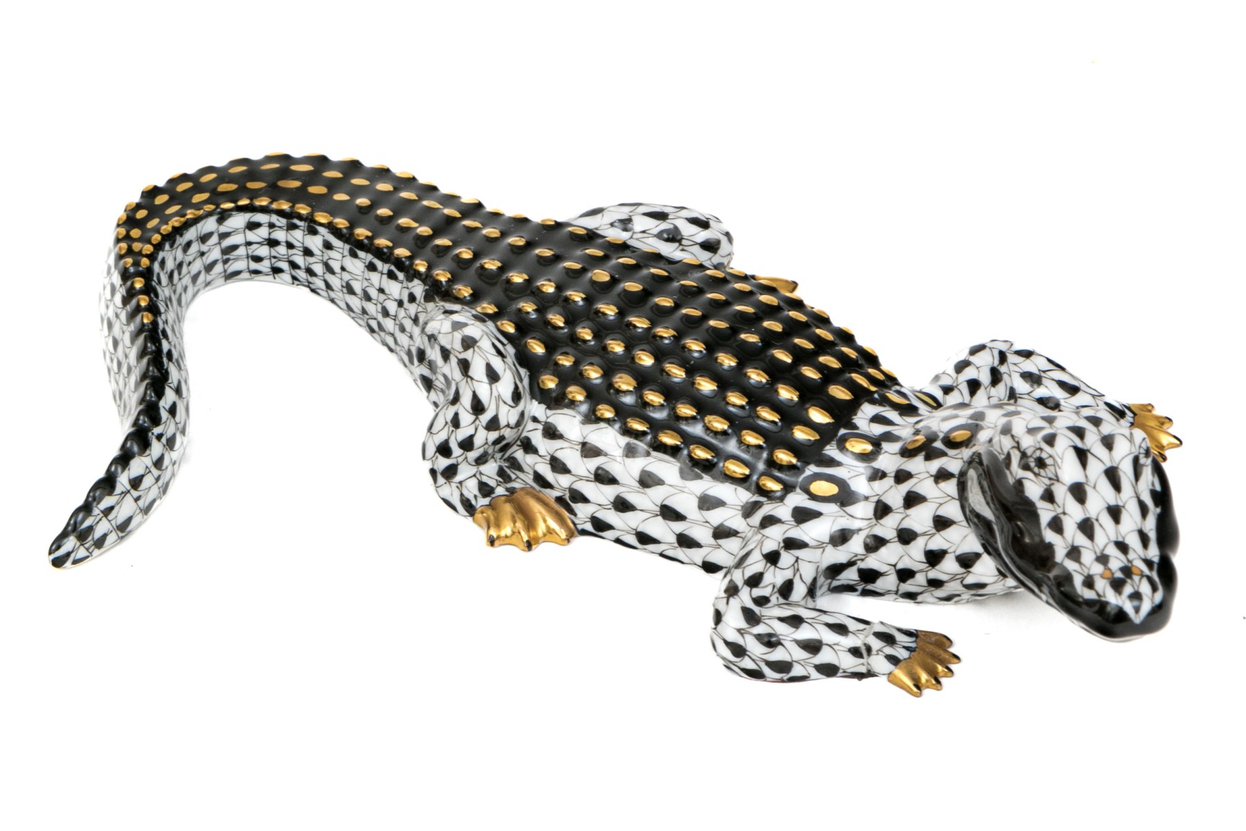 A vintage Herend Hungarian porcelain figure of an alligator posed in a sinuous, serpentine form and finished in striking black and white, hand-painted with fishnet patterns and gilt spines along the back.