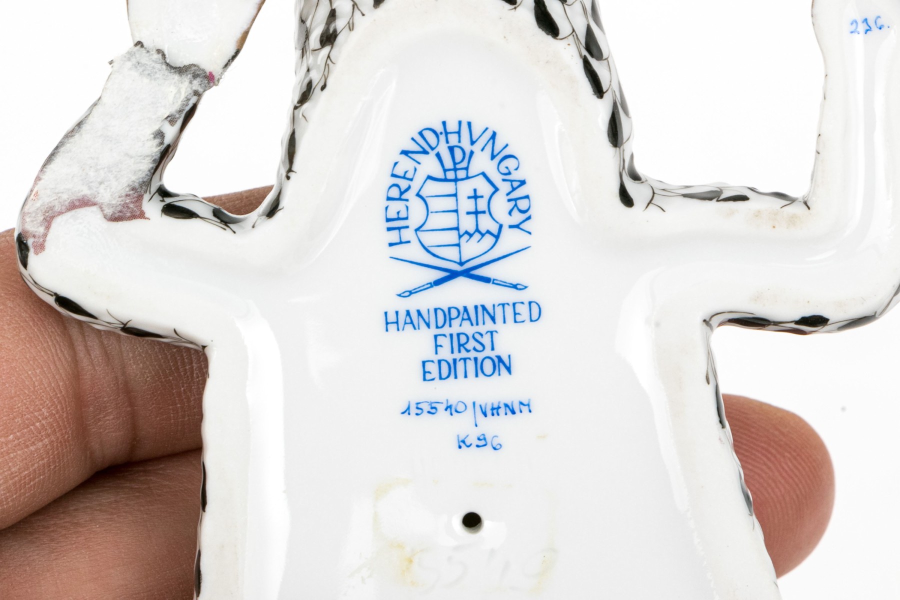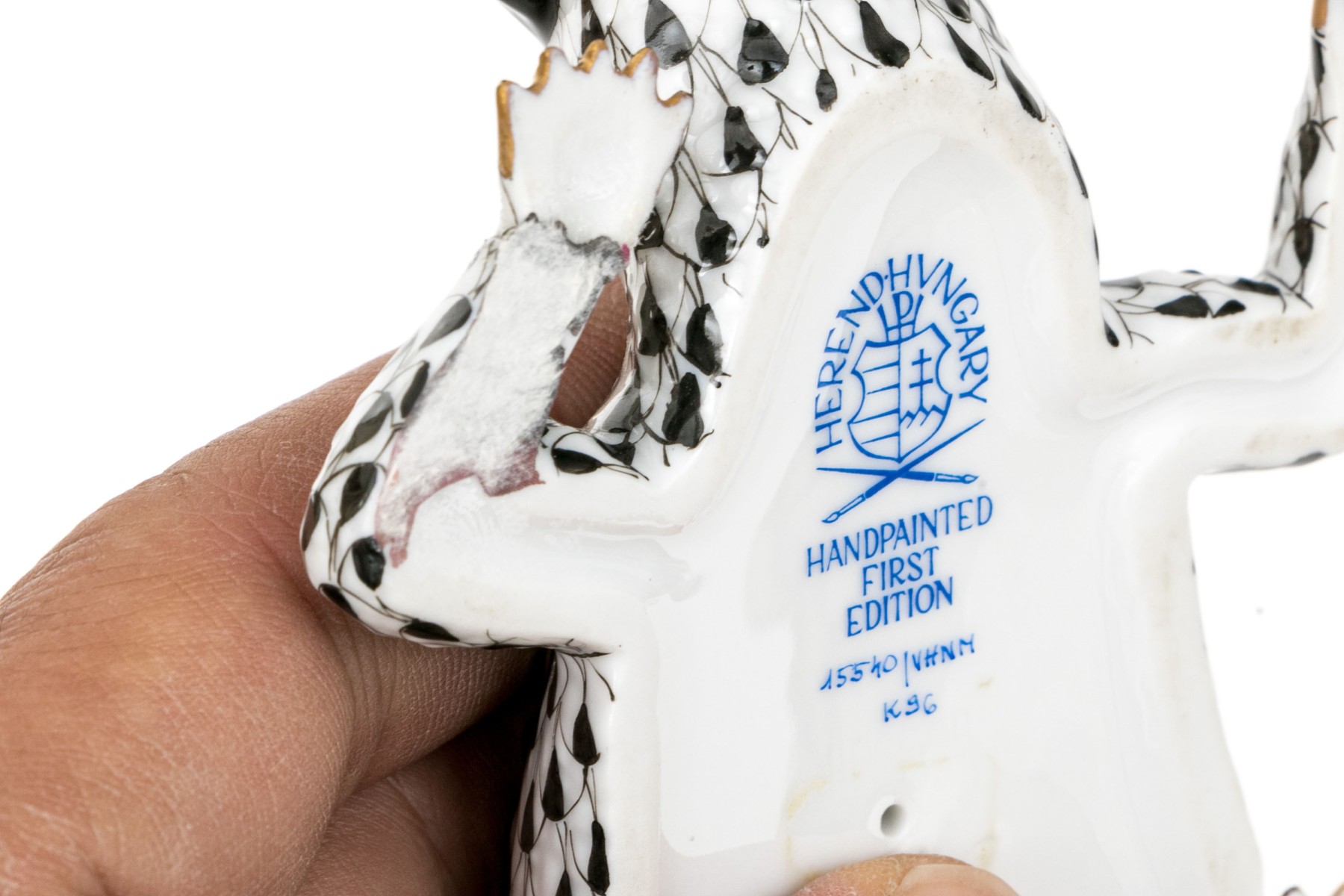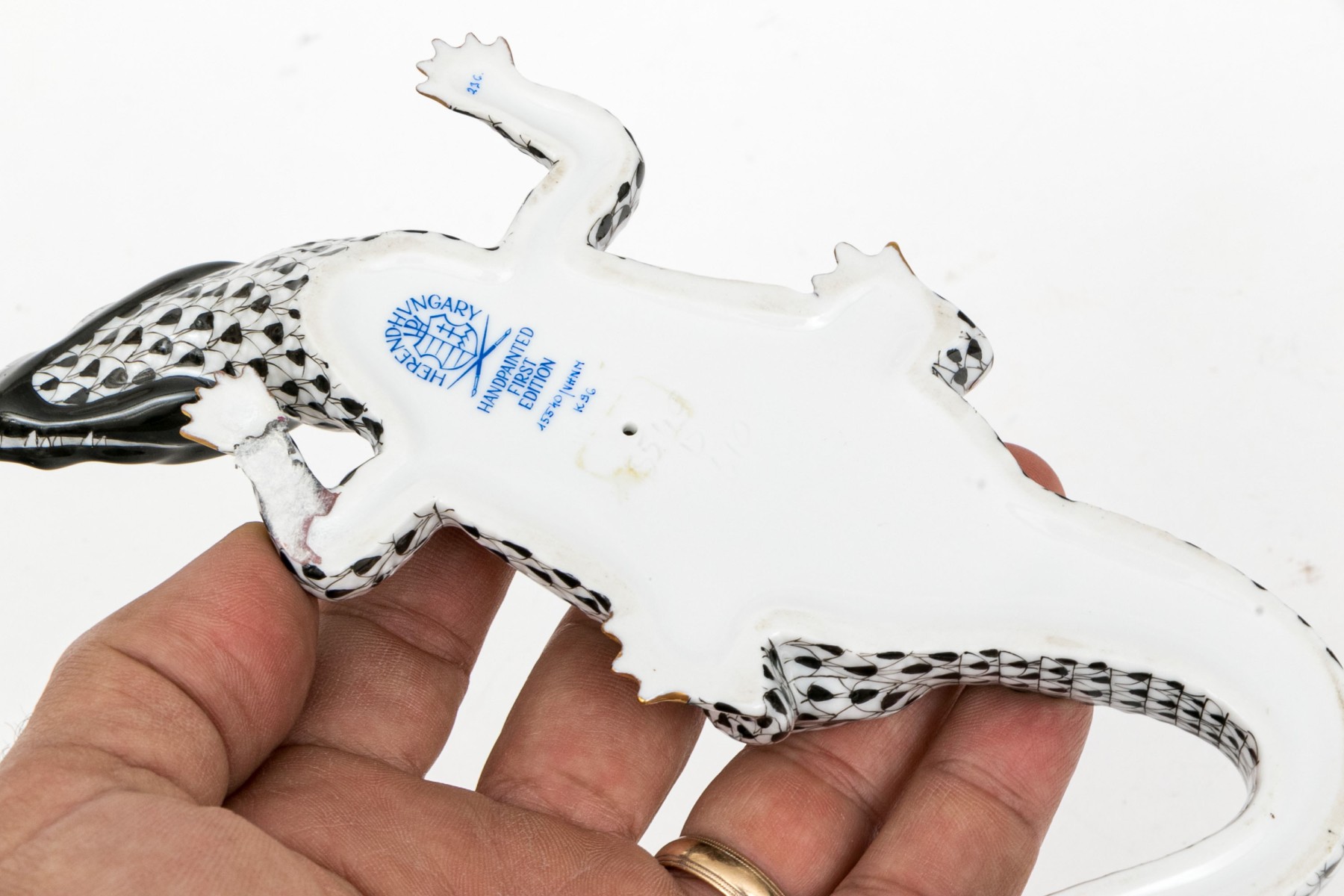 A vintage Herend Hungarian porcelain figure of an alligator posed in a sinuous, serpentine form and finished in striking black and white, hand-painted with fishnet patterns and gilt spines along the back.