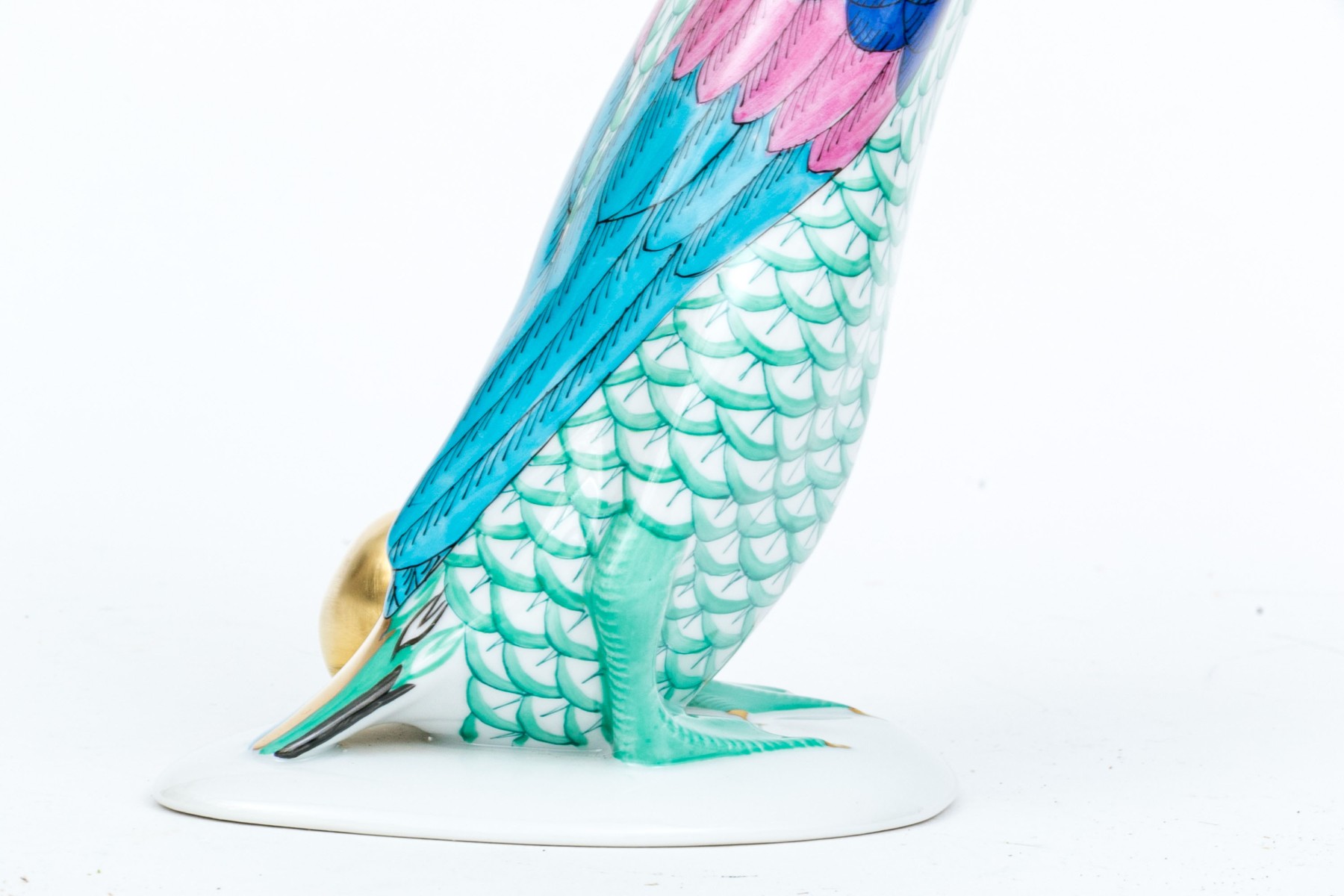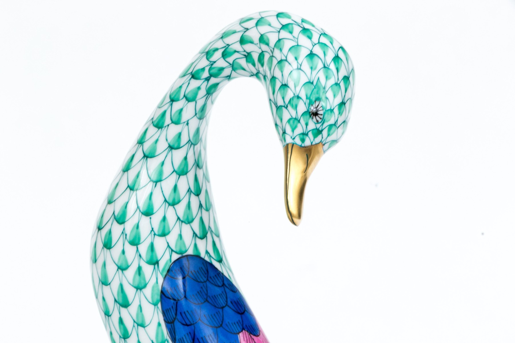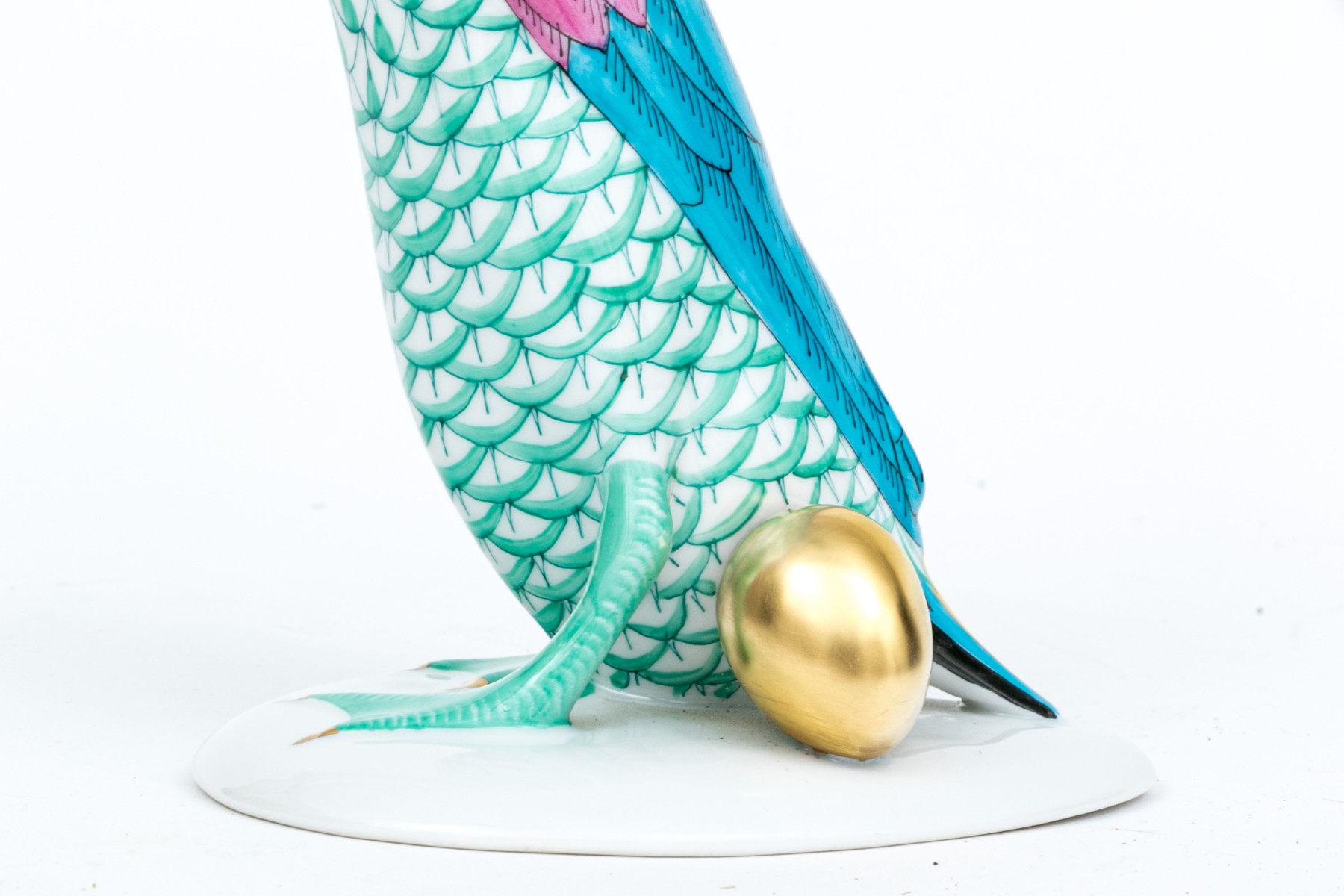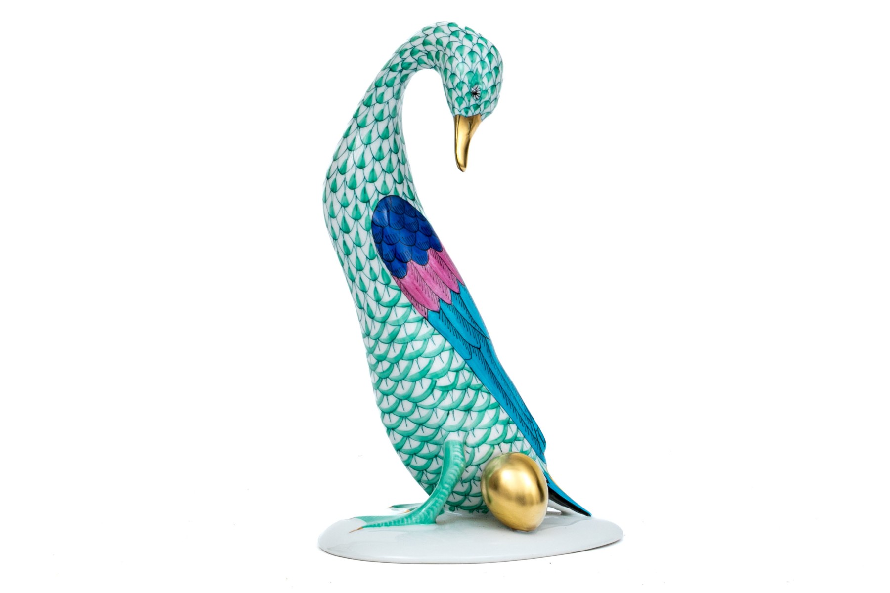 A fabulous Herend Hungarian porcelain figure of a goose in teal green painted fishnet pattern with blue and pink wings, standing elegantly with its arched neck curved to inspect a gilt egg near its feet over a shaped base.