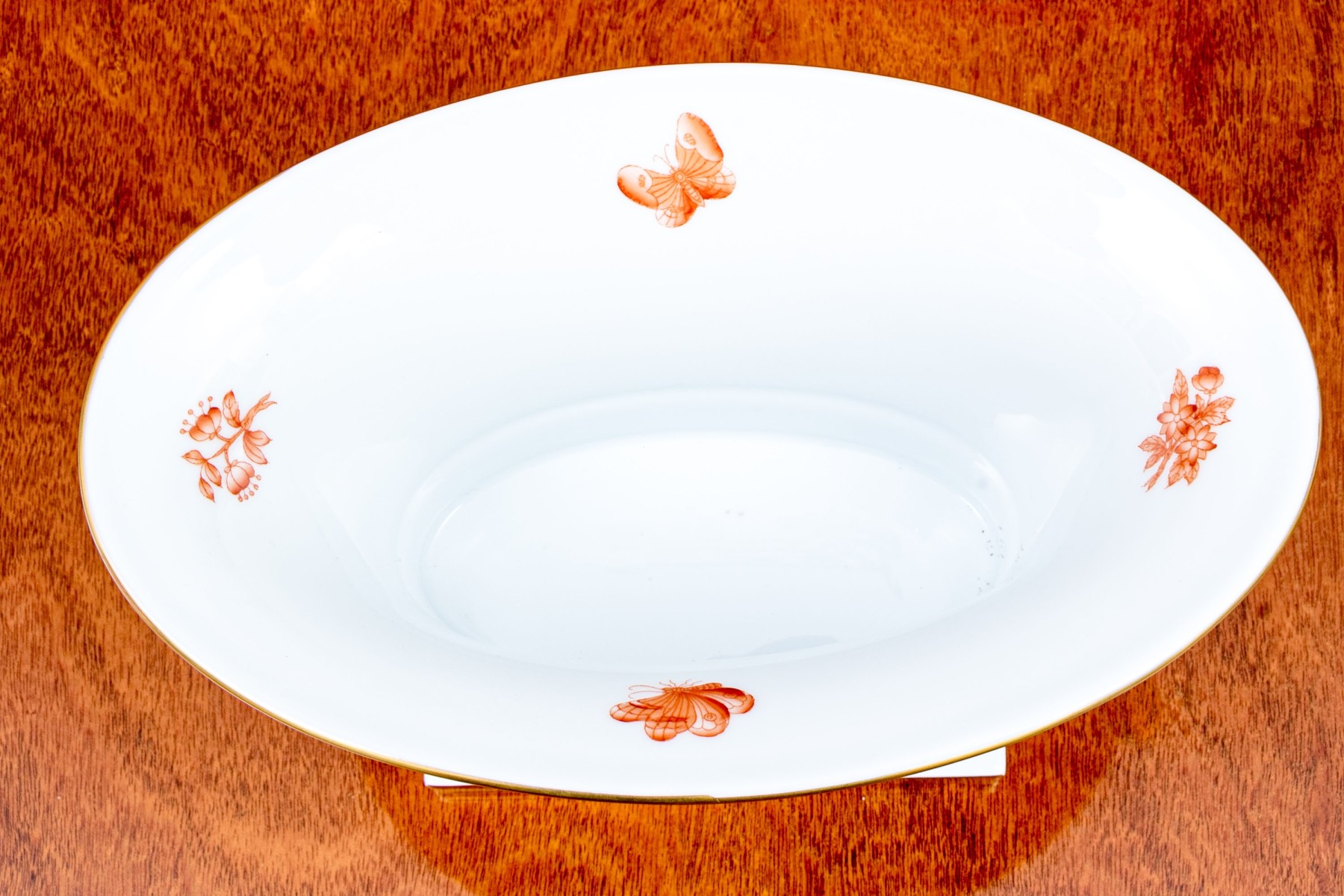 The oval bowl with flared mouth rim with gilt finished trim and iron red decorative floral and butterfly sprays.