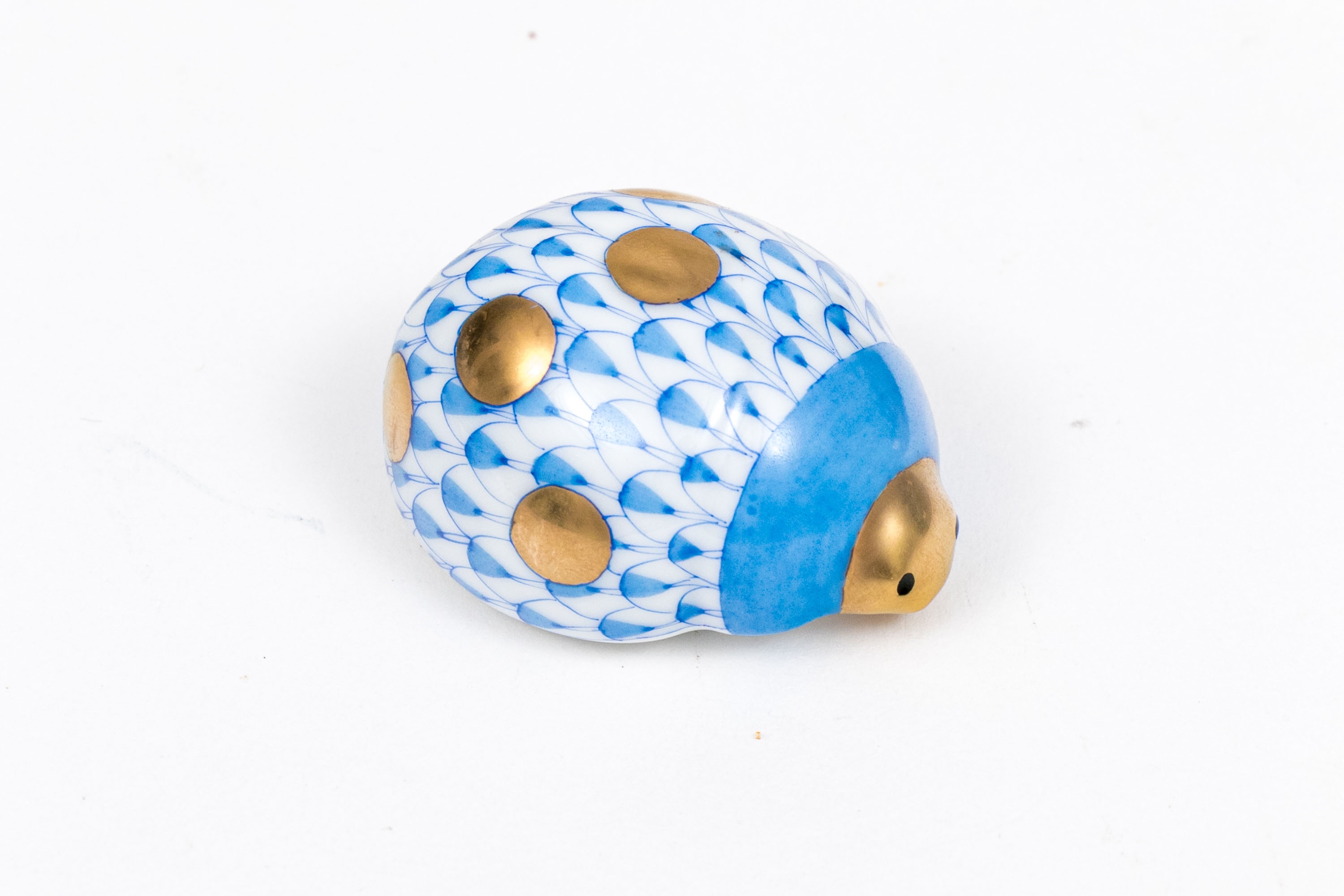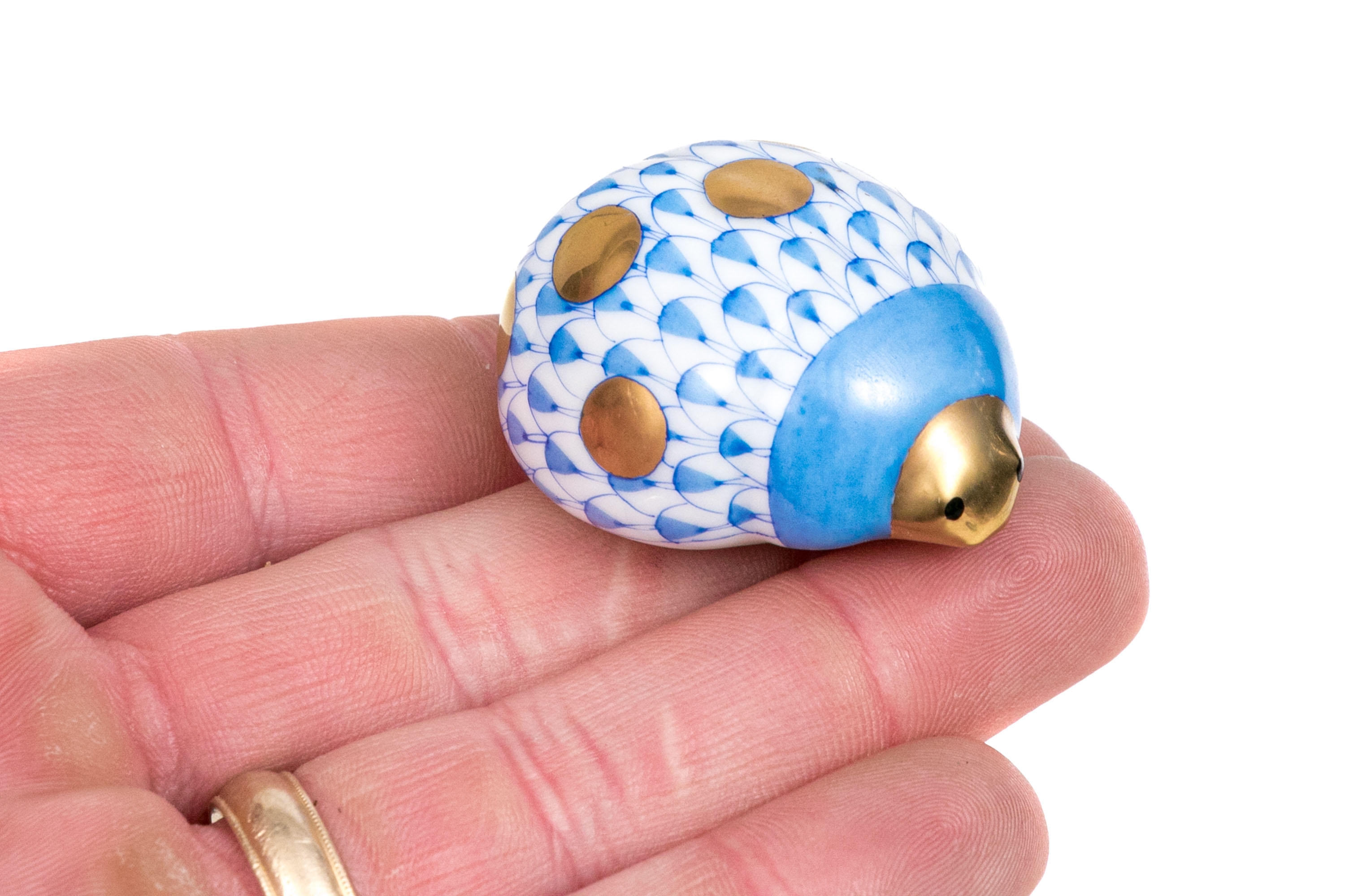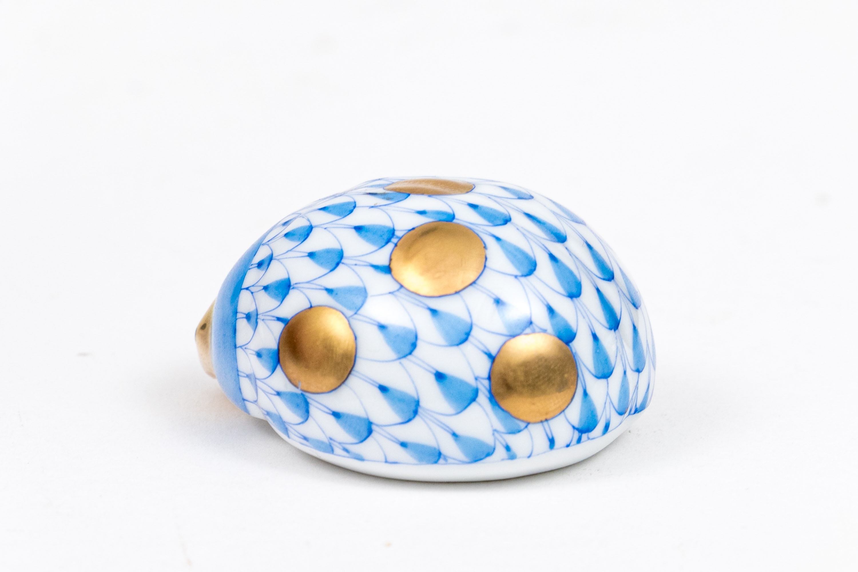 Herend Hungary porcelain ladybug figurine, meticulously hand-painted in the Blue Fishnet (VHB) pattern with elegant 24K gold accents. The ladybug features the classic fishnet motif in vibrant cobalt blue, overlaid with gold polka dots and a gilded head. The underside bears the Herend Hungary blue shield hallmark with crossed paintbrushes, marked Handpainted, and inscribed with model number 15064-0-00/VHB and artisan’s initials.