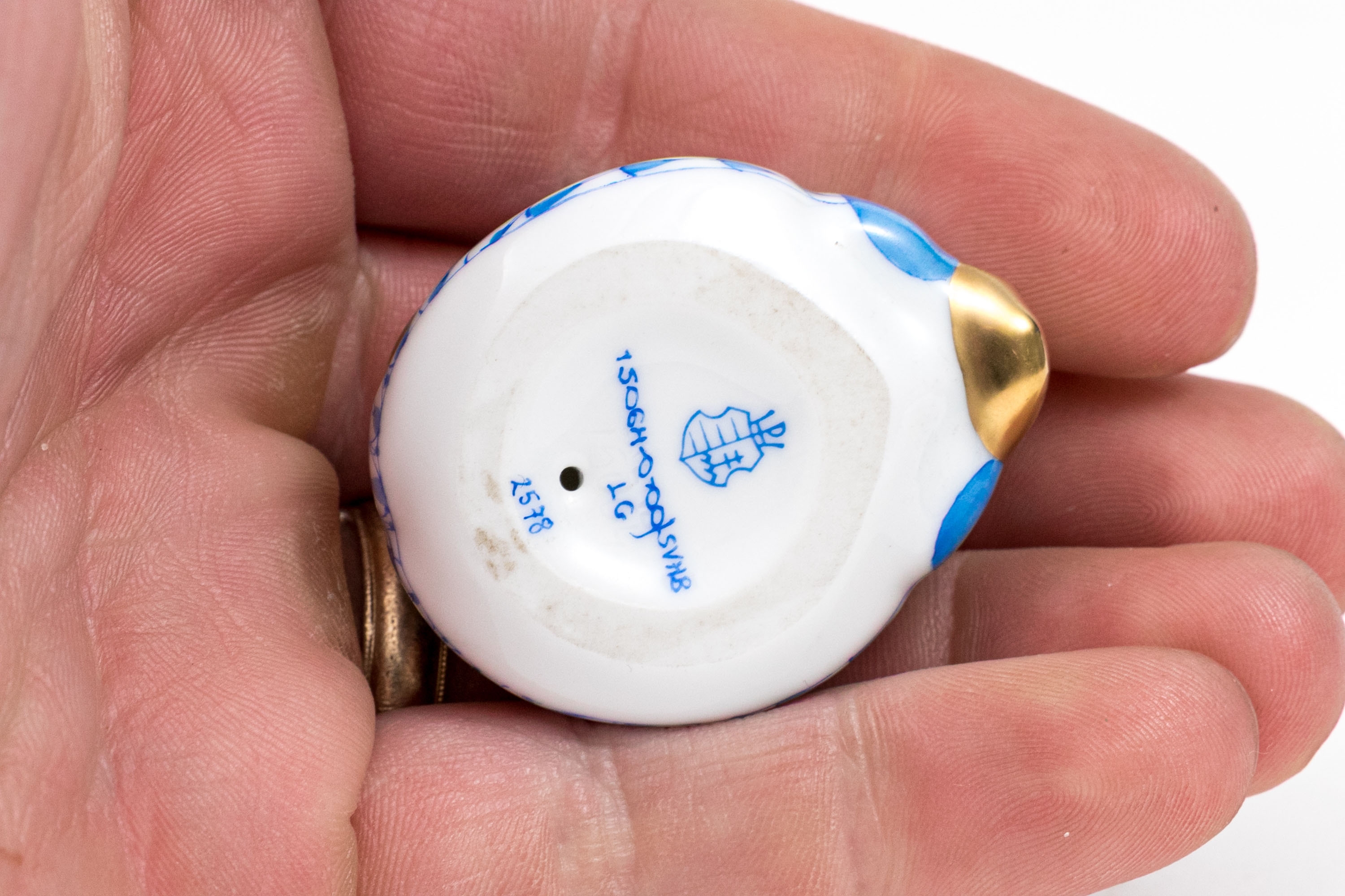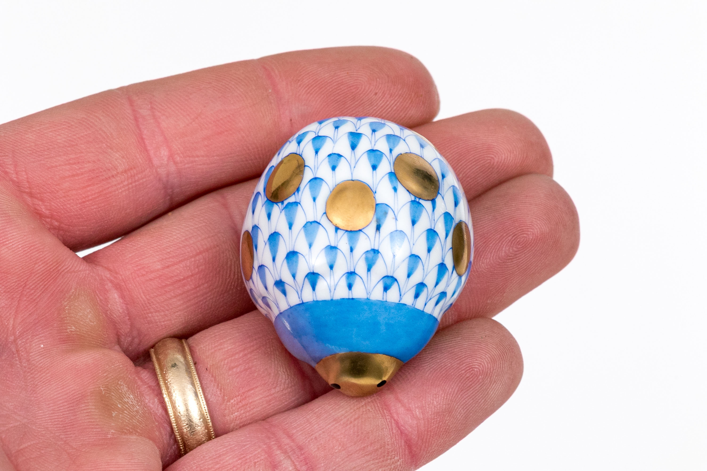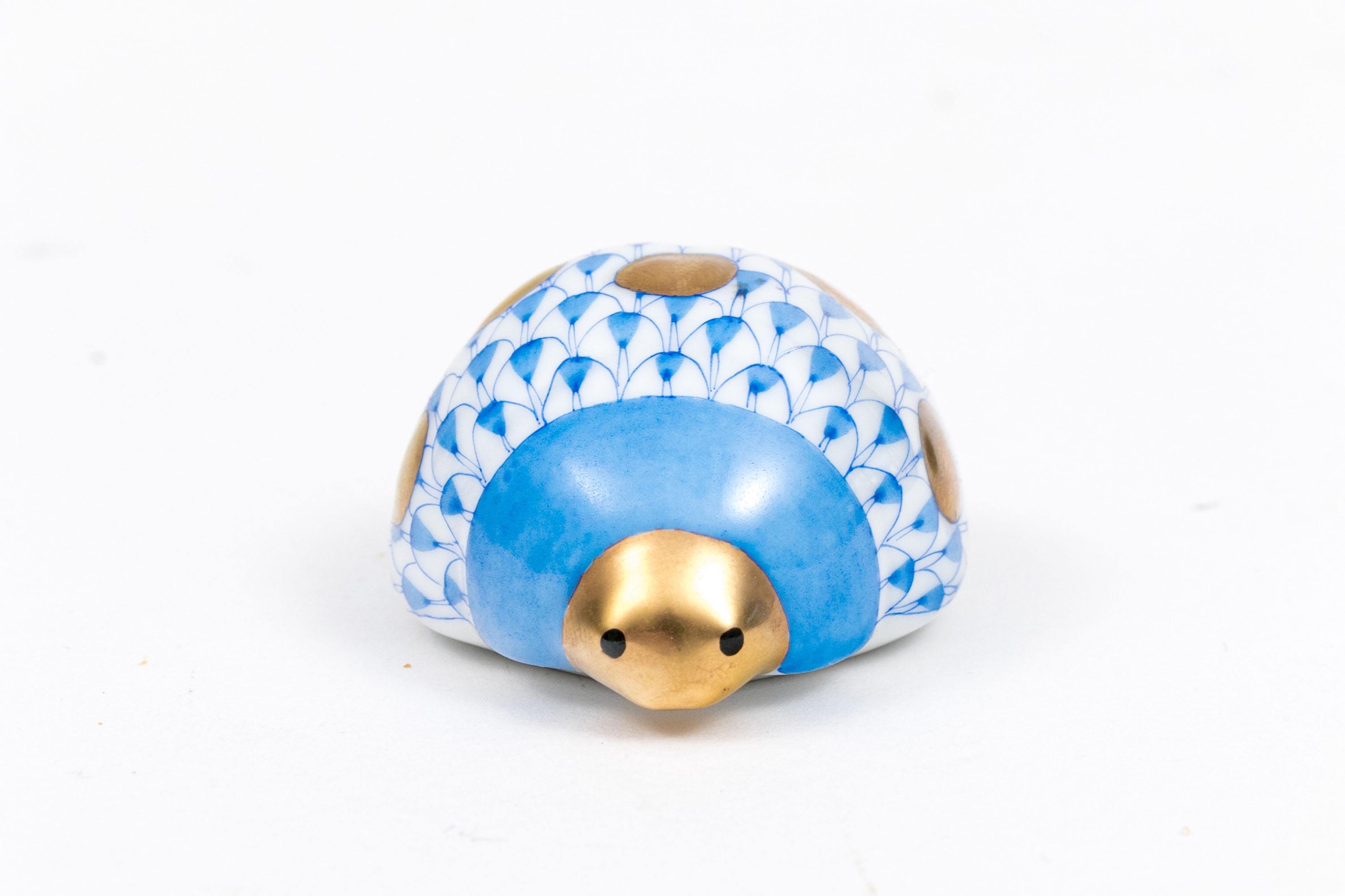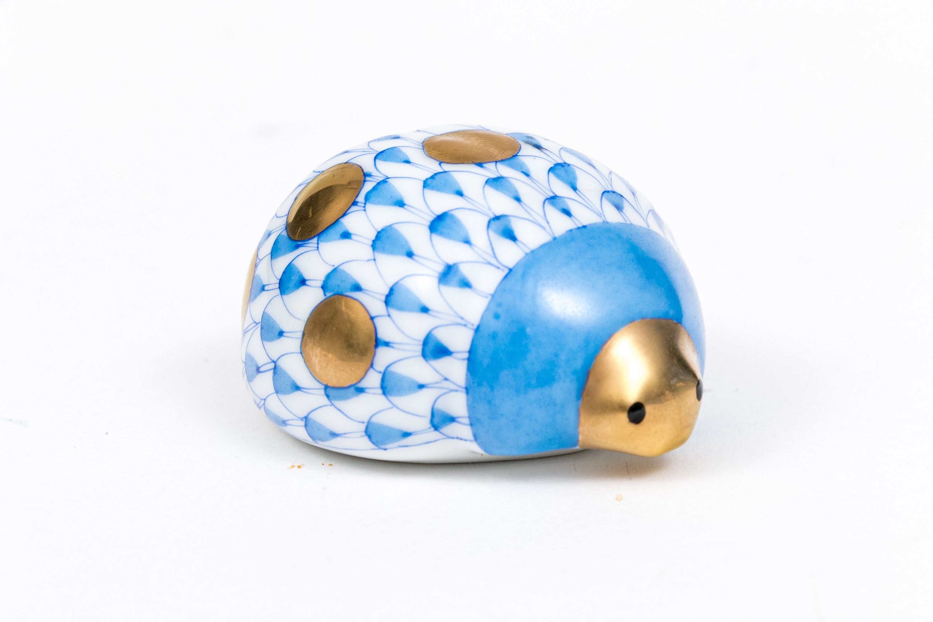Herend Hungary porcelain ladybug figurine, meticulously hand-painted in the Blue Fishnet (VHB) pattern with elegant 24K gold accents. The ladybug features the classic fishnet motif in vibrant cobalt blue, overlaid with gold polka dots and a gilded head. The underside bears the Herend Hungary blue shield hallmark with crossed paintbrushes, marked Handpainted, and inscribed with model number 15064-0-00/VHB and artisan’s initials.