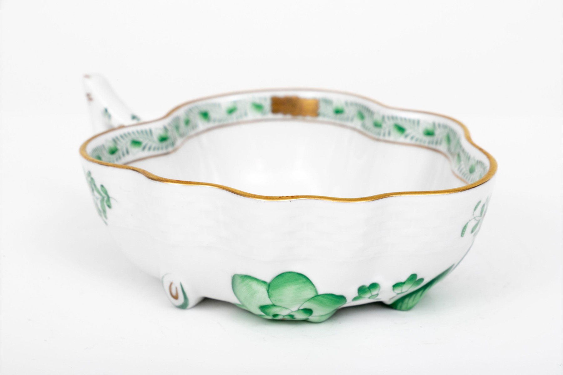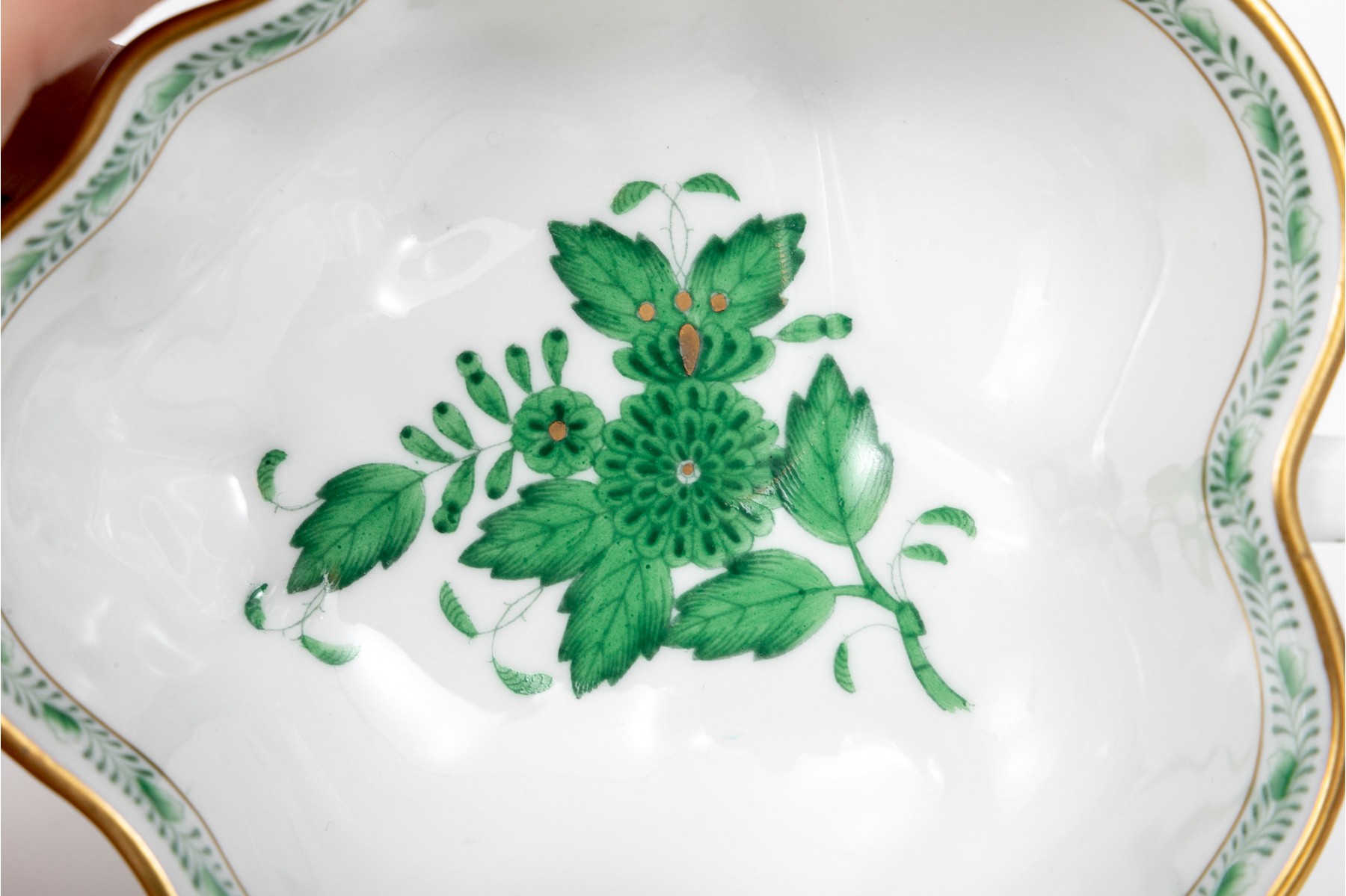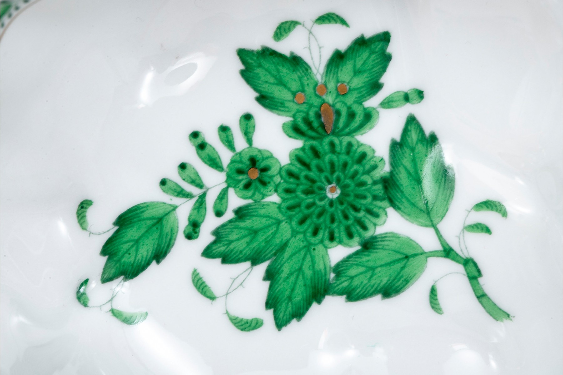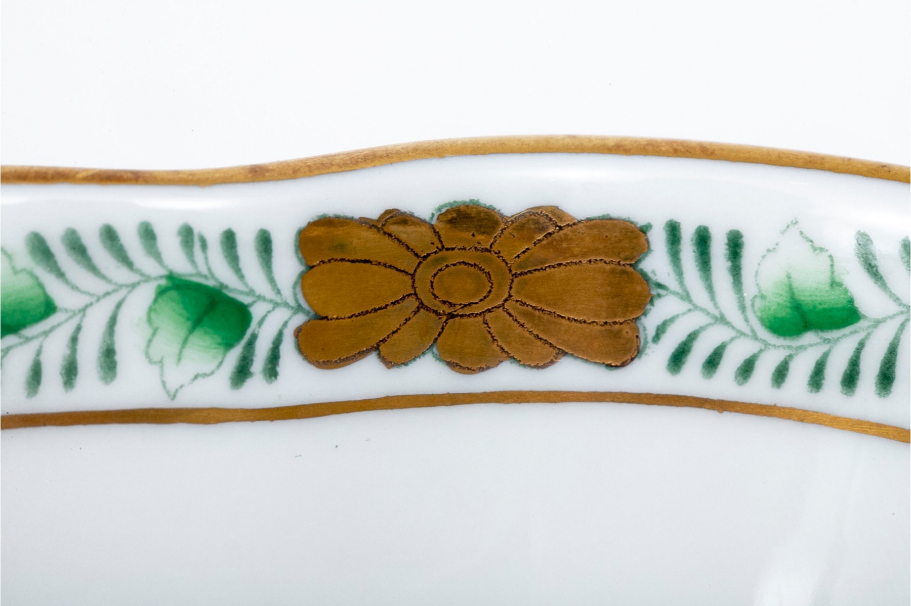 Herend Hungary Chinese Bouquet green handled dish with green florals and leaves, embossed basketweave design, inside trim with gold embellishments, gold trim.