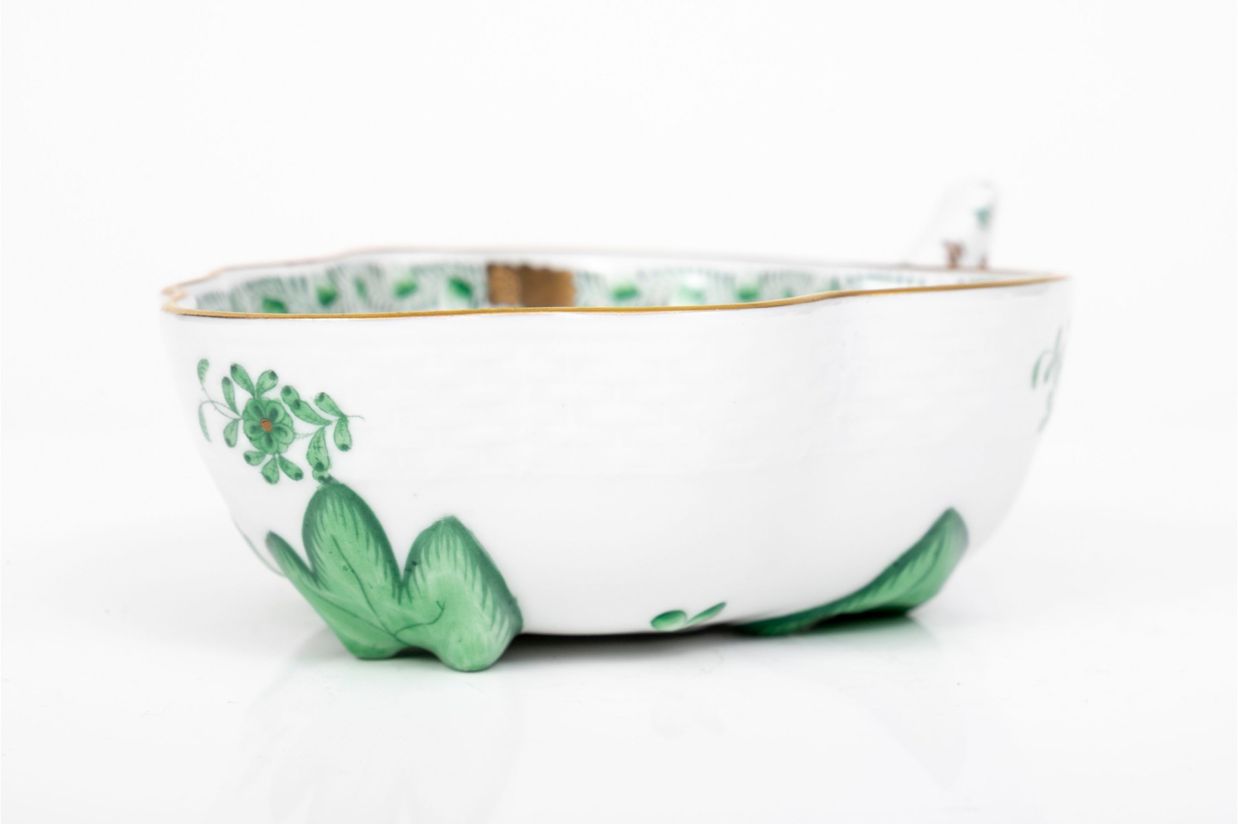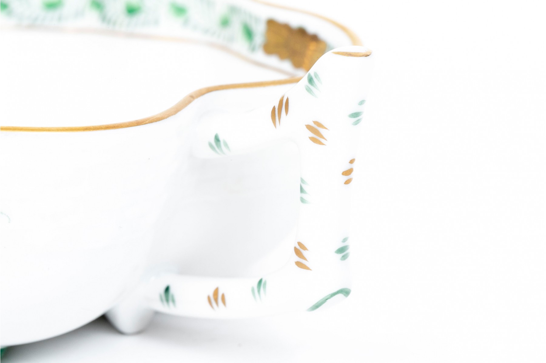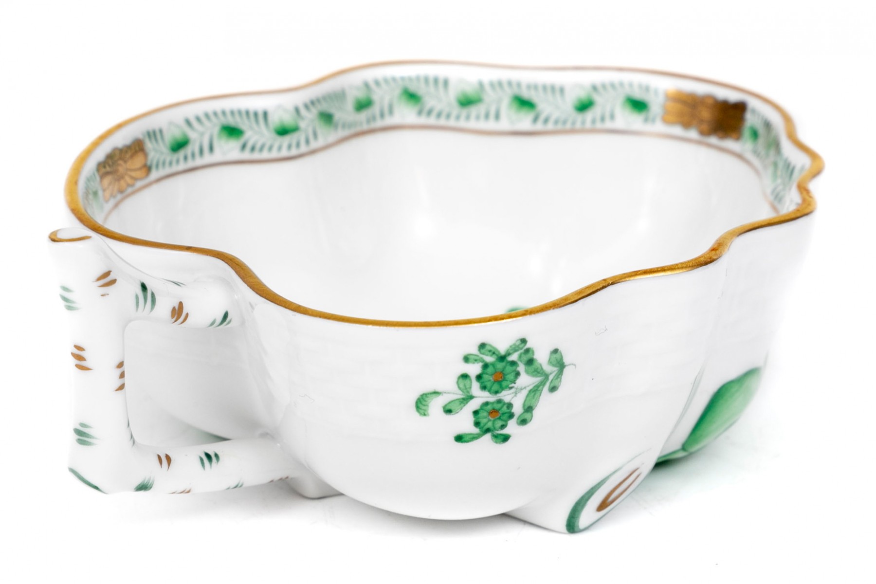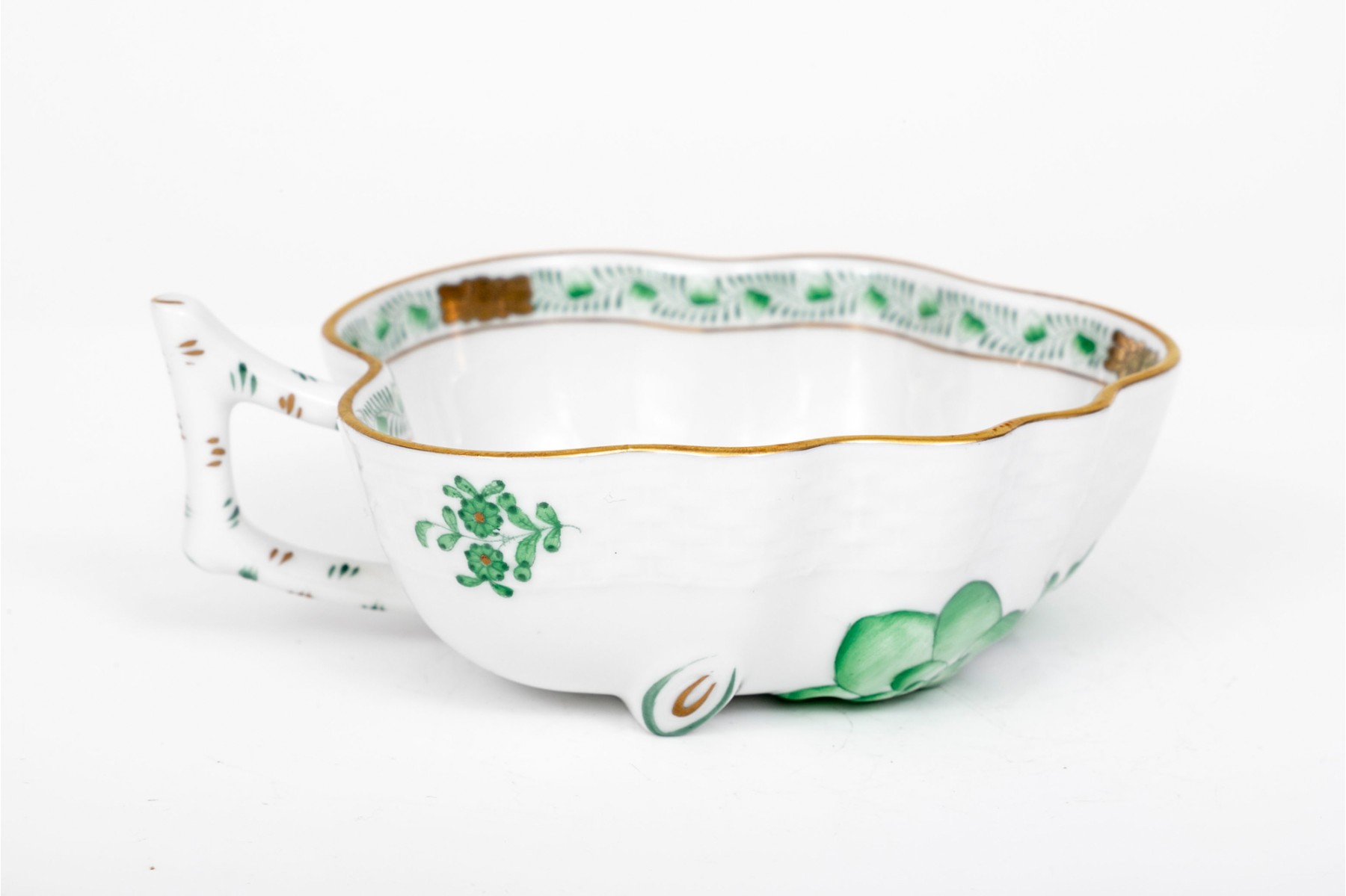 Herend Hungary Chinese Bouquet green handled dish with green florals and leaves, embossed basketweave design, inside trim with gold embellishments, gold trim.