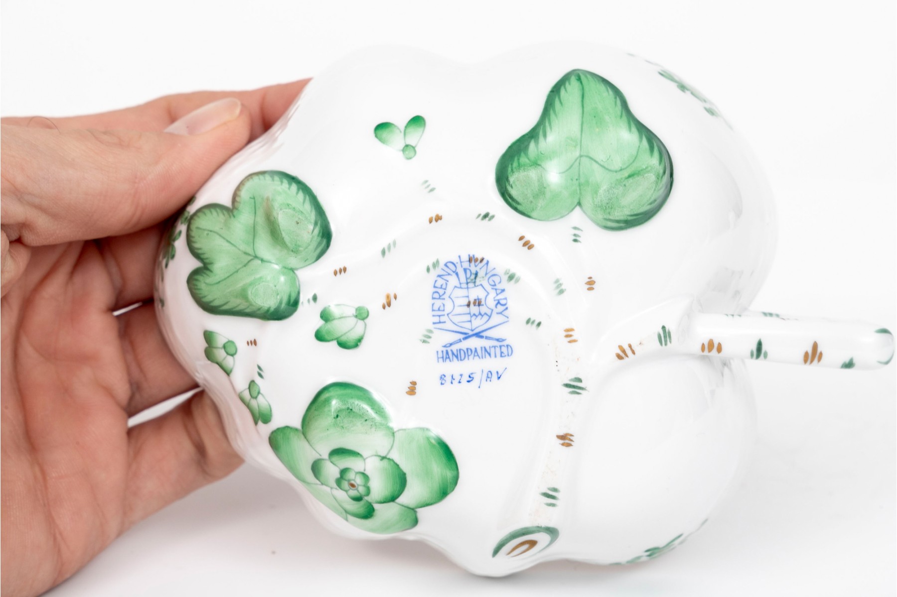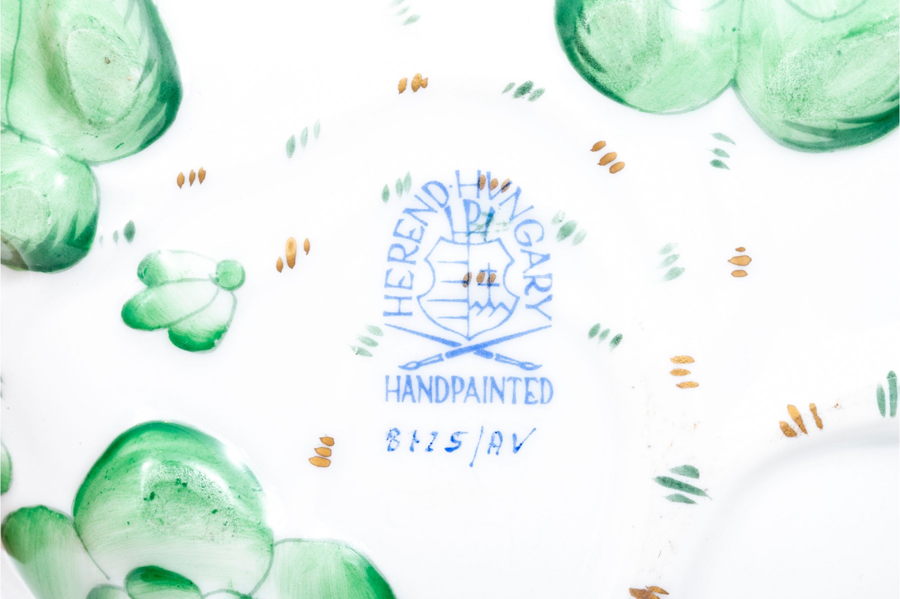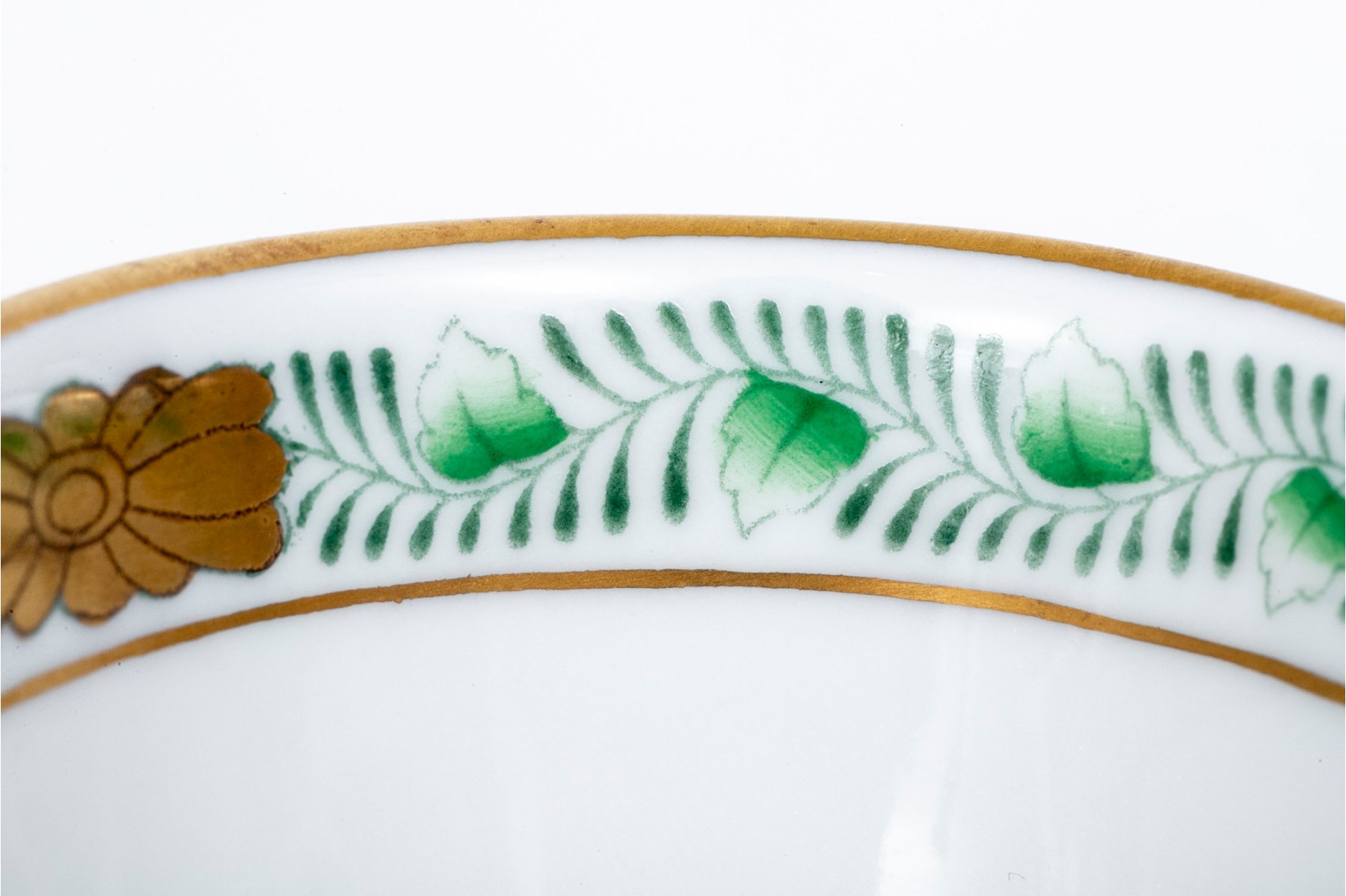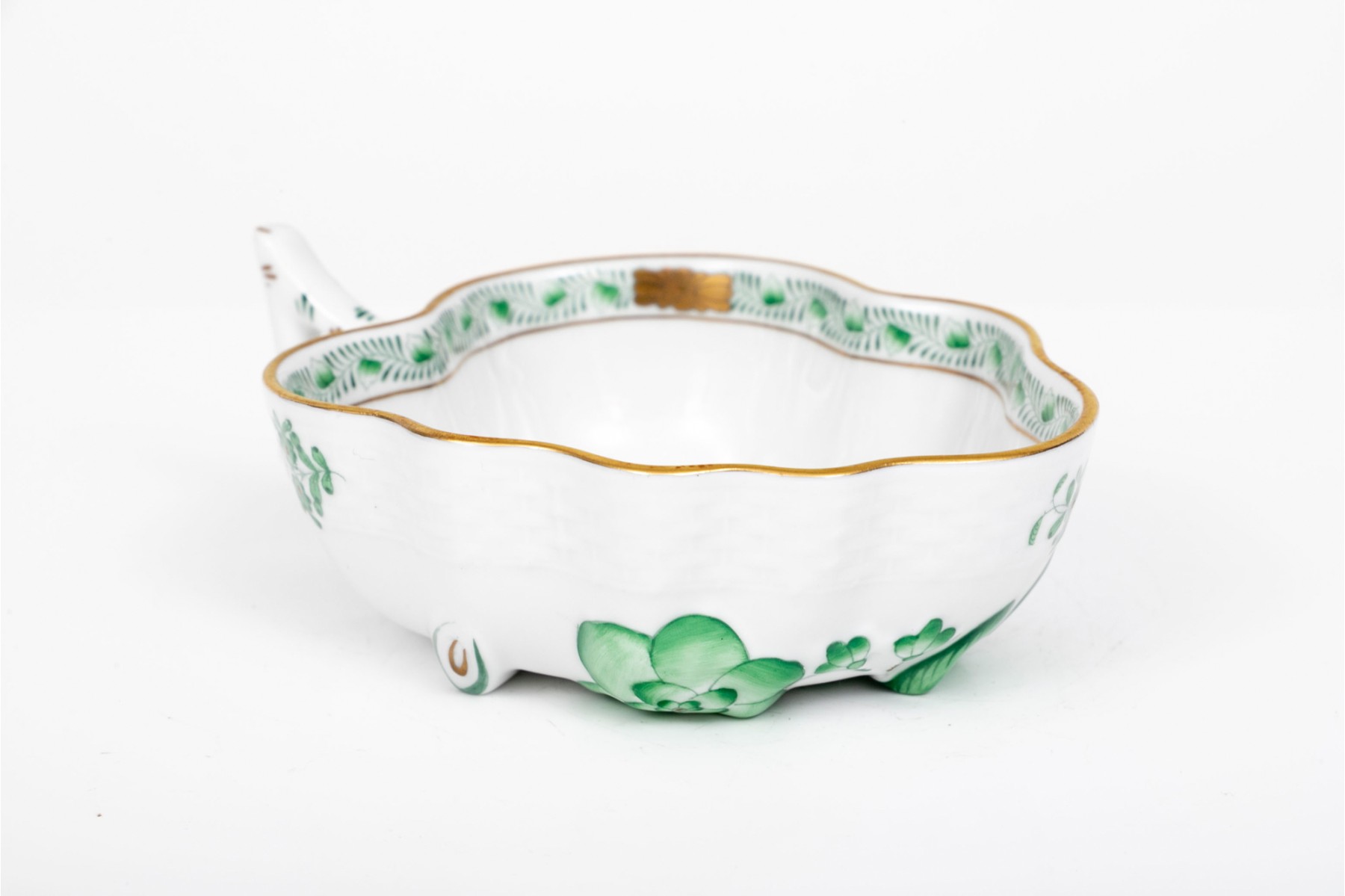 Herend Hungary Chinese Bouquet green handled dish with green florals and leaves, embossed basketweave design, inside trim with gold embellishments, gold trim.