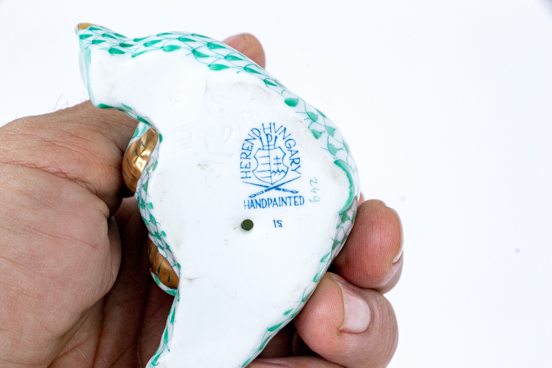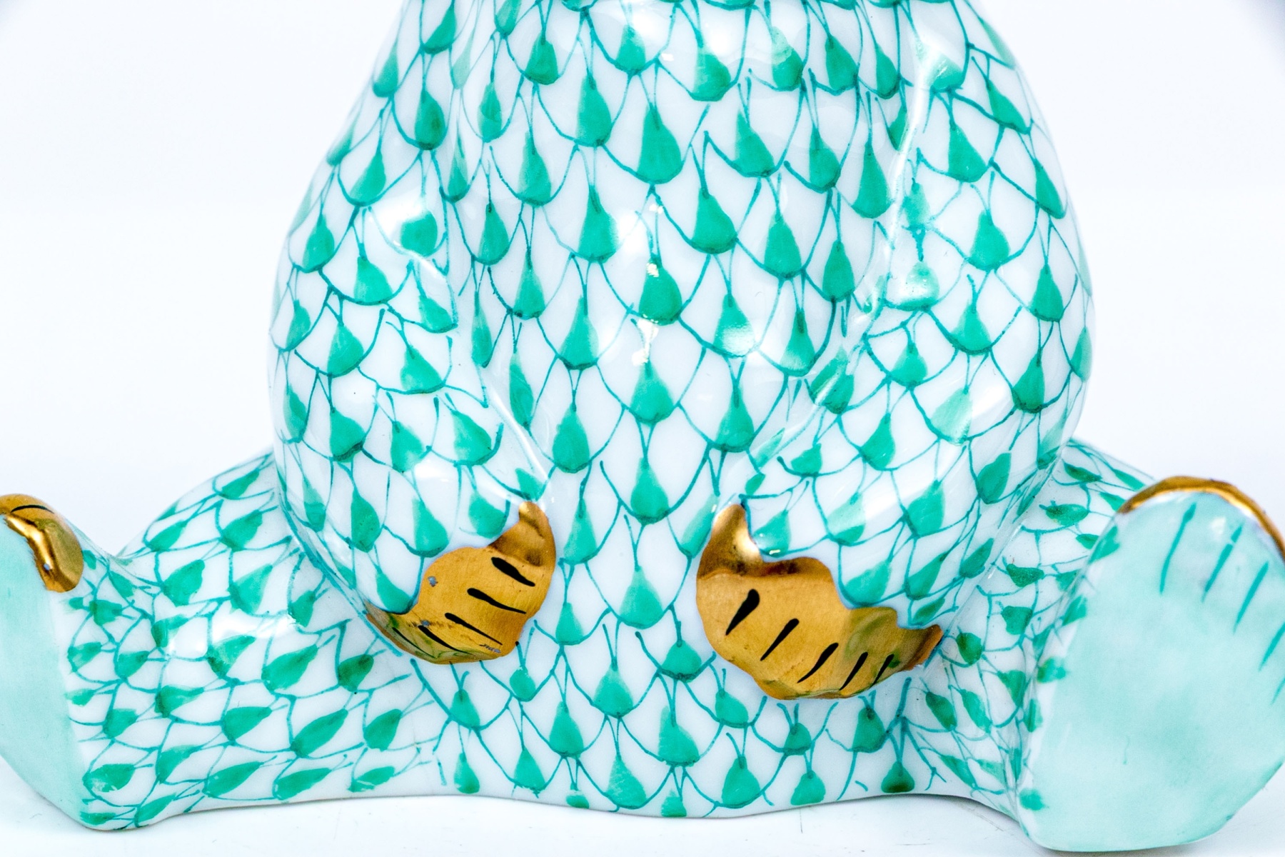 The bear’s surface features Herend’s fishnet motif, hand-painted in vibrant green, complemented by gilded paws, nose, and muzzle. The underside is stamped with the Herend Hungary blue shield hallmark and crossed paintbrushes, marked HANDPAINTED with painter's mark.