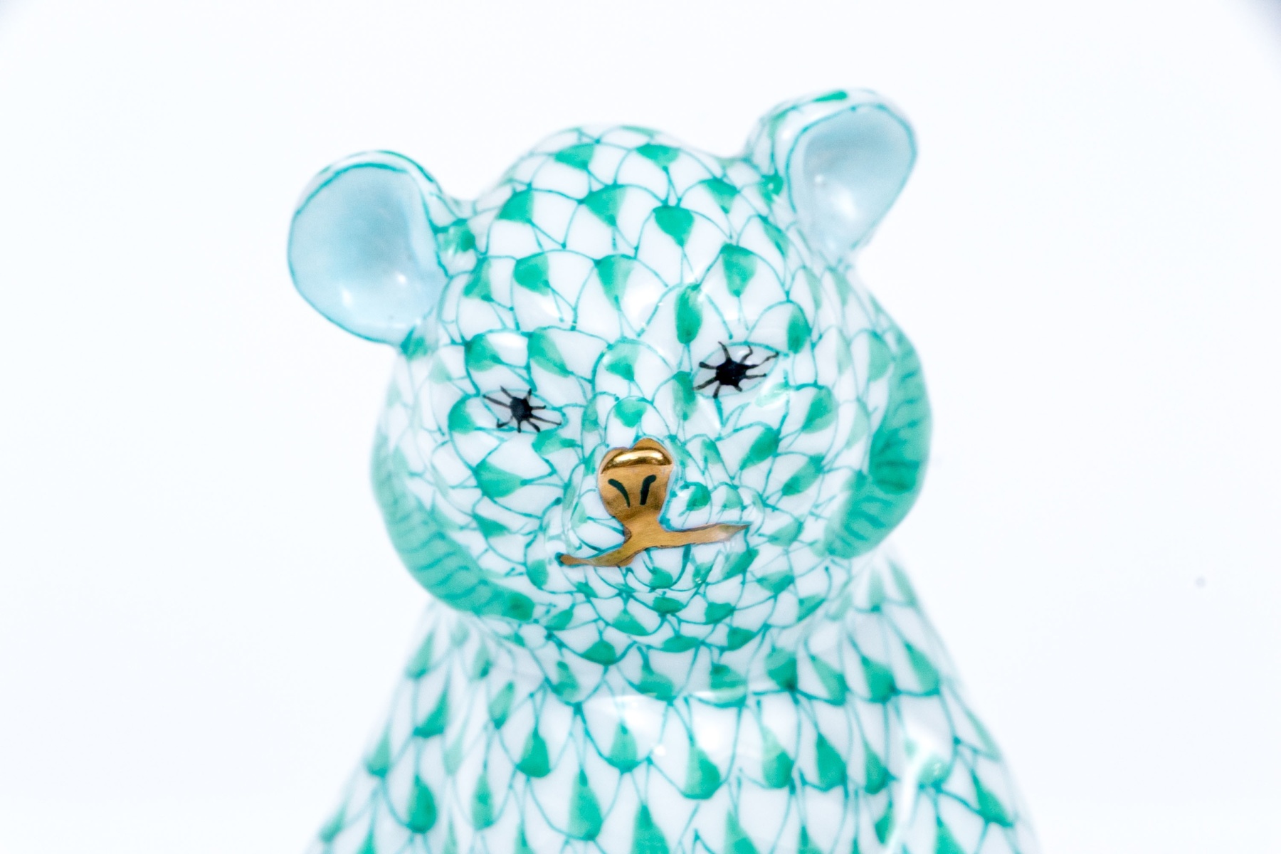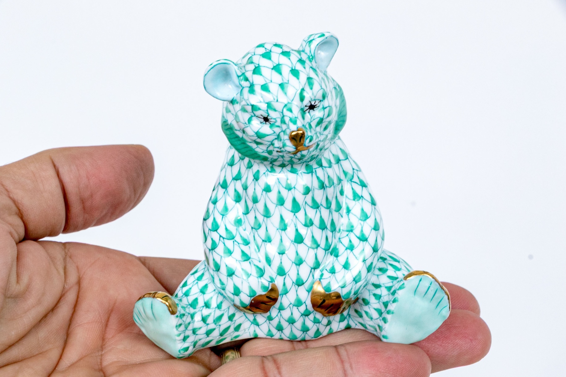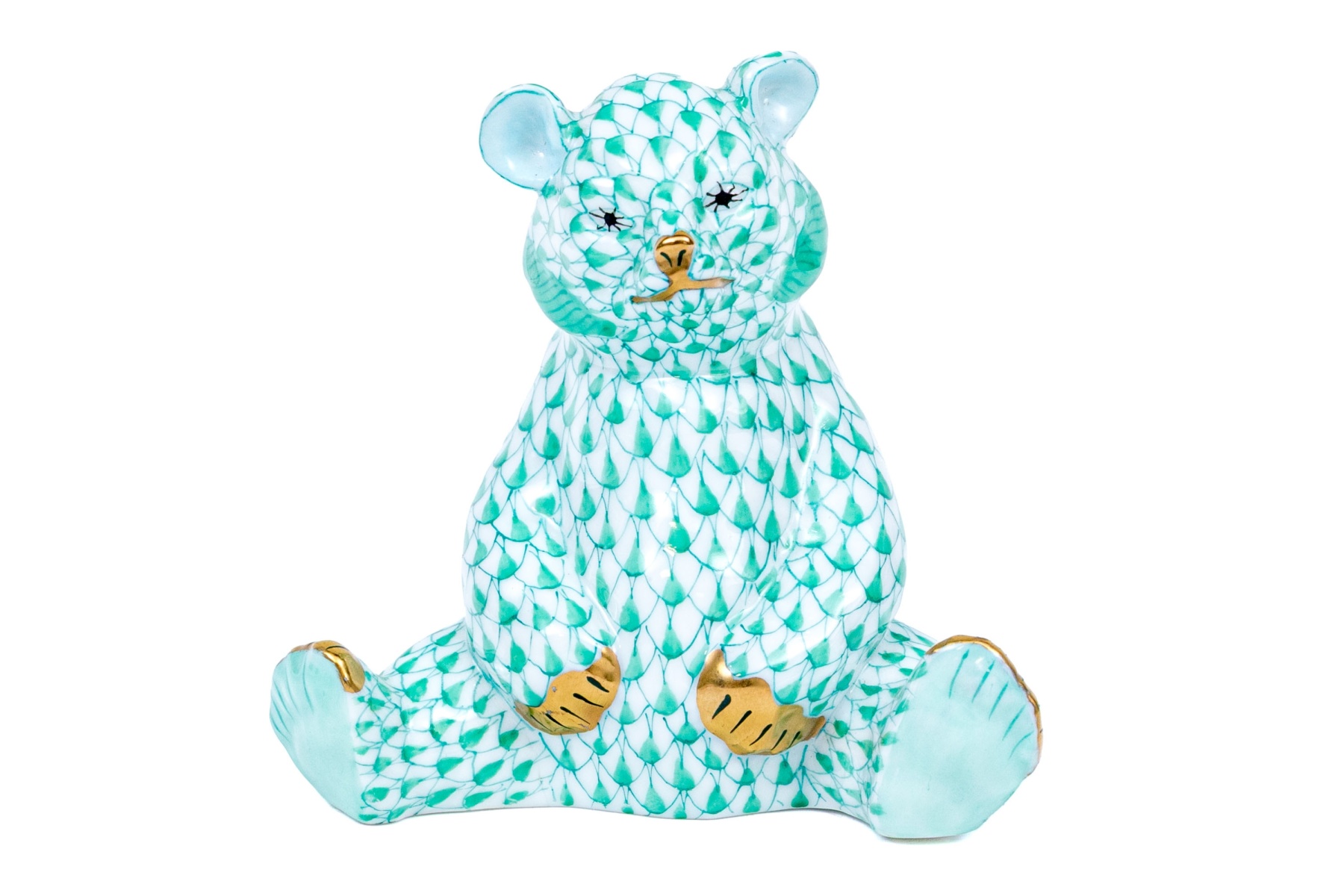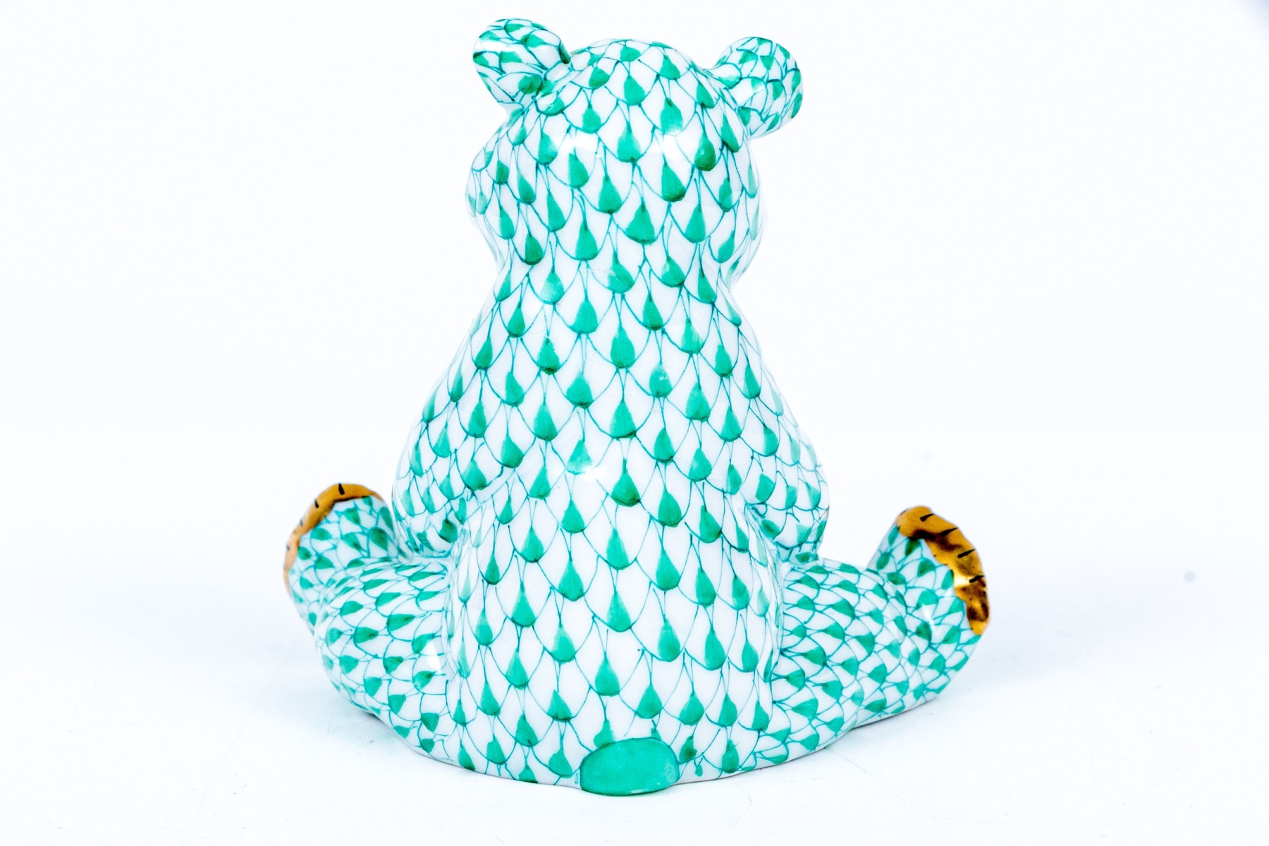 Herend Hungary porcelain sitting bear figure, hand-painted in the Green Fishnet pattern with 24K gold accents. This charming bear, rendered in a seated pose with a gentle expression, is in the "teddy bear" position.