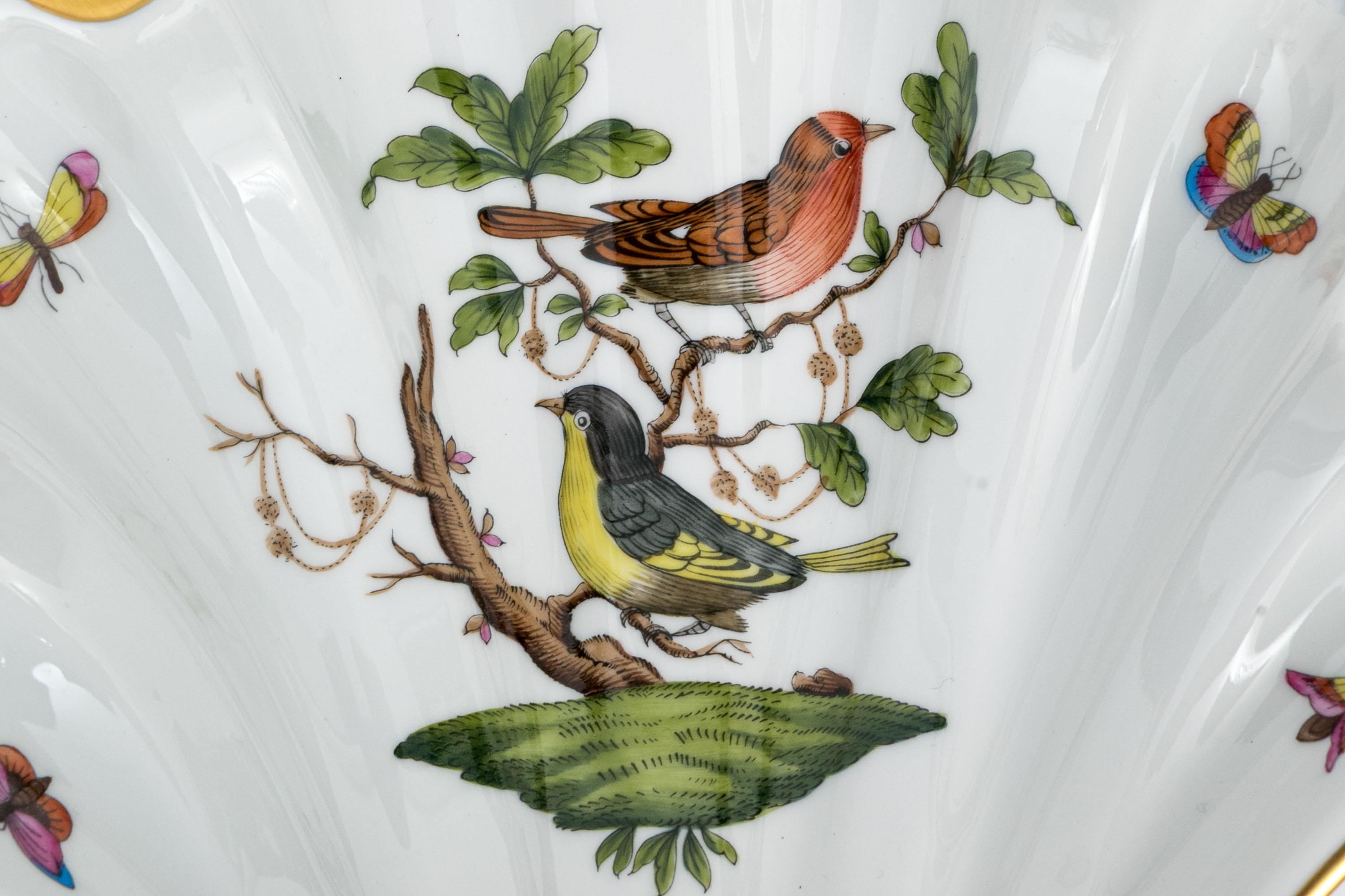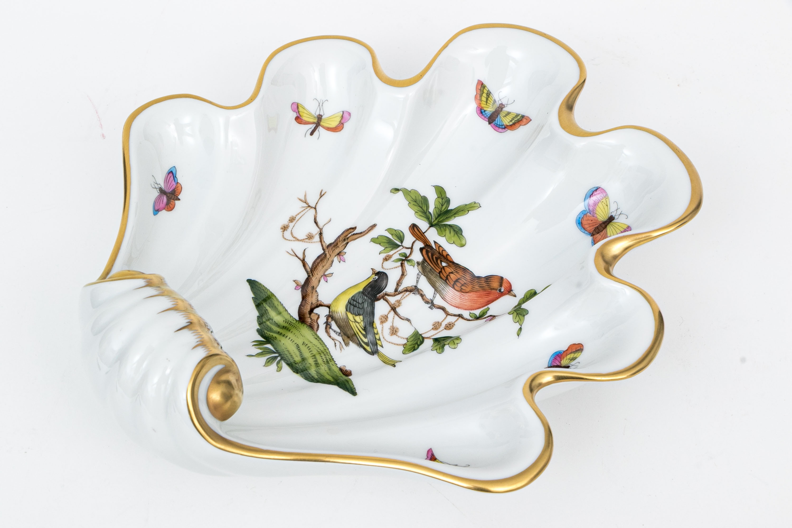 Herend Hungary hand-painted porcelain shell-form dish, featuring the Rothschild Bird (RO) pattern with 24K gold accents. The piece is formed in a scalloped, fan-like shell shape, its flowing curves highlighted by a continuous gilded rim. At the center, a beautifully detailed hand-painted vignette depicts two colorful songbirds perched on a flowering branch with two necklaces, surrounded by delicate butterflies and winged insects, rendered in bright, multicolored enamels. The piece’s underside bears the Herend Hungary blue shield hallmark with crossed paintbrushes, inscribed HANDPAINTED and marked 7444/RO.