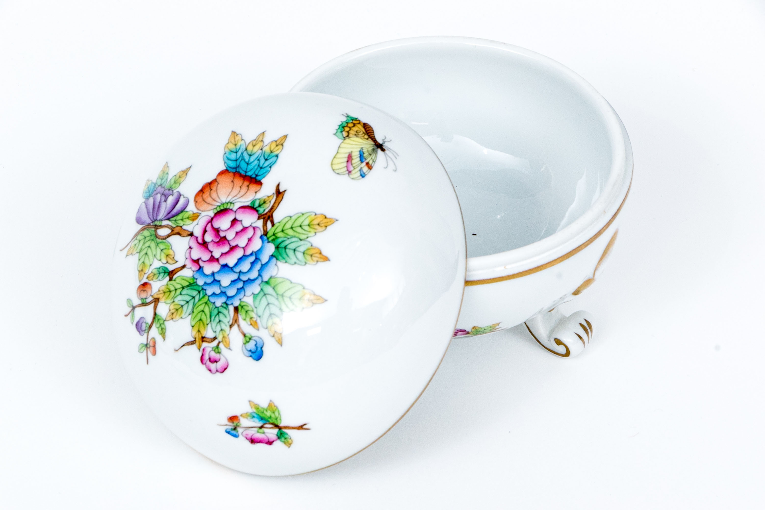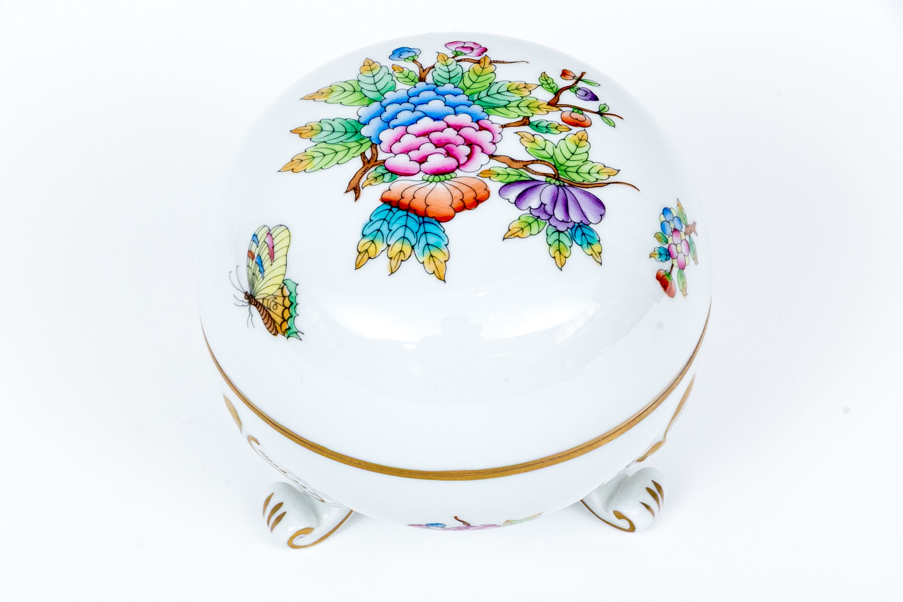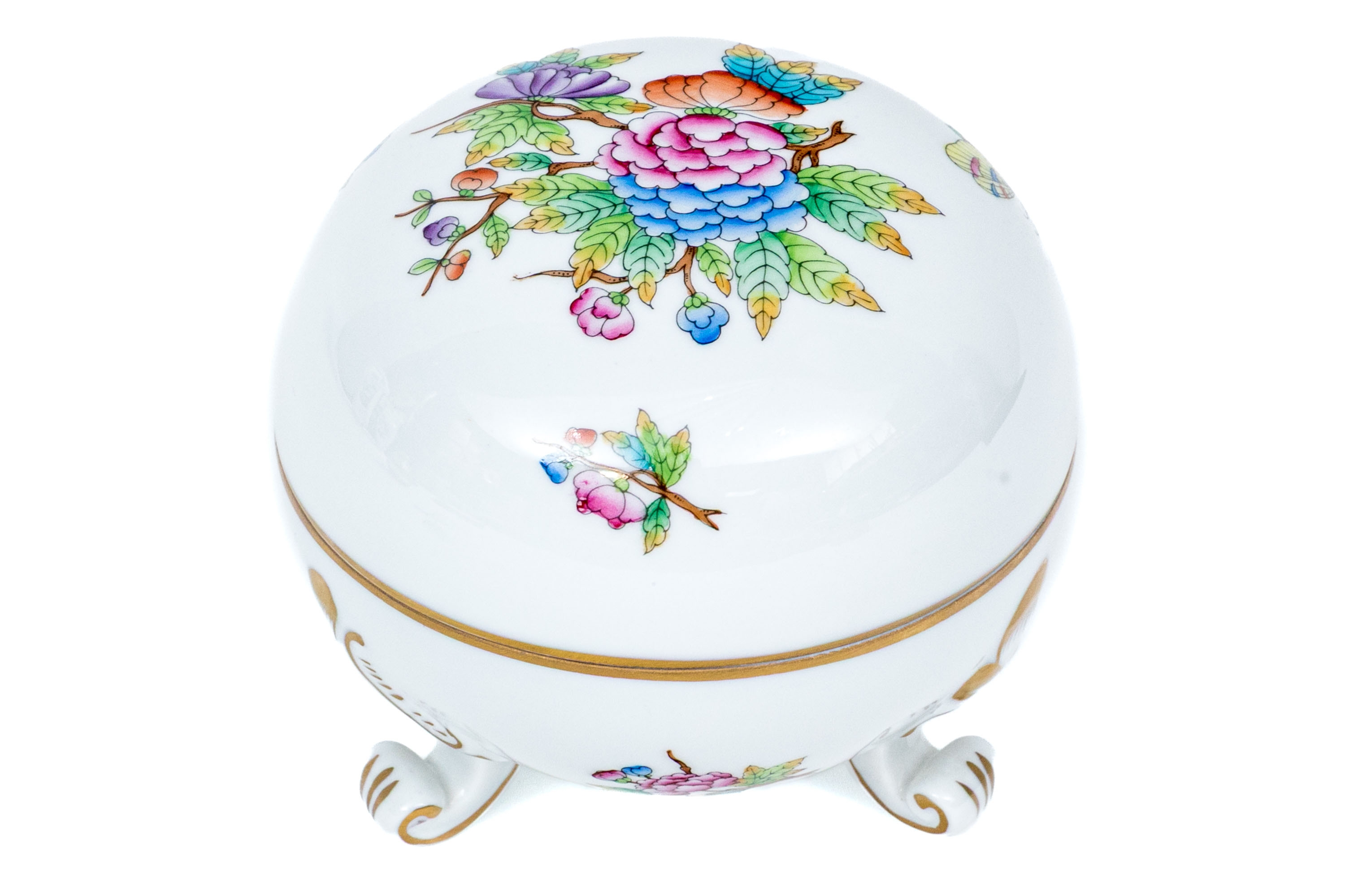Herend Hungary hand-painted porcelain covered box in the Queen Victoria (VBO) pattern, richly decorated with multicolor florals, butterflies, and fine 24K gold accents. Resting gracefully on three scrolled gilt feet. The top displays a lush central bouquet of peonies, roses, and foliage in vibrant shades of pink, lavender, orange, blue, and green, surrounded by delicately painted butterflies in bright pastel tones. The lower body features complementary floral sprays and gilt flourishes, highlighted with hand-applied gold detailing throughout the rim and scrollwork feet. The interior is finished in a smooth, glossy white glaze, while the underside bears the blue Herend Hungary shield mark, HANDPAINTED, along with the pattern number 6181/V.
