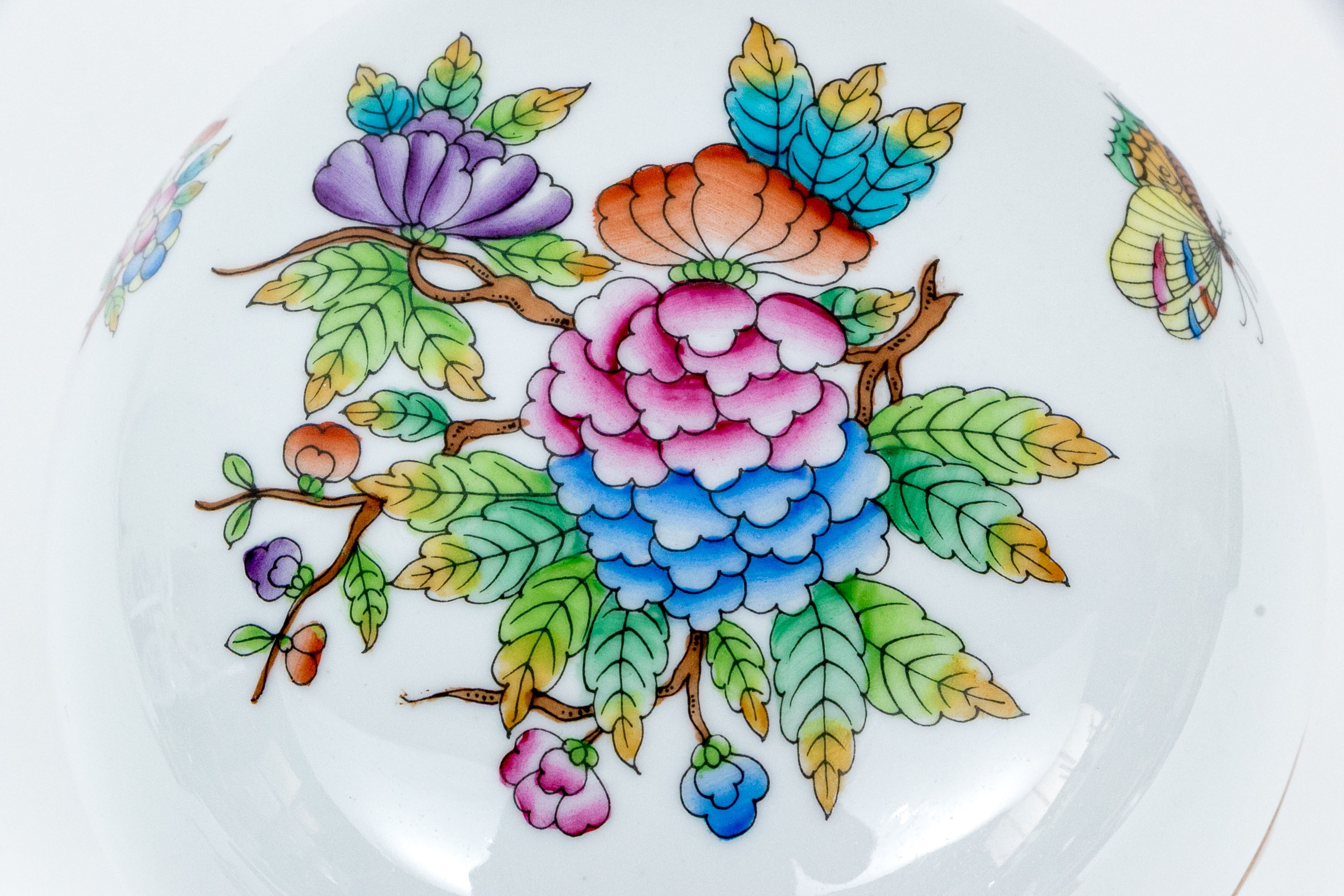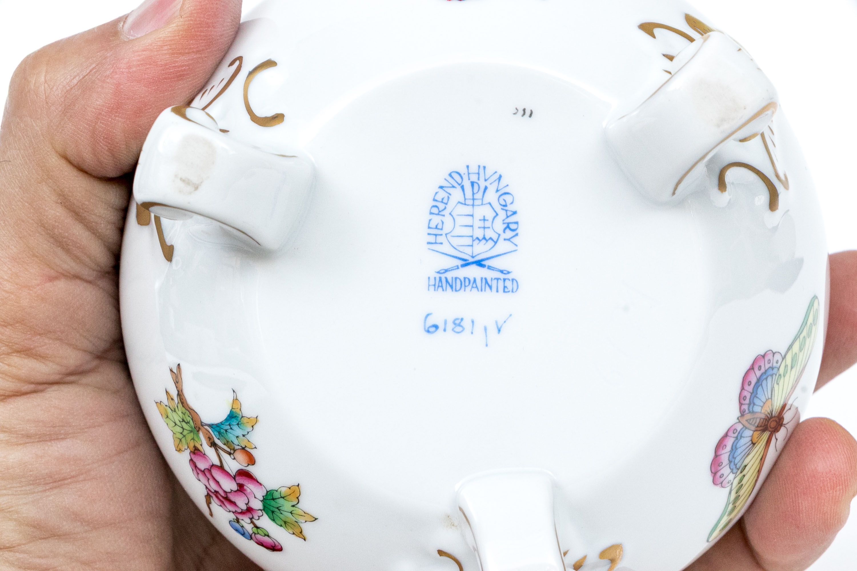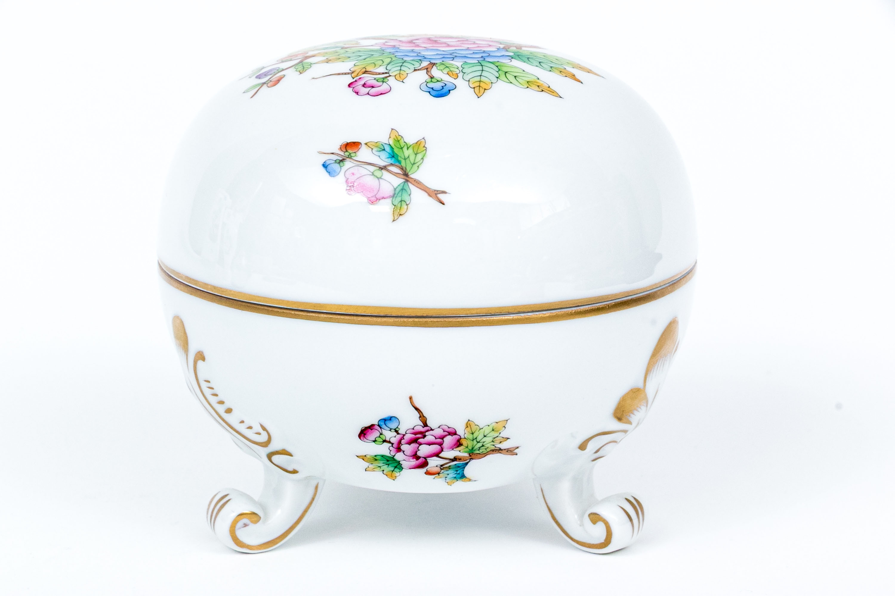 Herend Hungary hand-painted porcelain covered box in the Queen Victoria (VBO) pattern, richly decorated with multicolor florals, butterflies, and fine 24K gold accents. Resting gracefully on three scrolled gilt feet. The top displays a lush central bouquet of peonies, roses, and foliage in vibrant shades of pink, lavender, orange, blue, and green, surrounded by delicately painted butterflies in bright pastel tones. The lower body features complementary floral sprays and gilt flourishes, highlighted with hand-applied gold detailing throughout the rim and scrollwork feet. The interior is finished in a smooth, glossy white glaze, while the underside bears the blue Herend Hungary shield mark, HANDPAINTED, along with the pattern number 6181/V.