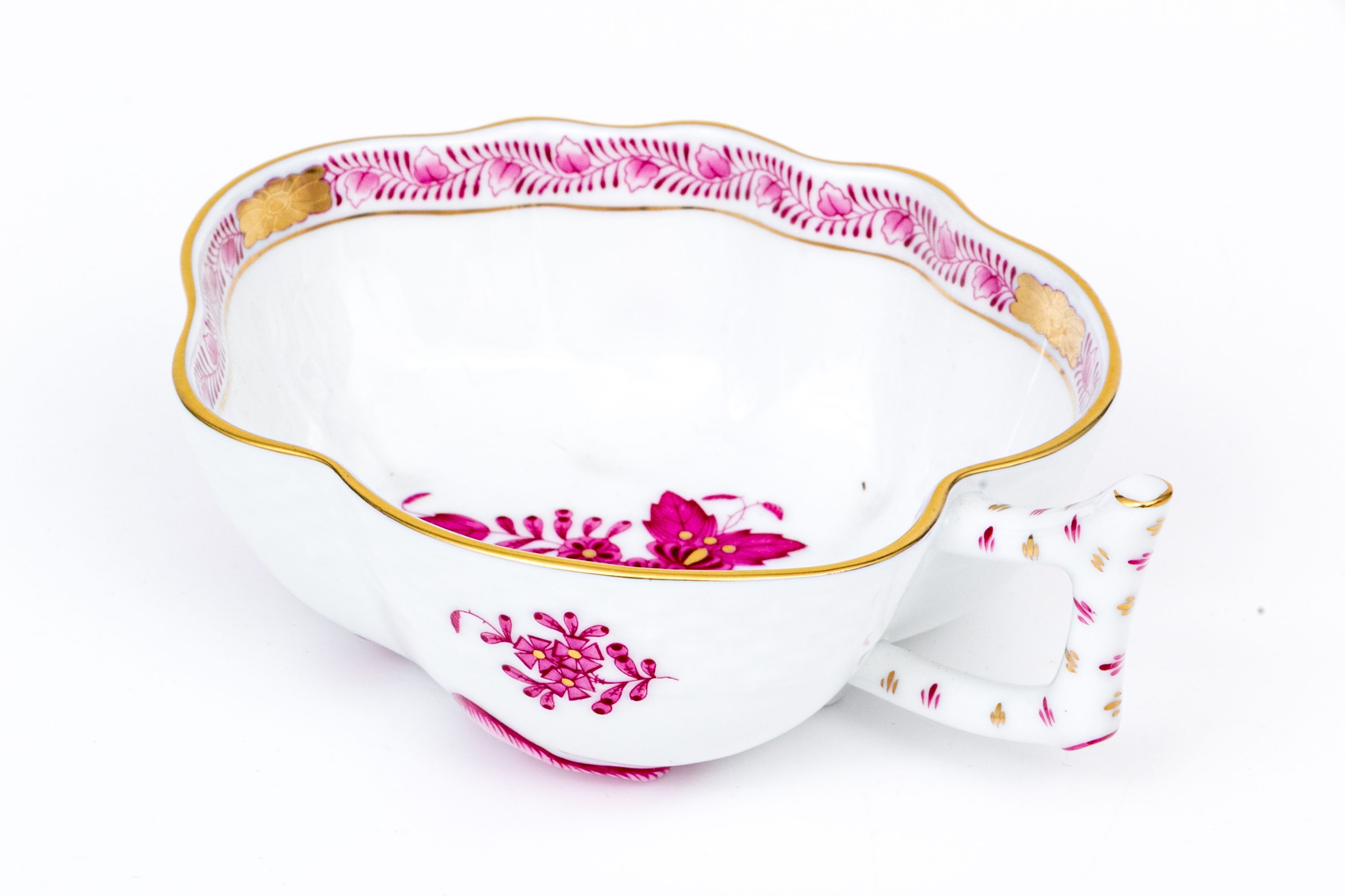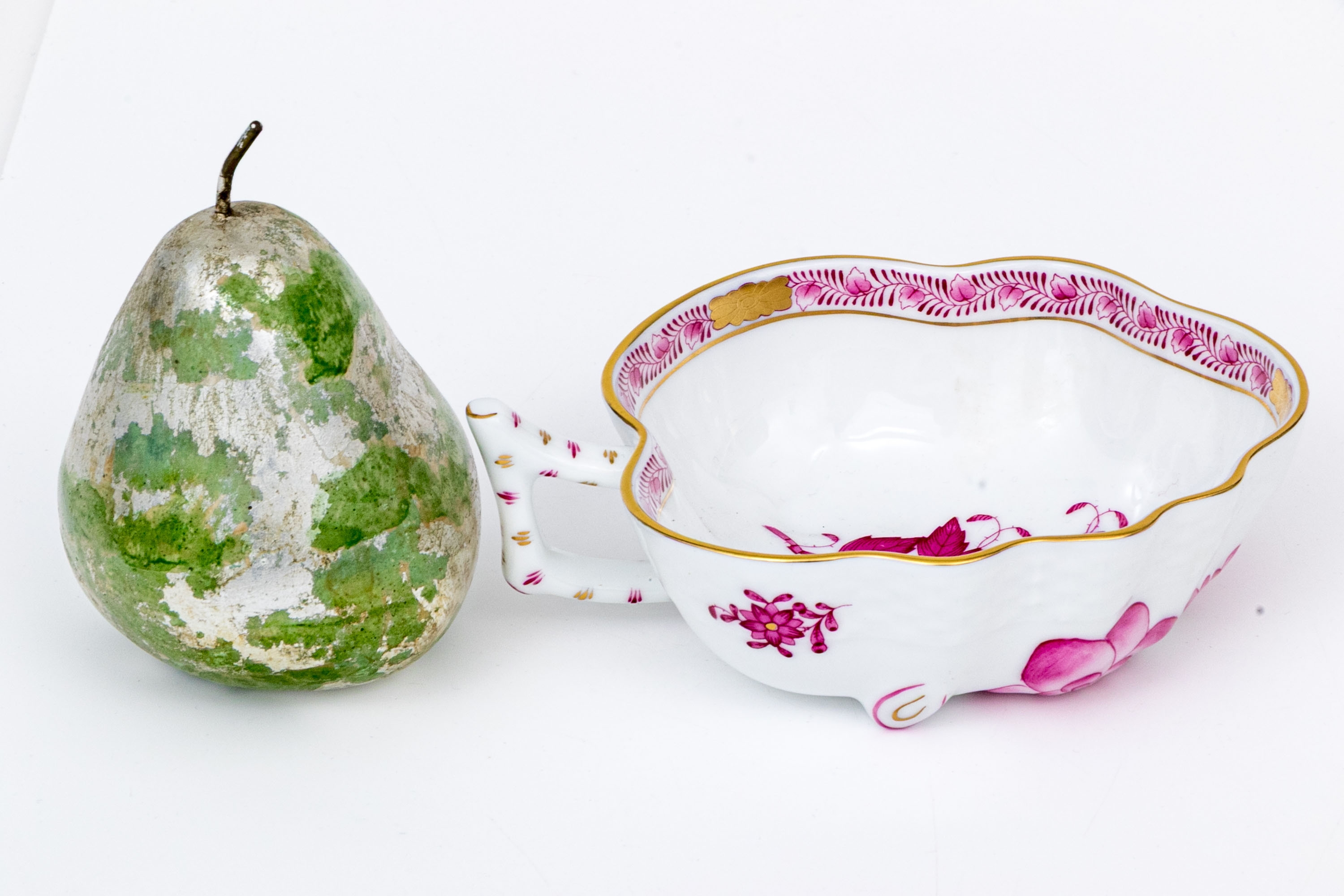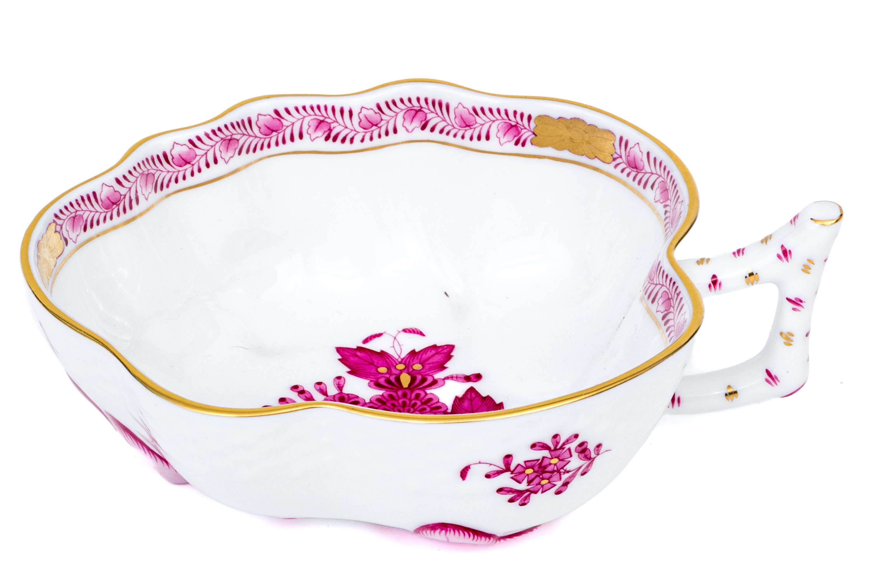 Charming hand-painted porcelain bowl by Herend Hungary in the Apponyi Pink (Chinese Bouquet Raspberry) pattern. The scalloped form features stylized peony blooms and foliate sprays in deep raspberry pink with delicate gilt accents. A garland border of pink vines and gold rosettes encircles the rim, complemented by a distinctive branch-form handle with gilt and pink highlights. Marked on the underside with the blue Herend Hungary shield and crossed paintbrushes, stamped Handpainted and pattern number 491-0-00/AP.