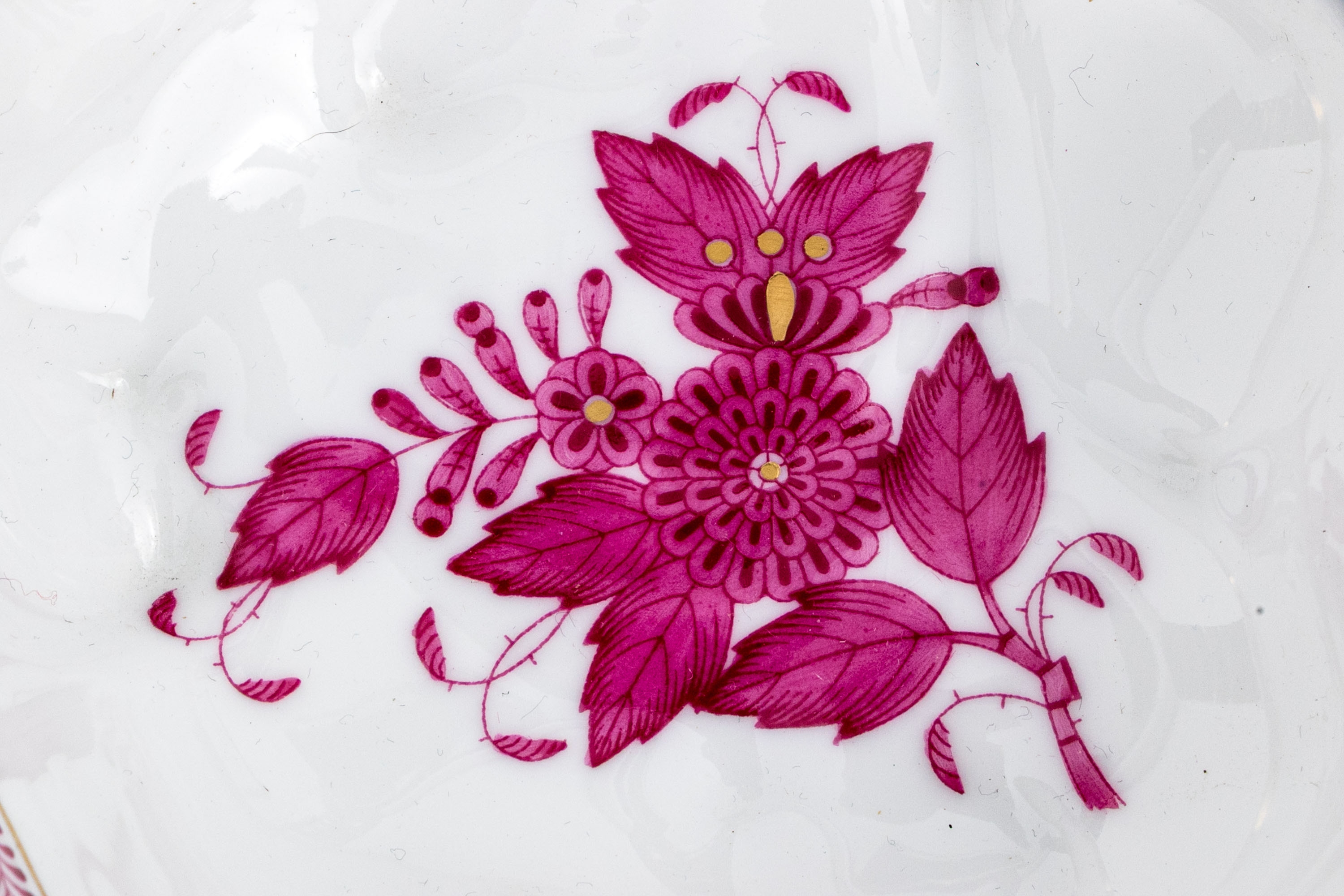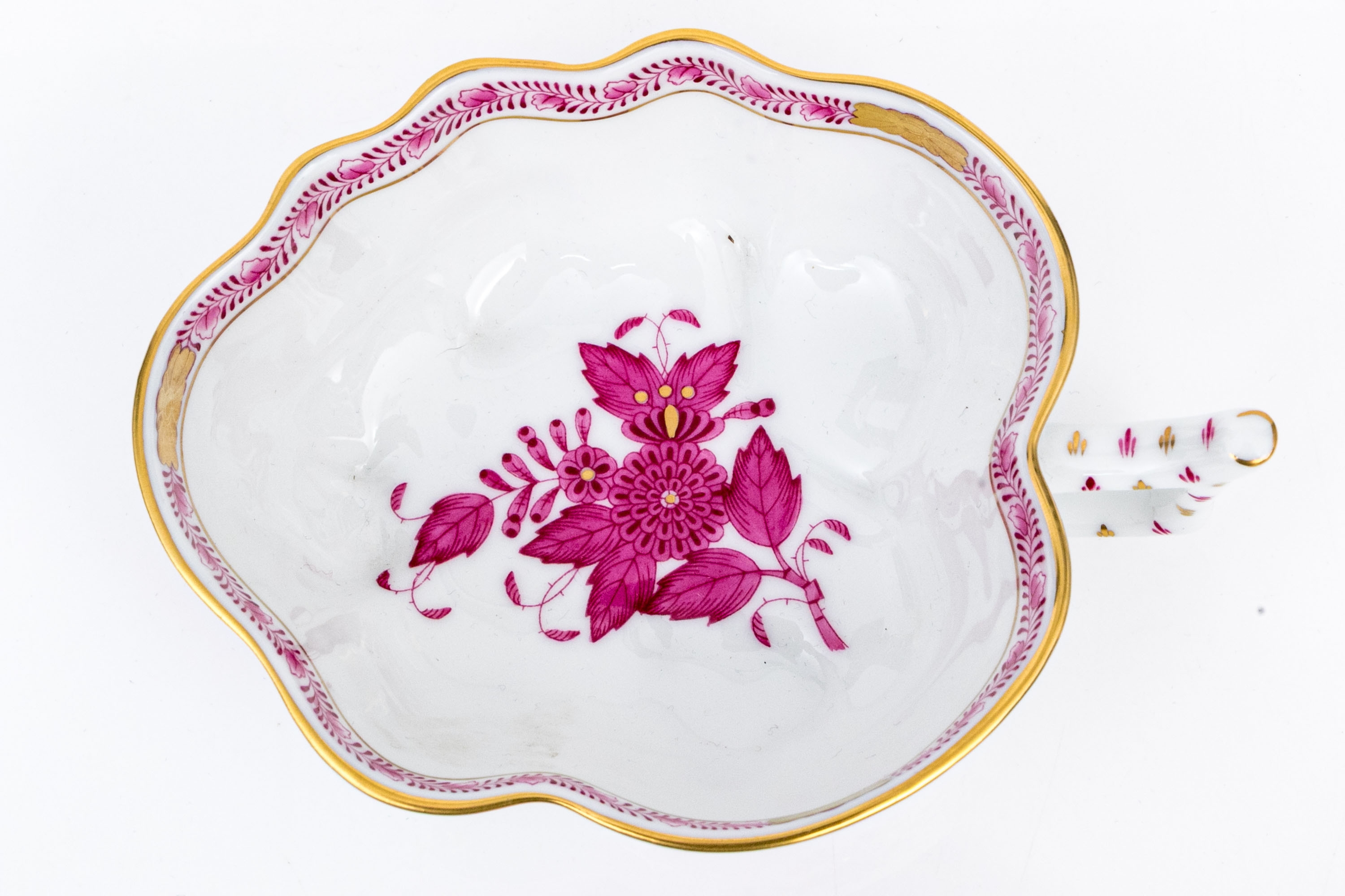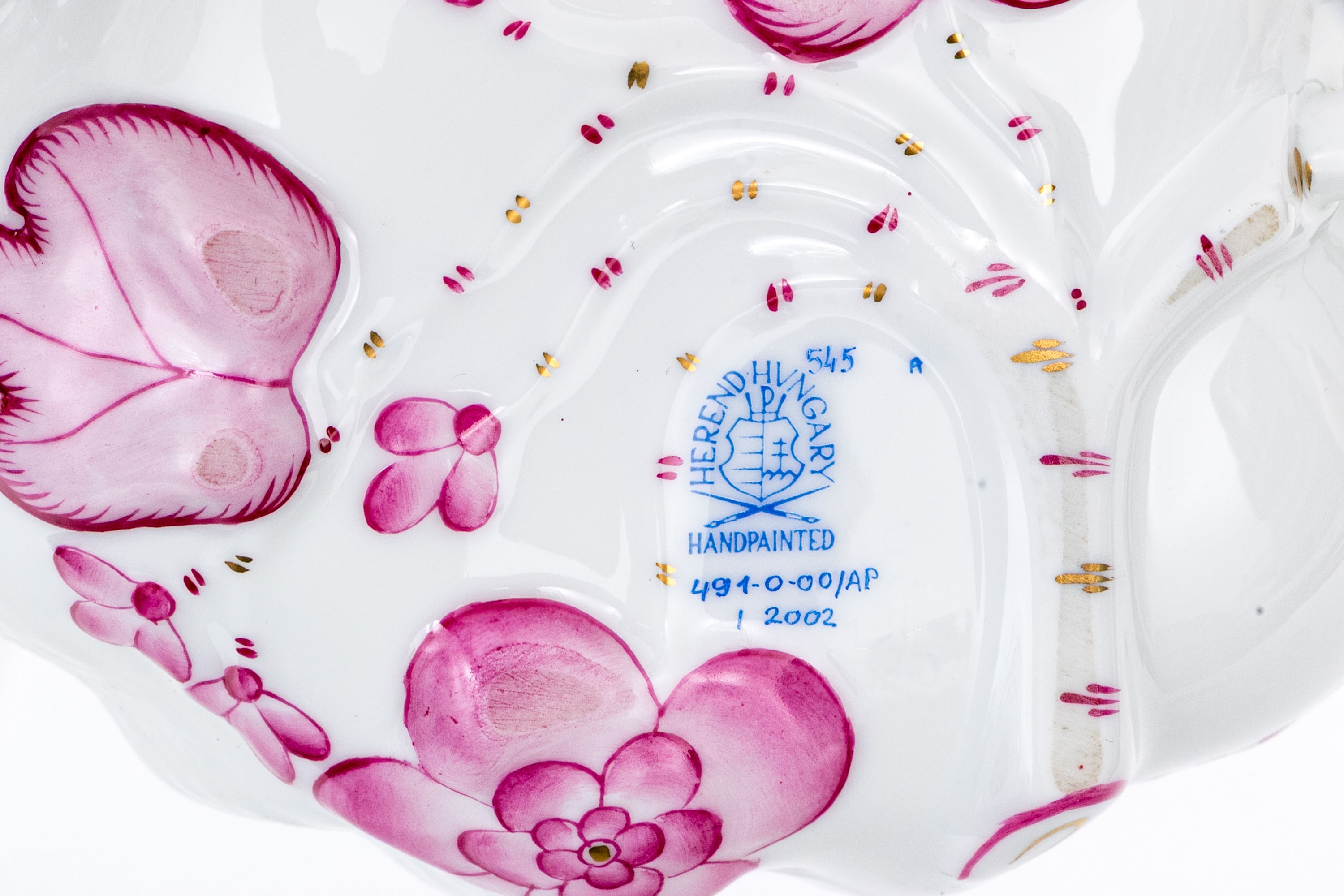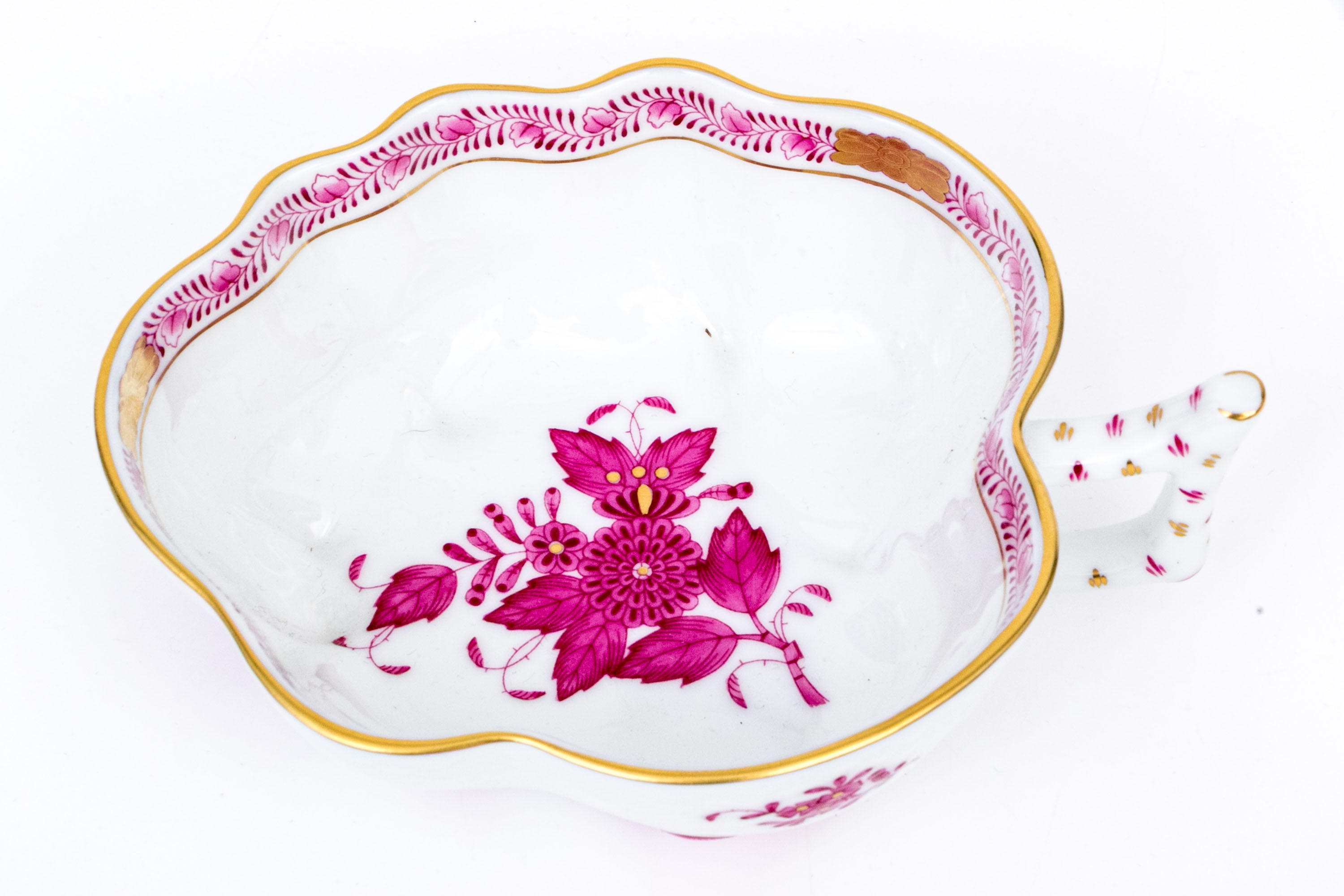 Charming hand-painted porcelain bowl by Herend Hungary in the Apponyi Pink (Chinese Bouquet Raspberry) pattern. The scalloped form features stylized peony blooms and foliate sprays in deep raspberry pink with delicate gilt accents. A garland border of pink vines and gold rosettes encircles the rim, complemented by a distinctive branch-form handle with gilt and pink highlights. Marked on the underside with the blue Herend Hungary shield and crossed paintbrushes, stamped Handpainted and pattern number 491-0-00/AP.