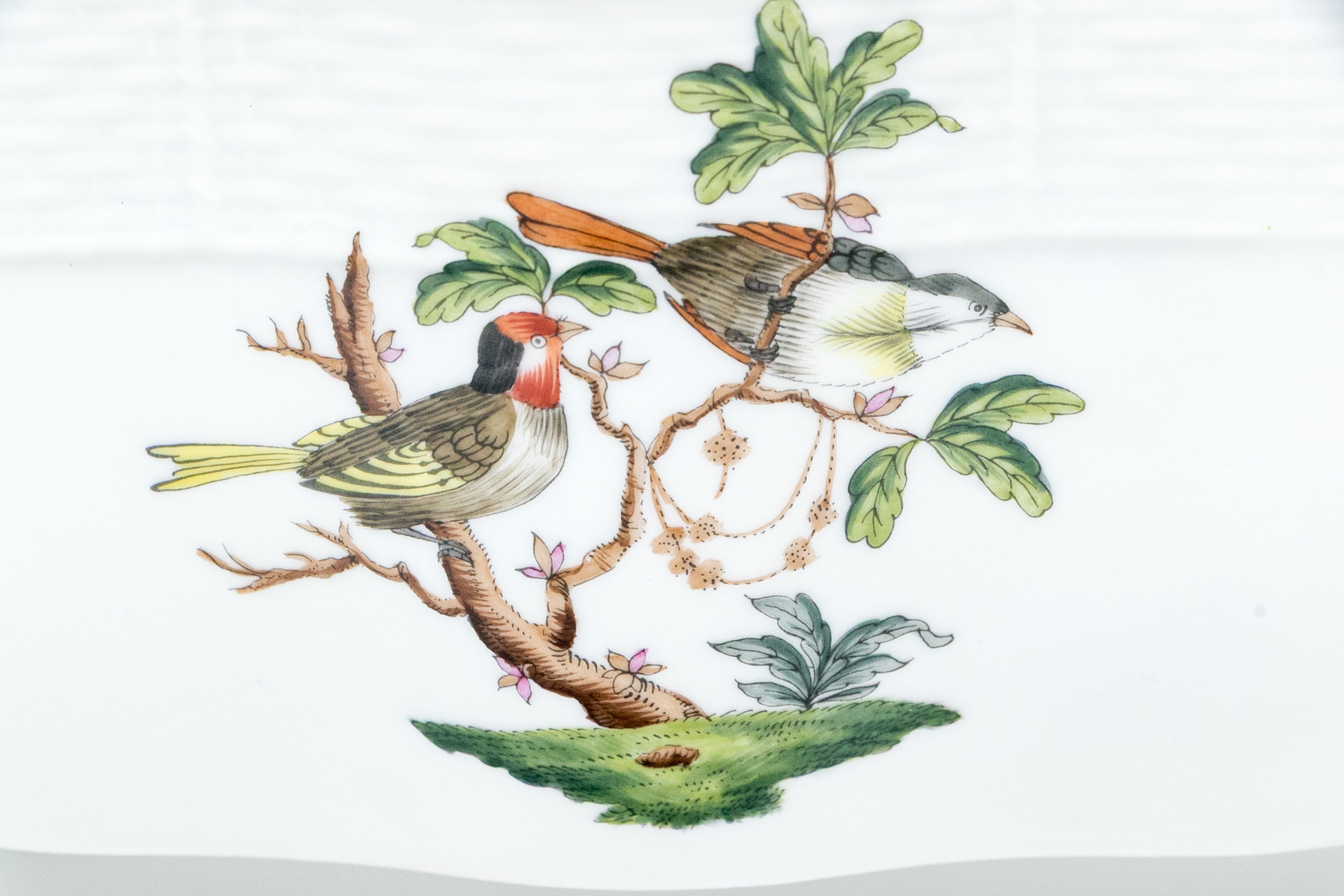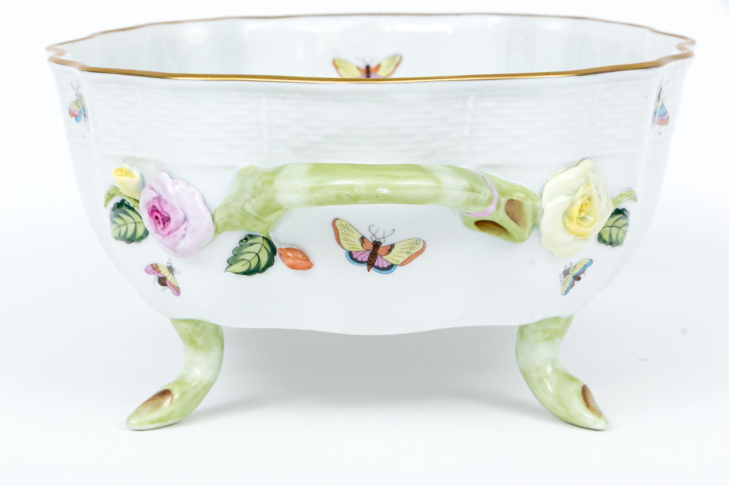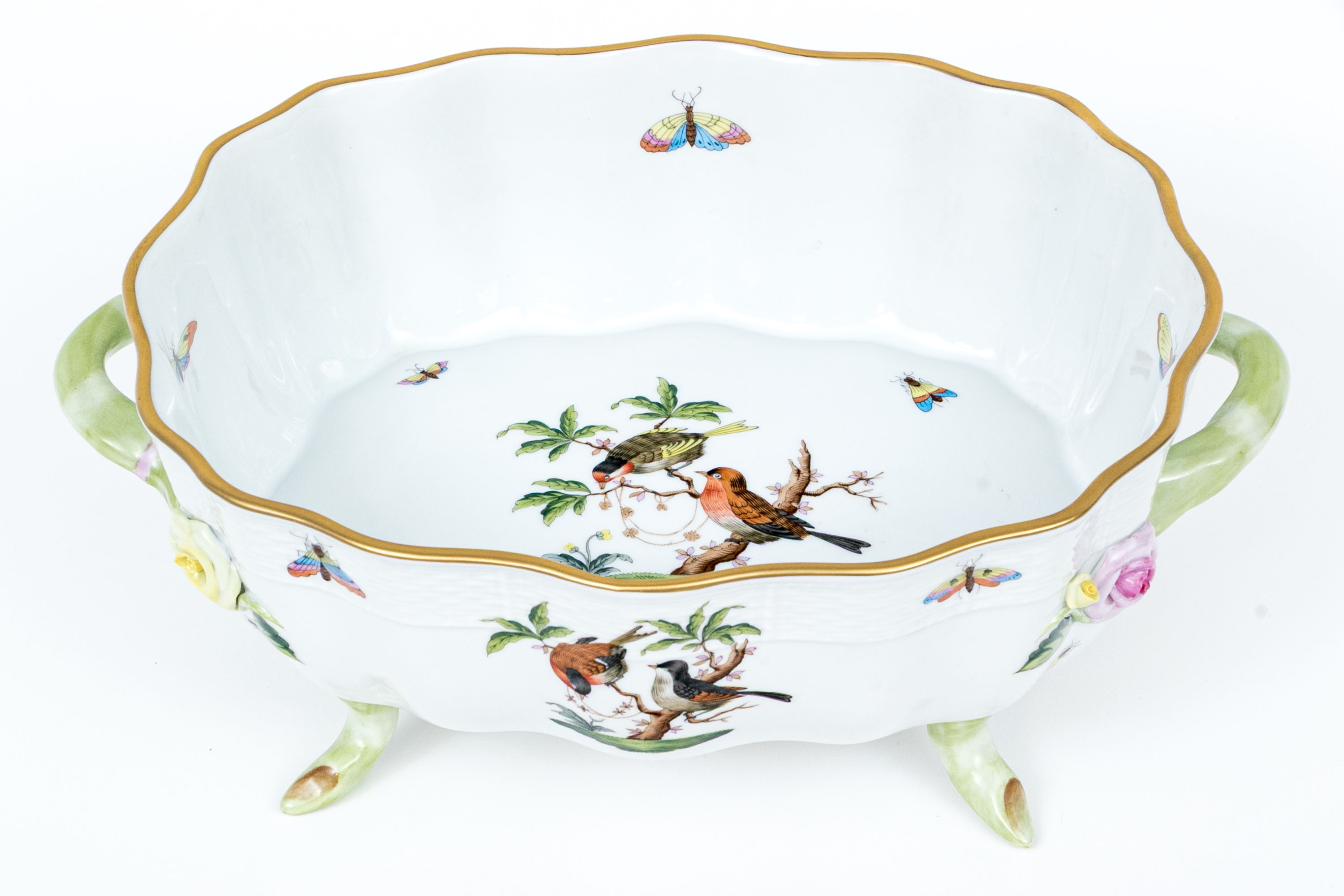 Herend centerpiece bowl is hand-painted in the classic Rothschild Bird (RO) pattern. The pattern, rich with naturalistic detail, depicts pairs of songbirds perched amid leafy branches with necklace, framed by fluttering butterflies and insects painted in delicate pastel hues. The bowl’s scalloped rim is highlighted with hand-applied 24K gilt trim, and the body is accented by applied porcelain roses and leafy handles in soft green tones. The bowl rests on three branch-like legs, each delicately shaded to suggest natural wood and foliage. The underside bears the blue Herend Hungary shield hallmark, inscribed HEREND HUNGARY HANDPAINTED with model number 7653/RO.