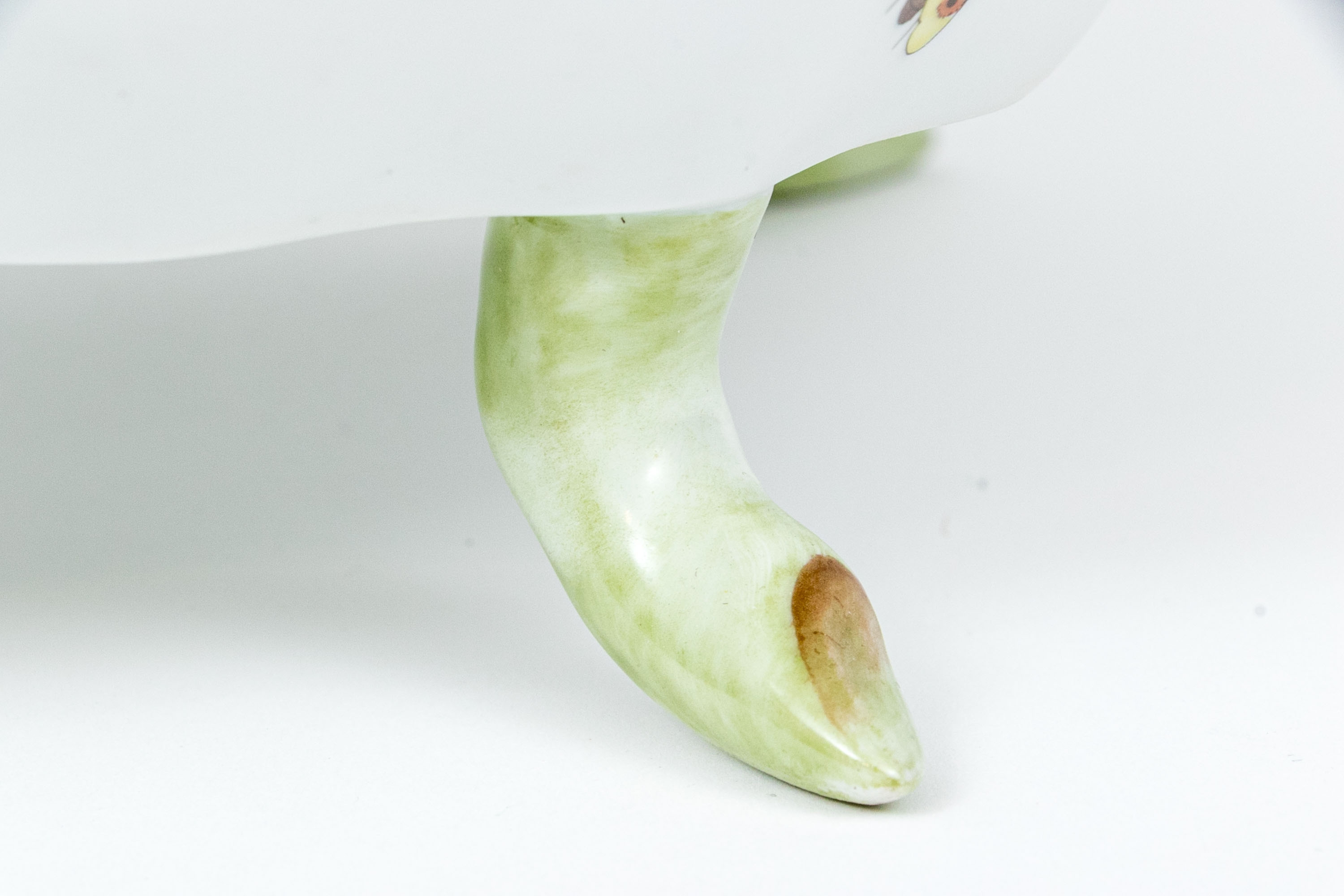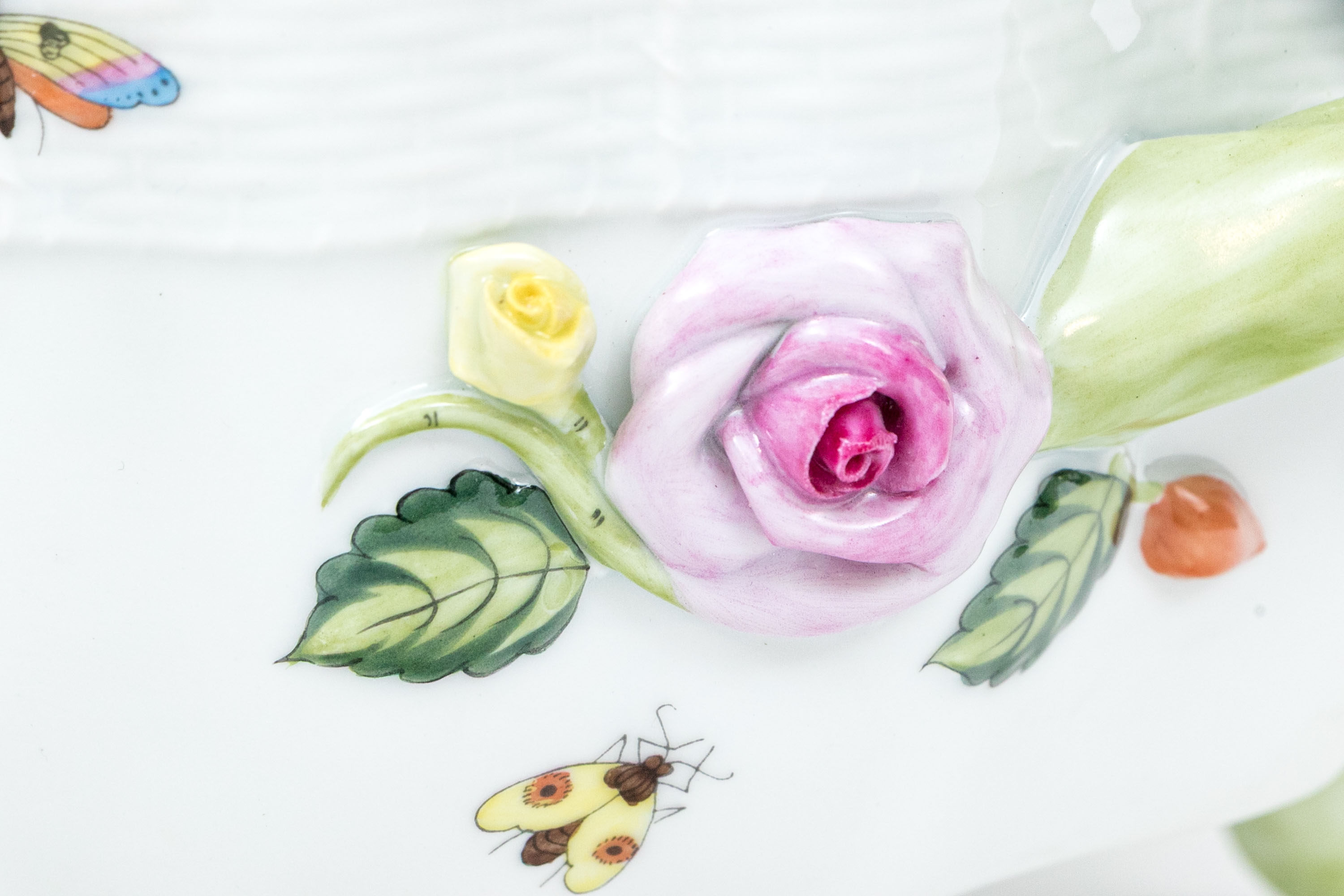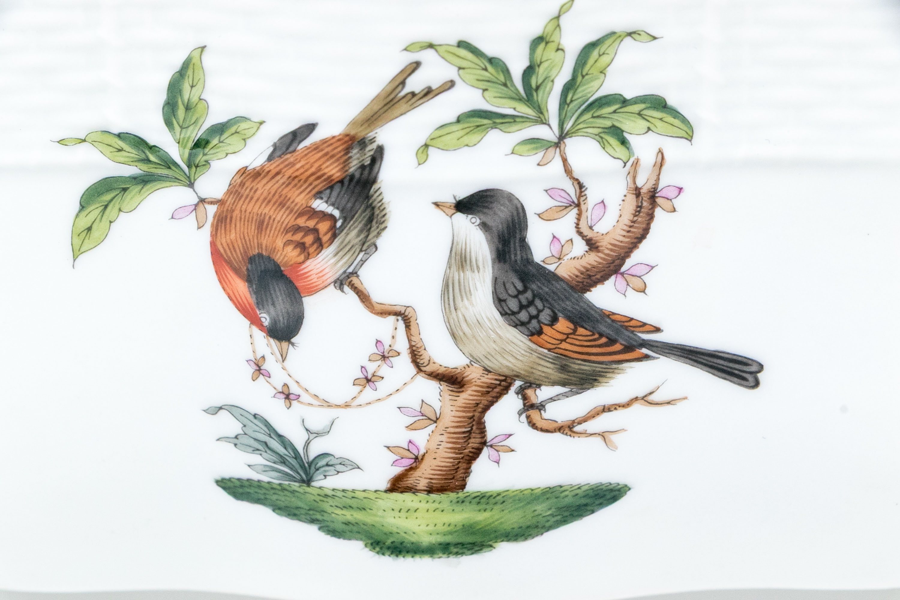 Herend centerpiece bowl is hand-painted in the classic Rothschild Bird (RO) pattern. The pattern, rich with naturalistic detail, depicts pairs of songbirds perched amid leafy branches with necklace, framed by fluttering butterflies and insects painted in delicate pastel hues. The bowl’s scalloped rim is highlighted with hand-applied 24K gilt trim, and the body is accented by applied porcelain roses and leafy handles in soft green tones. The bowl rests on three branch-like legs, each delicately shaded to suggest natural wood and foliage. The underside bears the blue Herend Hungary shield hallmark, inscribed HEREND HUNGARY HANDPAINTED with model number 7653/RO.