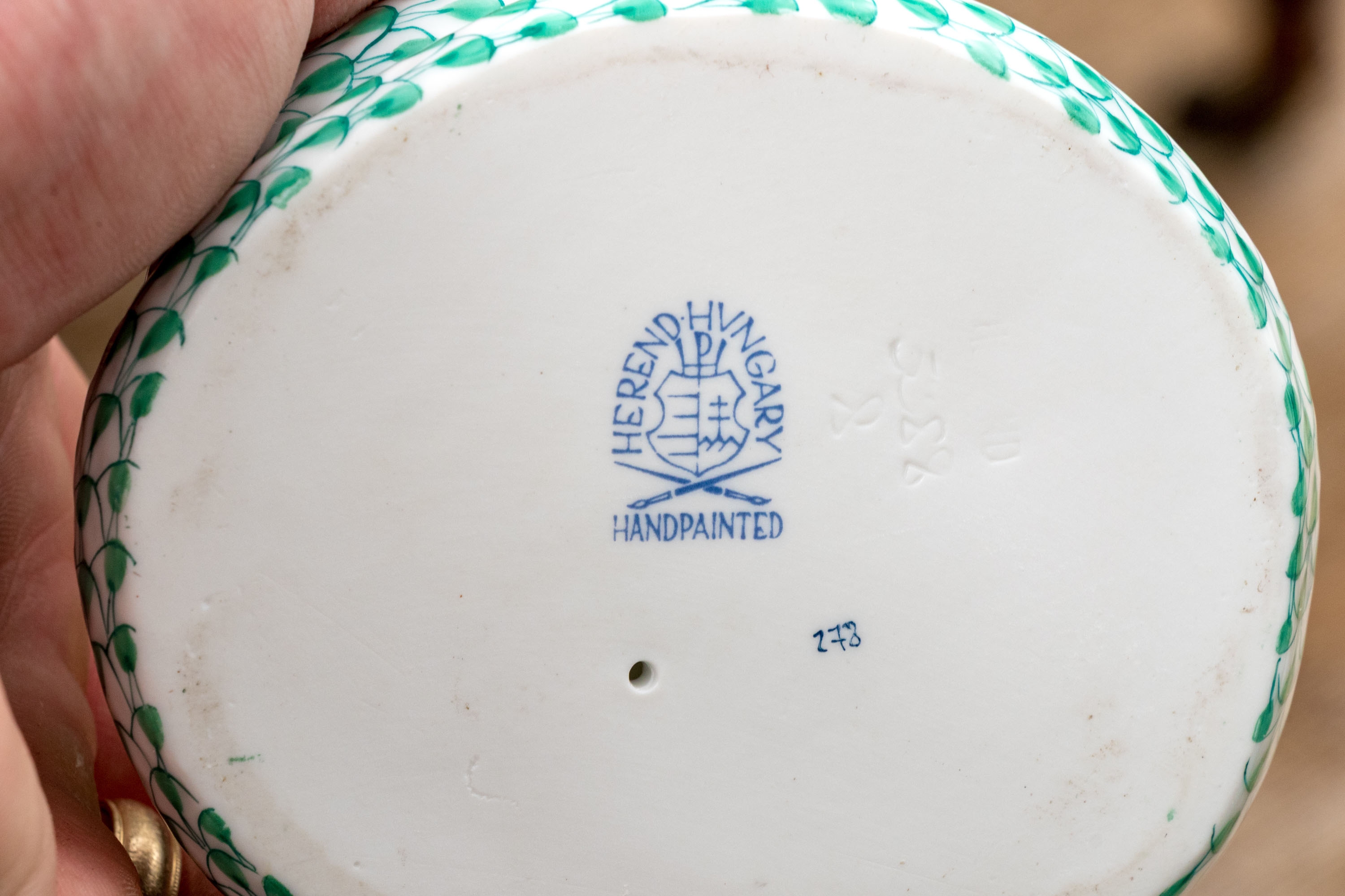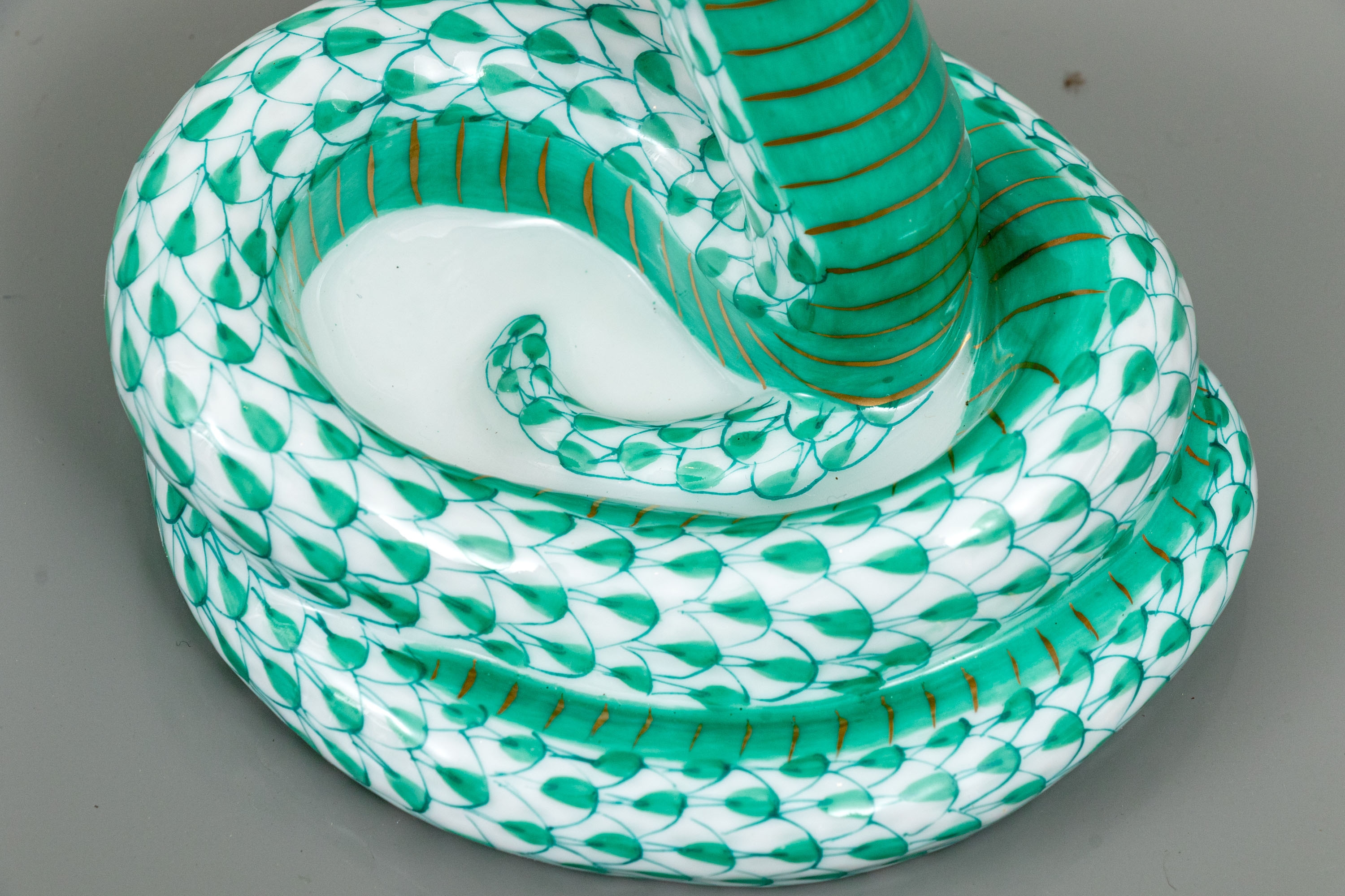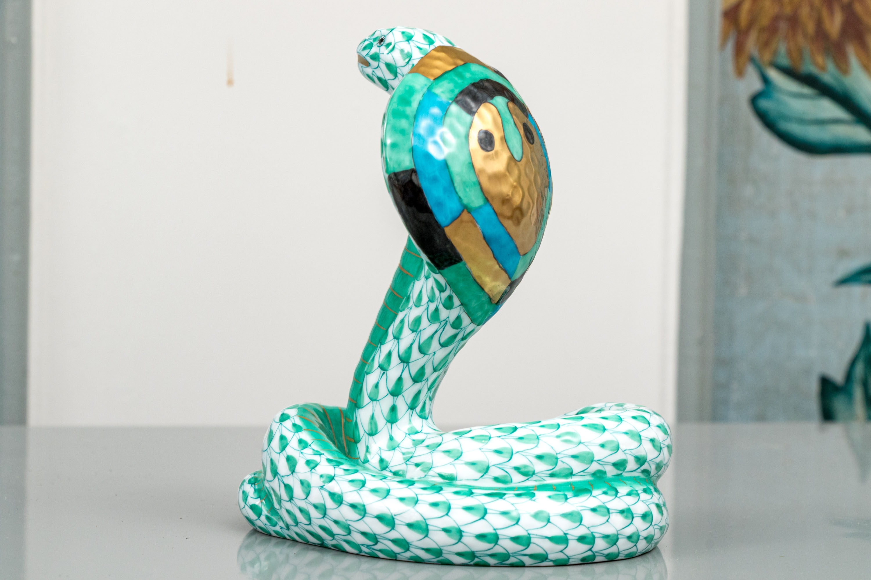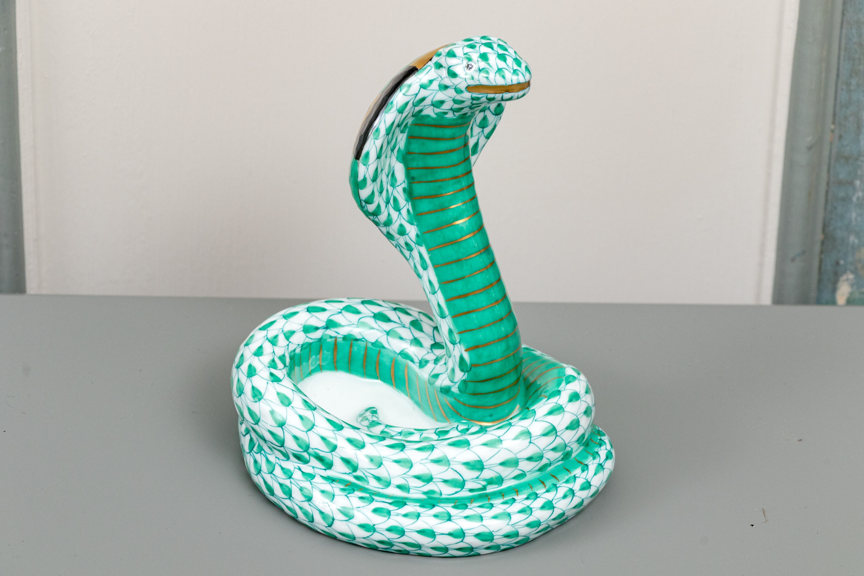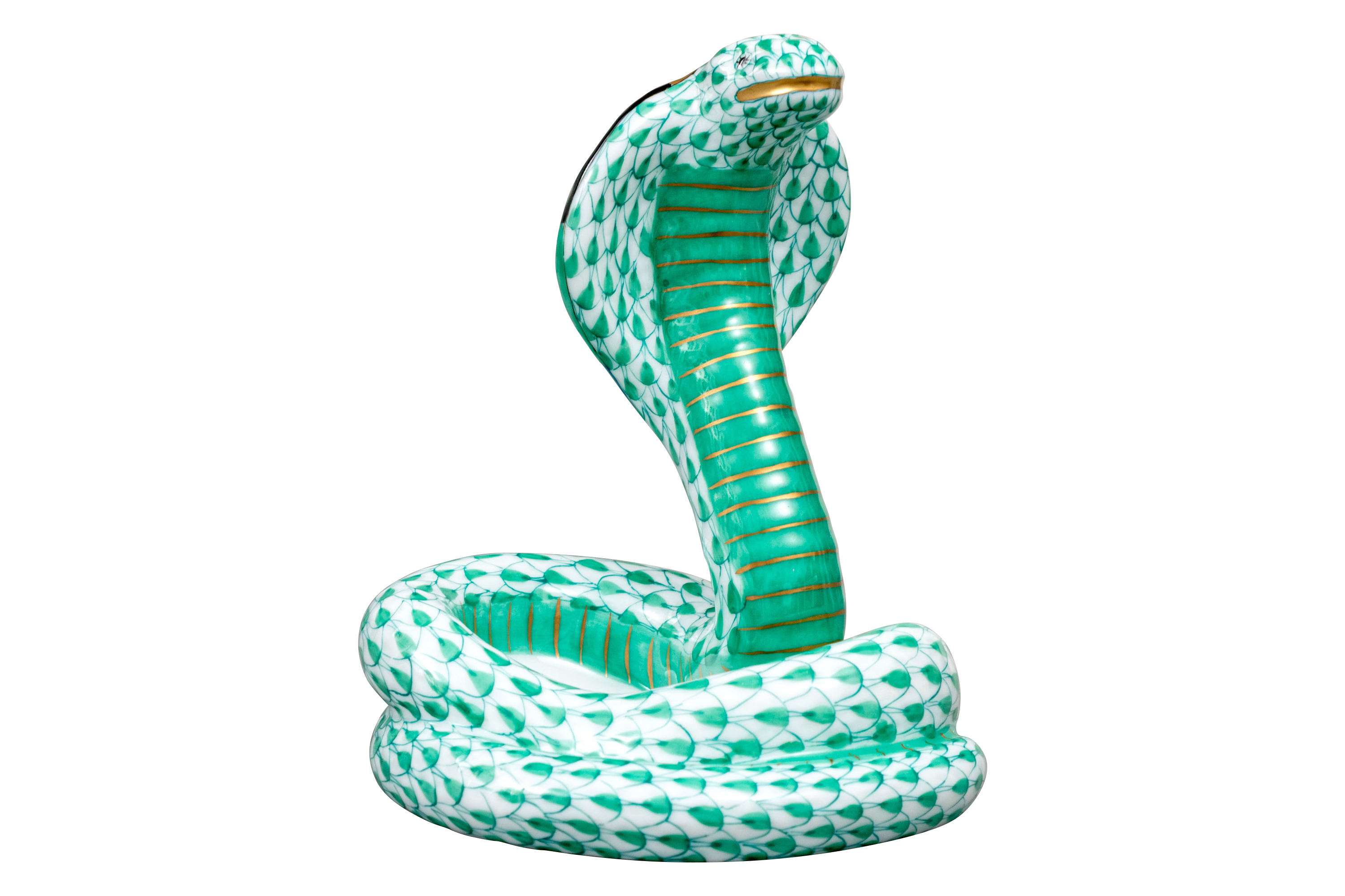 Herend Hungary hand-painted porcelain cobra, exquisitely modeled in the brand’s signature green fishnet (VHV) pattern with 24K gold embellishments. The coiled serpent is poised in a classic striking stance, its hood fully flared and meticulously detailed with bold concentric turquoise, black, and gold rings..The cobra’s scales shimmer in shades of emerald green over pure white porcelain, with gold accents highlighting its sinuous form. Its gilded eyes, fangs, and tongue add an element of intensity to this exceptional sculptural figure. The underside bears the Herend Hungary blue shield and crossed paintbrush hallmark, inscribed Handpainted and numbered 5582, with impressed factory marks and painter’s code 278.