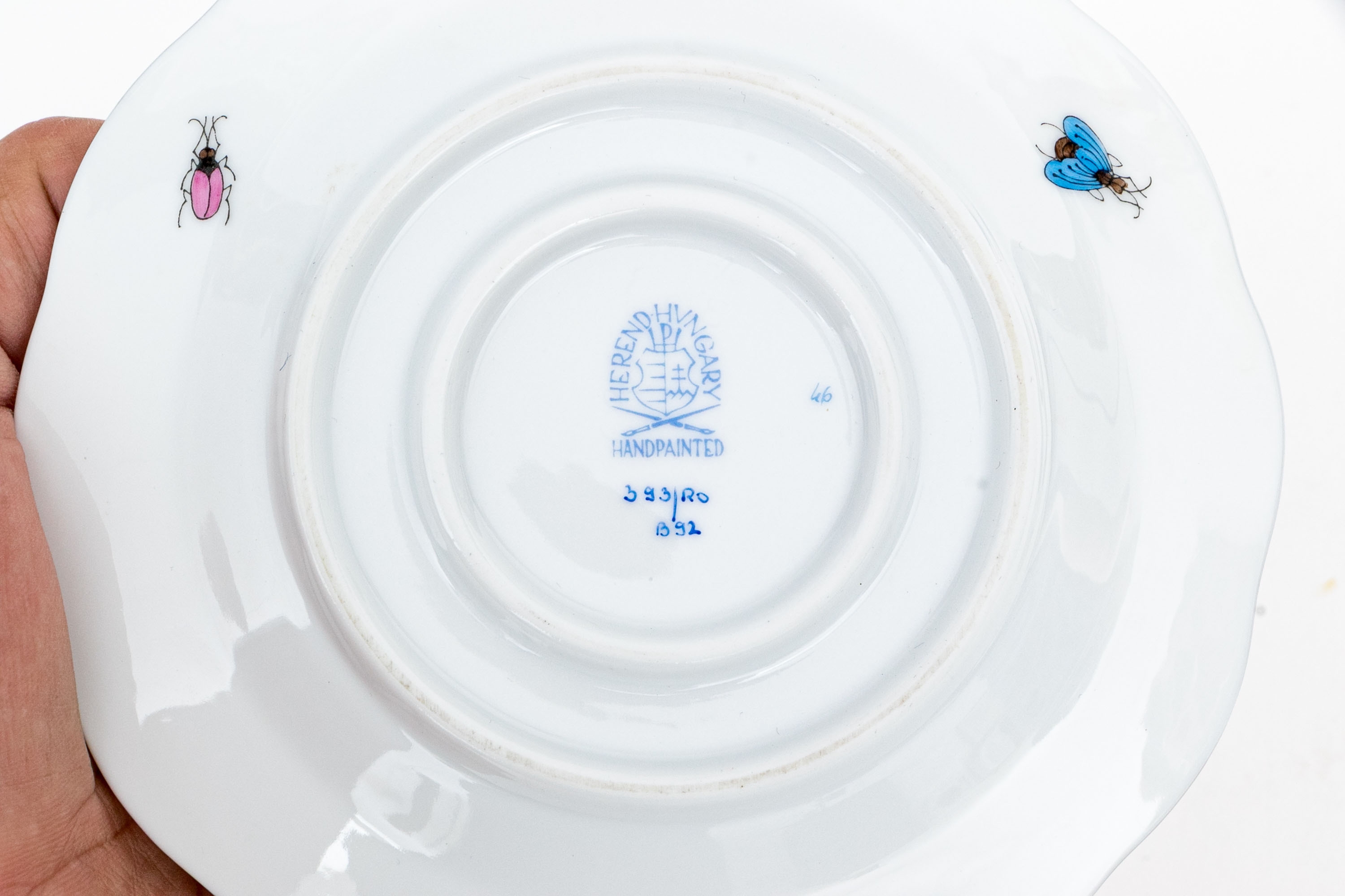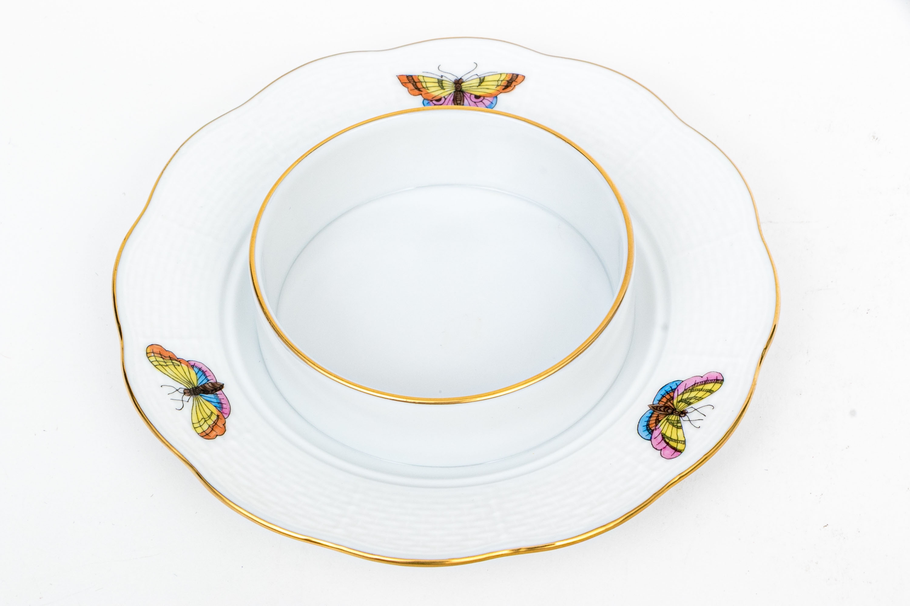 The body and underplate are decorated with vivid butterflies and insects in jewel-like tones of pink, blue, yellow, and orange, each outlined in fine black brushwork. The composition is framed with elegant 24K gold trim along the rims. The underside bears the Herend Hungary blue shield hallmark with crossed paintbrushes, HANDPAINTED inscription, and pattern number 589/RO