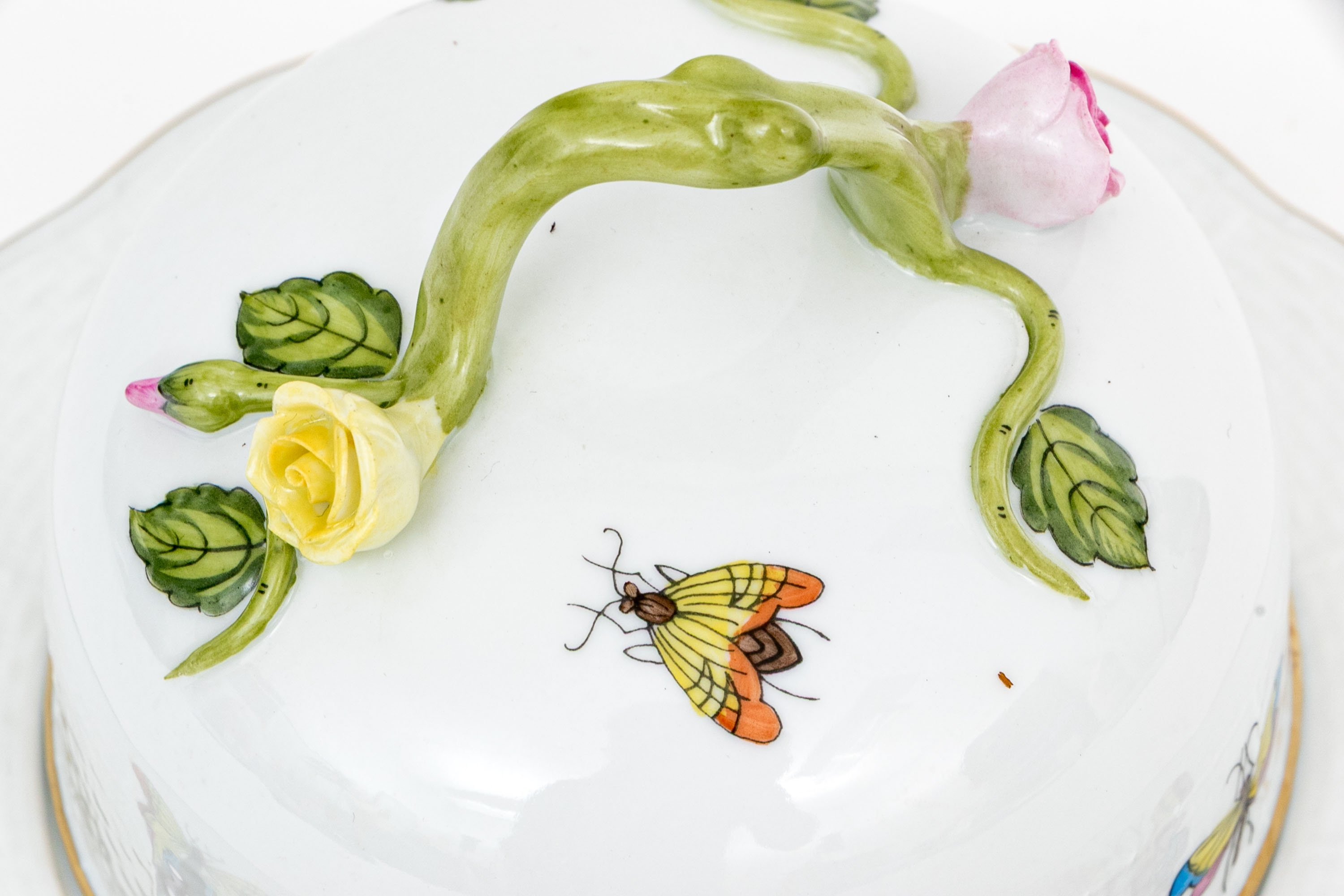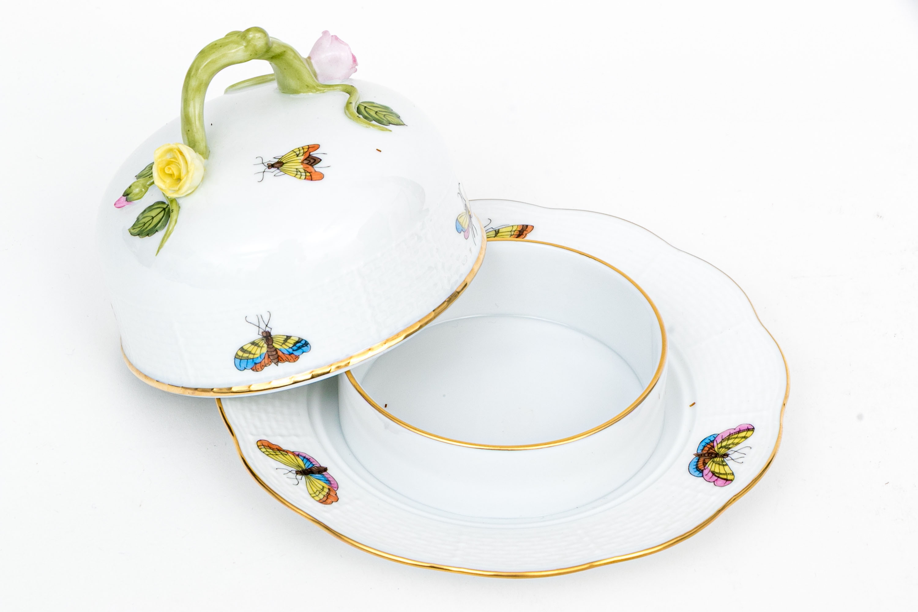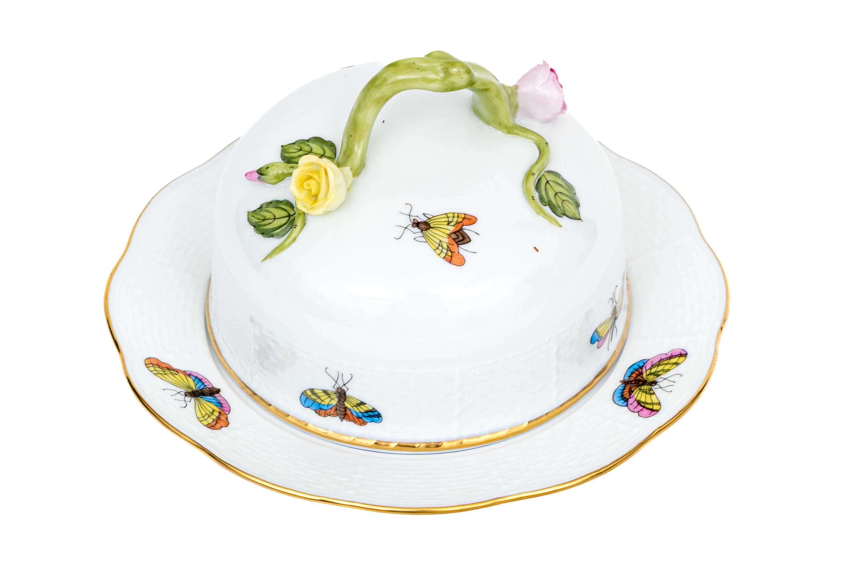 Herend Hungary porcelain covered butter dish, model 589/RO, executed in the classic Rothschild Bird (RO) pattern. The piece consists of a domed cover with floral finial and matching underplate, both showcasing Herend’s delicate basketweave (osier) texture. The domed lid is topped with a sculptural vine handle accented with a yellow and pink rose and green leaves—each petal and leaf meticulously shaped and hand-painted.