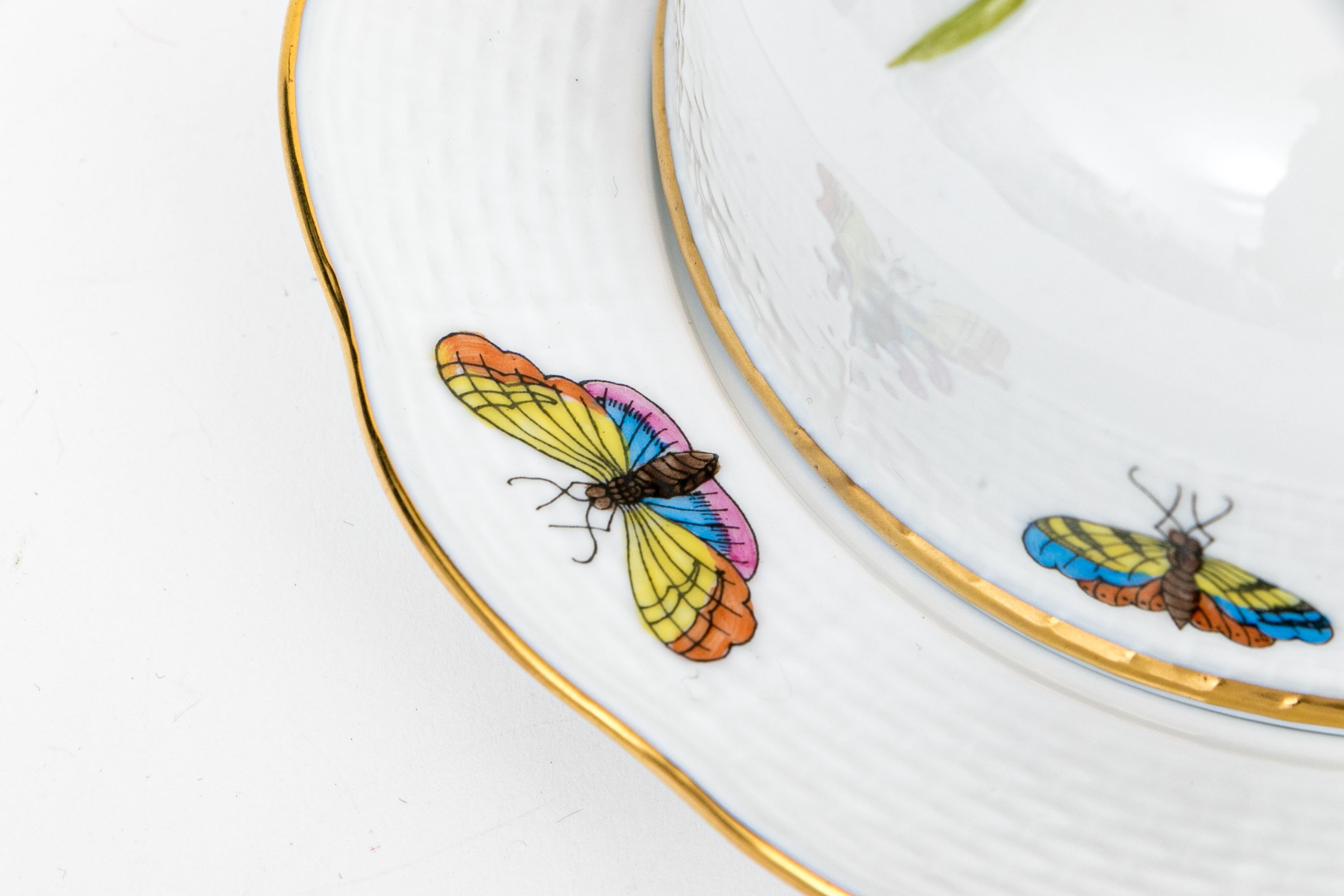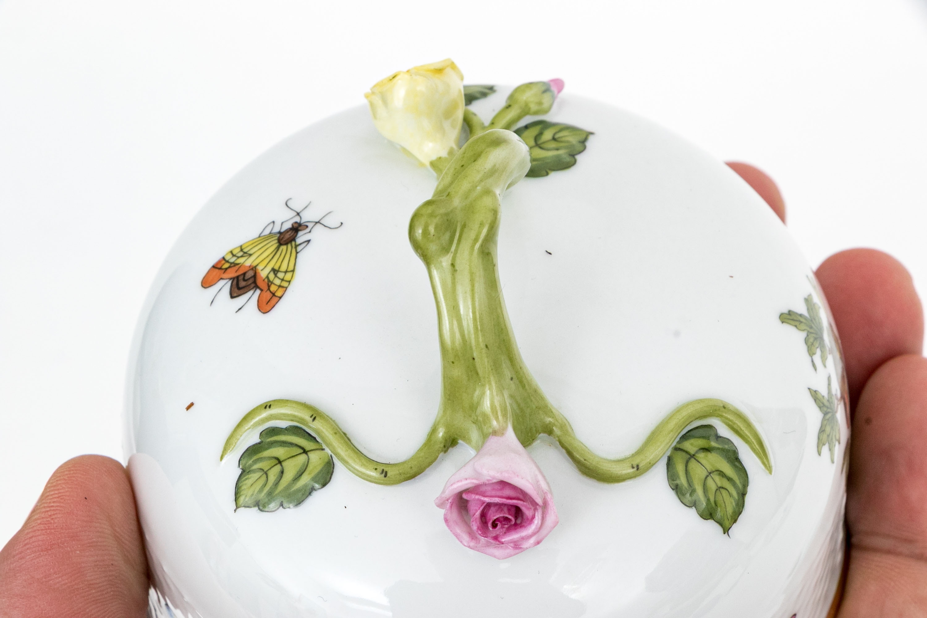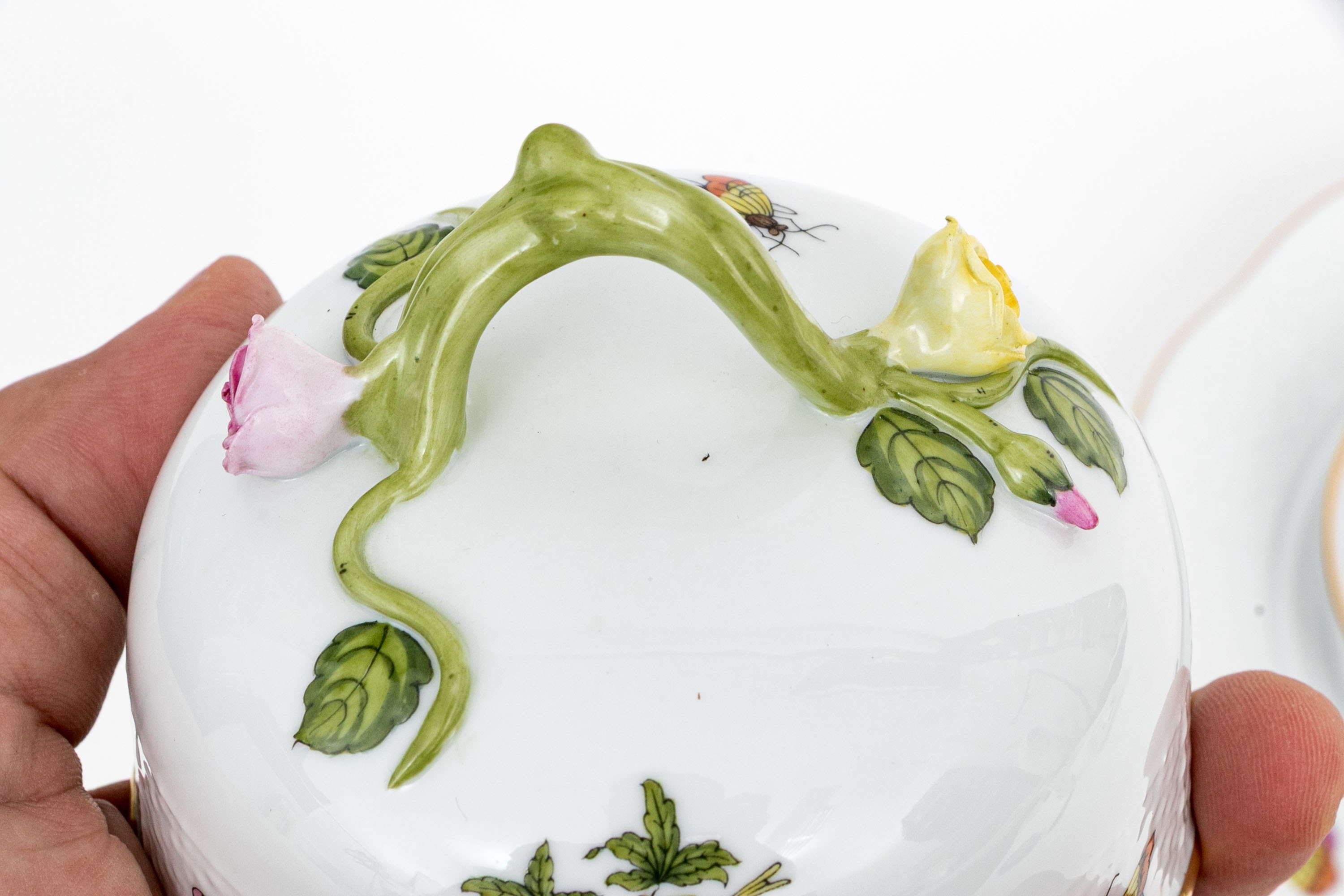 Herend Hungary porcelain covered butter dish, model 589/RO, executed in the classic Rothschild Bird (RO) pattern. The piece consists of a domed cover with floral finial and matching underplate, both showcasing Herend’s delicate basketweave (osier) texture. The domed lid is topped with a sculptural vine handle accented with a yellow and pink rose and green leaves—each petal and leaf meticulously shaped and hand-painted.