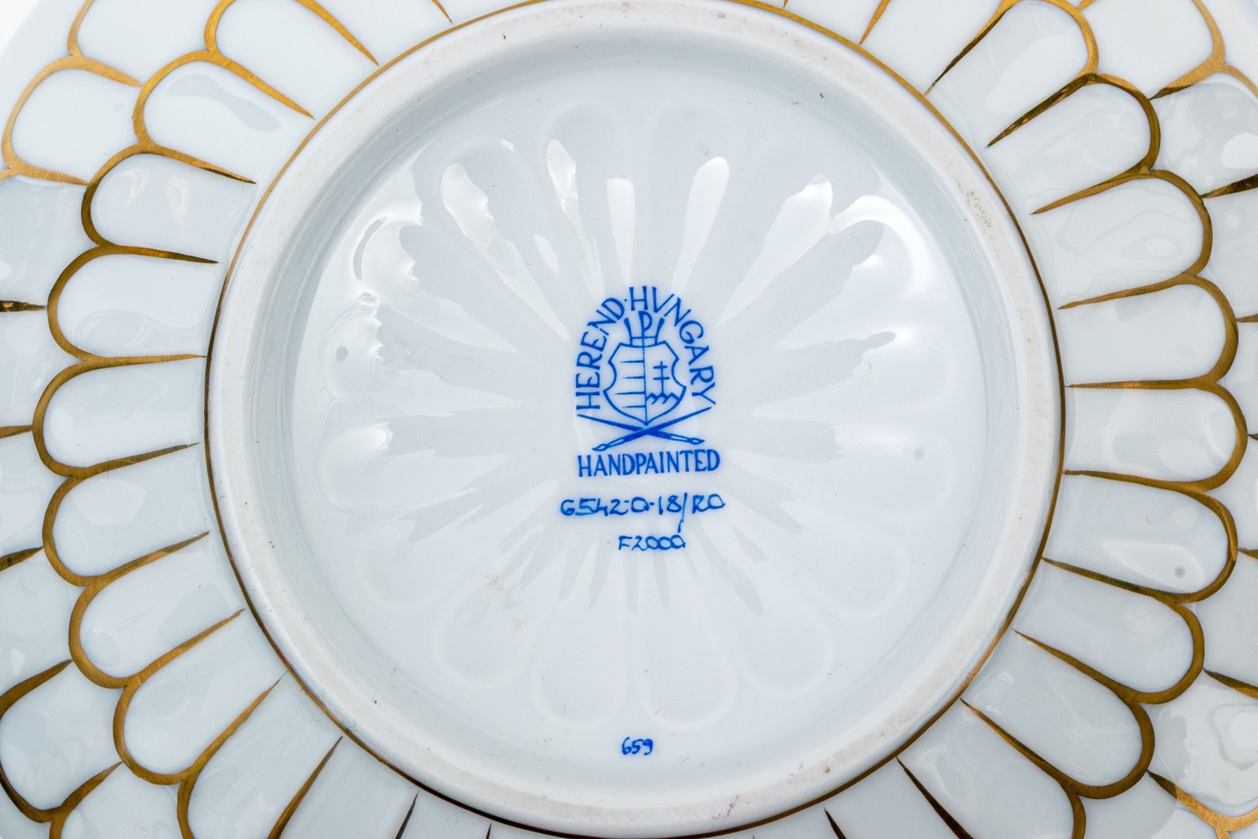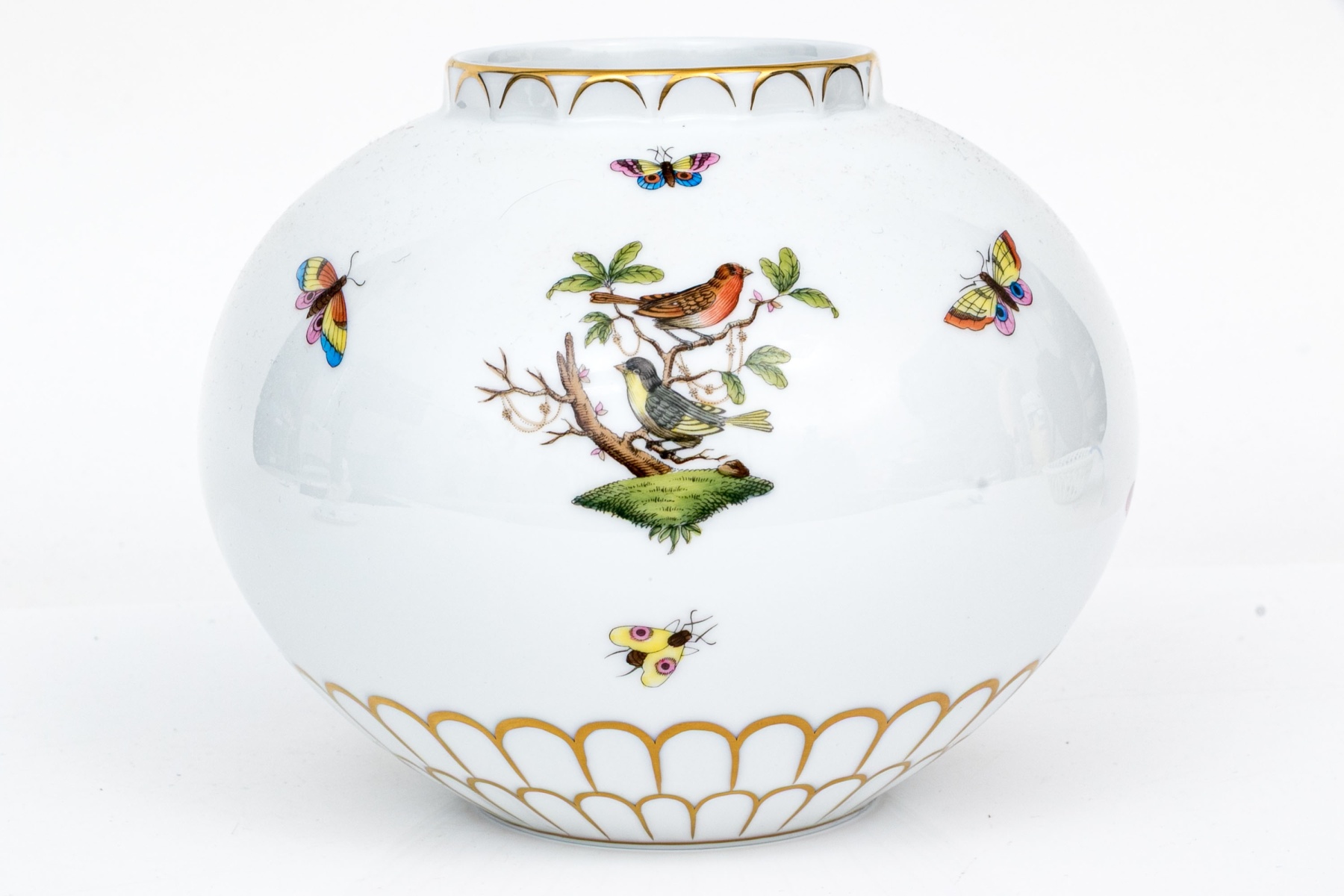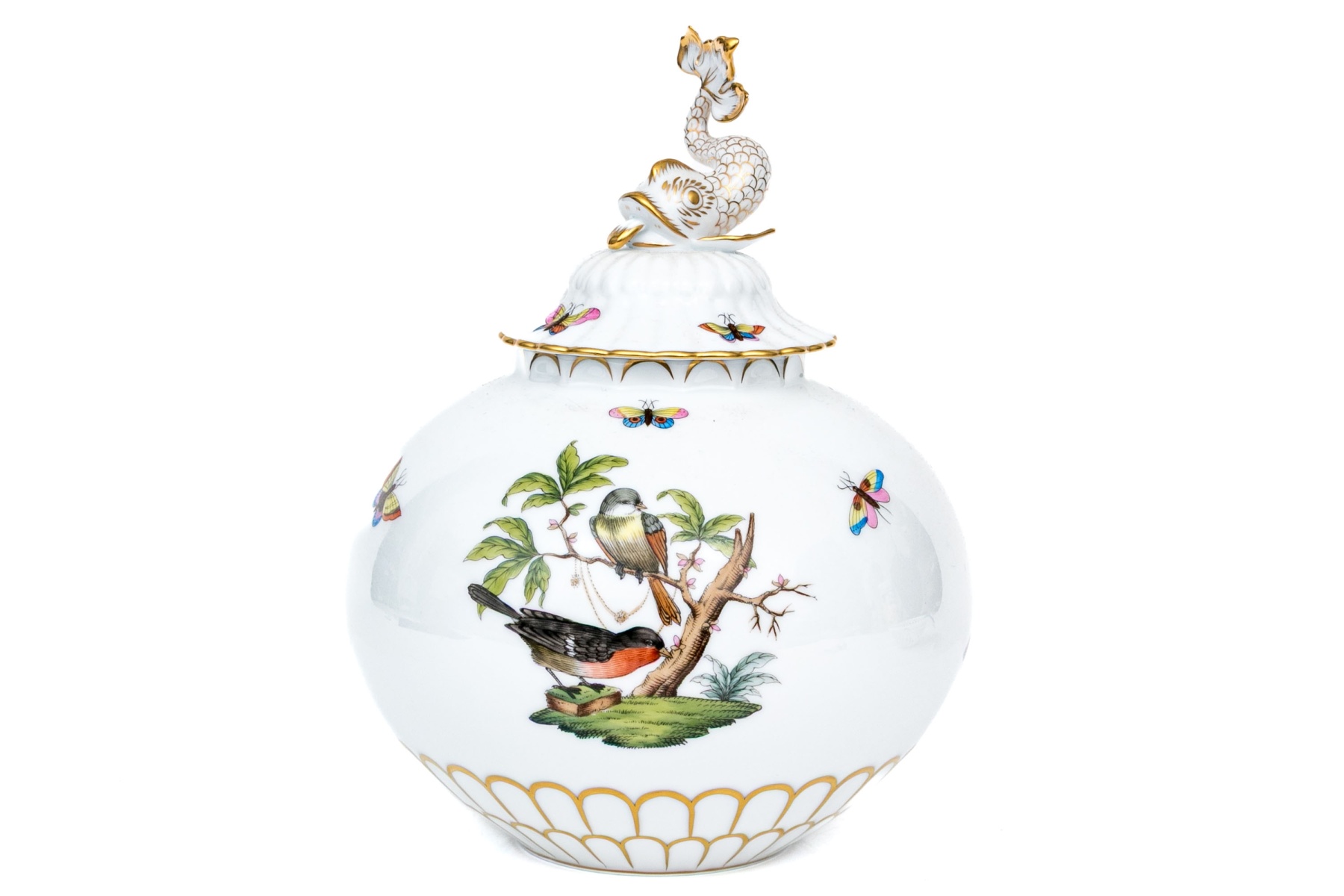 The rounded body features a gently fluted foot and neck edged in hand-painted 24K gold scalloping, framing vivid scenes from the Rothschild Bird series. Each panel depicts a pair of colorful songbirds perched amid delicately rendered branches with necklace with green foliage and blossoms, surrounded by fluttering butterflies and insects, painted in Herend’s signature bright enamels. The domed lid continues the decoration with butterflies and gold edging and is topped with a three-dimensional dolphin finial — modeled with dramatic curvature and detailed with gilt scales and highlights. The underside bears the blue Herend Hungary shield mark, inscribed HANDPAINTED, and pattern number 6542-0-18/RO.