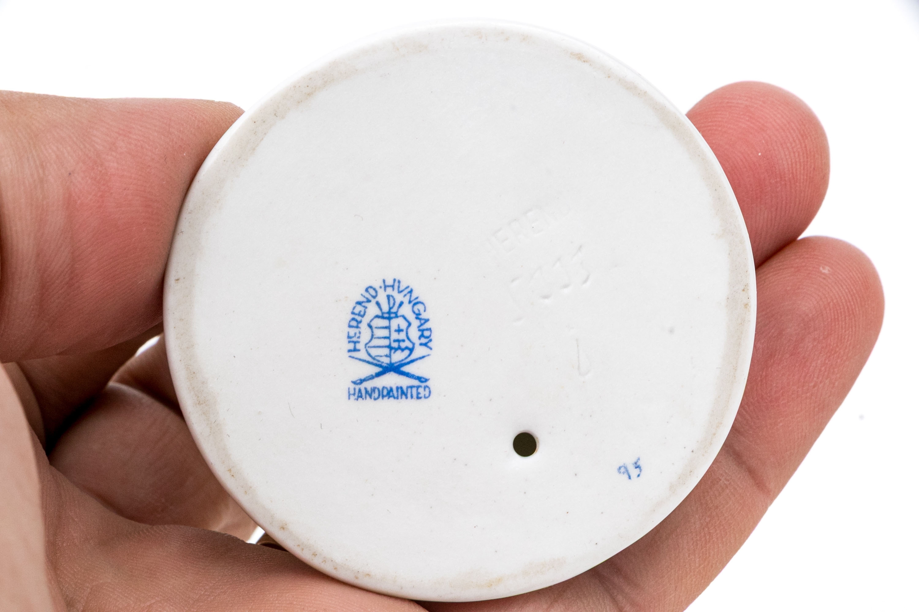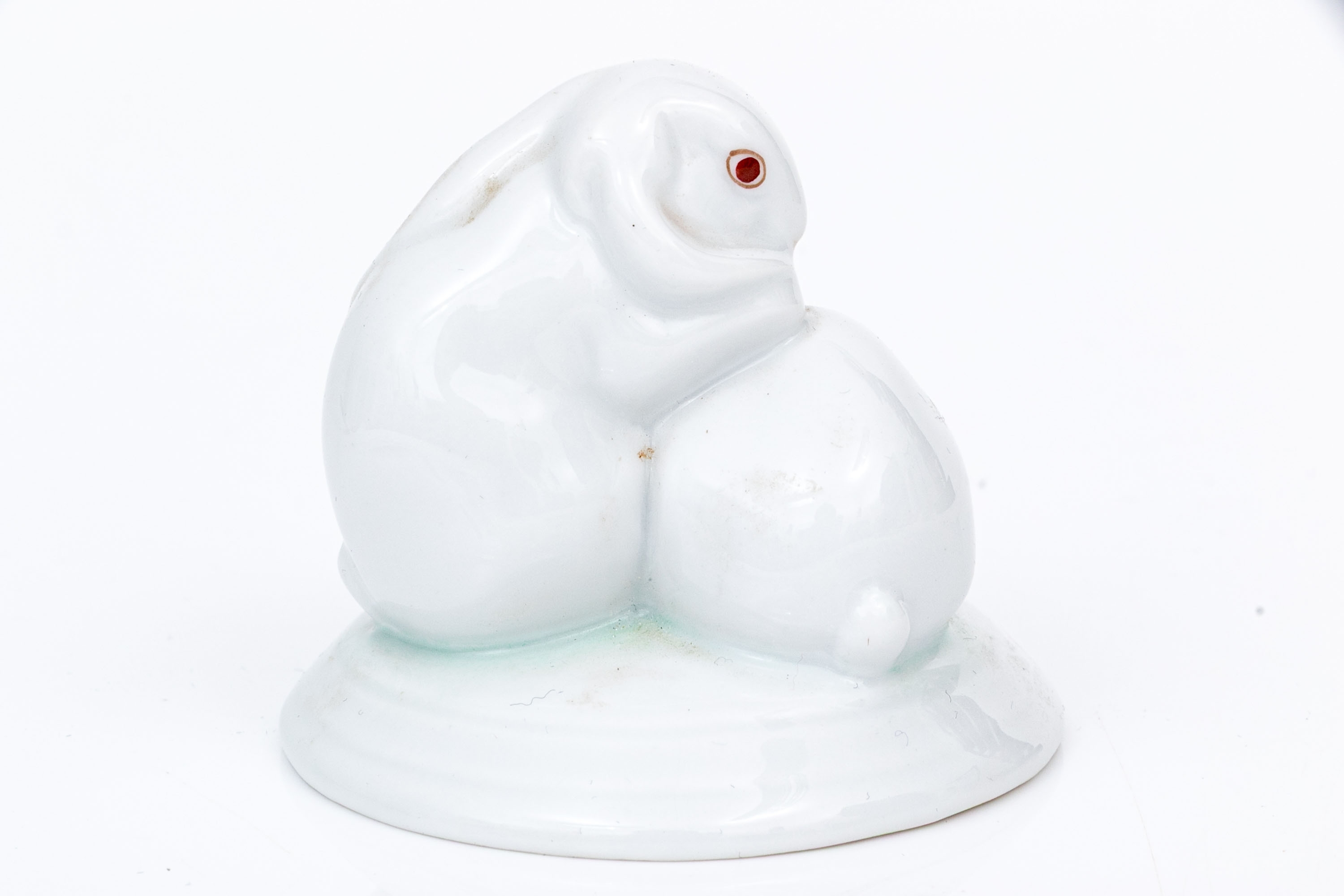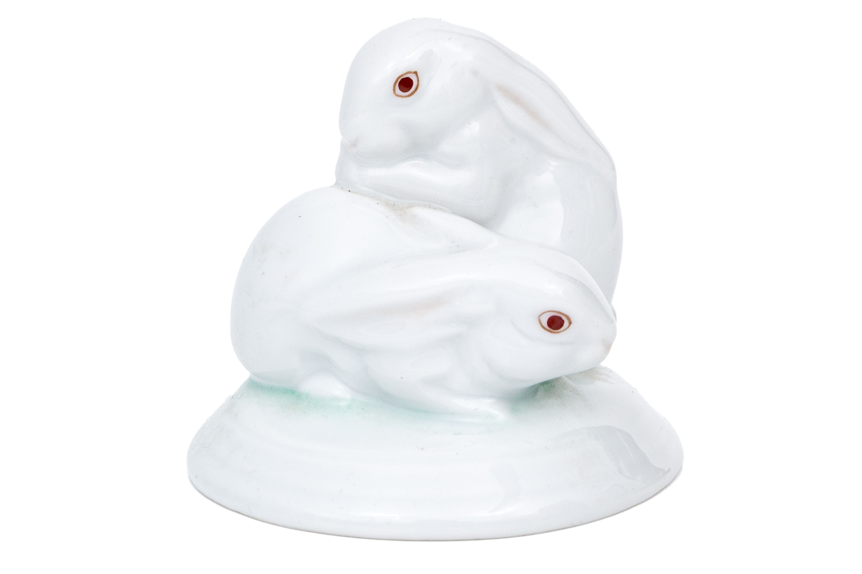 Charming hand-painted porcelain figure by Herend Hungary depicting two white rabbits, modeled in a sweet resting pose on a rounded base. Each rabbit is detailed with amber eyes and subtle green shading at the base. Marked on underside with the blue Herend Hungary shield and crossed paintbrushes, stamped Handpainted with impressed form number 533.