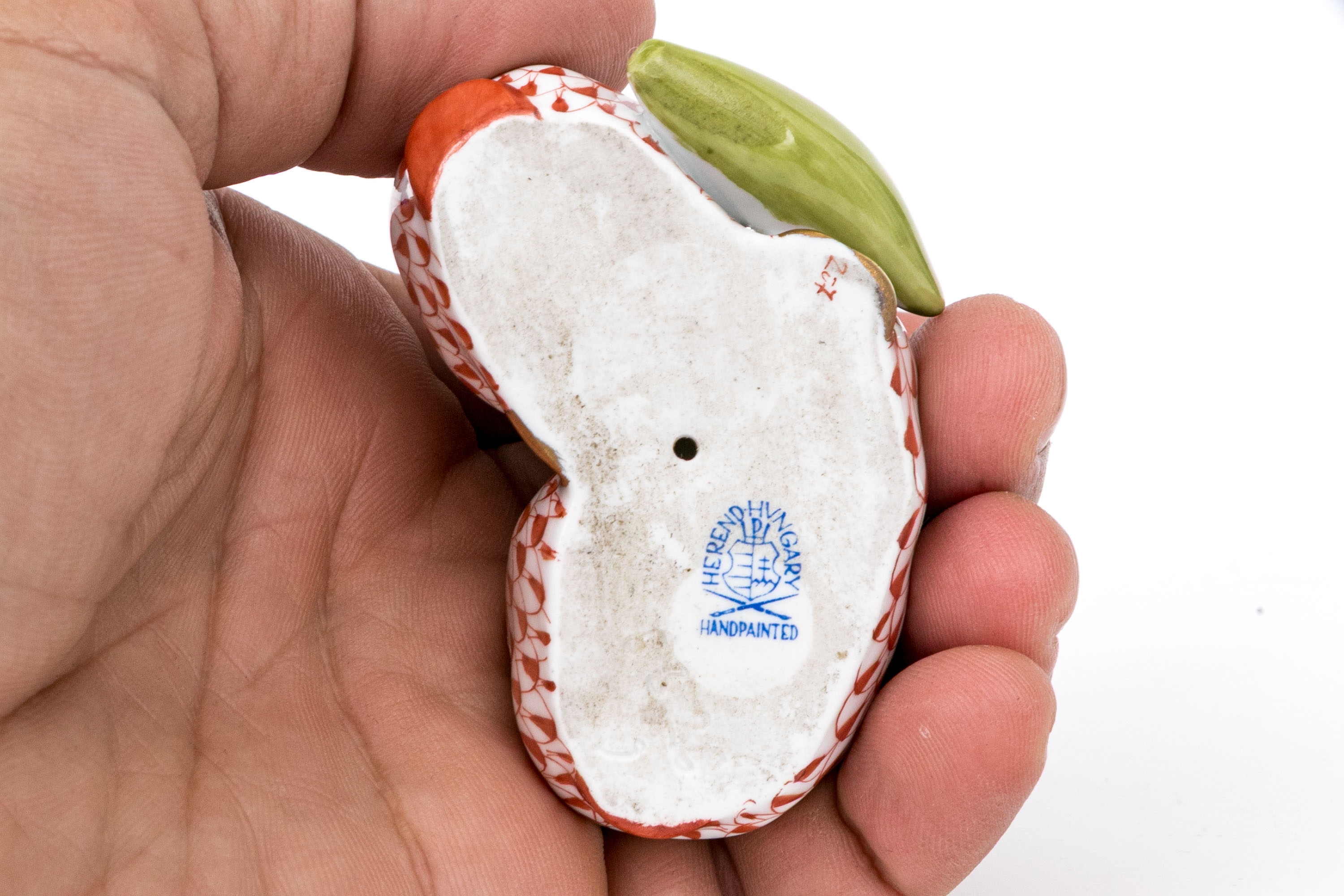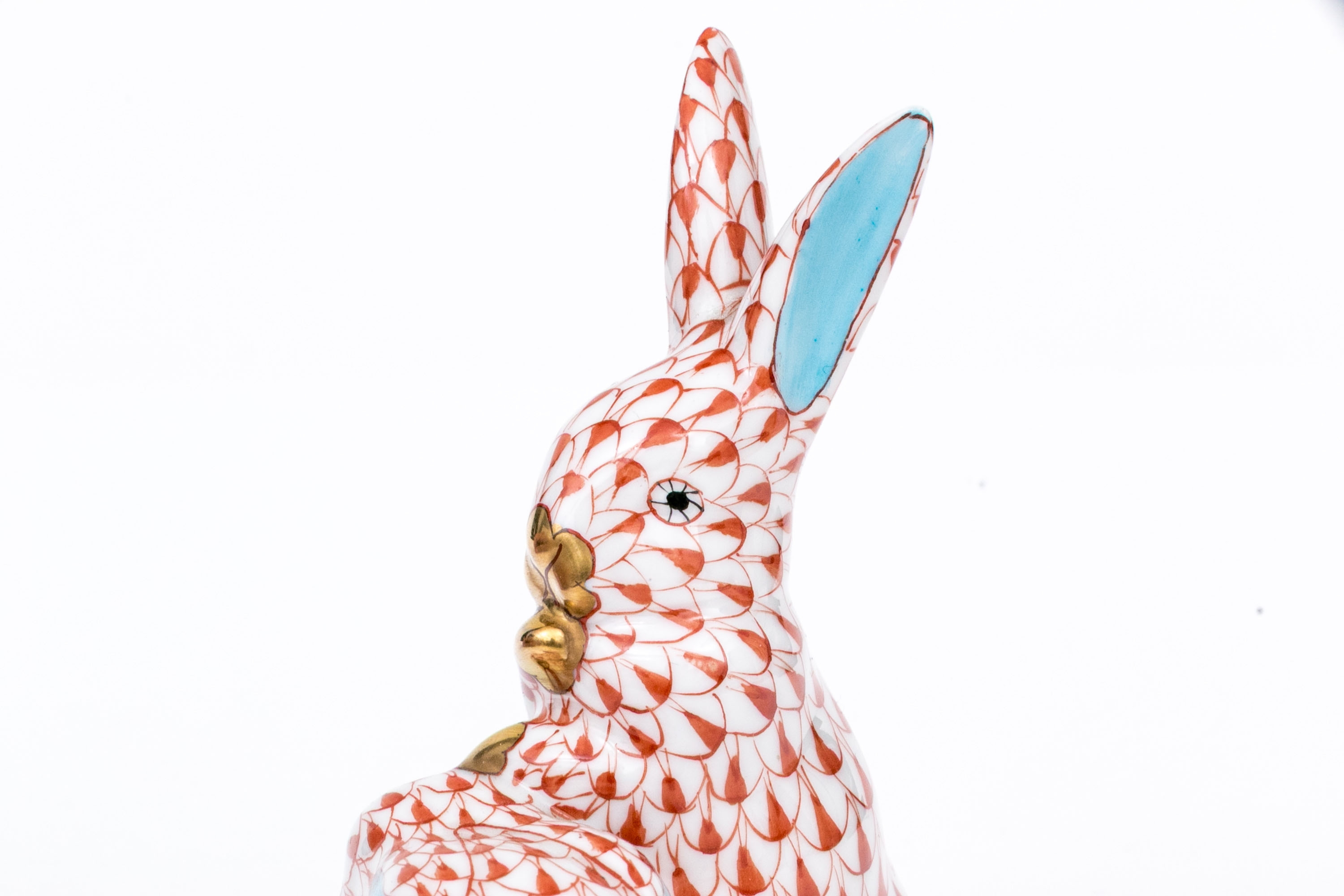 Delightful hand-painted porcelain figure by Herend Hungary depicting two rabbits in the iconic rust fishnet pattern, one sitting upright beside a reclining companion nibbling an ear of corn. Each rabbit features sky-blue inner ears and 24K gilt accents to the eyes, paws, and corn husk edges. Marked on underside with the blue Herend Hungary shield and crossed paintbrushes, stamped Handpainted.