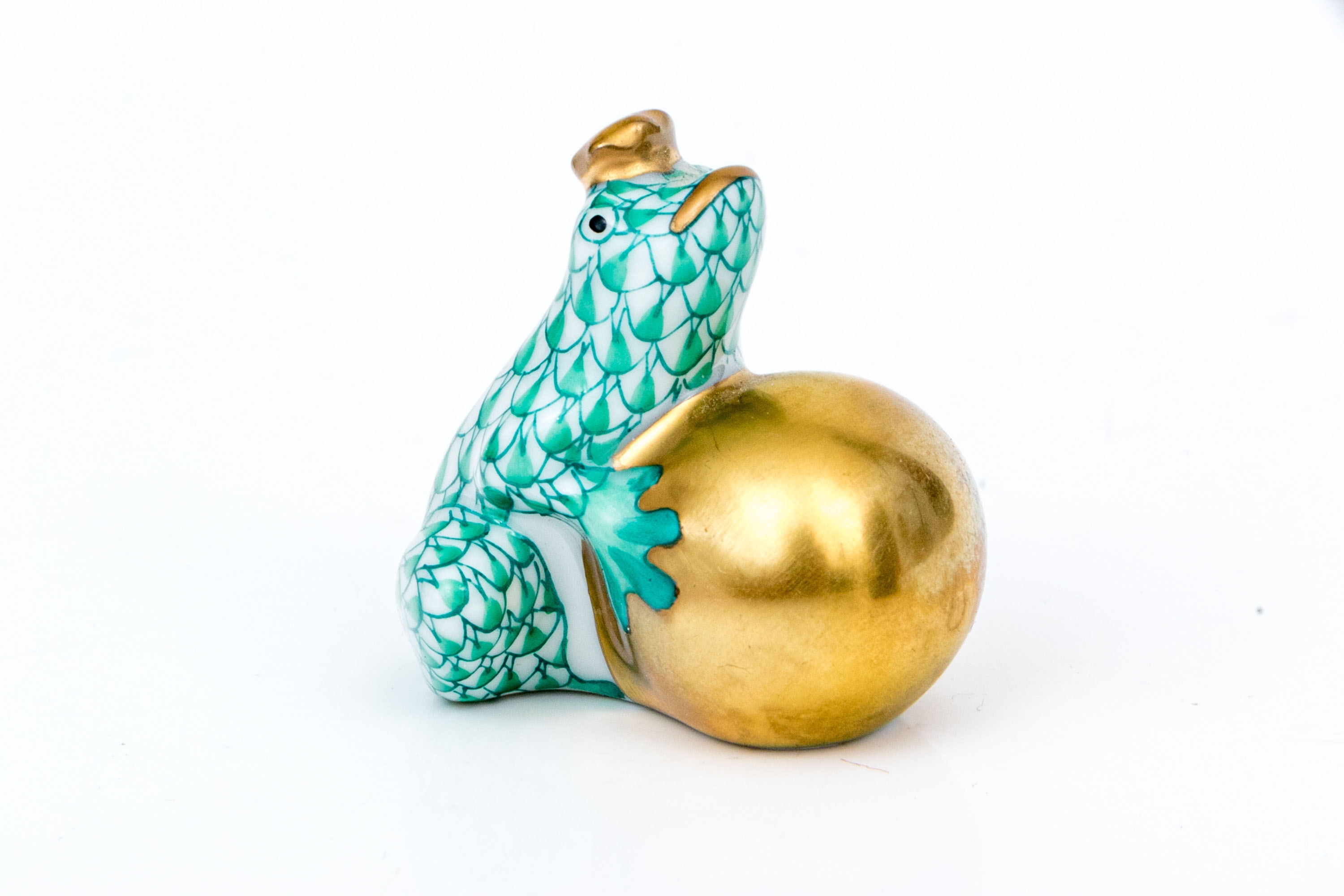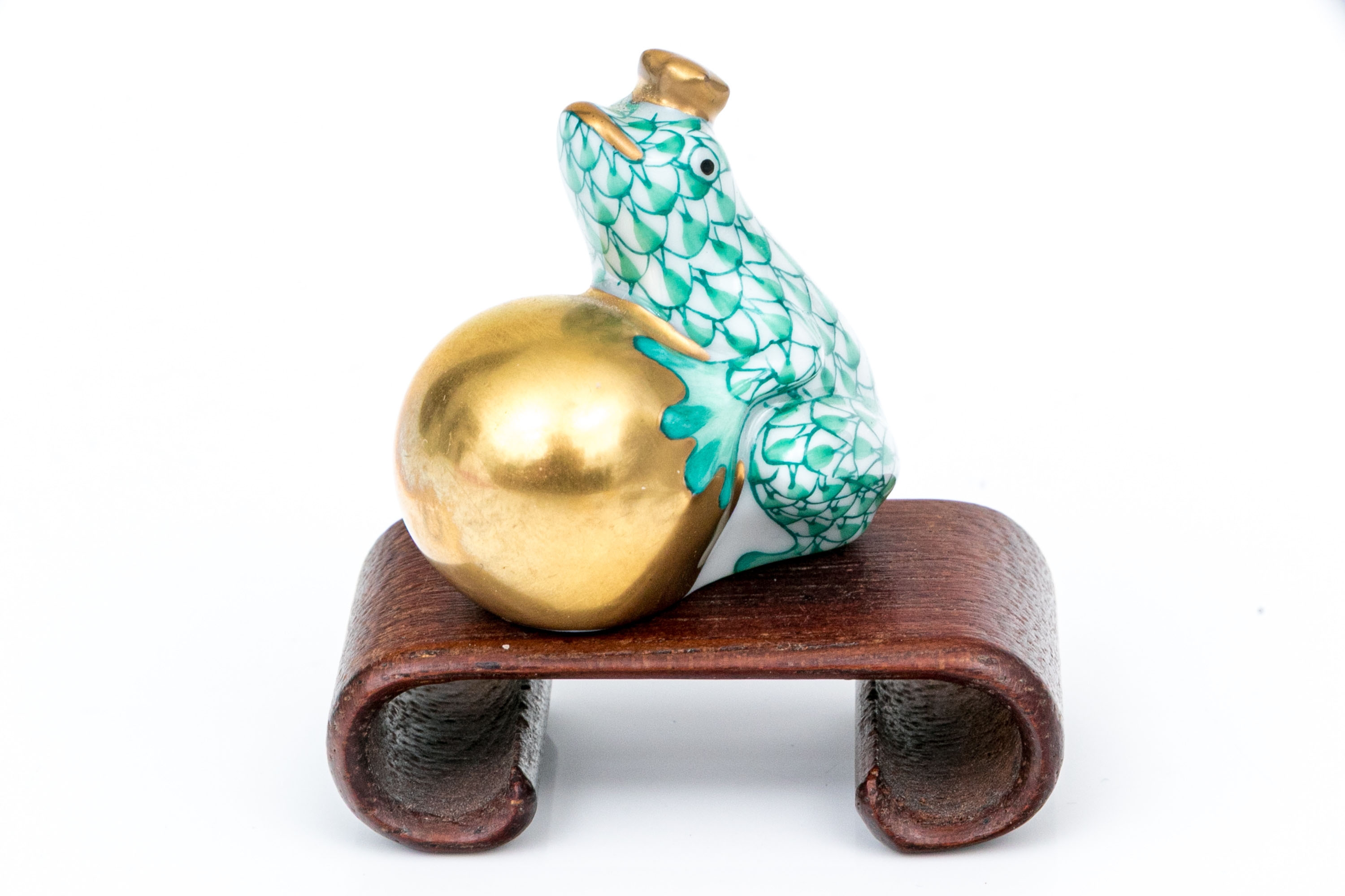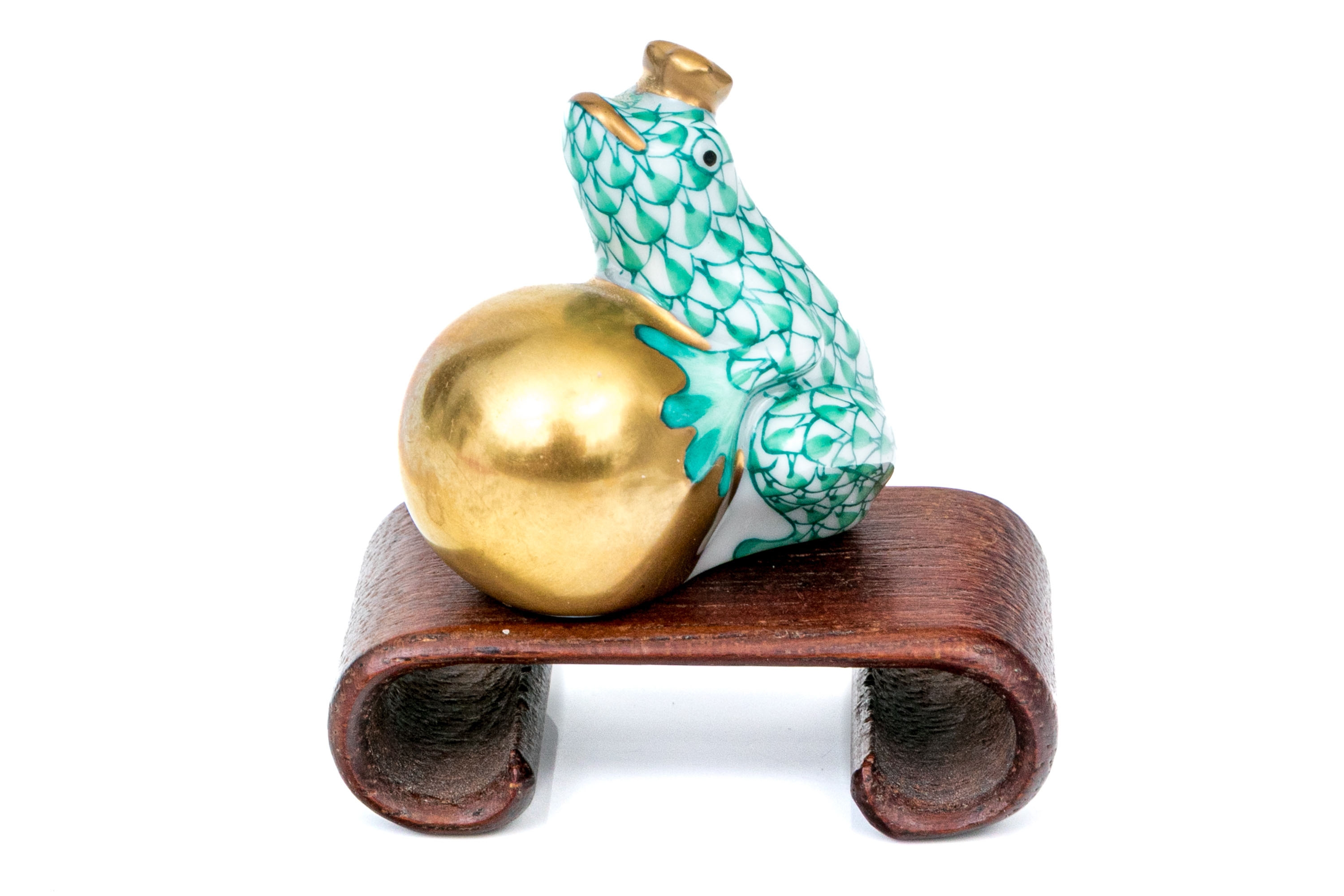 Herend Hungary hand-painted porcelain figure, model 15364-1-00/VH, depicting a frog with crown and gold ball. This piece showcases Herend’s renowned green fishnet (VH) pattern. The frog perches proudly atop a lustrous 24K gold-gilded orb, a symbol of luck, prosperity, and joy, while donning a small gilded crown. The underside bears the Herend Hungary blue shield hallmark with crossed paintbrushes and HANDPAINTED mark, along with model and pattern identifiers “15364/VH” and production codes.