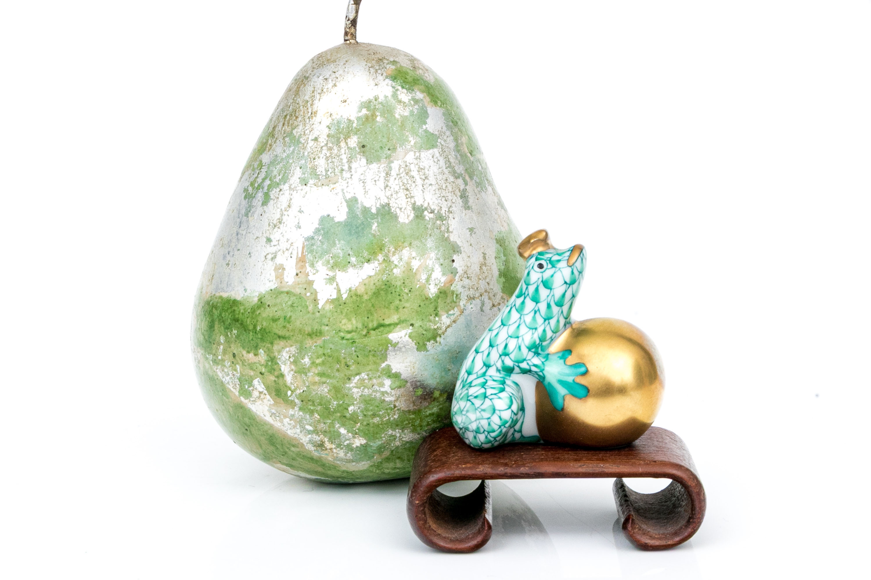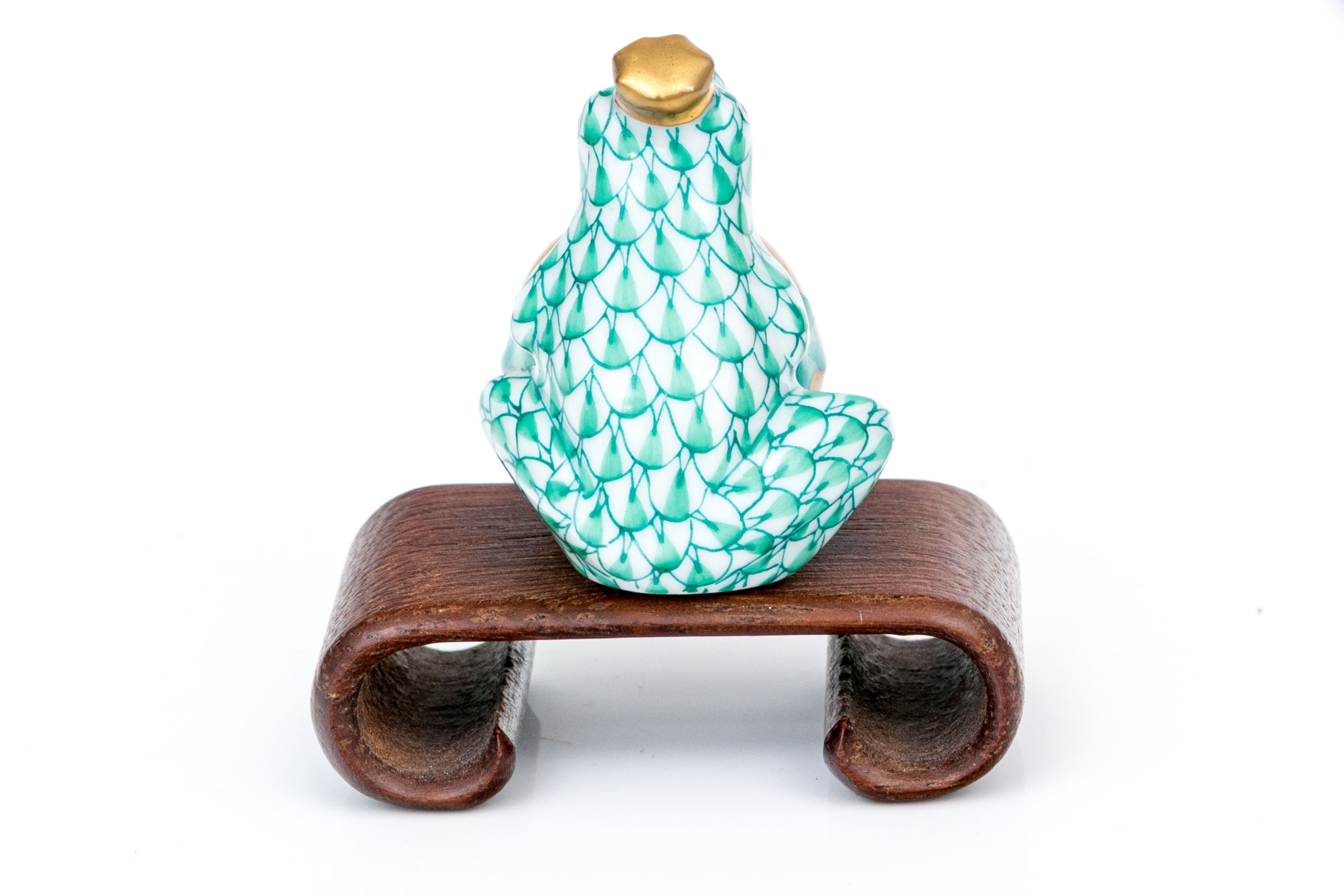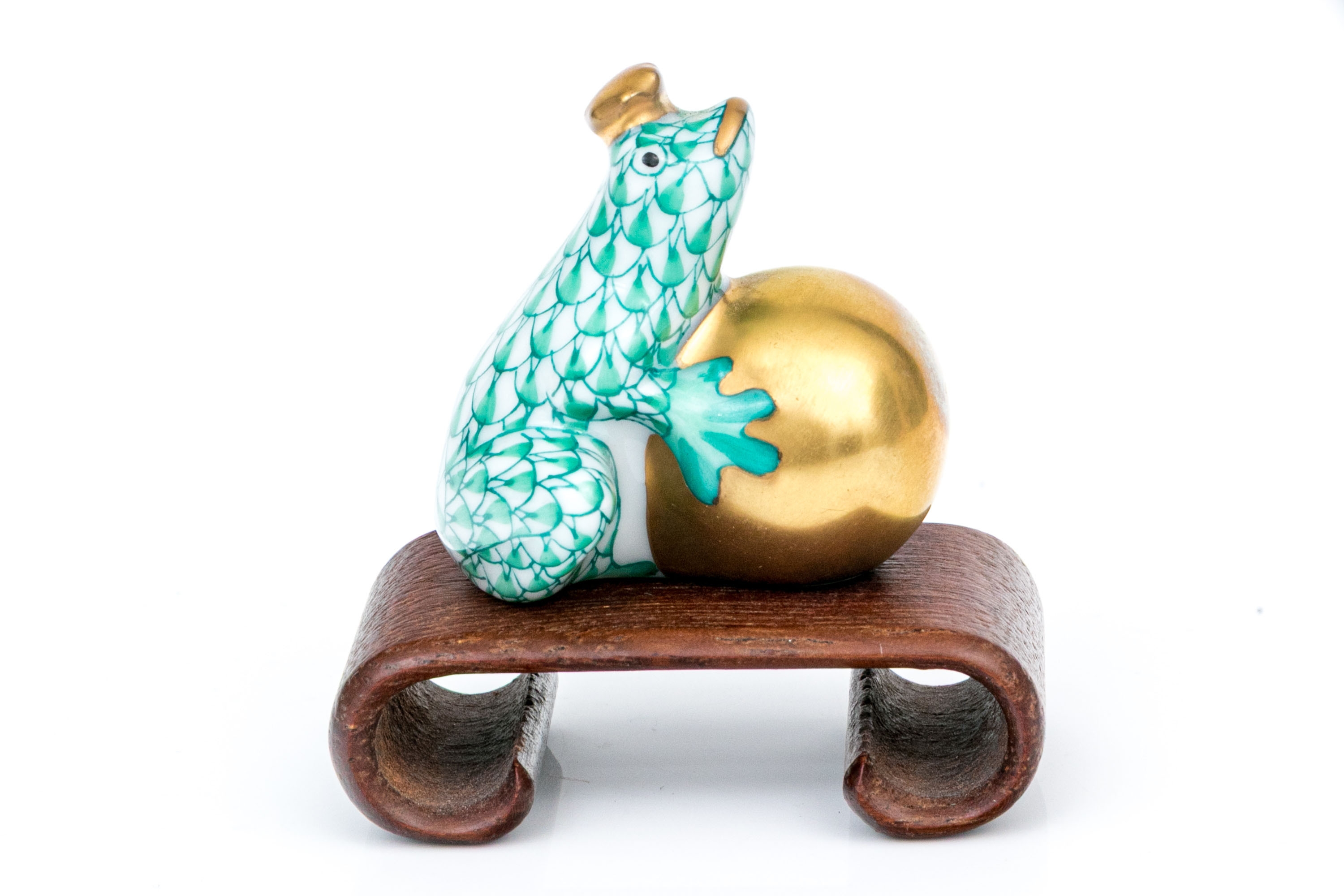 Herend Hungary hand-painted porcelain figure, model 15364-1-00/VH, depicting a frog with crown and gold ball. This piece showcases Herend’s renowned green fishnet (VH) pattern. The frog perches proudly atop a lustrous 24K gold-gilded orb, a symbol of luck, prosperity, and joy, while donning a small gilded crown. The underside bears the Herend Hungary blue shield hallmark with crossed paintbrushes and HANDPAINTED mark, along with model and pattern identifiers “15364/VH” and production codes.