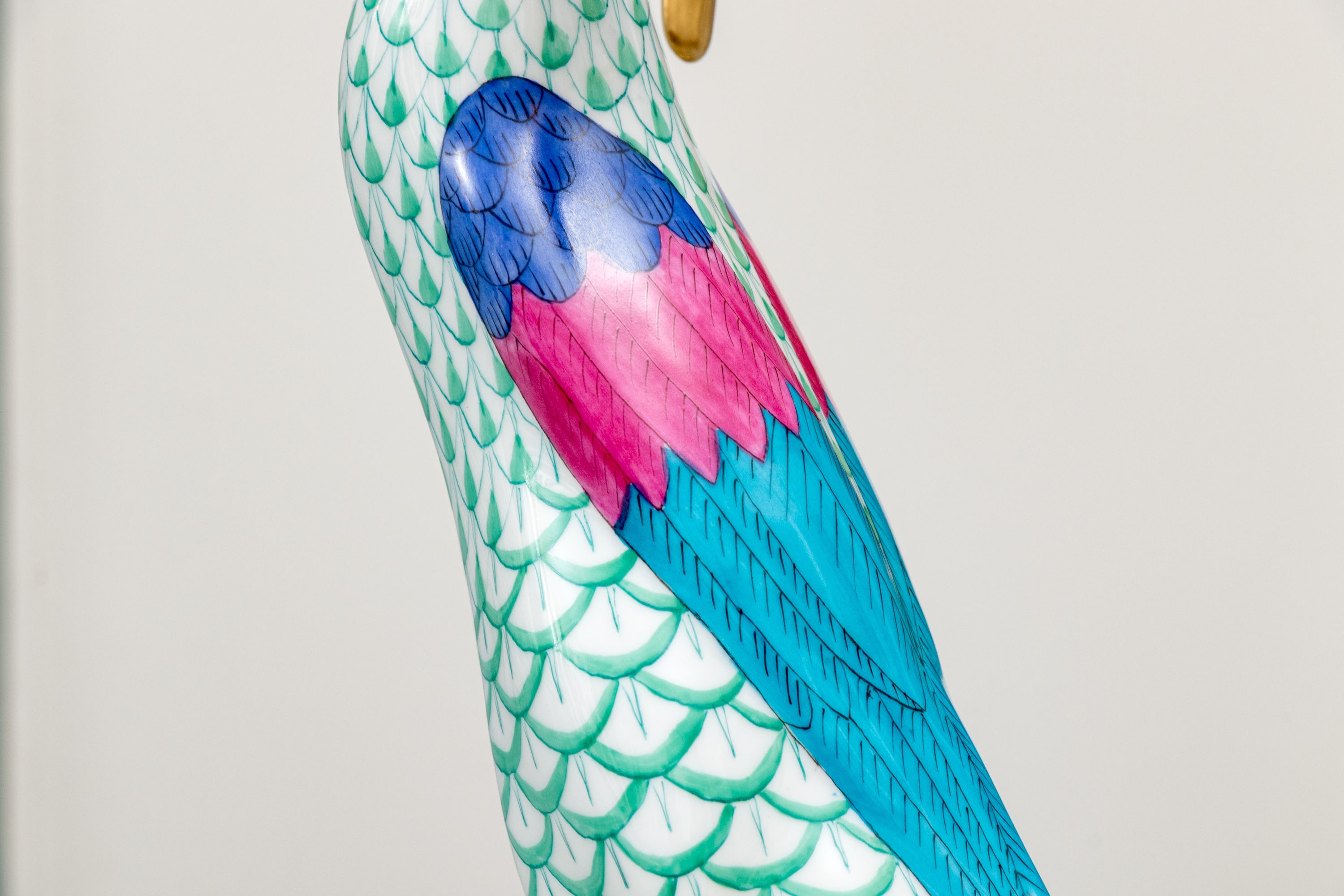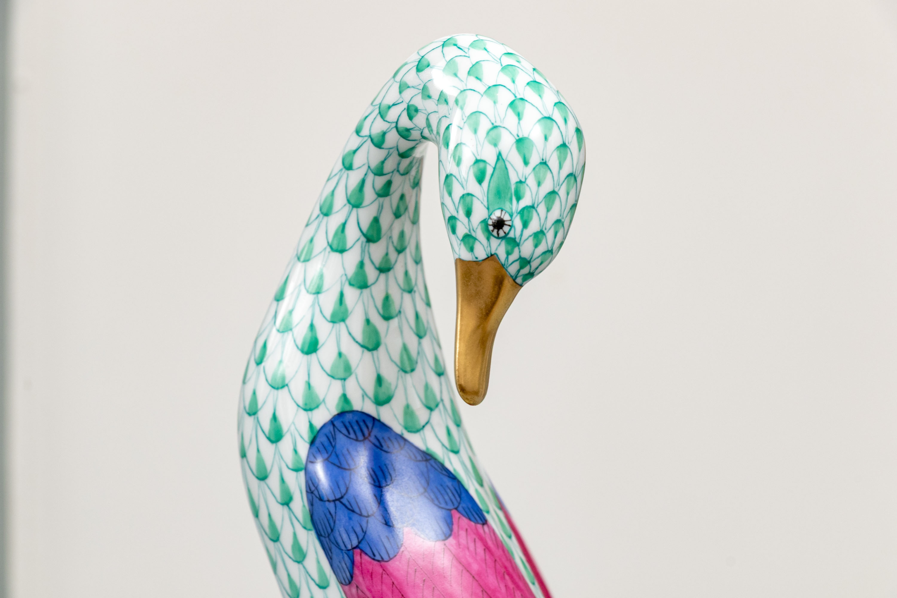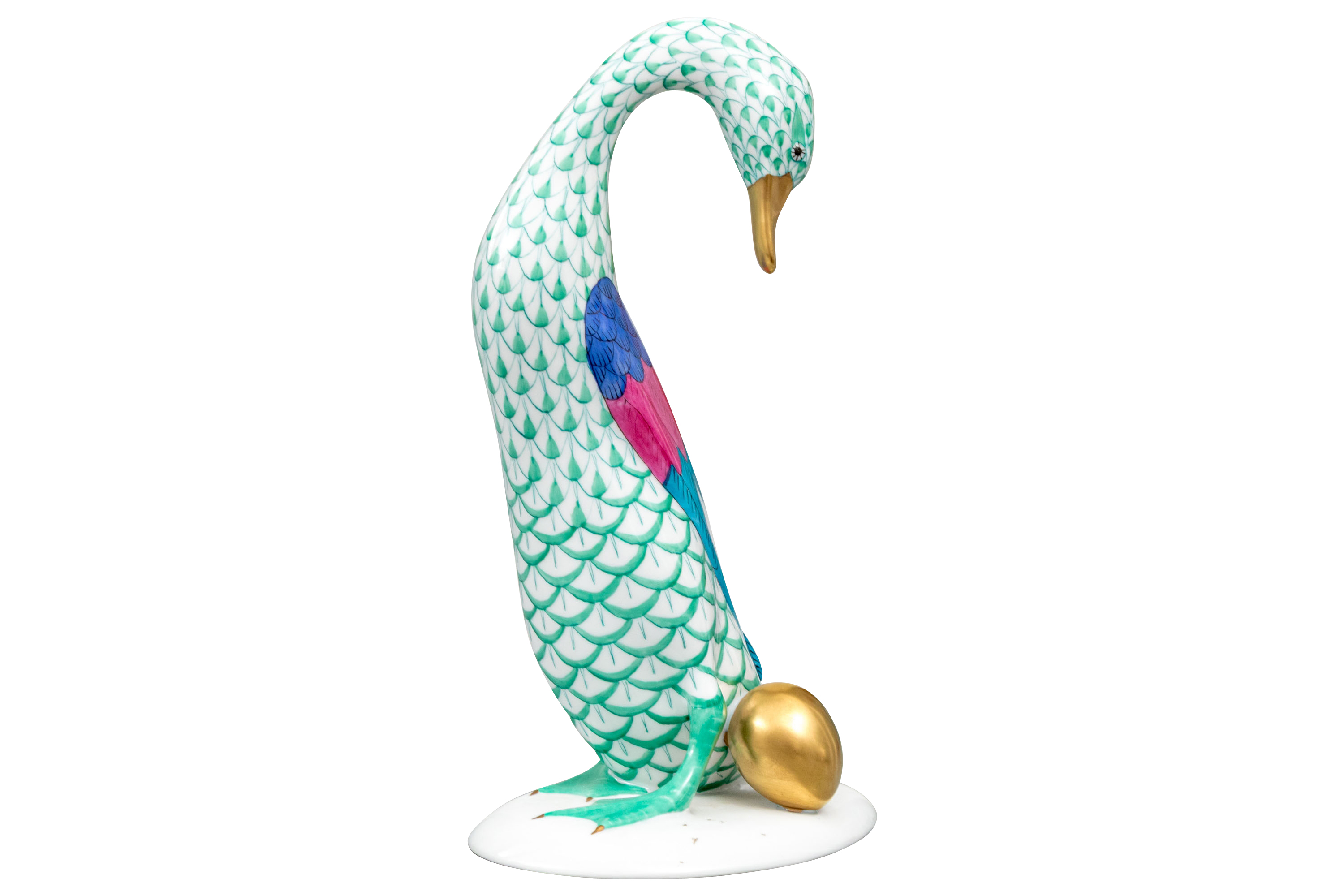 Herend porcelain goose figurine, hand-painted in the green fishnet (VHV) pattern with vivid accent colors and 24K gold embellishments. The goose is depicted standing over a gold egg, its long neck elegantly curved downward in a protective gesture..The bird’s body features Herend’s signature green fishnet design, accented by vibrant cobalt blue and magenta feathers on the wings. Its beak and feet are finished in rich gold, contrasting beautifully with the delicate green scales and white porcelain ground. The underside bears the Herend Hungary blue shield and crossed paintbrush mark, stamped Handpainted with impressed factory marks and painter’s numbers.