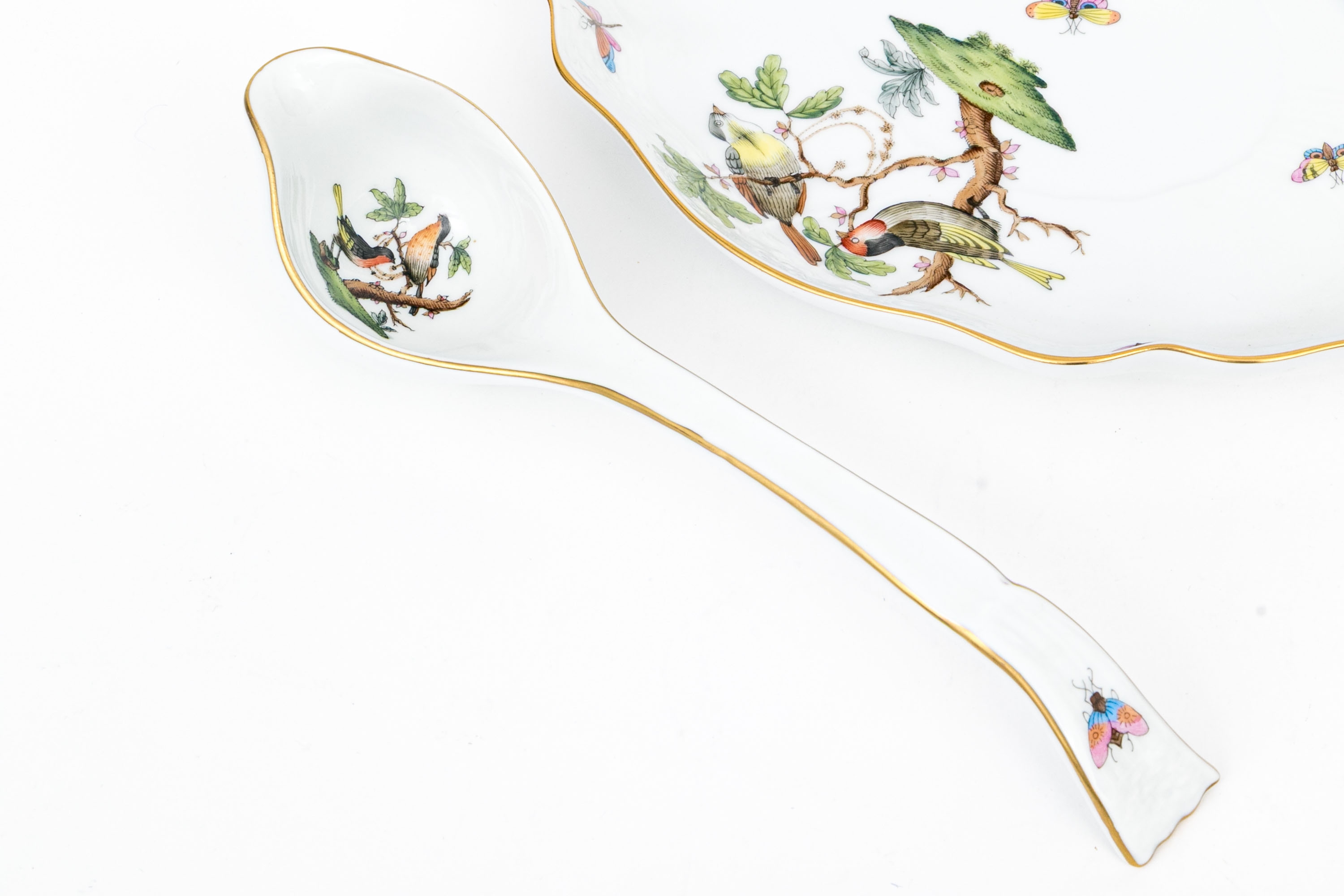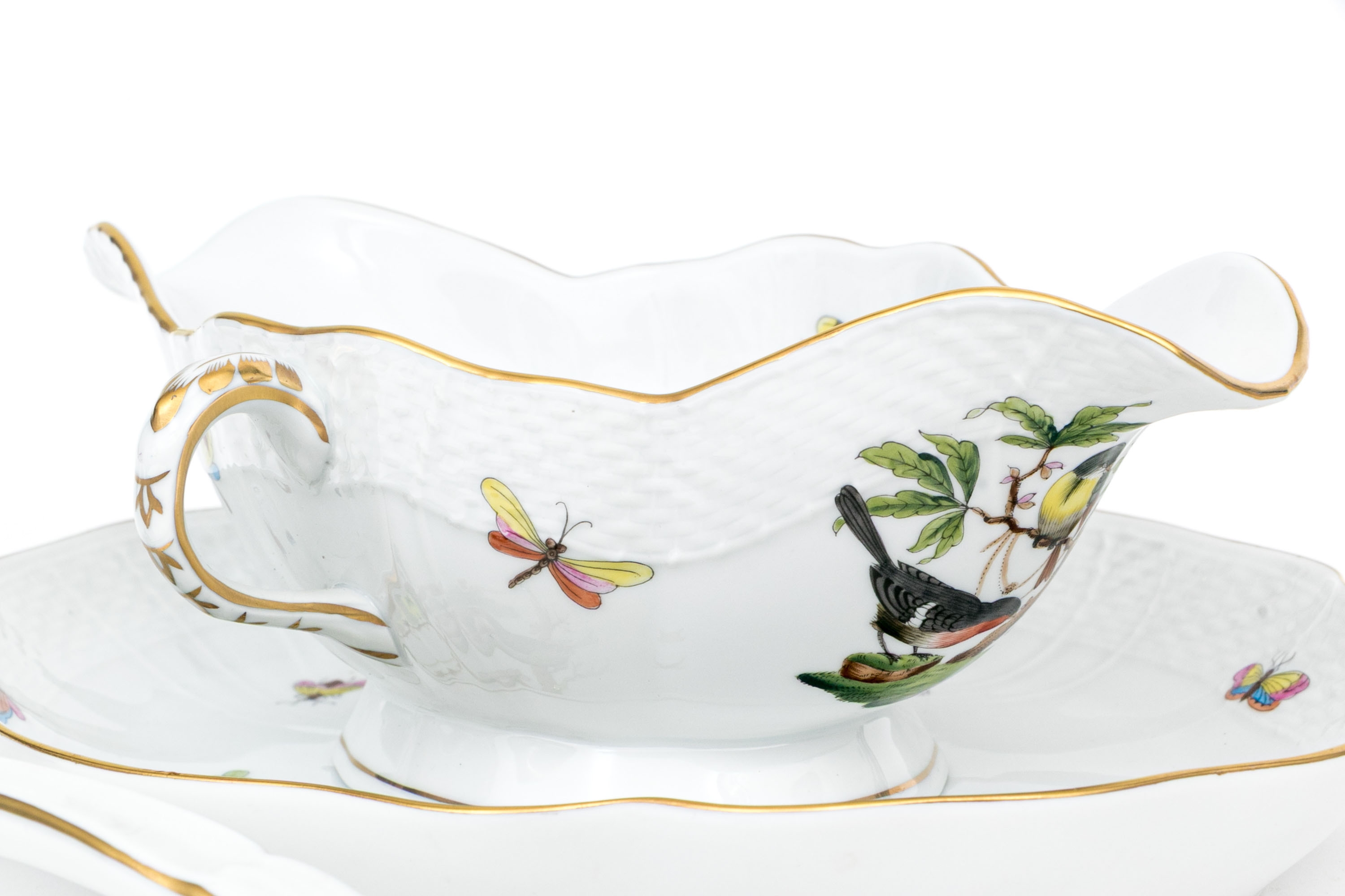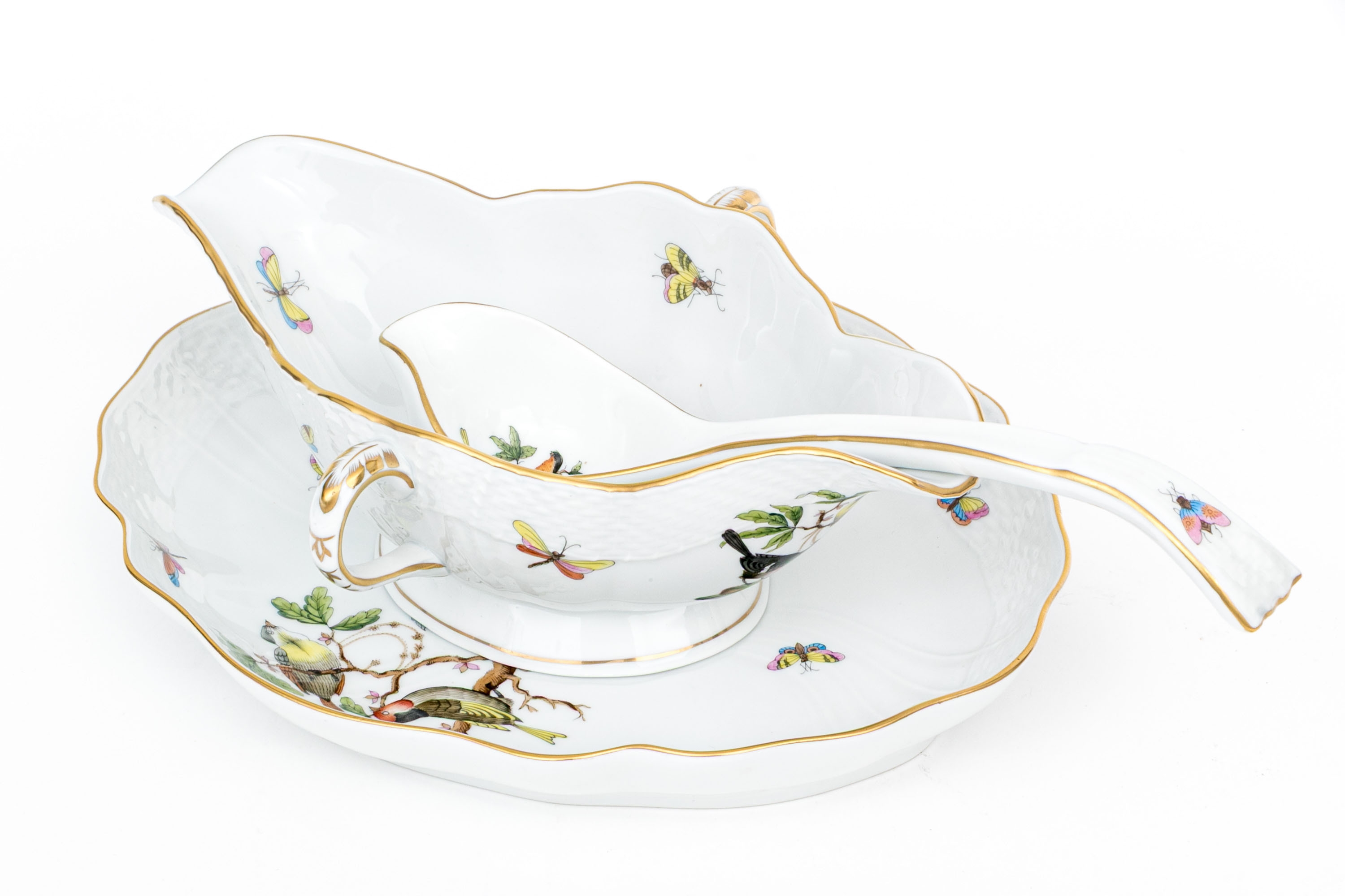 Herend Hungary porcelain three-piece sauce or gravy set, hand-painted in the classic Rothschild Bird (RO) pattern and trimmed with 24K gold. This ensemble includes a gravy boat, underplate, and ladle, each adorned with depictions of colorful songbirds perched among leafy branches with necklaces and butterflies and insects in flight, a hallmark of the Rothschild Bird motif. The pieces are finished with scalloped edges, graceful curves, and basketweave-textured rims. The handles and rims are accented with hand-applied gilding, while the underside of each piece is marked with the Herend Hungary blue shield hallmark and crossed paintbrushes, along with HANDPAINTED and the form/pattern numbers: