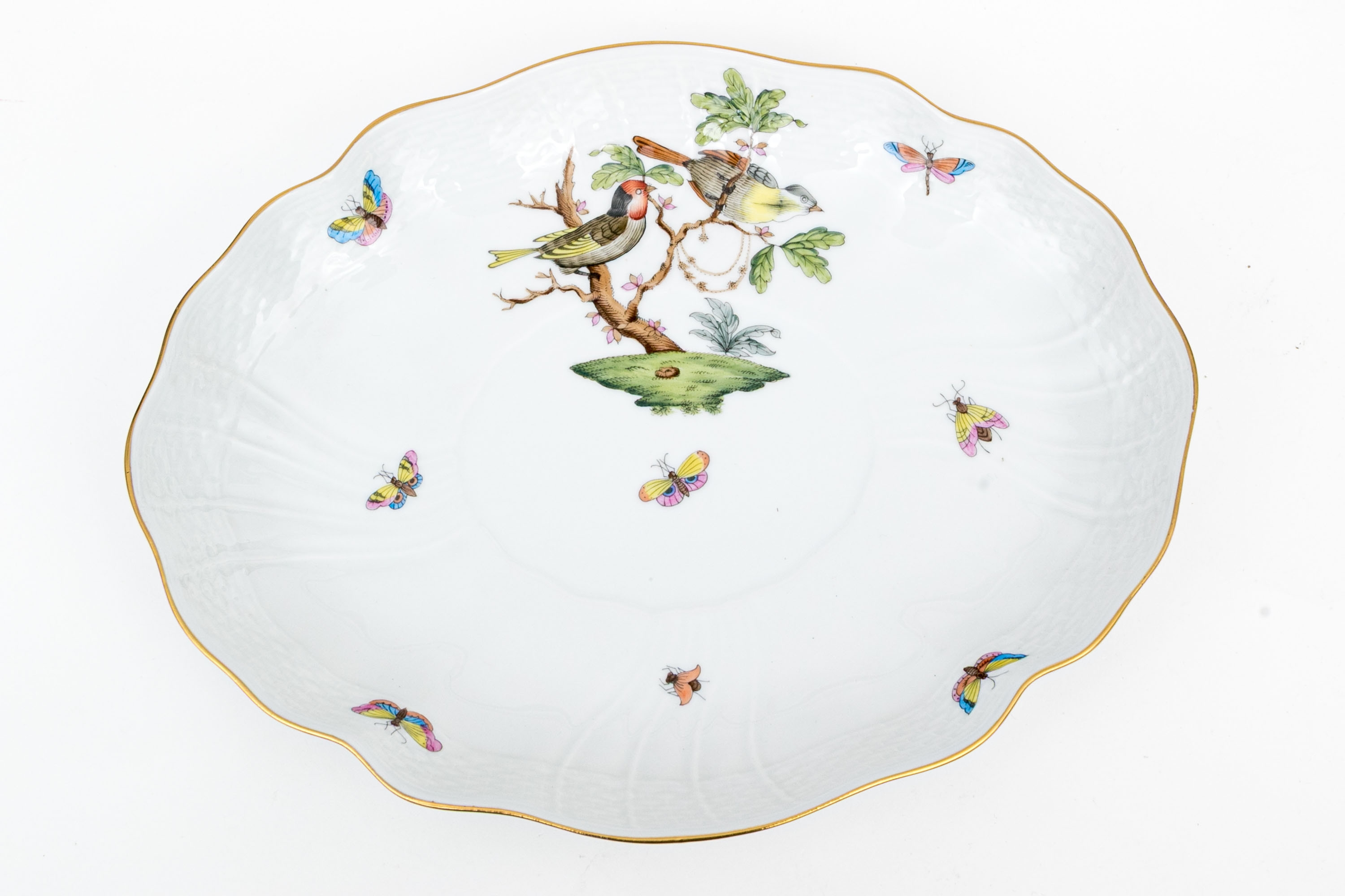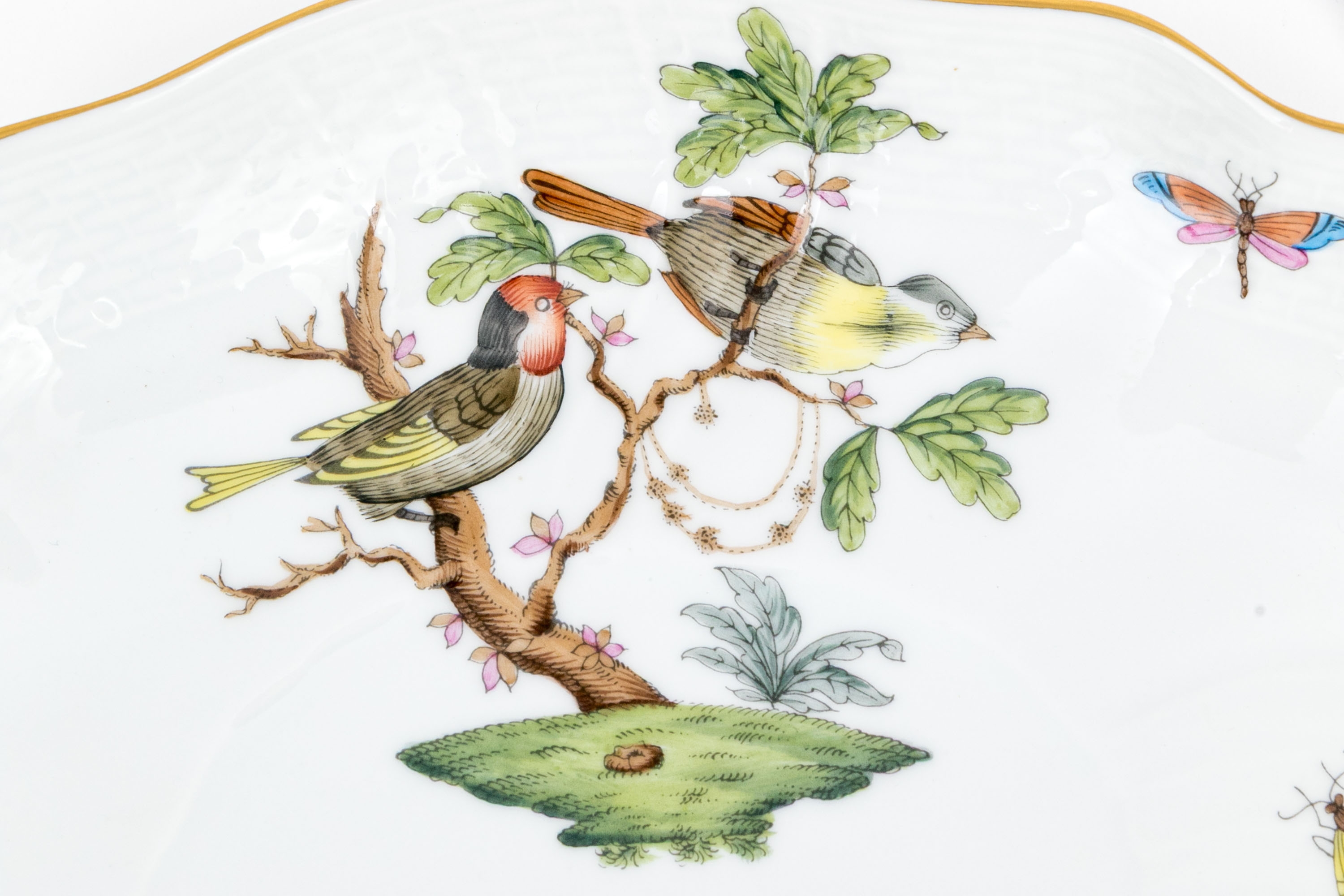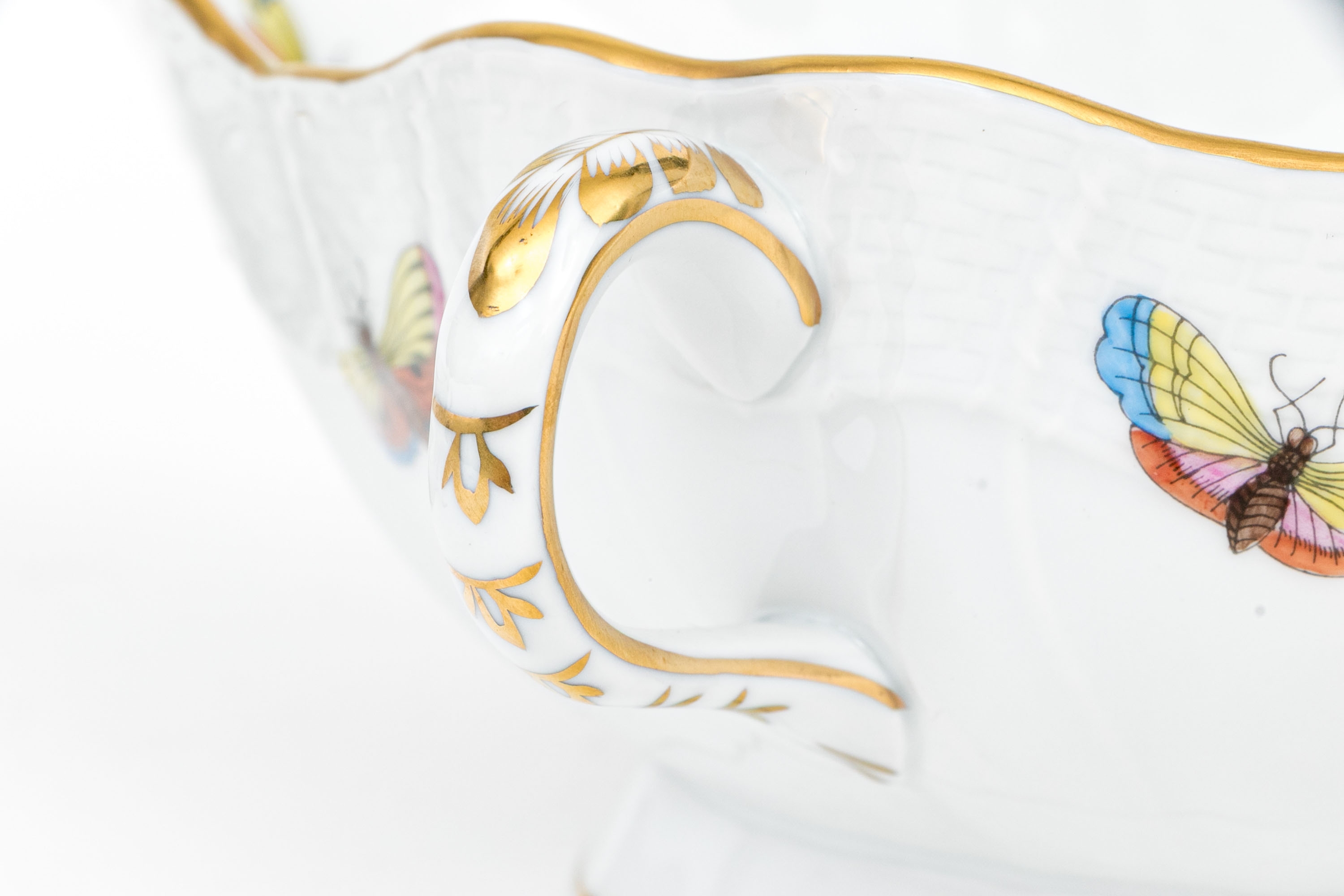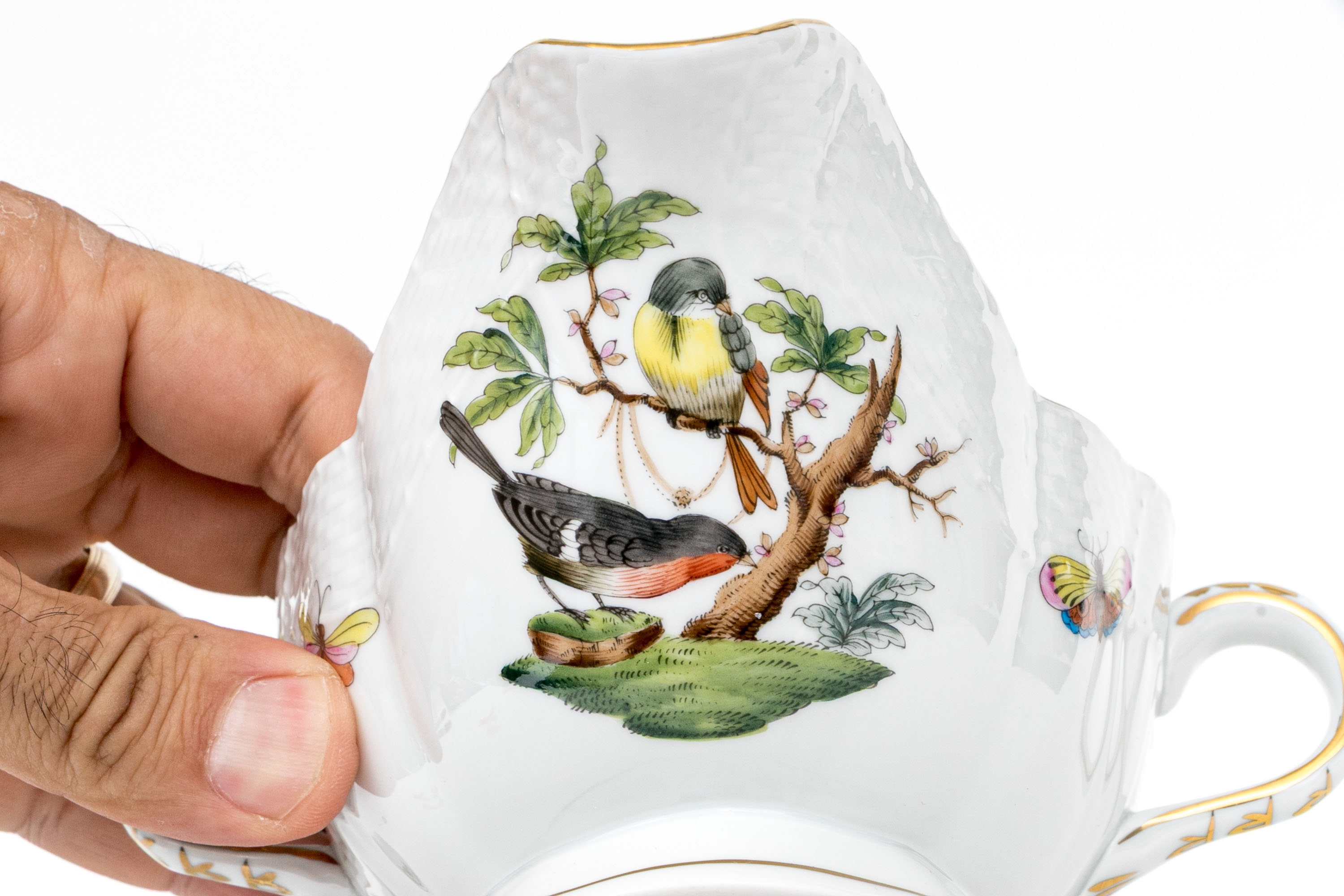 Herend Hungary porcelain three-piece sauce or gravy set, hand-painted in the classic Rothschild Bird (RO) pattern and trimmed with 24K gold. This ensemble includes a gravy boat, underplate, and ladle, each adorned with depictions of colorful songbirds perched among leafy branches with necklaces and butterflies and insects in flight, a hallmark of the Rothschild Bird motif. The pieces are finished with scalloped edges, graceful curves, and basketweave-textured rims. The handles and rims are accented with hand-applied gilding, while the underside of each piece is marked with the Herend Hungary blue shield hallmark and crossed paintbrushes, along with HANDPAINTED and the form/pattern numbers: